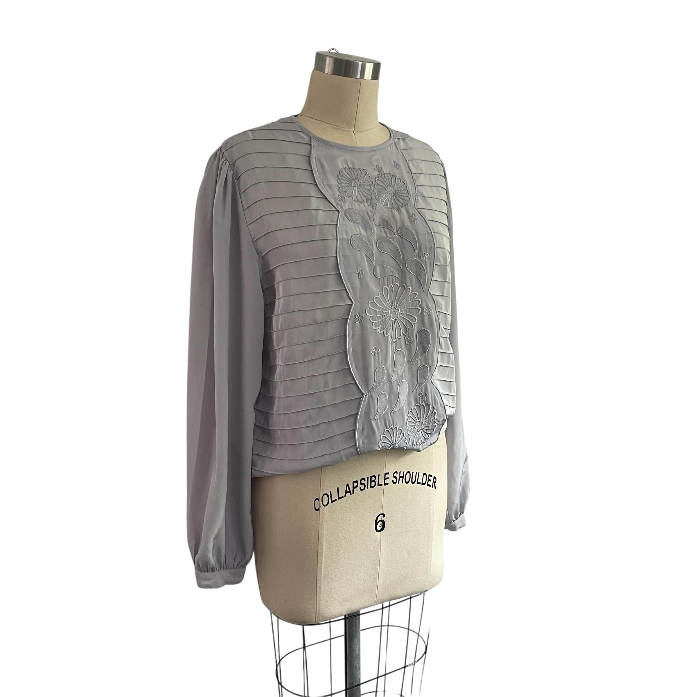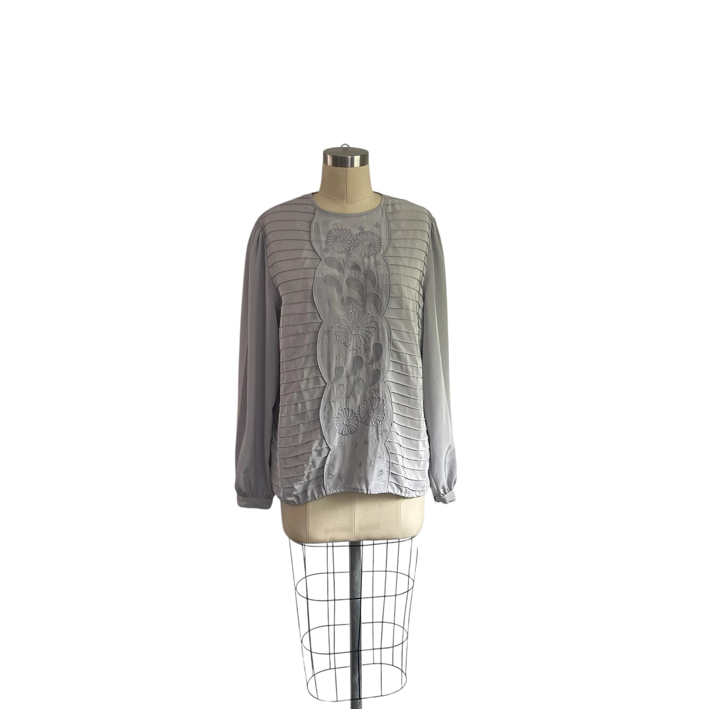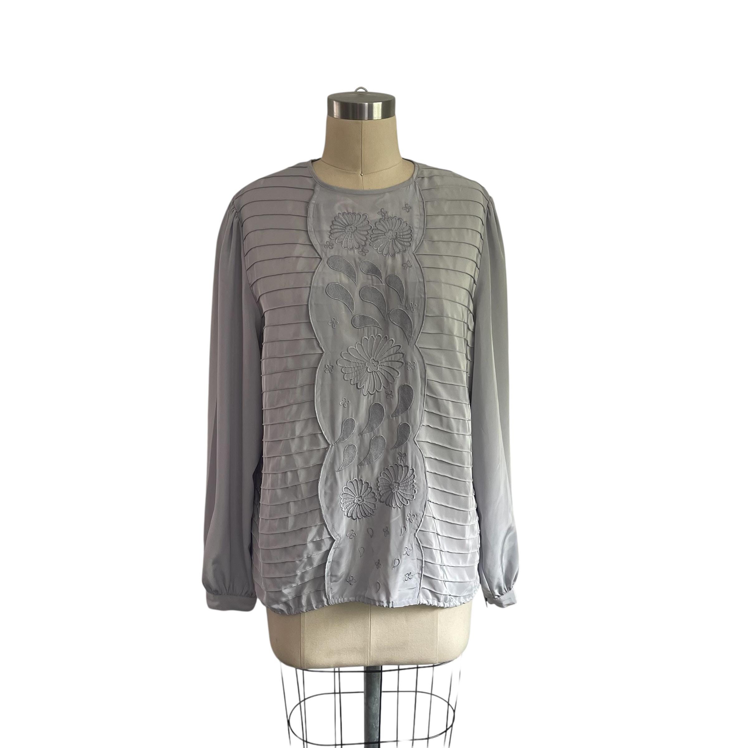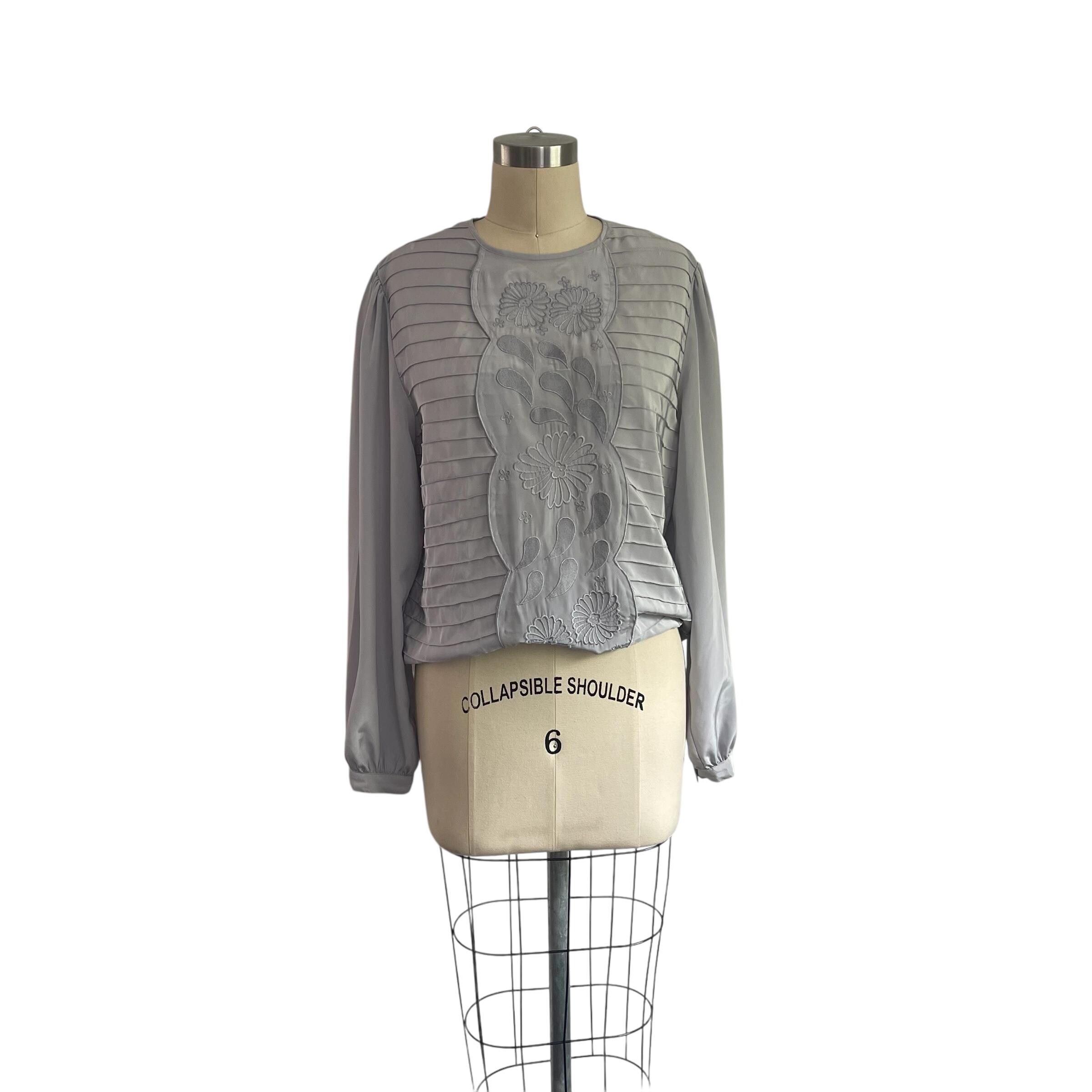 Vintage Suzelle Cool-Gray Boho Top: Bohemian, Hippie, Silky, Floral, Butterflies, Drops, Embroidered, Long Sleeves, Fairycore.
