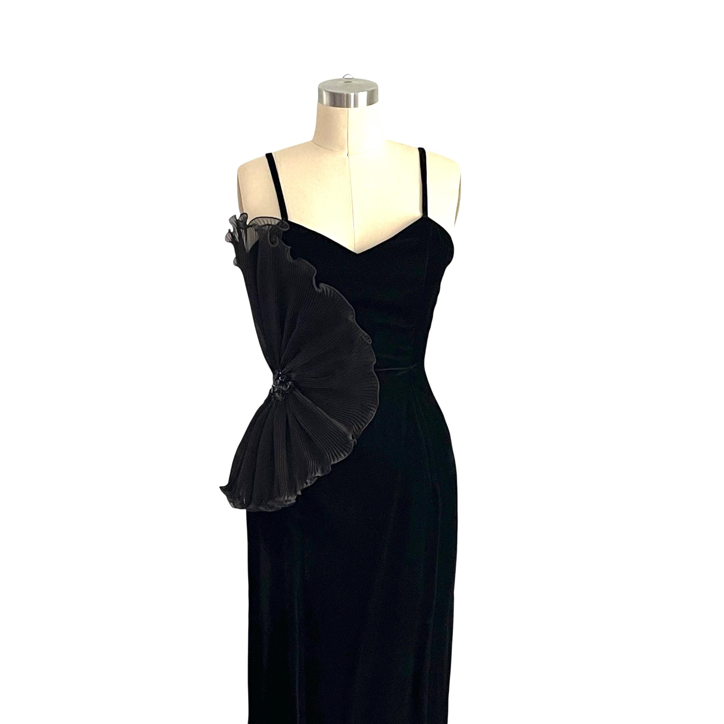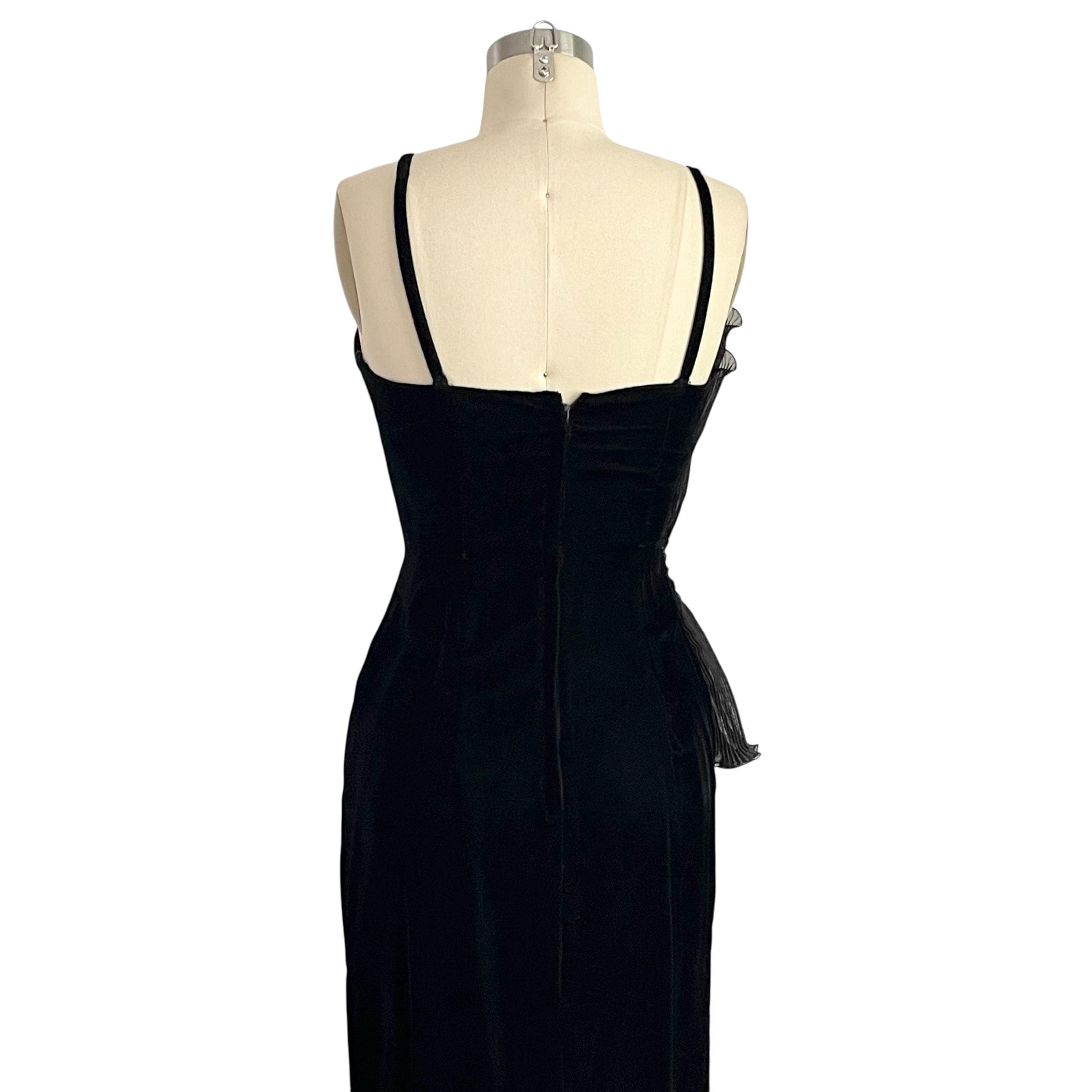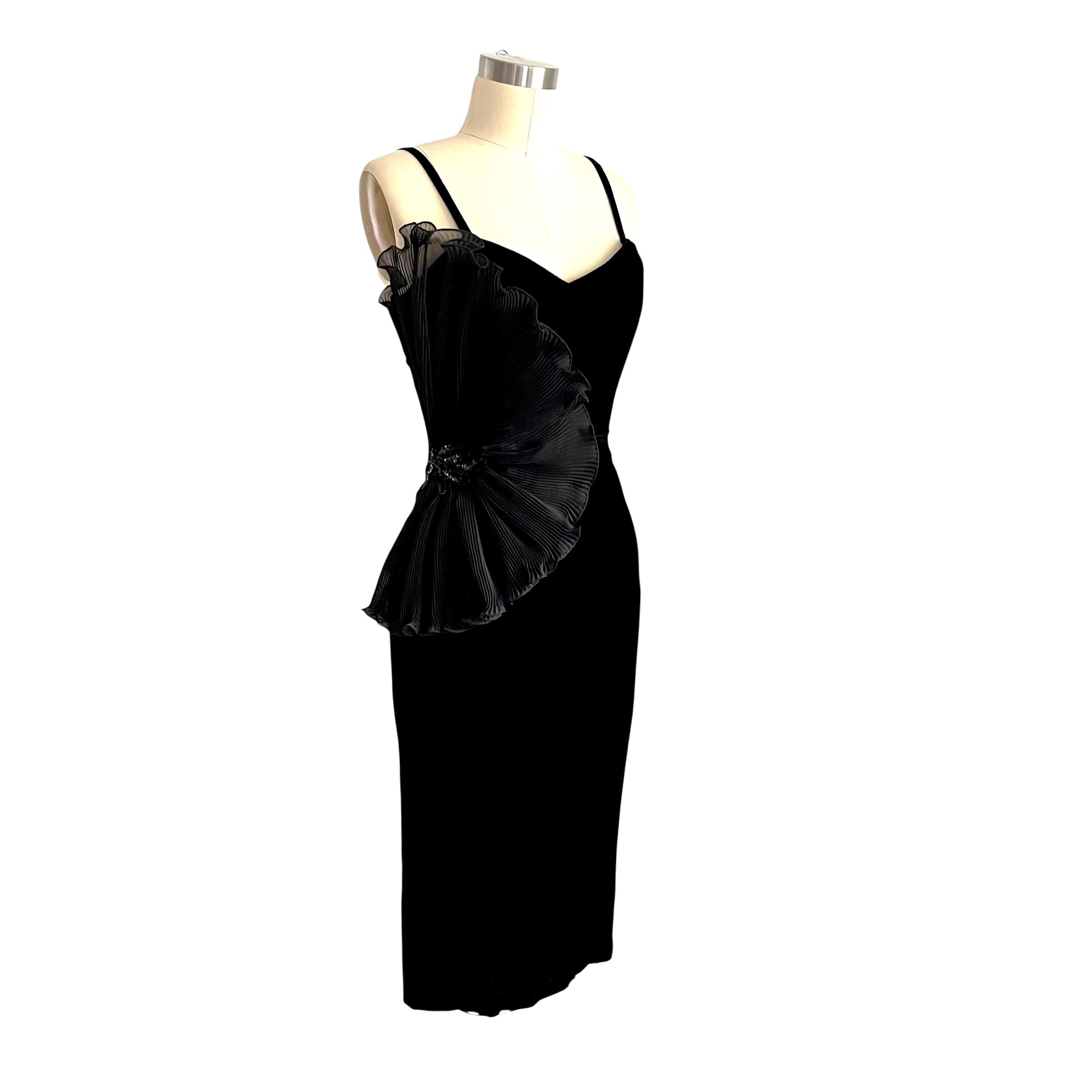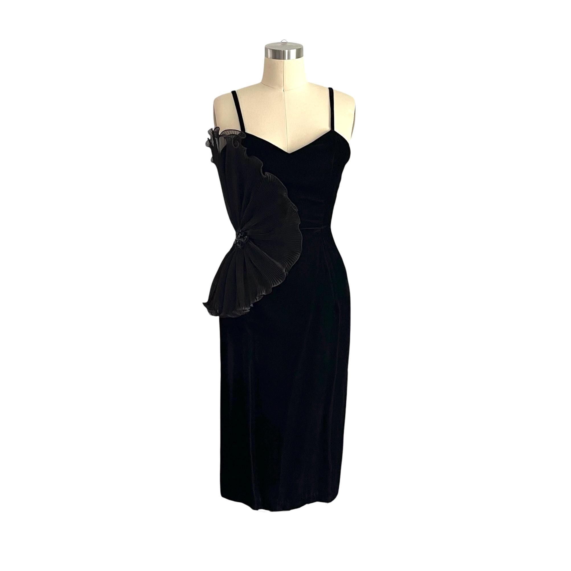 Vintage Black Velvet Hourglass Dress: 80s Pencil Party Dress, Pleated Fan Design, V Neck, Prom, Holiday, Party Dress.