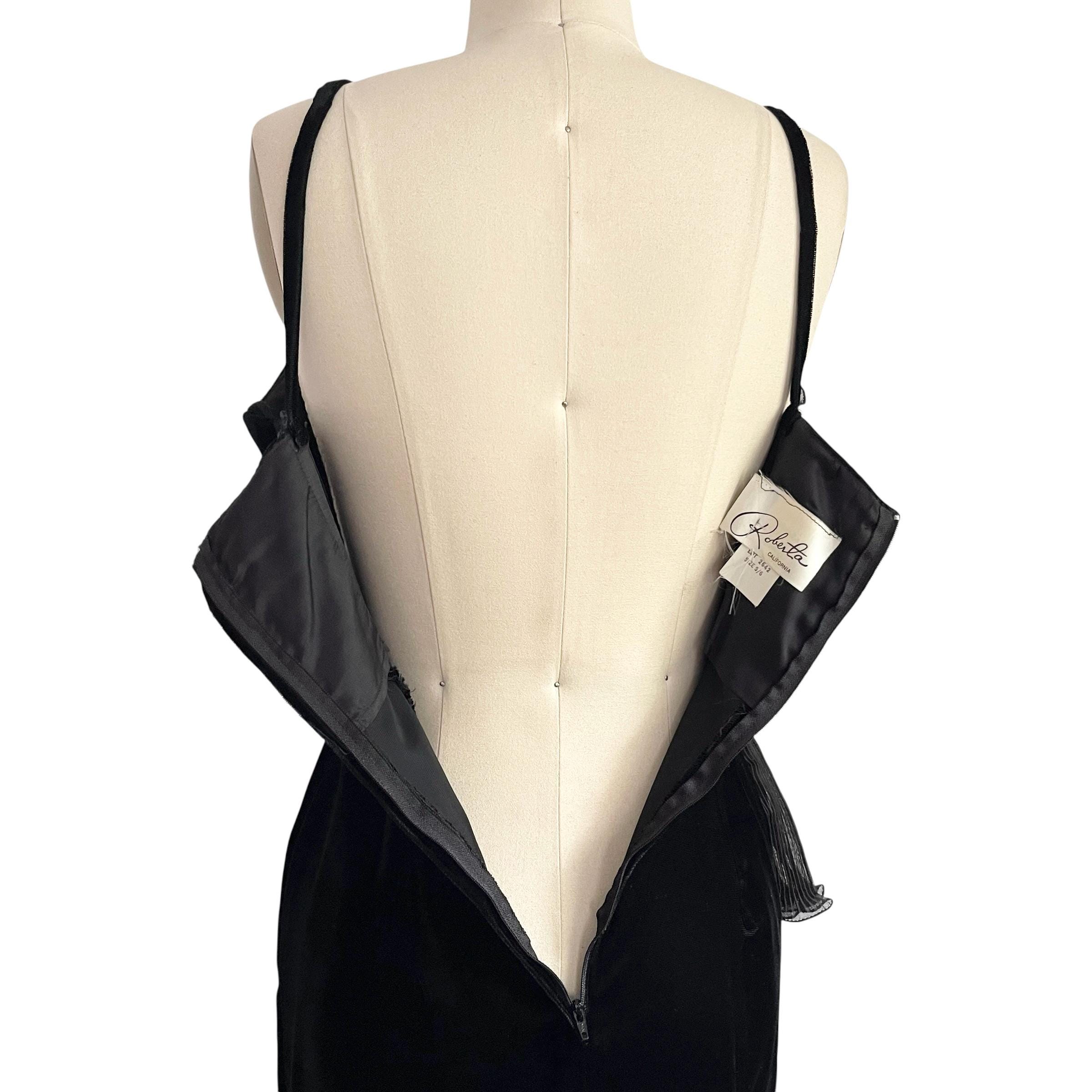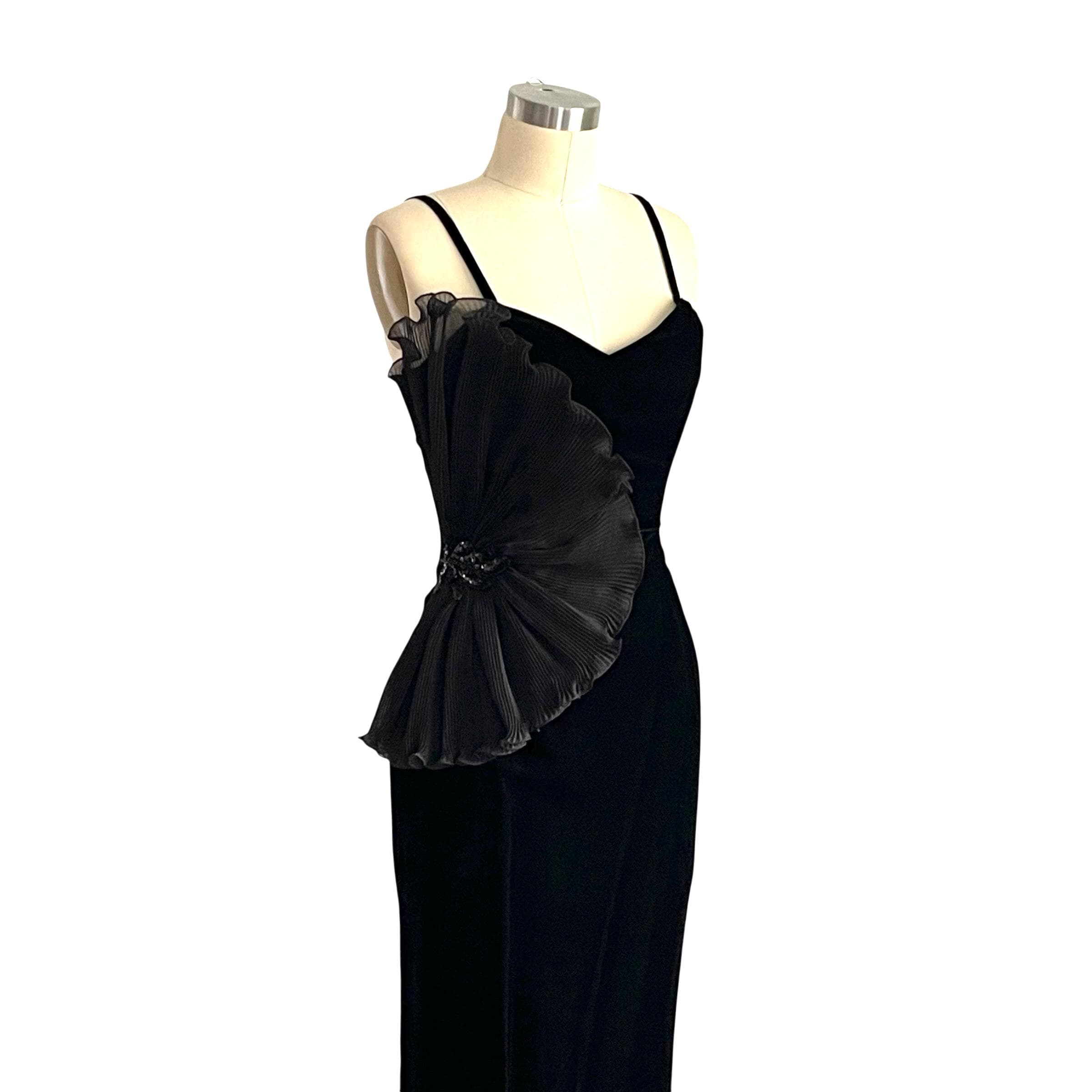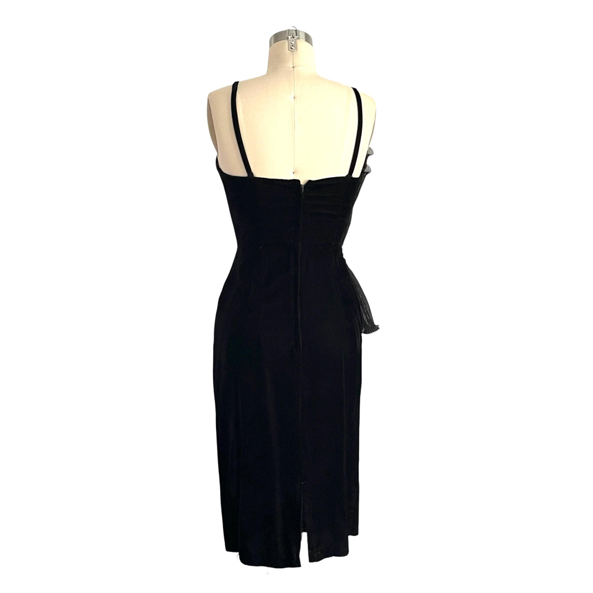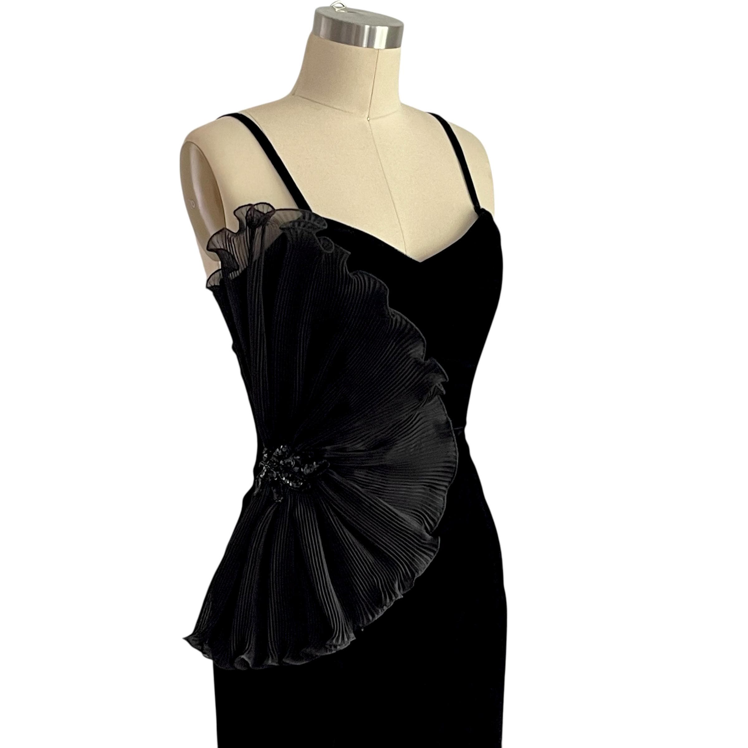 Vintage Black Velvet Hourglass Dress: 80s Pencil Party Dress, Pleated Fan Design, V Neck, Prom, Holiday, Party Dress.