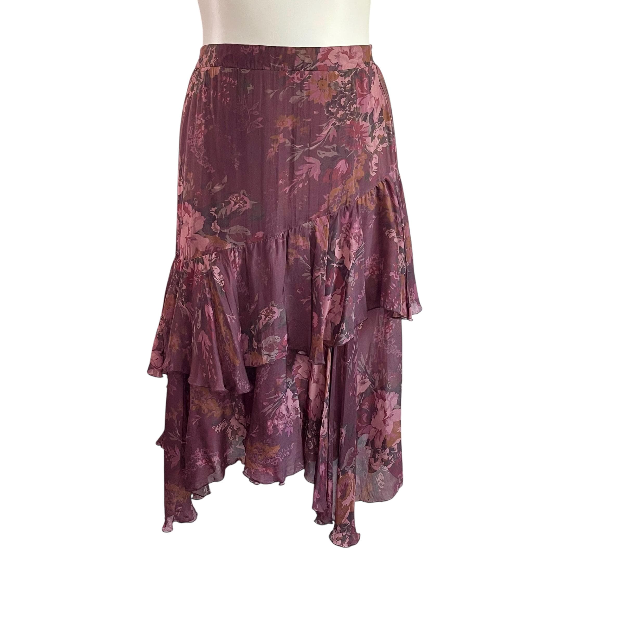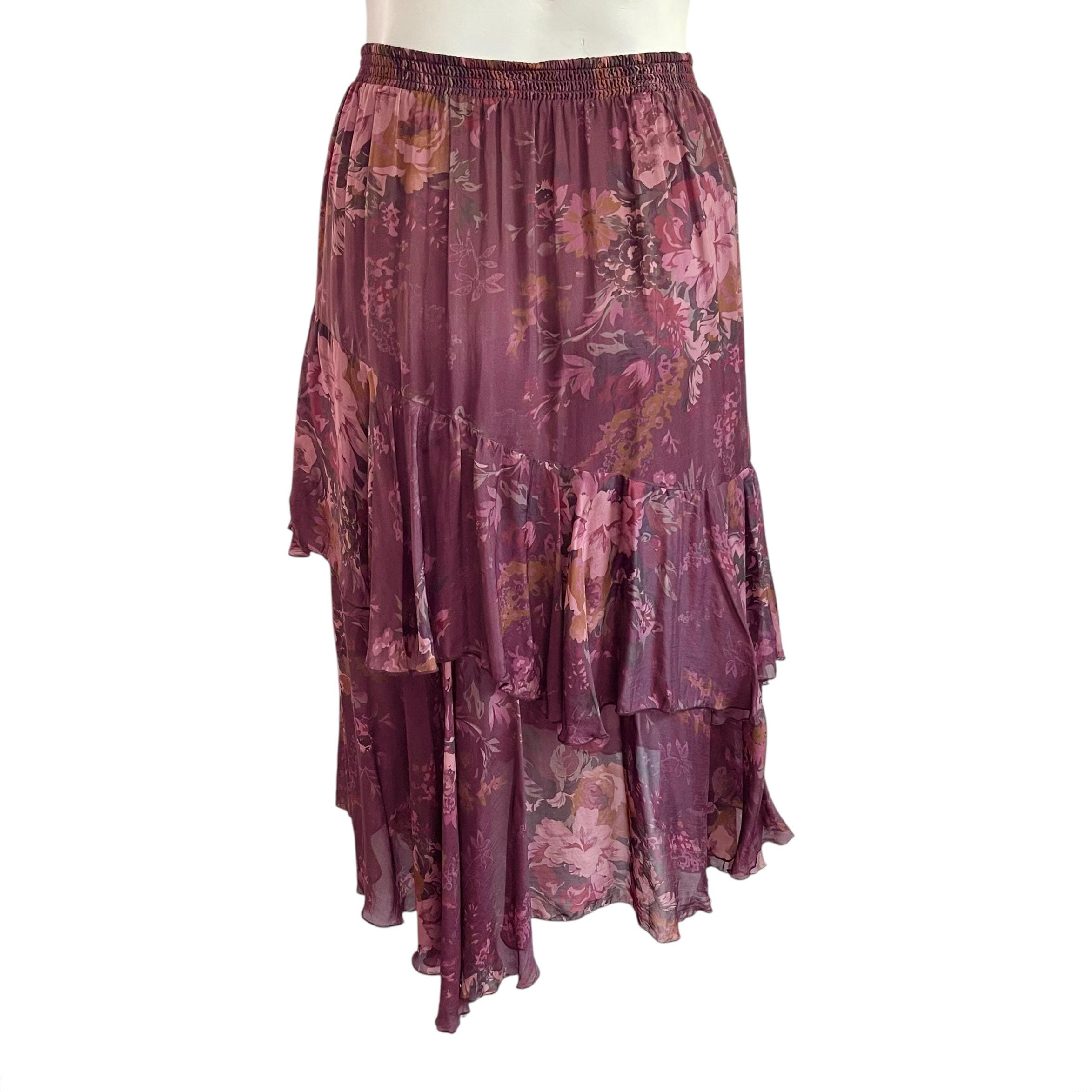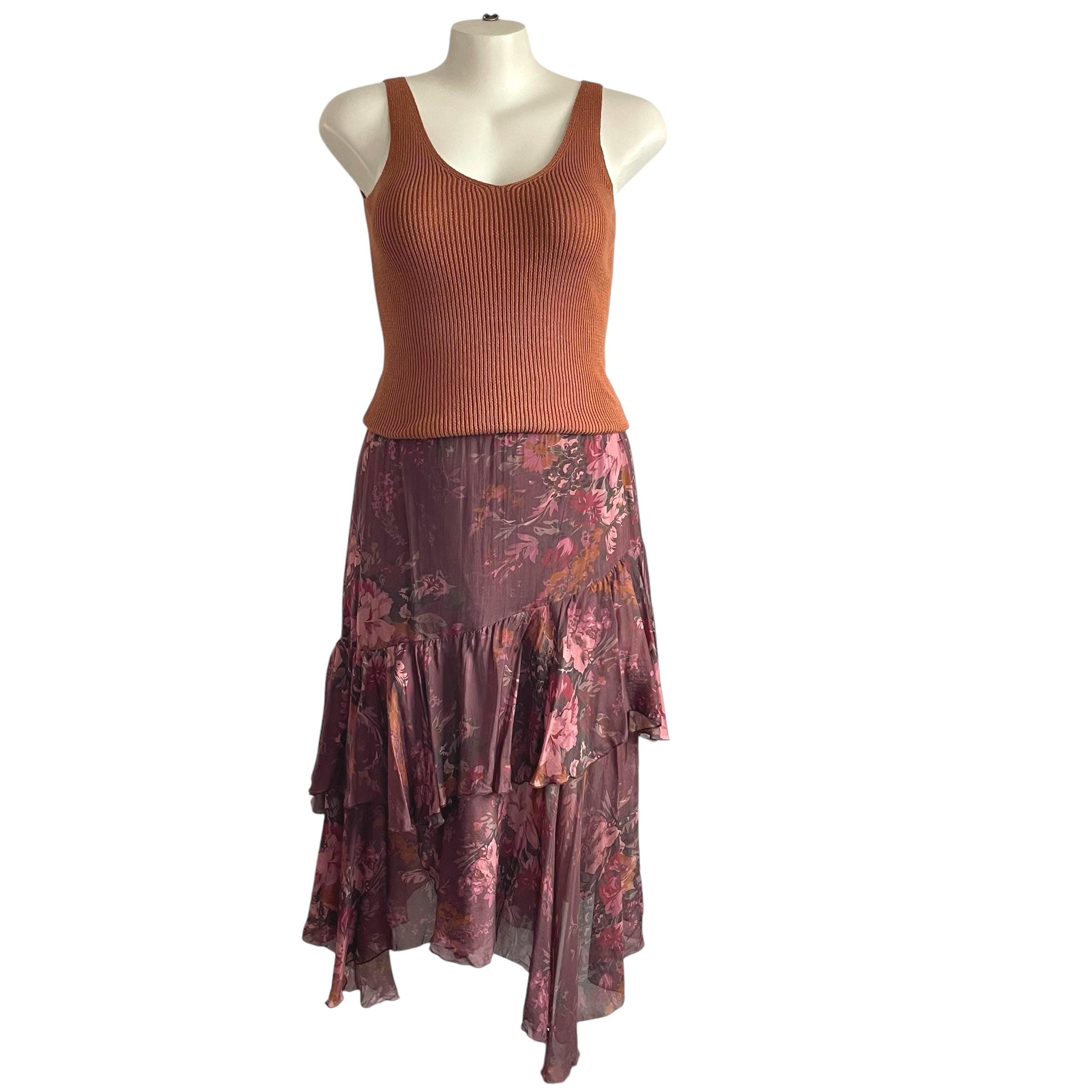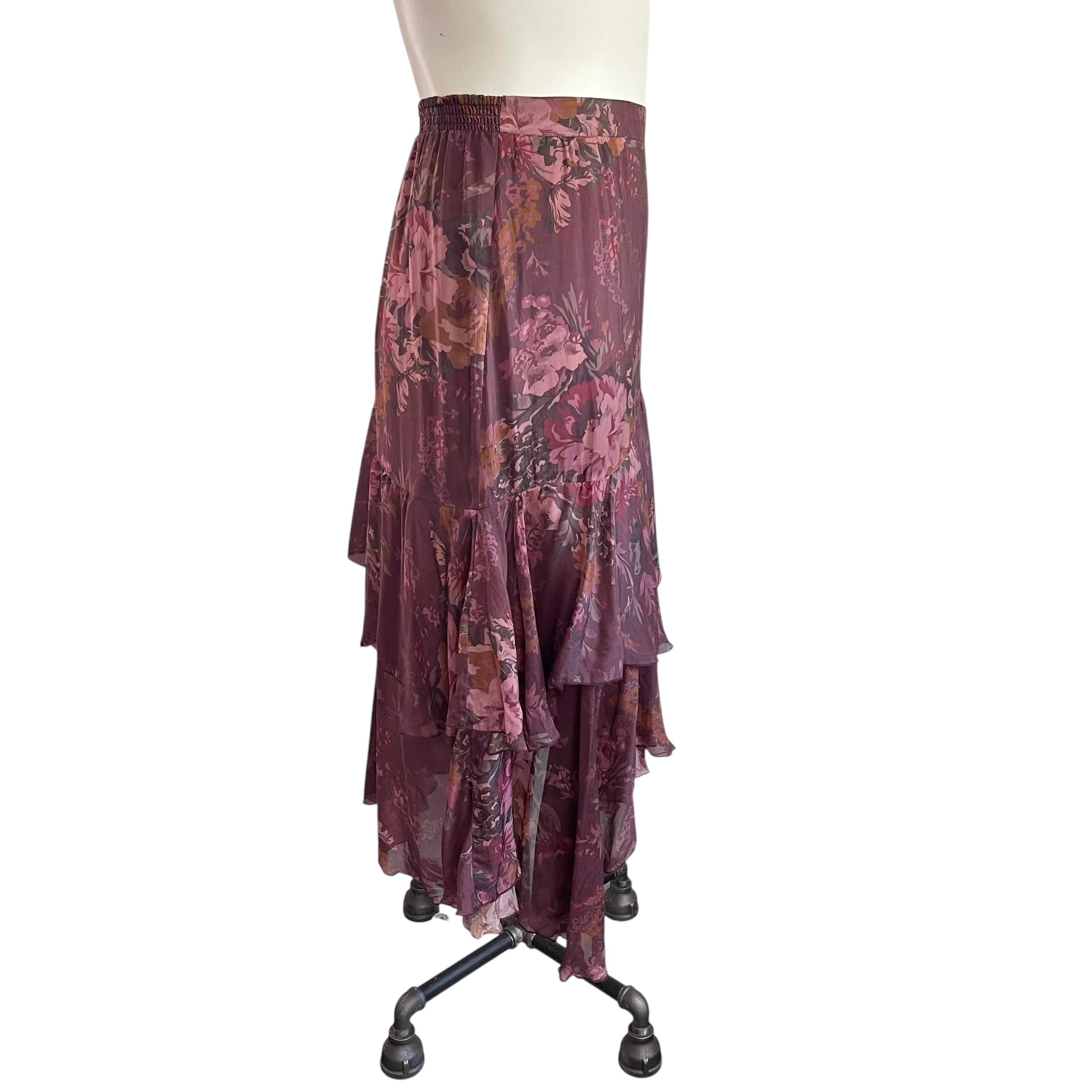 Vintage Floral Silk Tiered Frilly Midi Skirt.