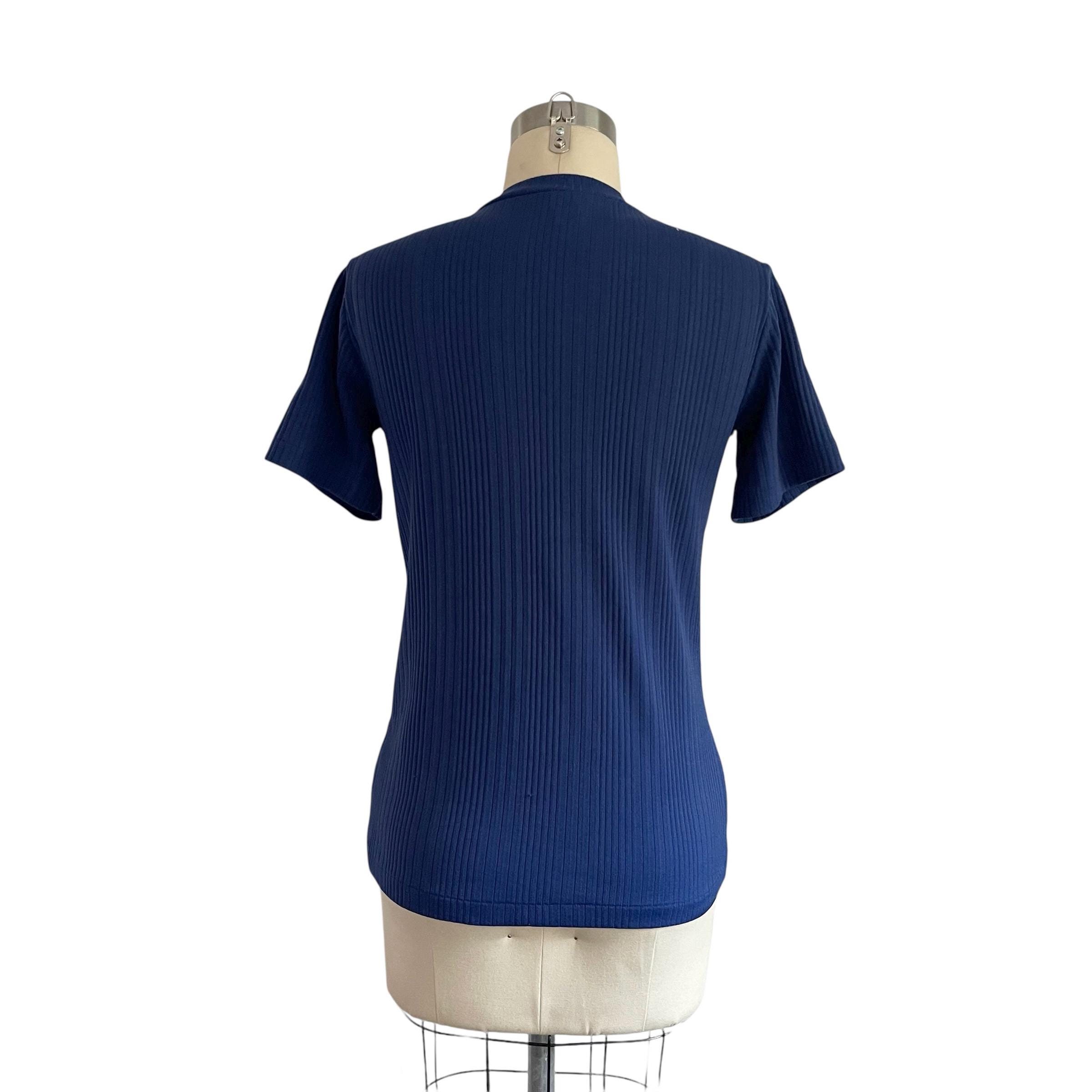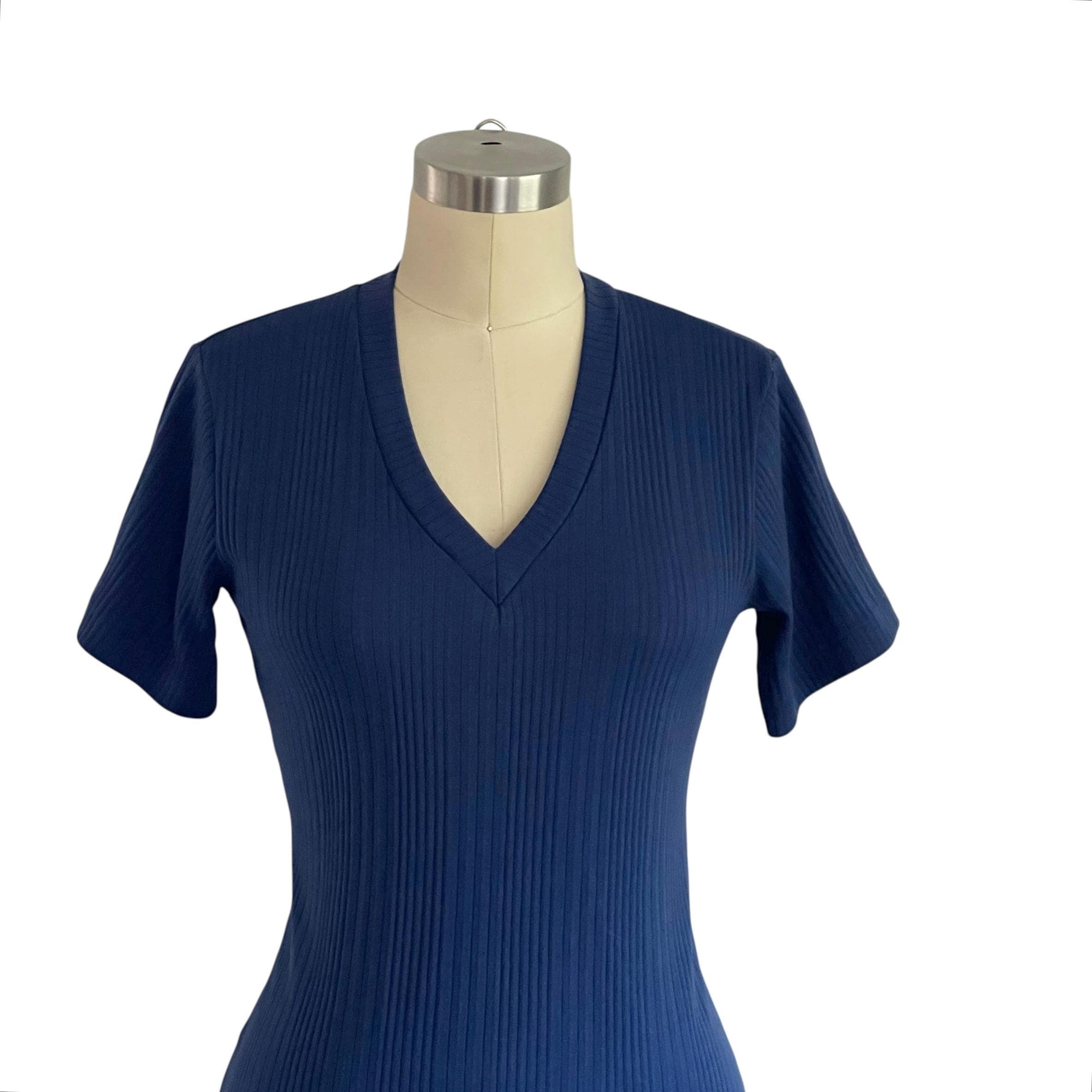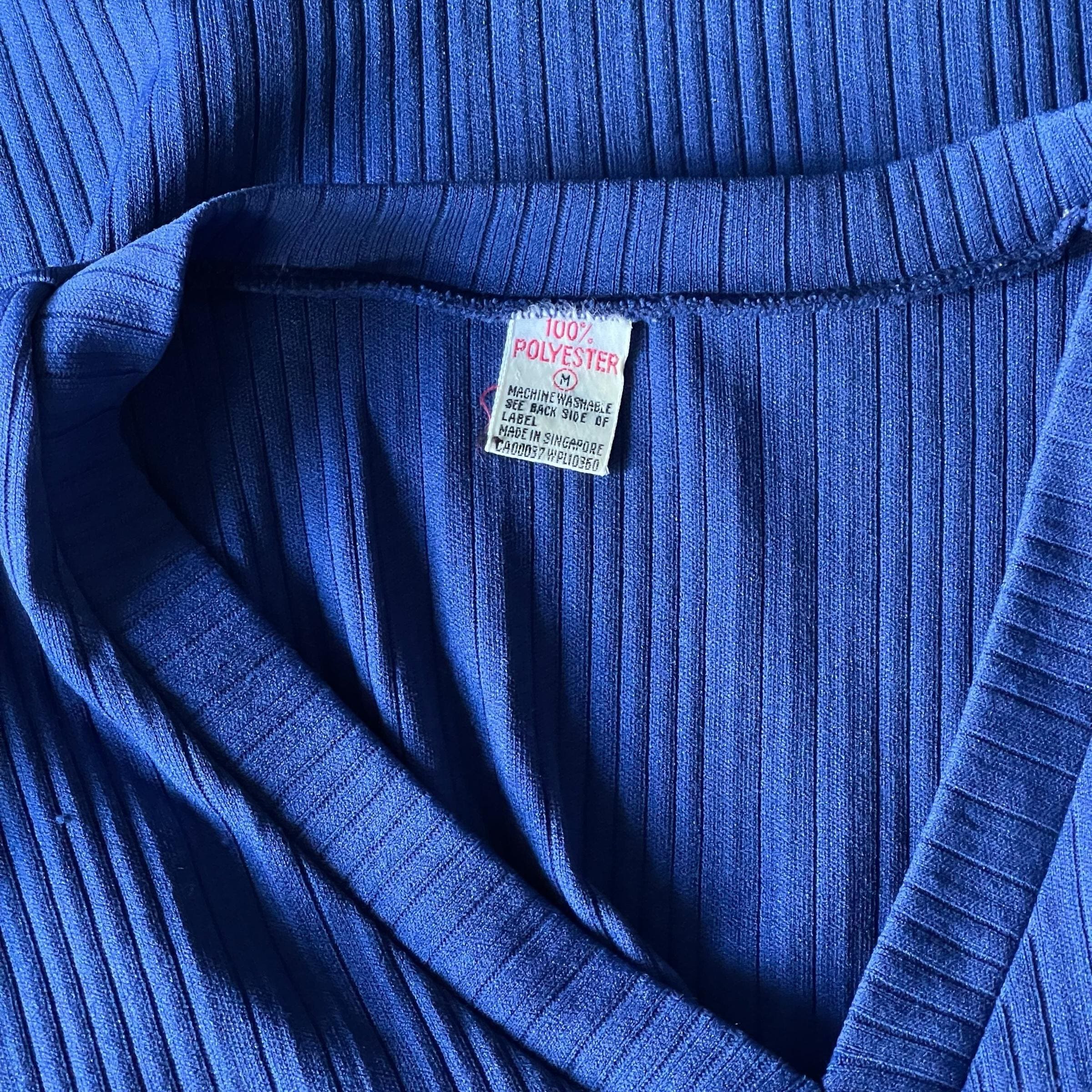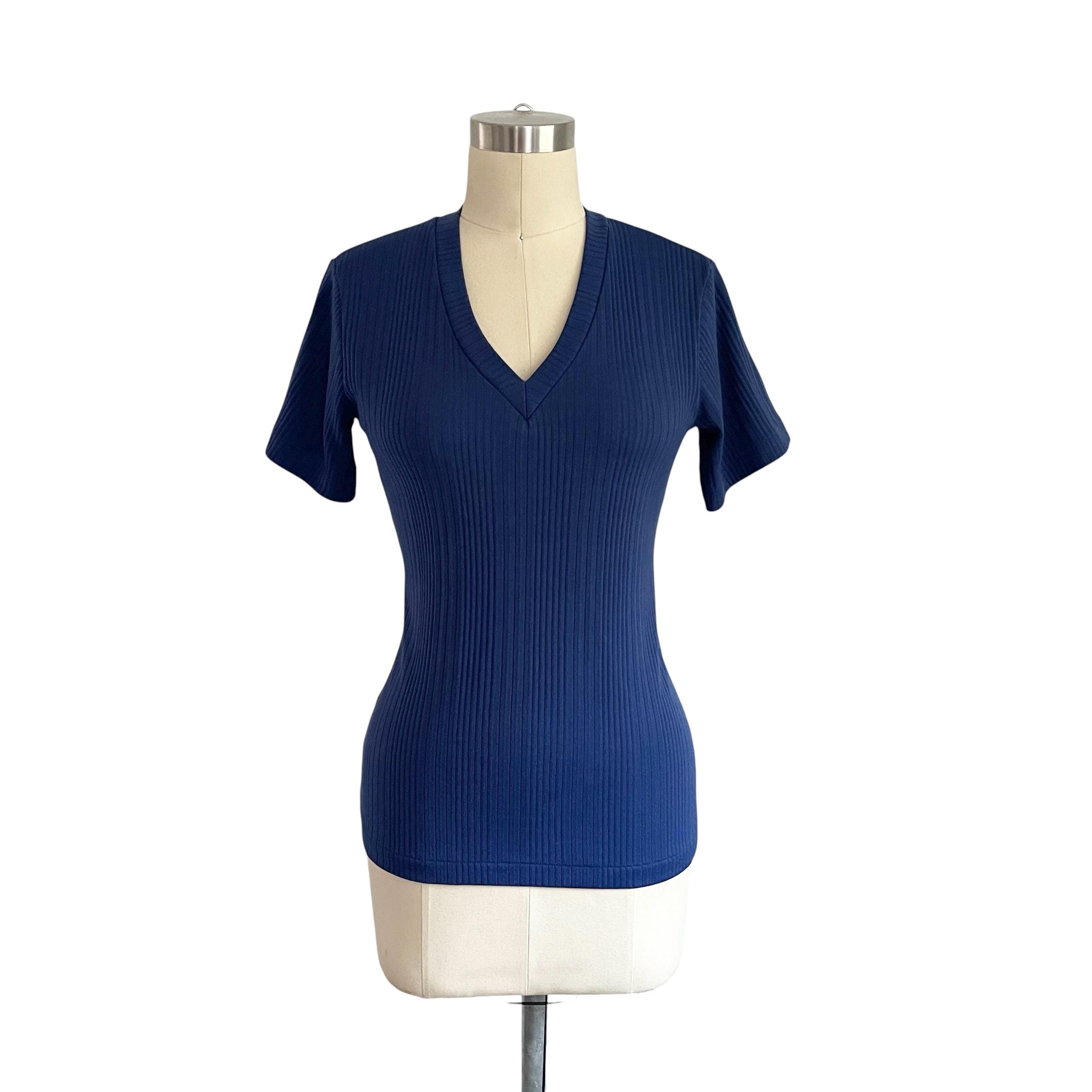 Vintage Royal Blue Ribbed Sweater Top: Blue V-Neck Top, Short Sleeves, Stretch, Casual, Everyday, 80s 90s Y2K.