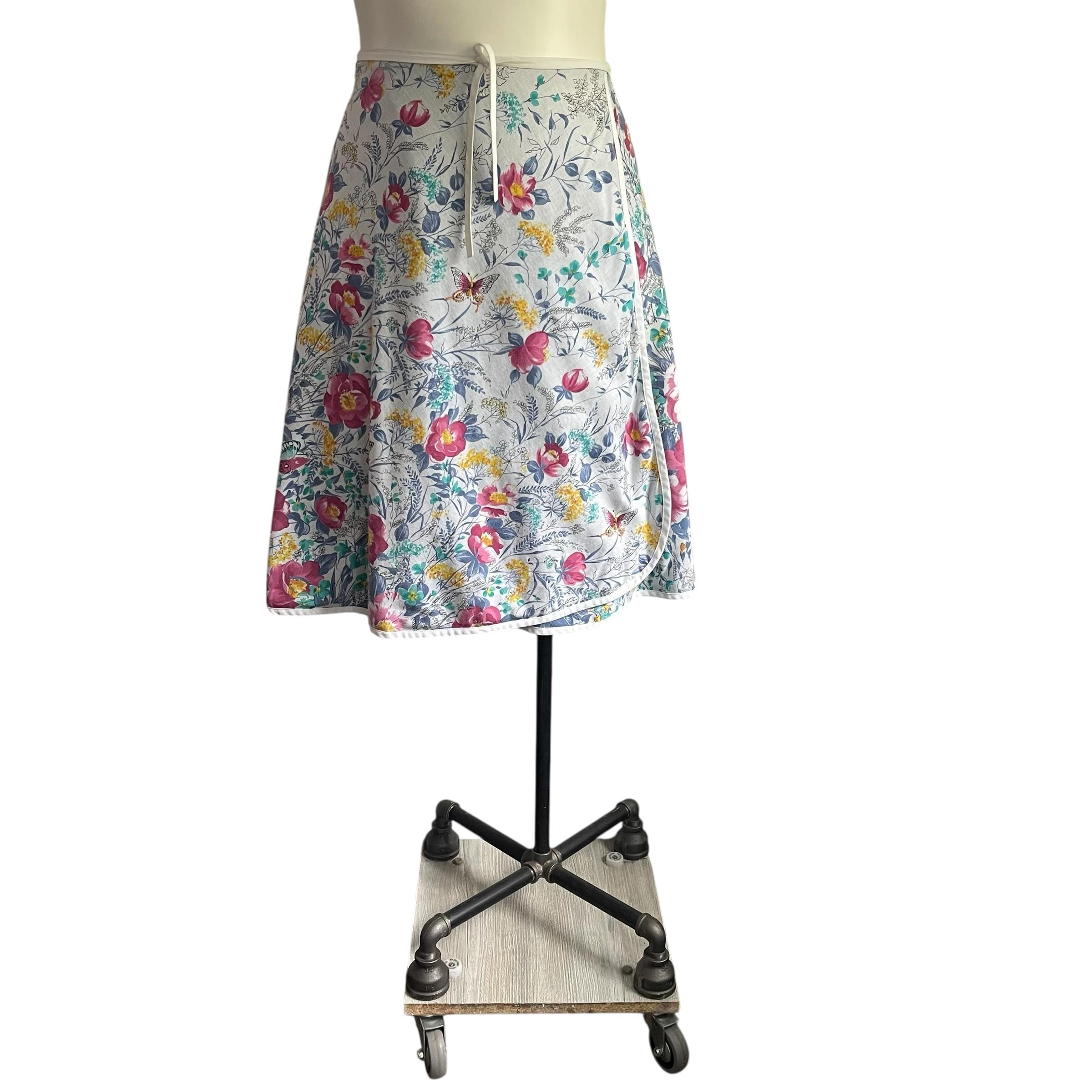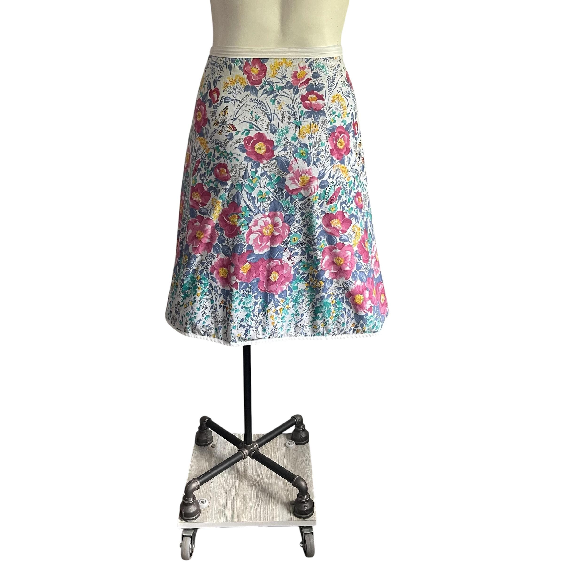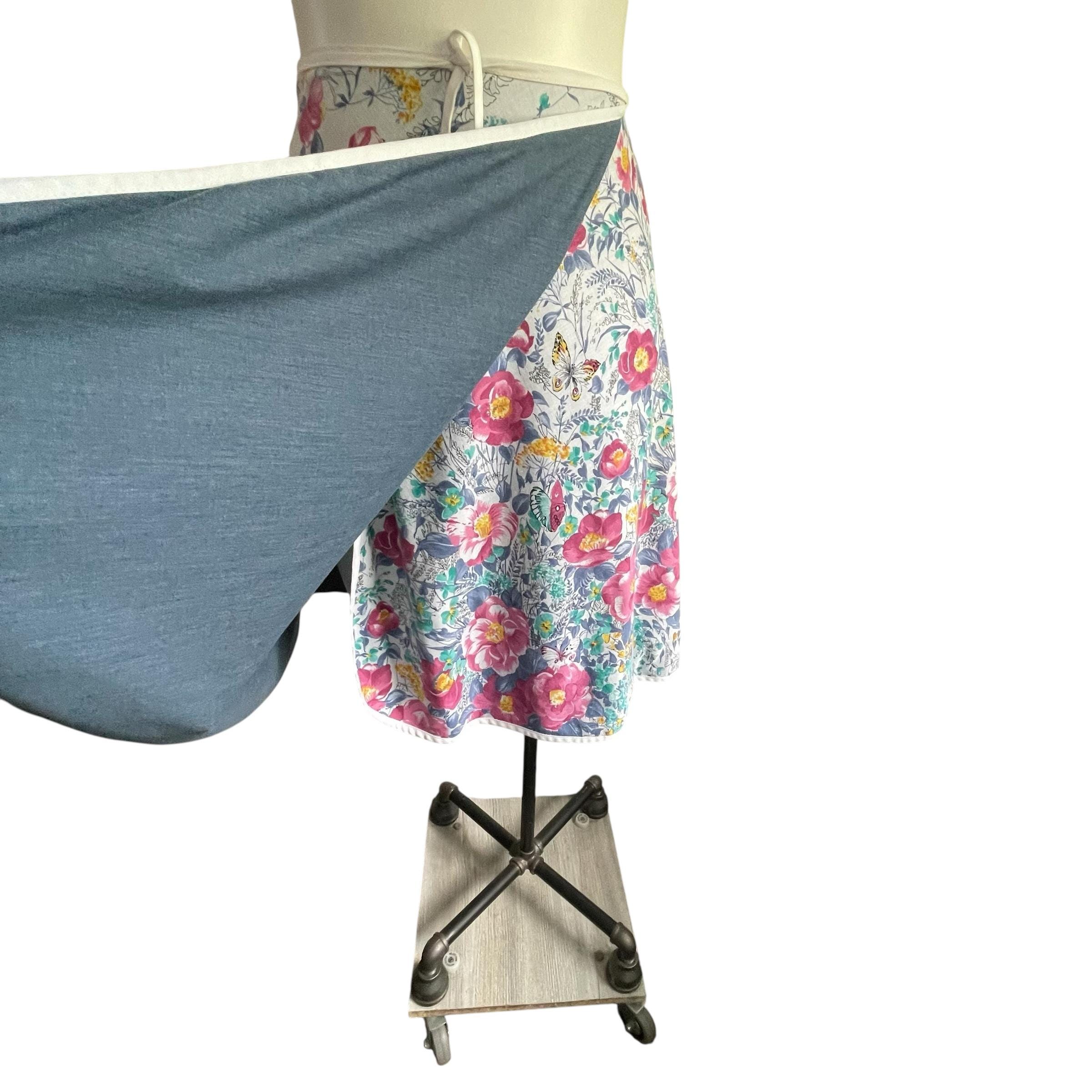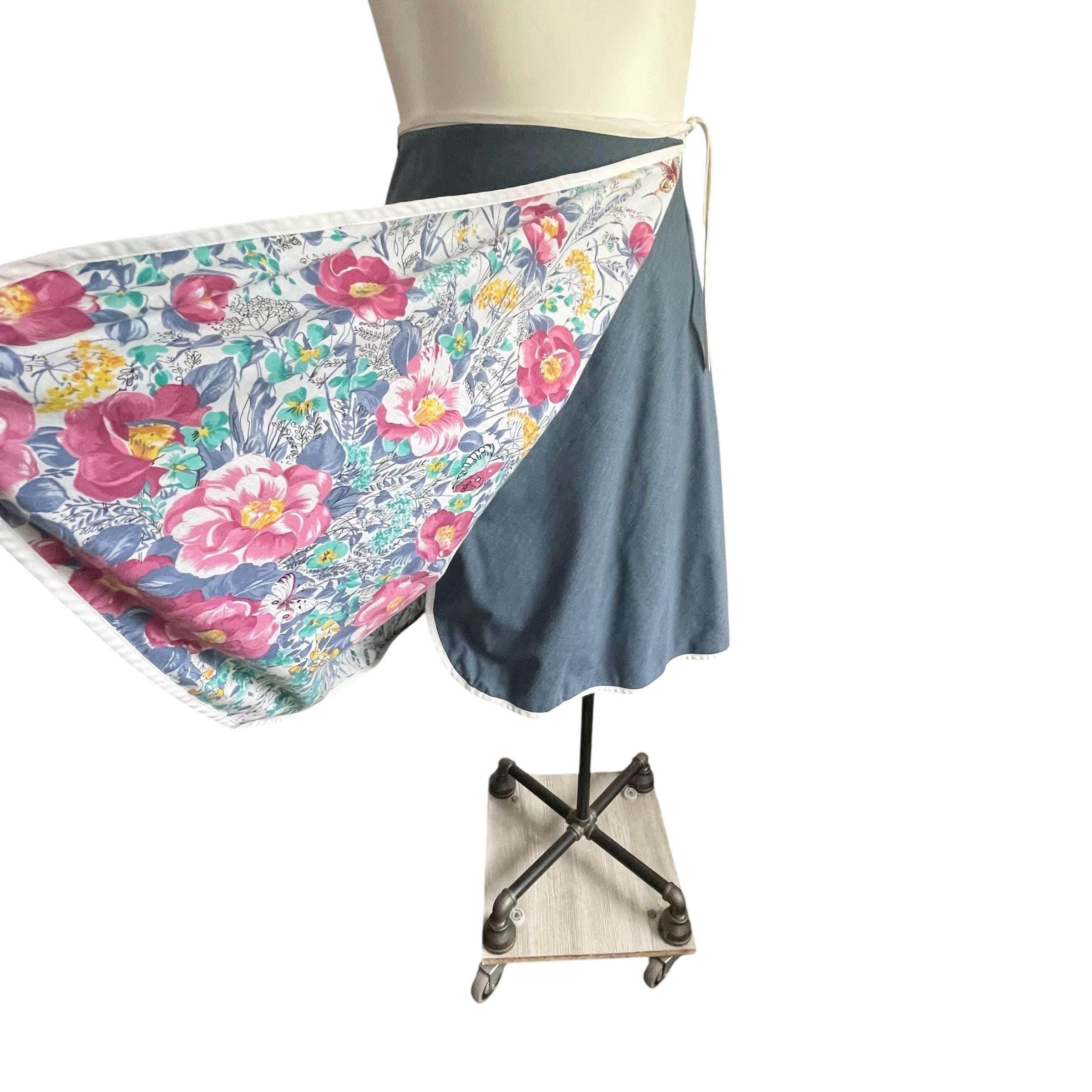 Vintage Floral & Chambray Wrap Skirt: Chambray Blue, Granola Chic, Whimsy, Cottage Garden Floral Skirt, 70s, 80s, Fairycore Dress Skirt.