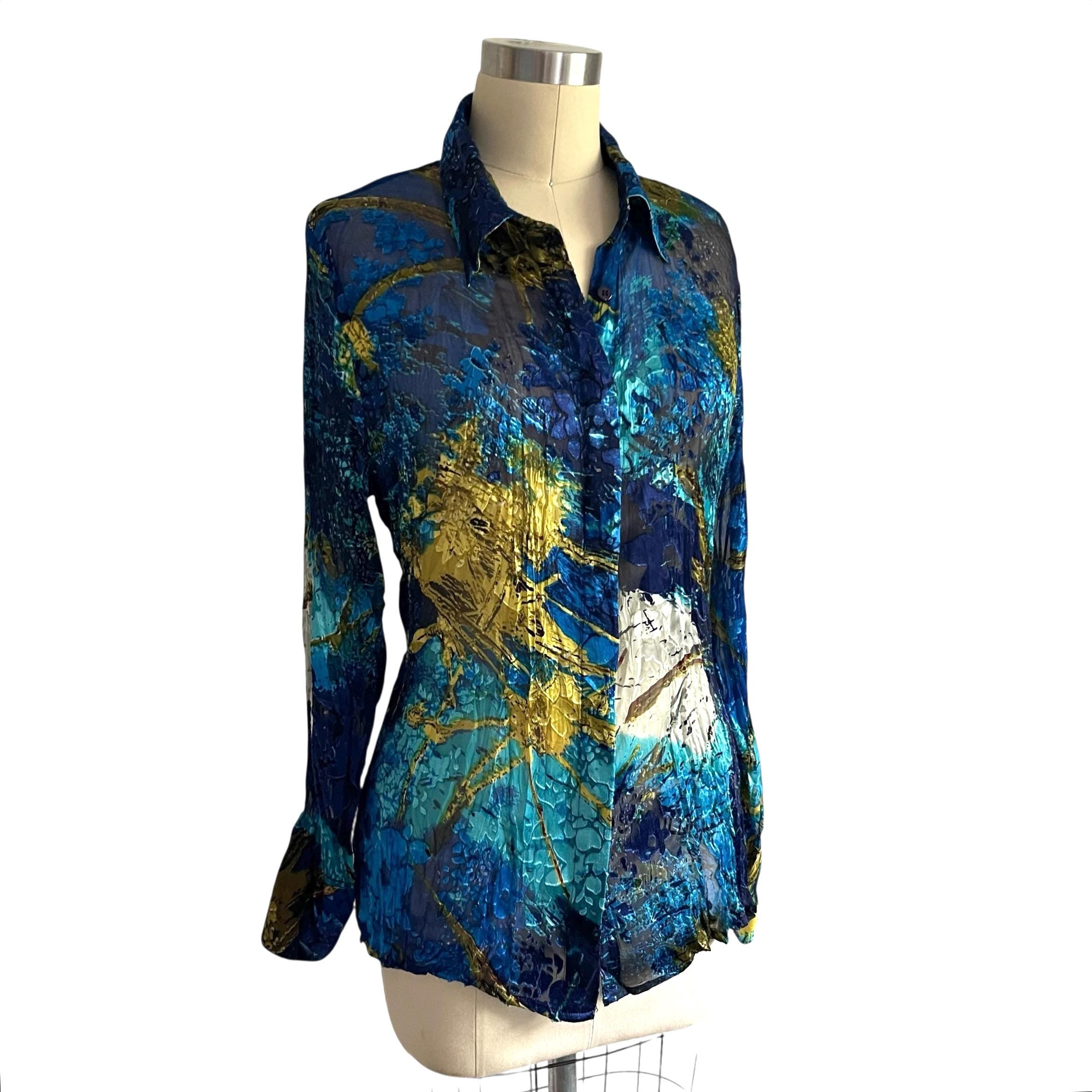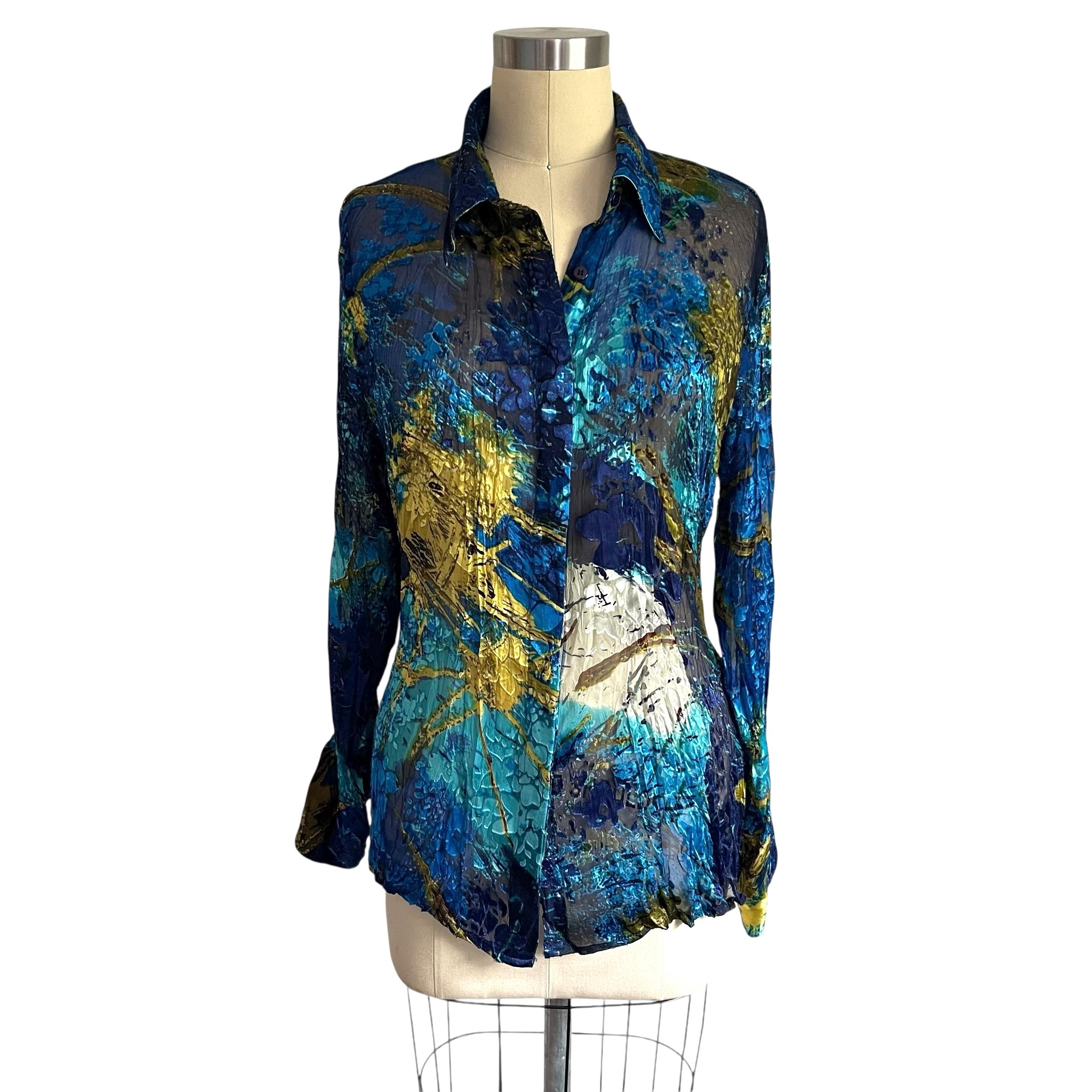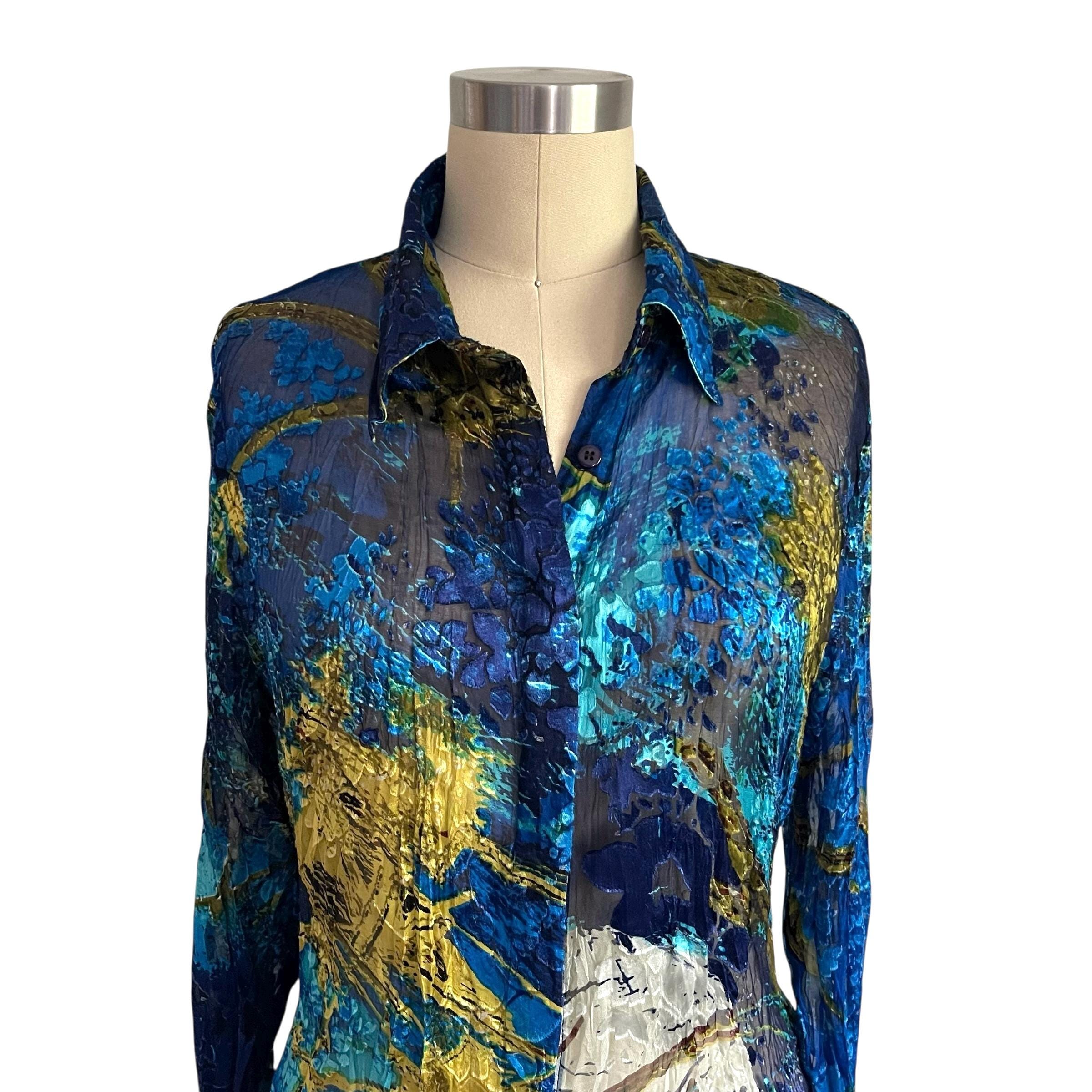 Vintage Anne Giorgio Multicolor Floral Semi-Transparent Button-Up Blouse.