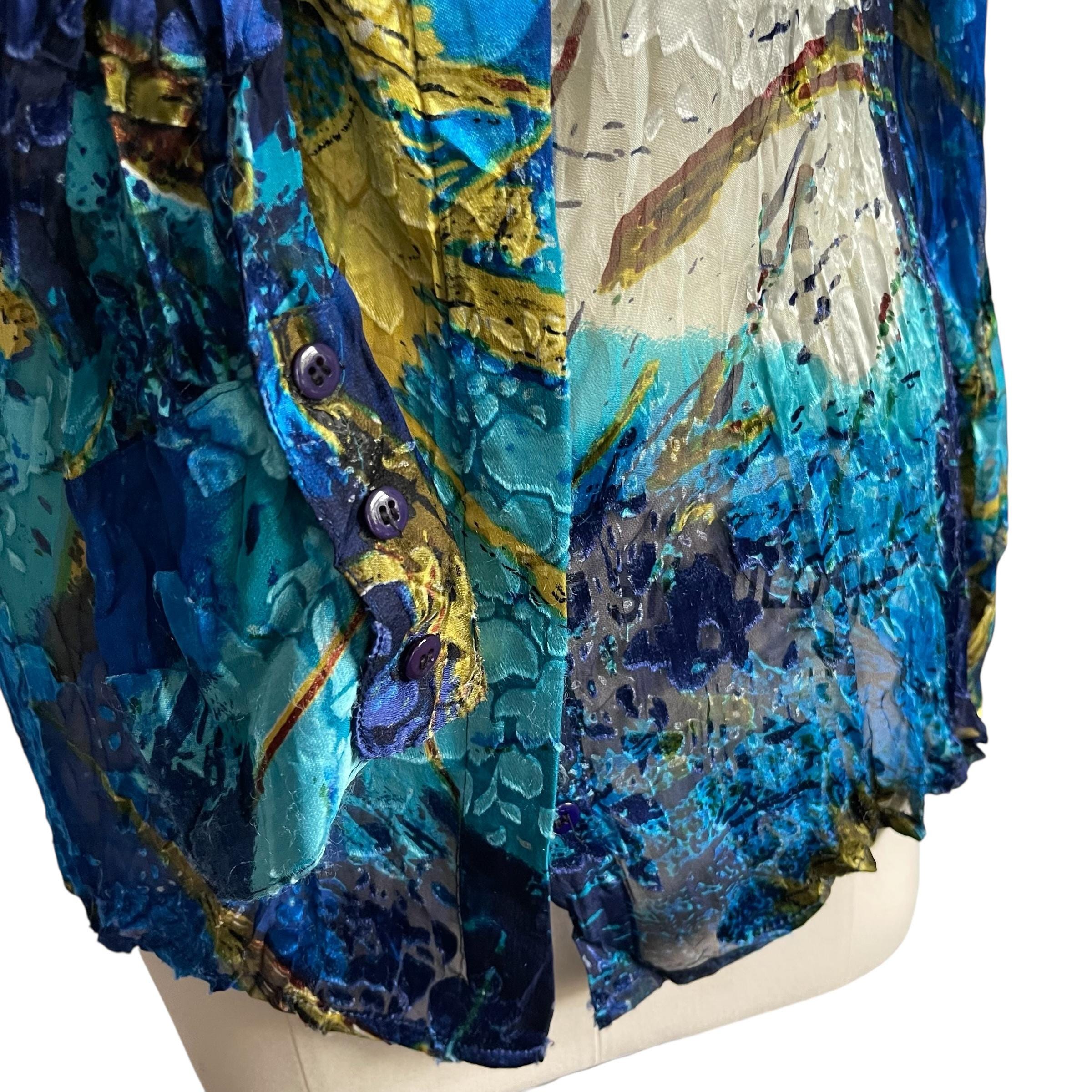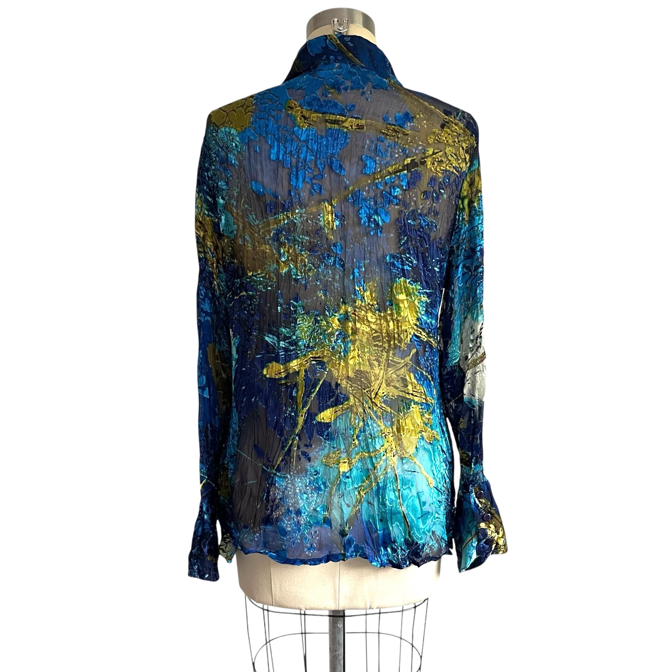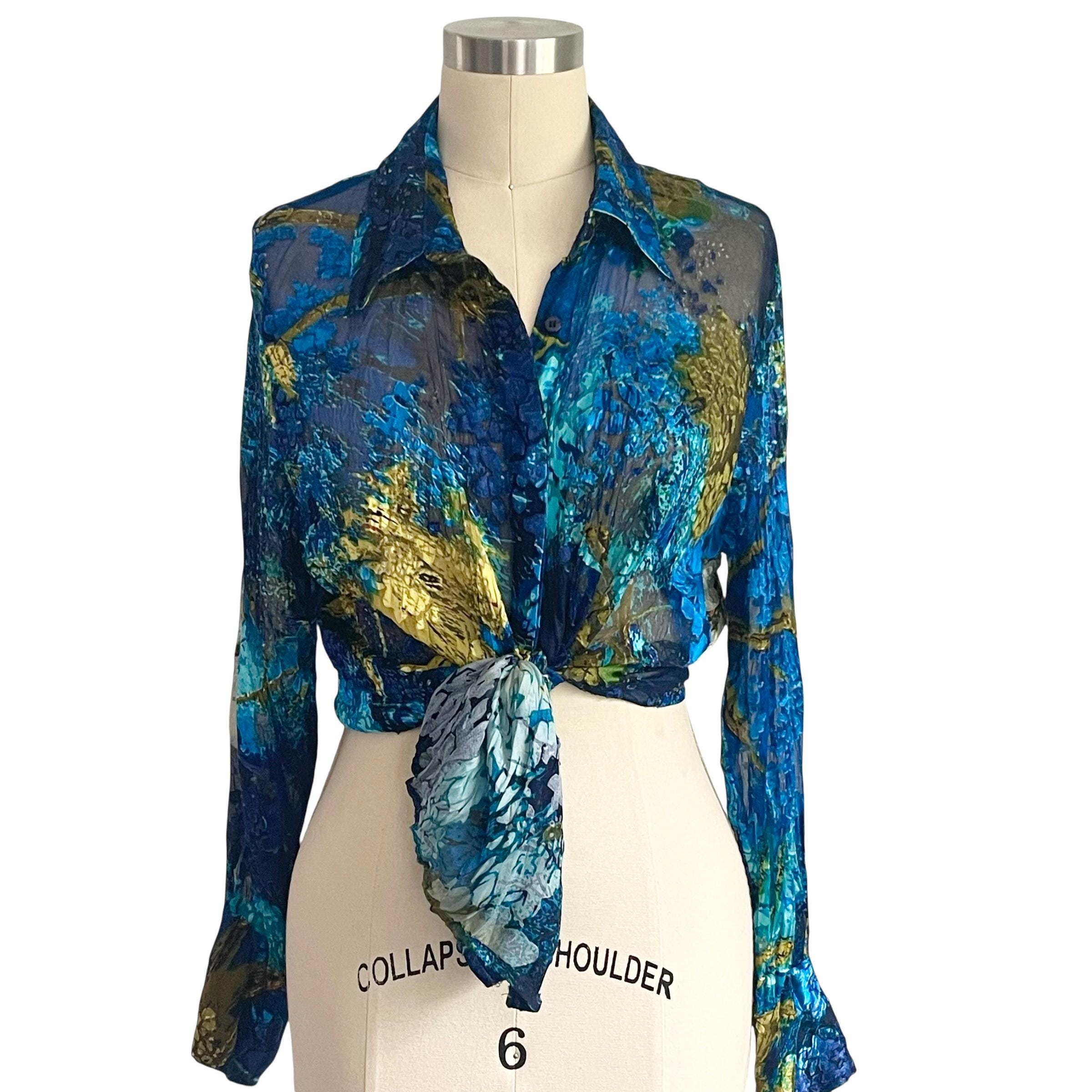 Vintage Anne Giorgio Multicolor Floral Semi-Transparent Button-Up Blouse.