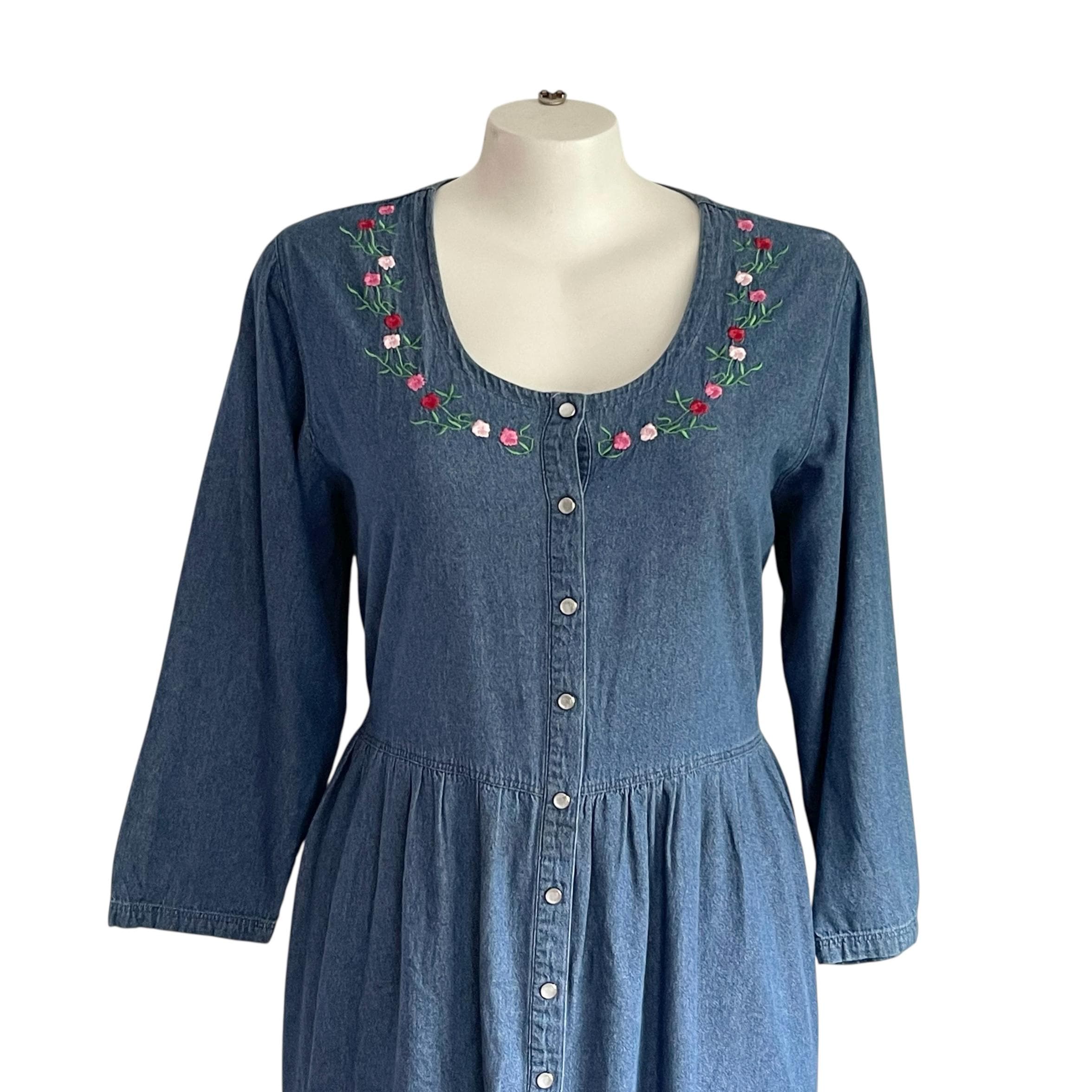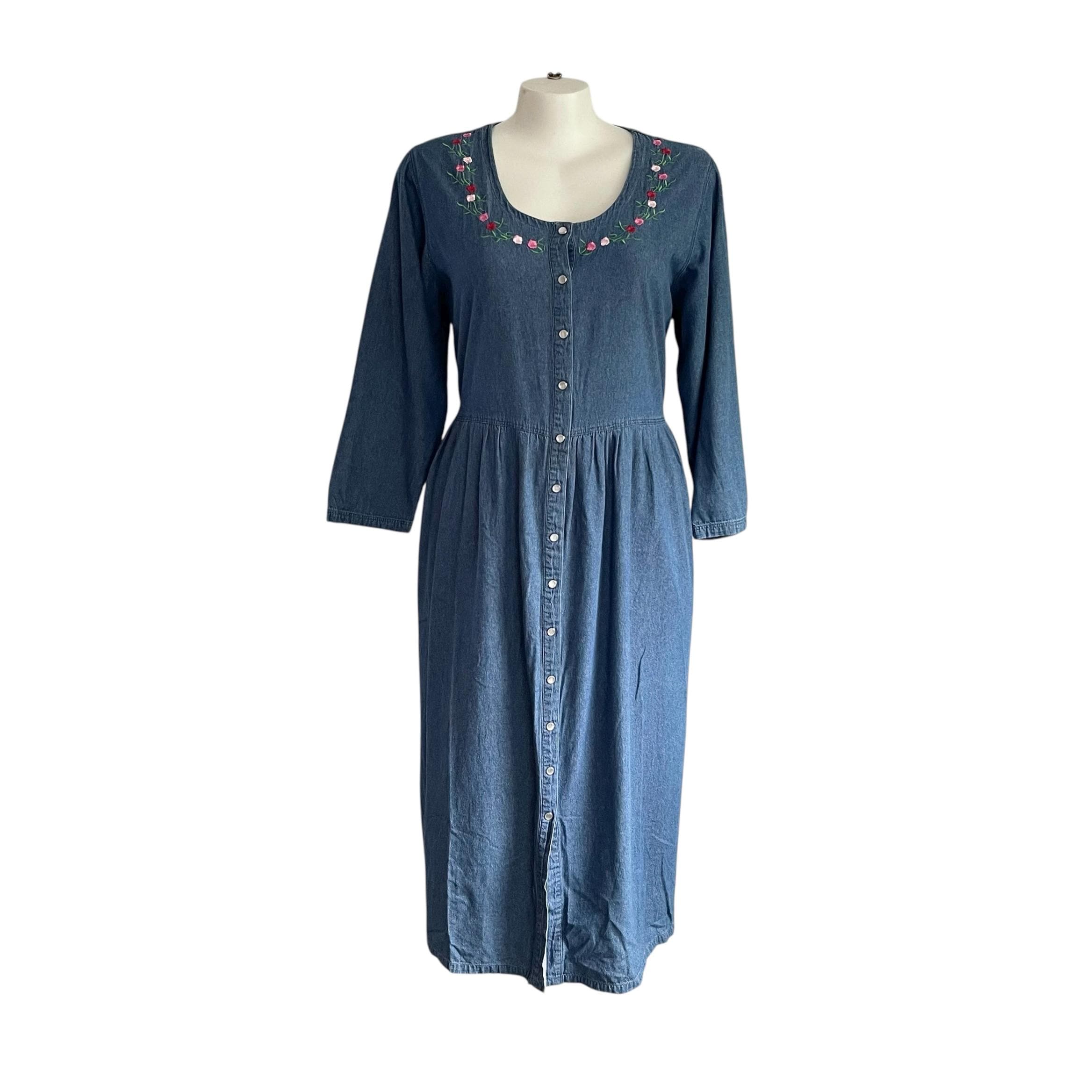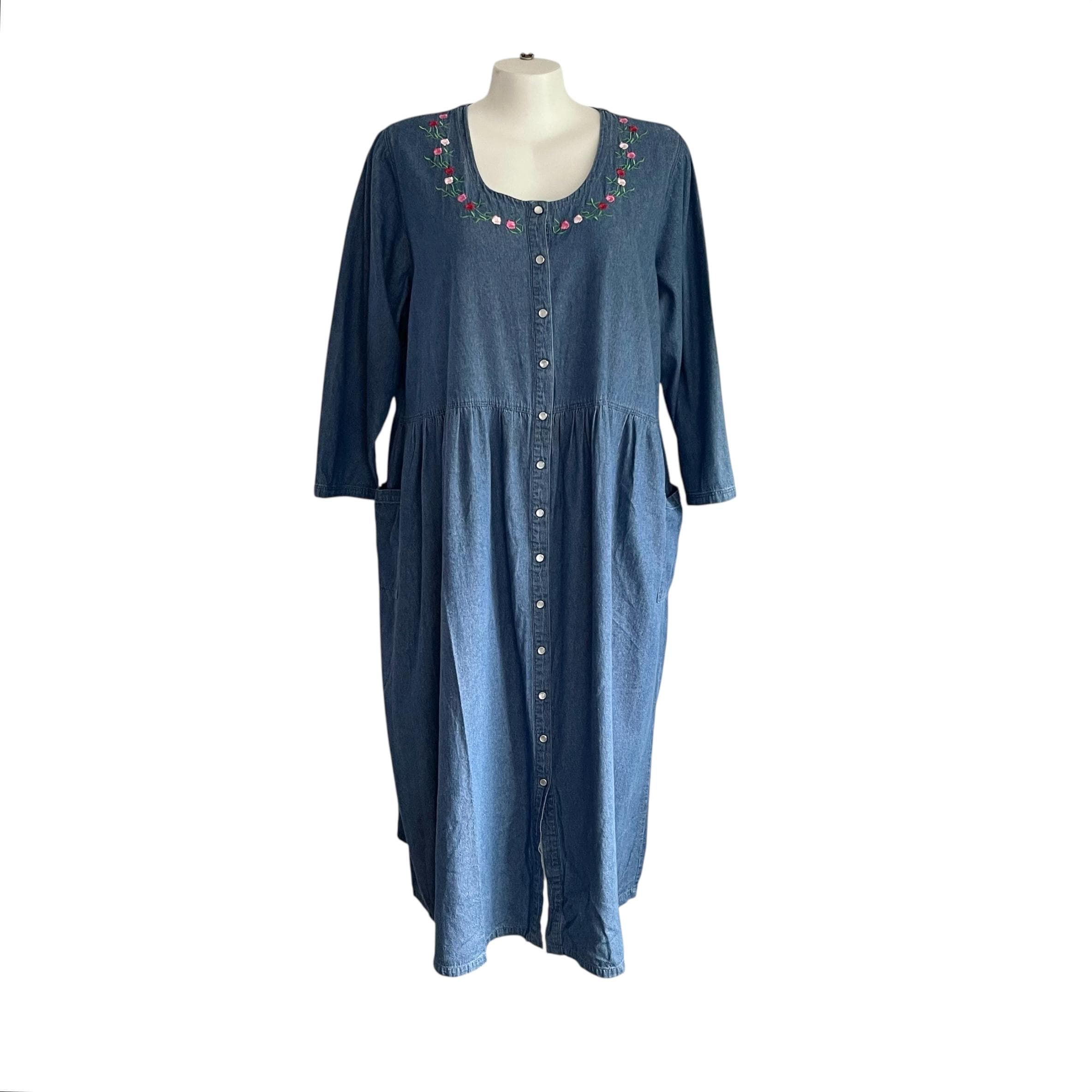 Vintage Woman Within Plus-Sized Dress: Plus Size, Denim/Chambray, Floral, Embroidered, Long Sleeves, Buttons, Cottagecore Dress.