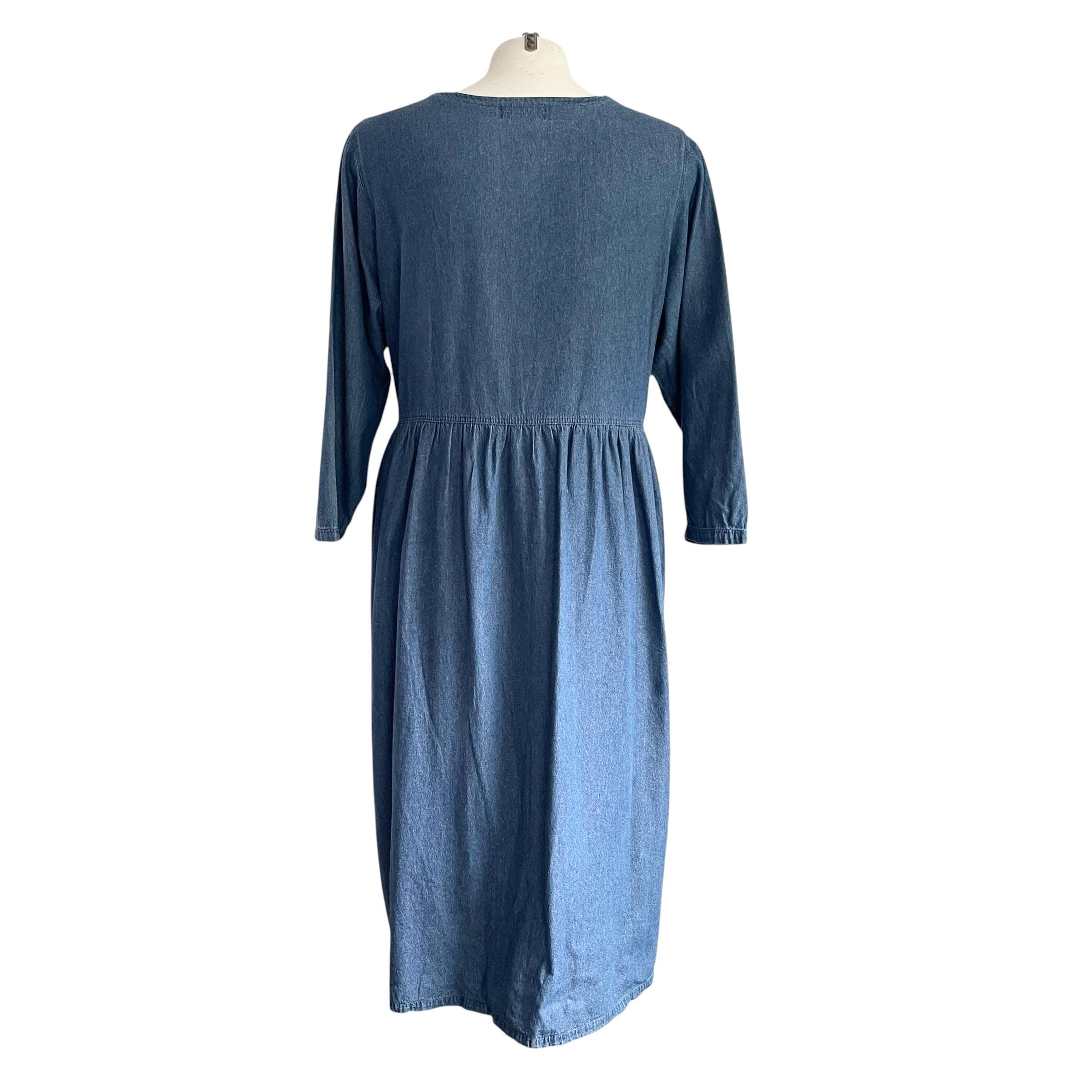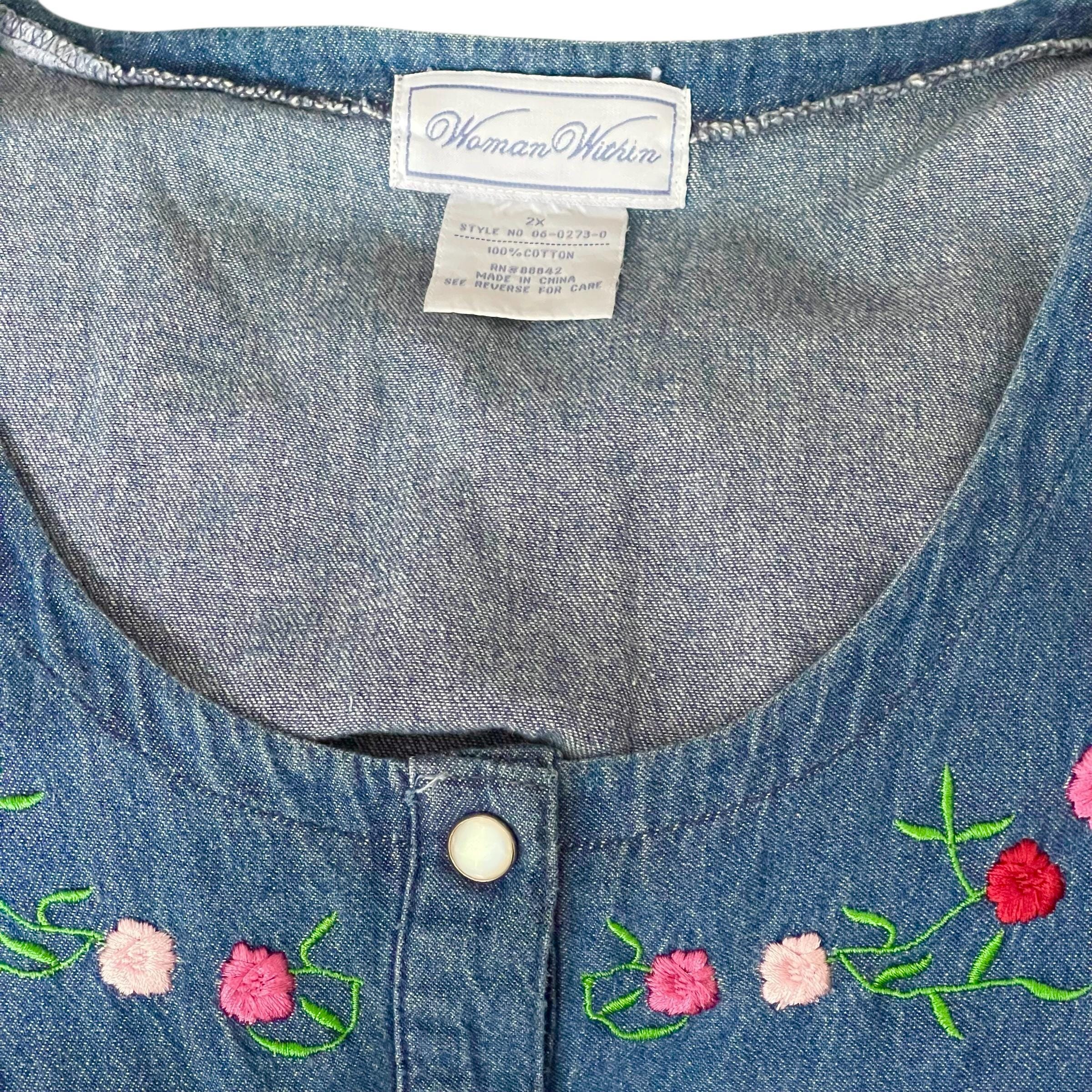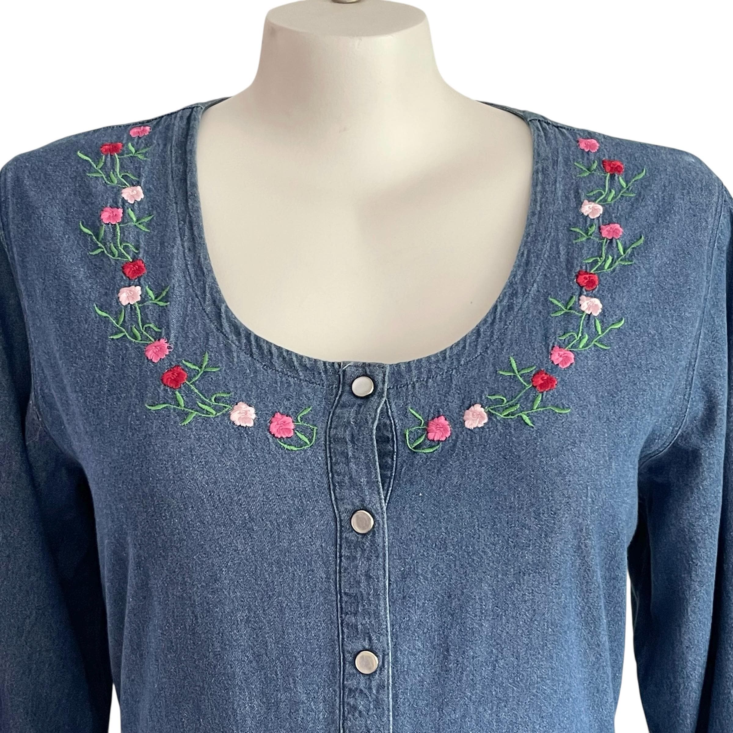 Vintage Woman Within Plus-Sized Dress: Plus Size, Denim/Chambray, Floral, Embroidered, Long Sleeves, Buttons, Cottagecore Dress.