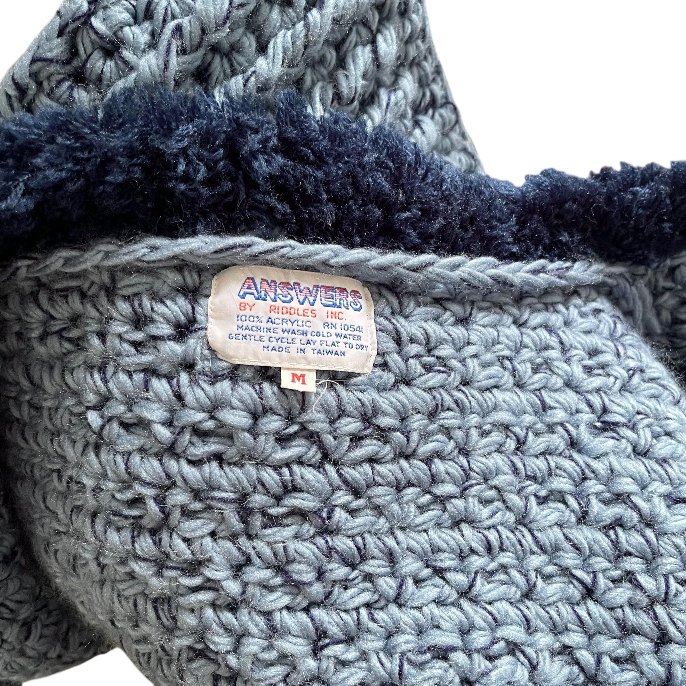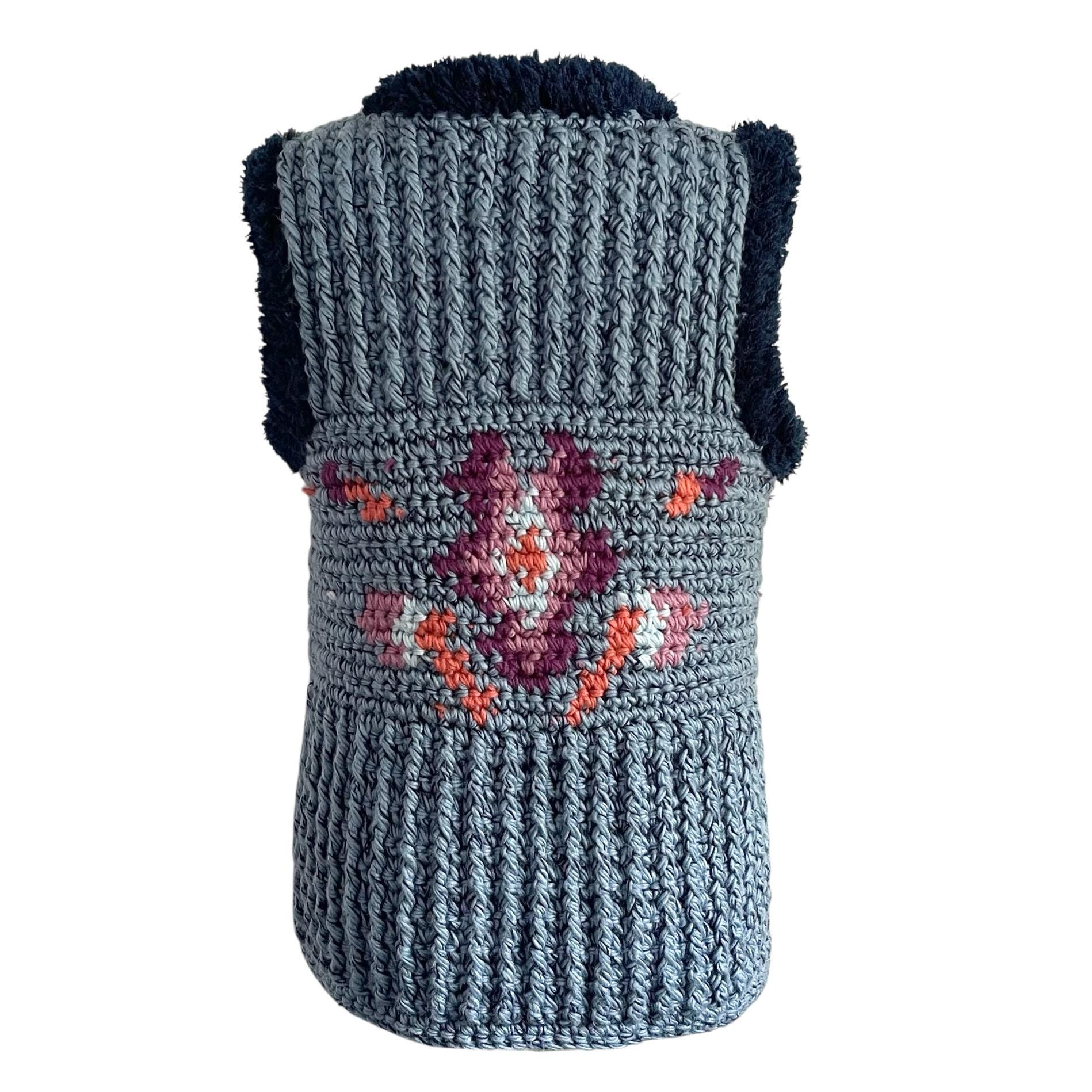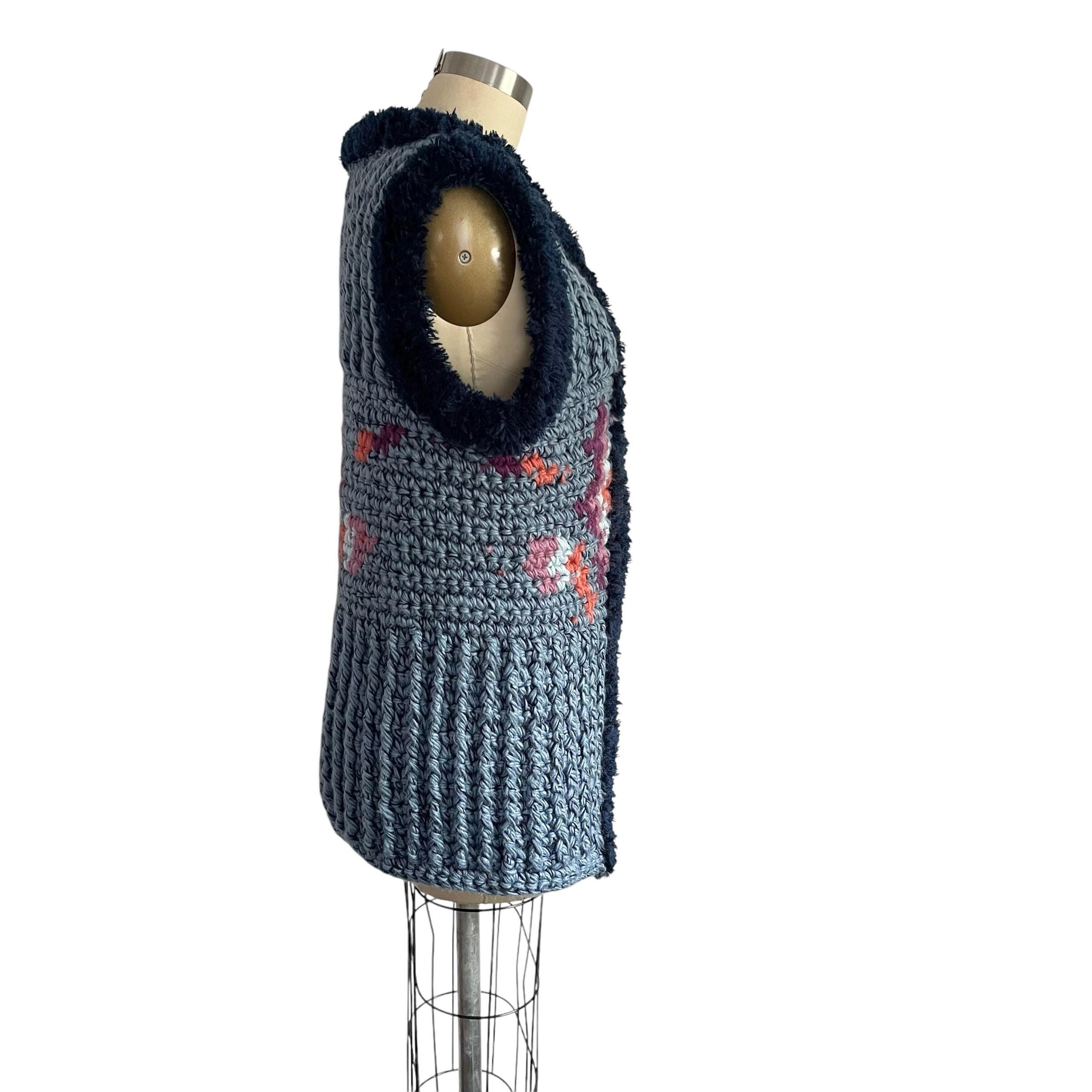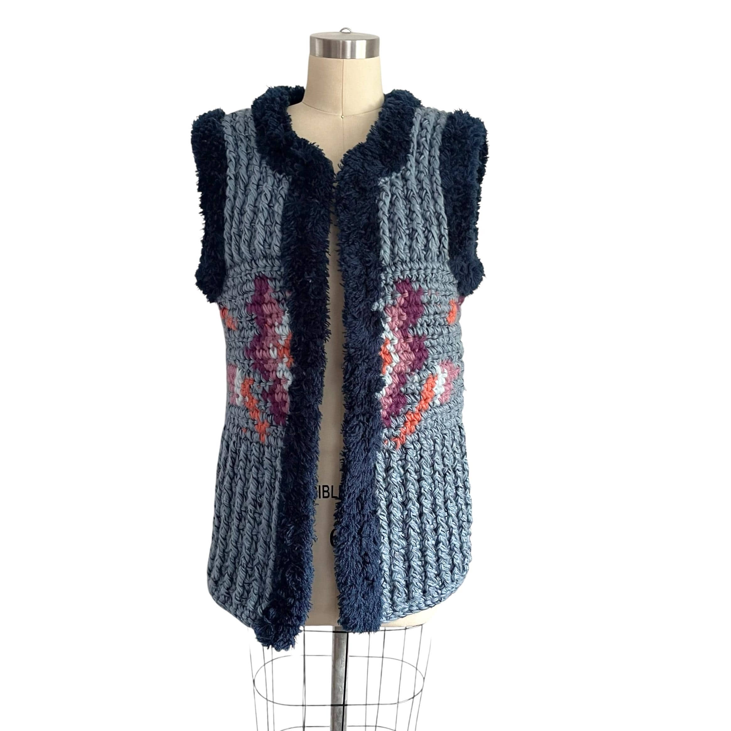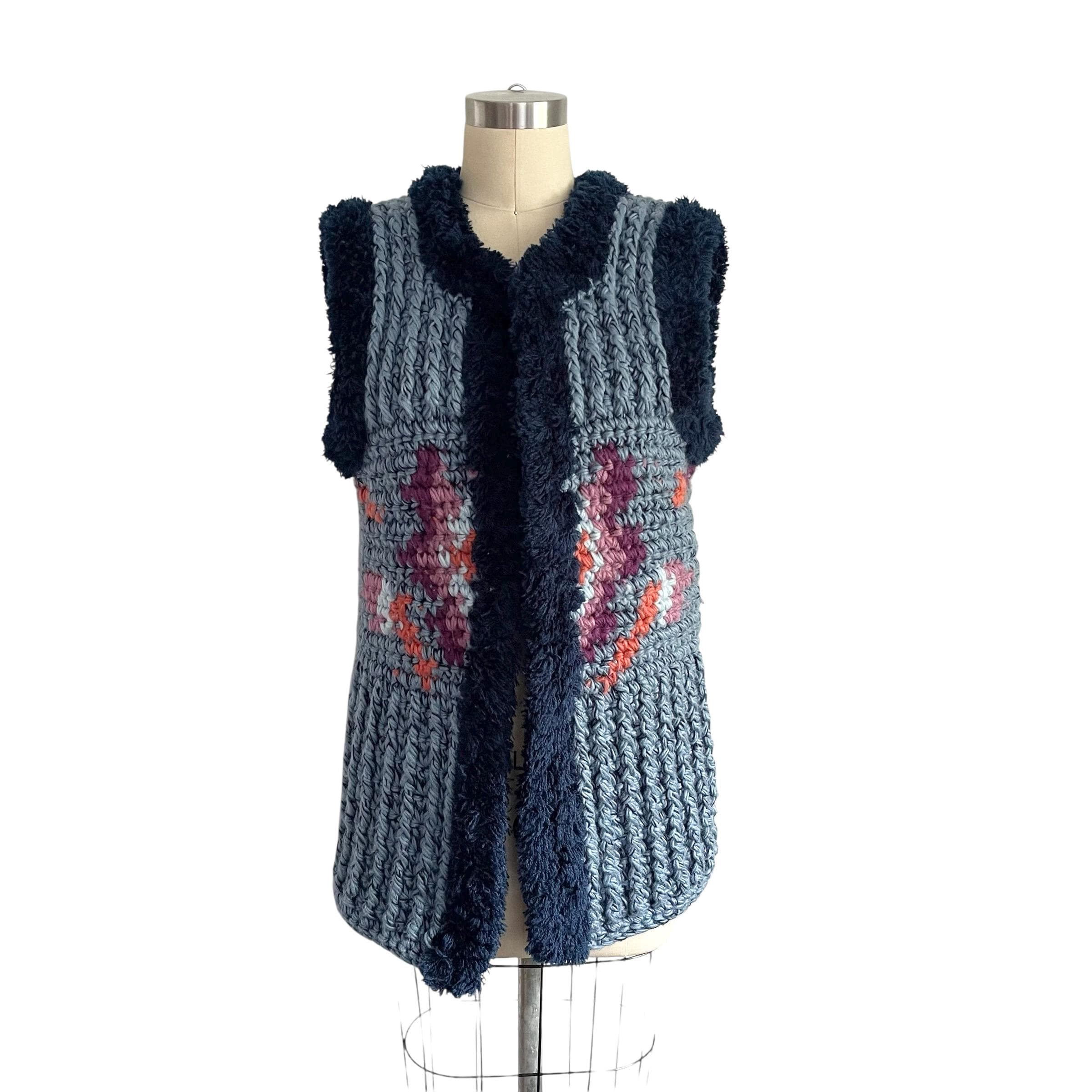 Vintage Answers Blue Multicolor Knit Sweater Vest: Knitted Floral Vest, Furry Trim, Southwestern, Cozy, 70s 80s 90s. Plush, Thick Vest.