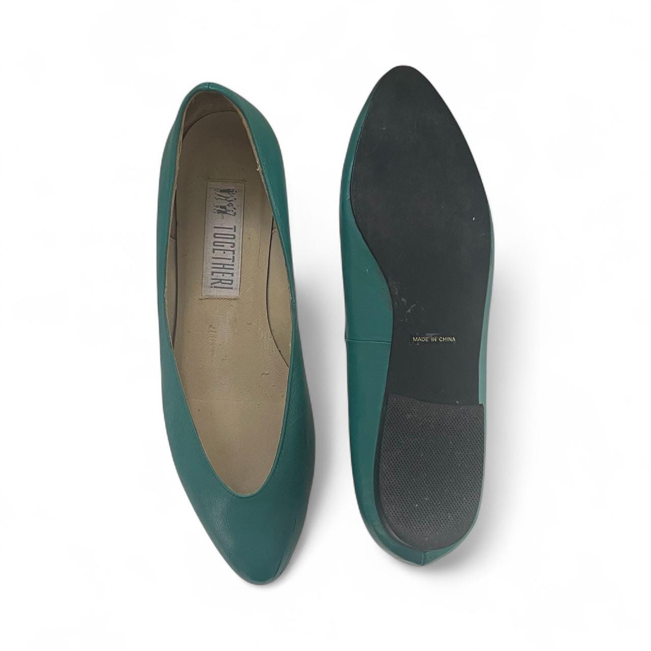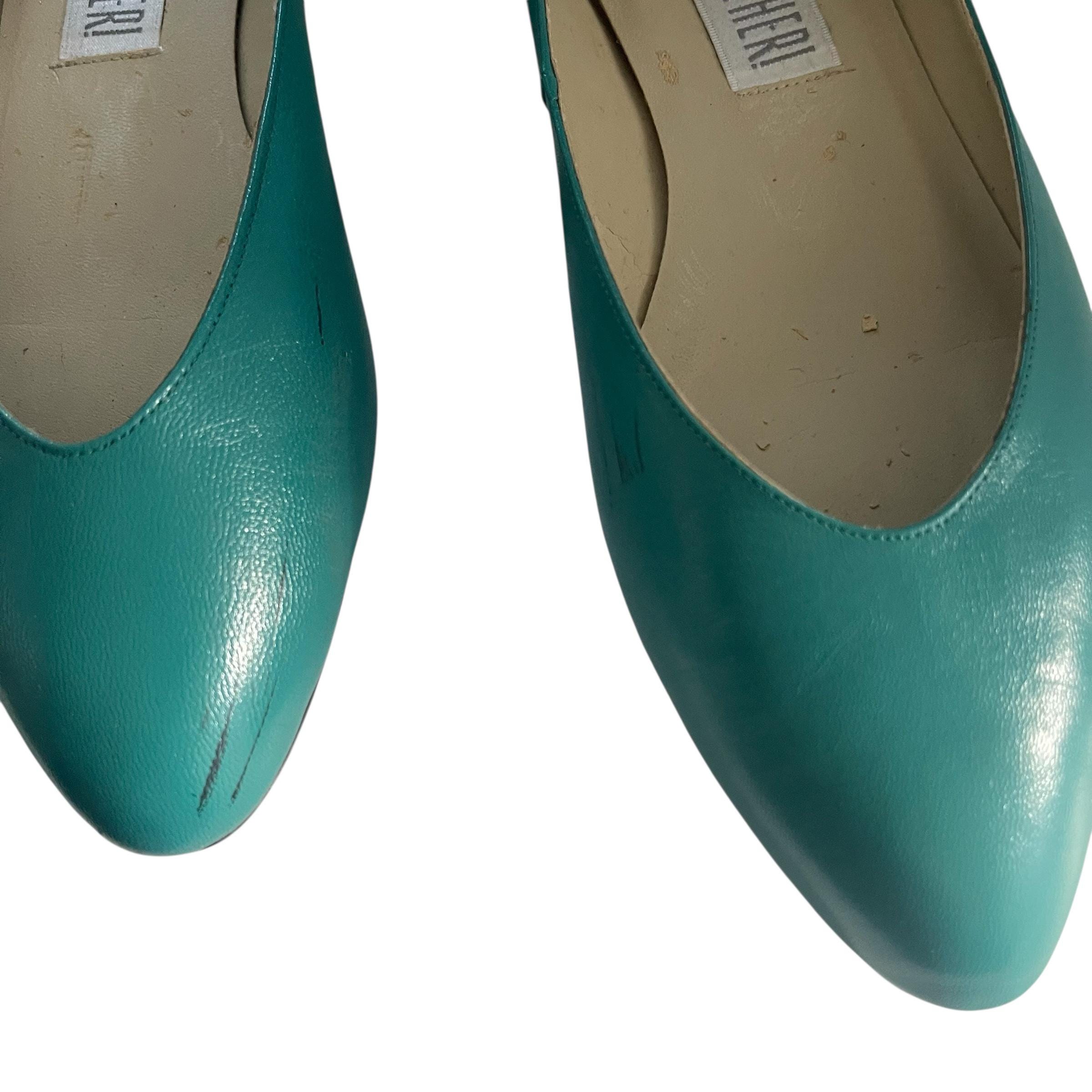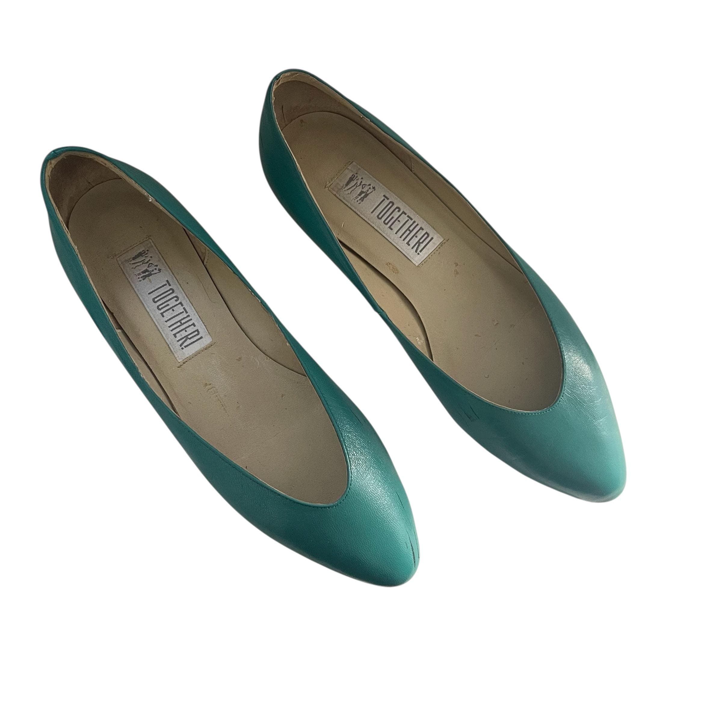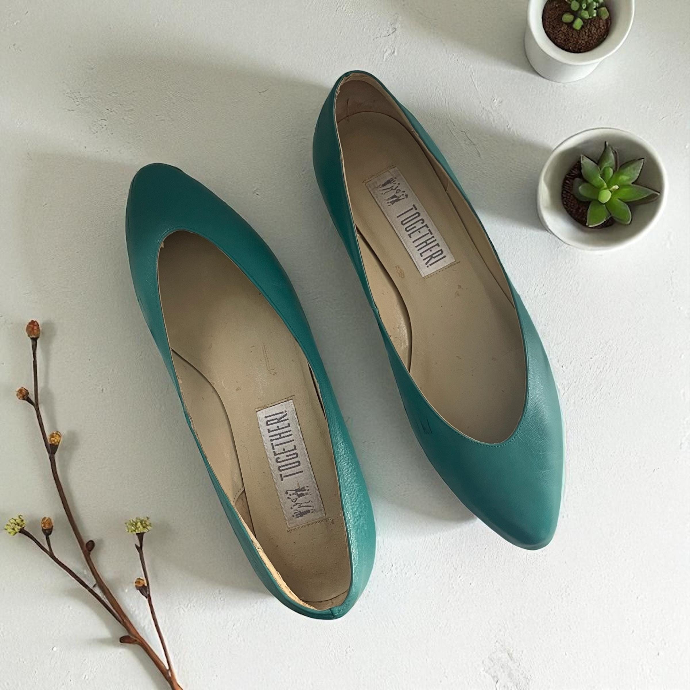 Vintage 80s 90s Teal Green Balletcore Flats: Pointy Scoop Toes, Leather, Preppy Academia.