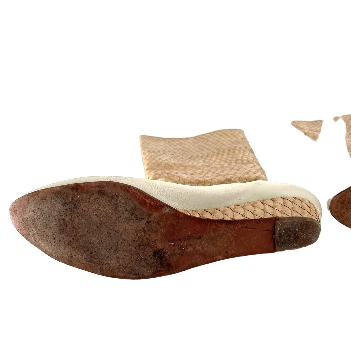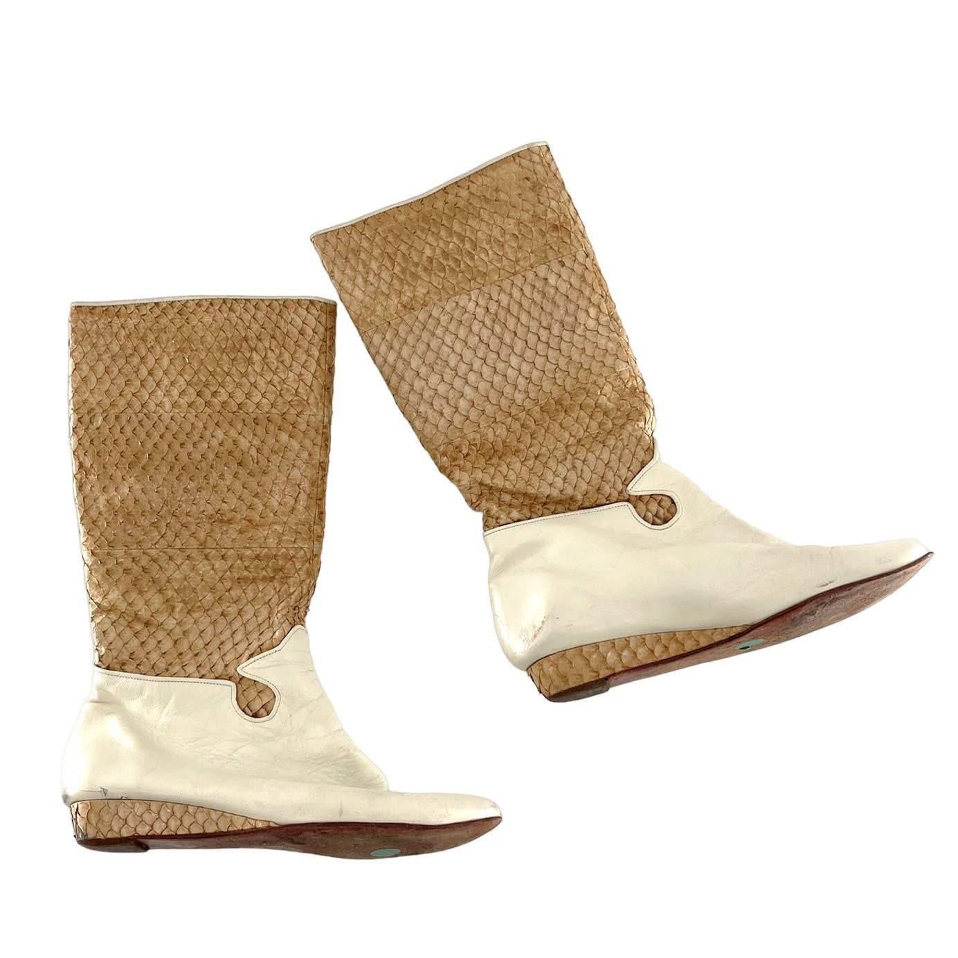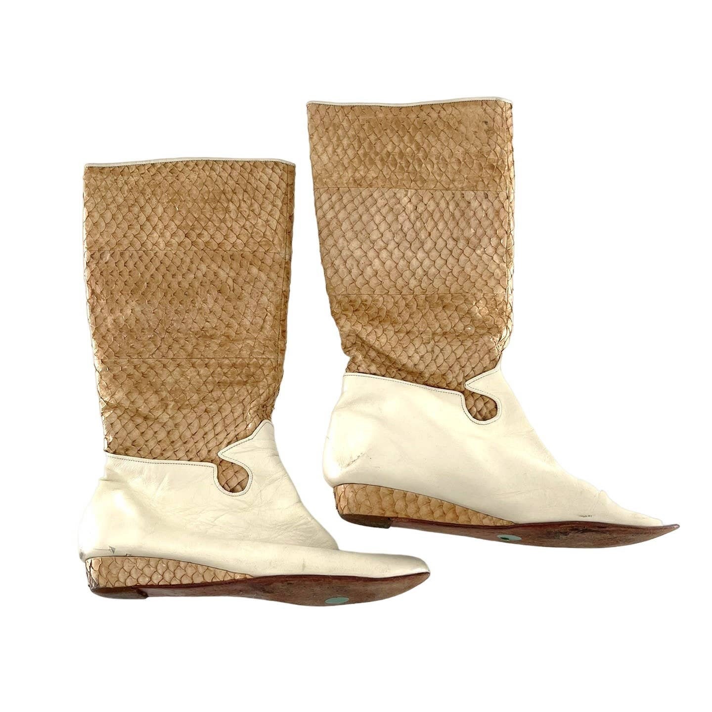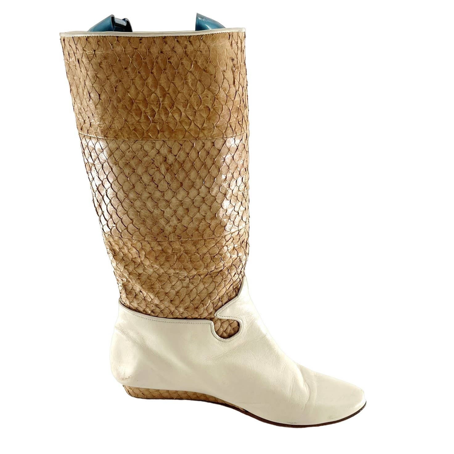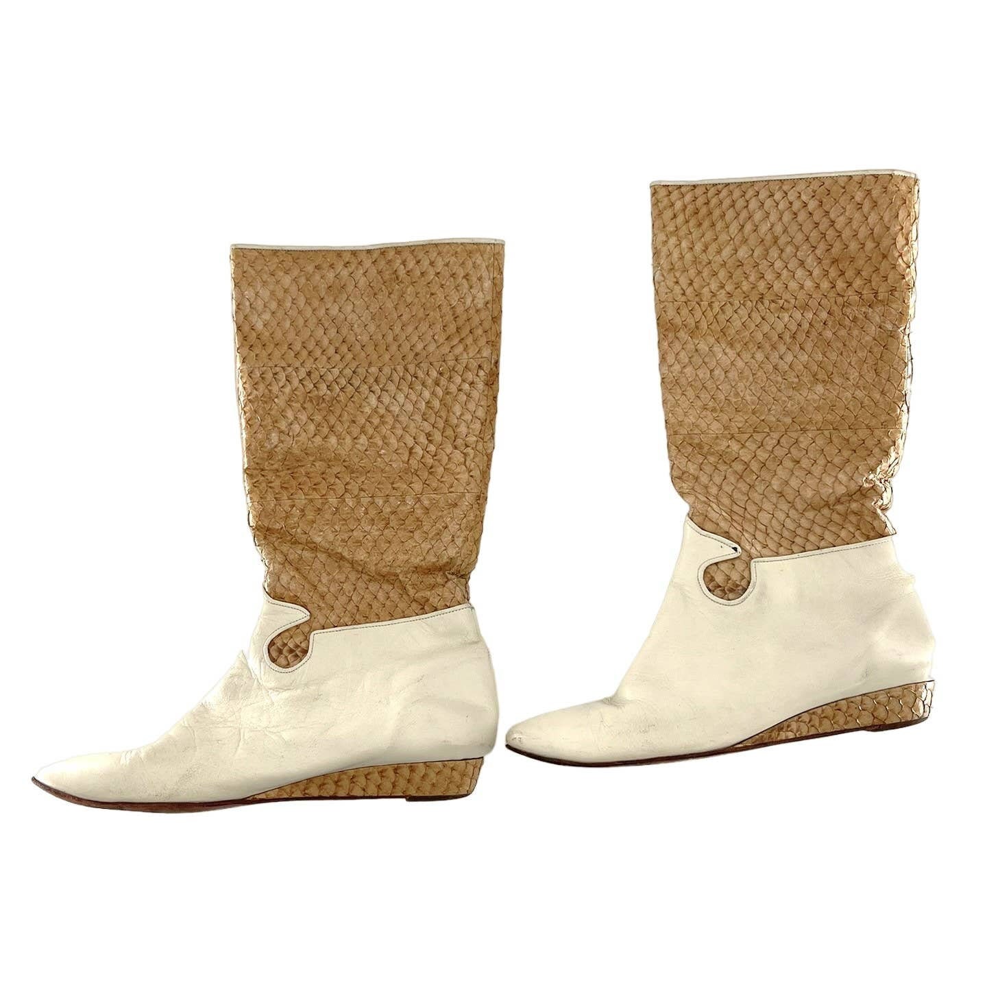 Vintage Steve Madden Ivory Wedge Boots has snake skin textured print, leather uppers and soles.