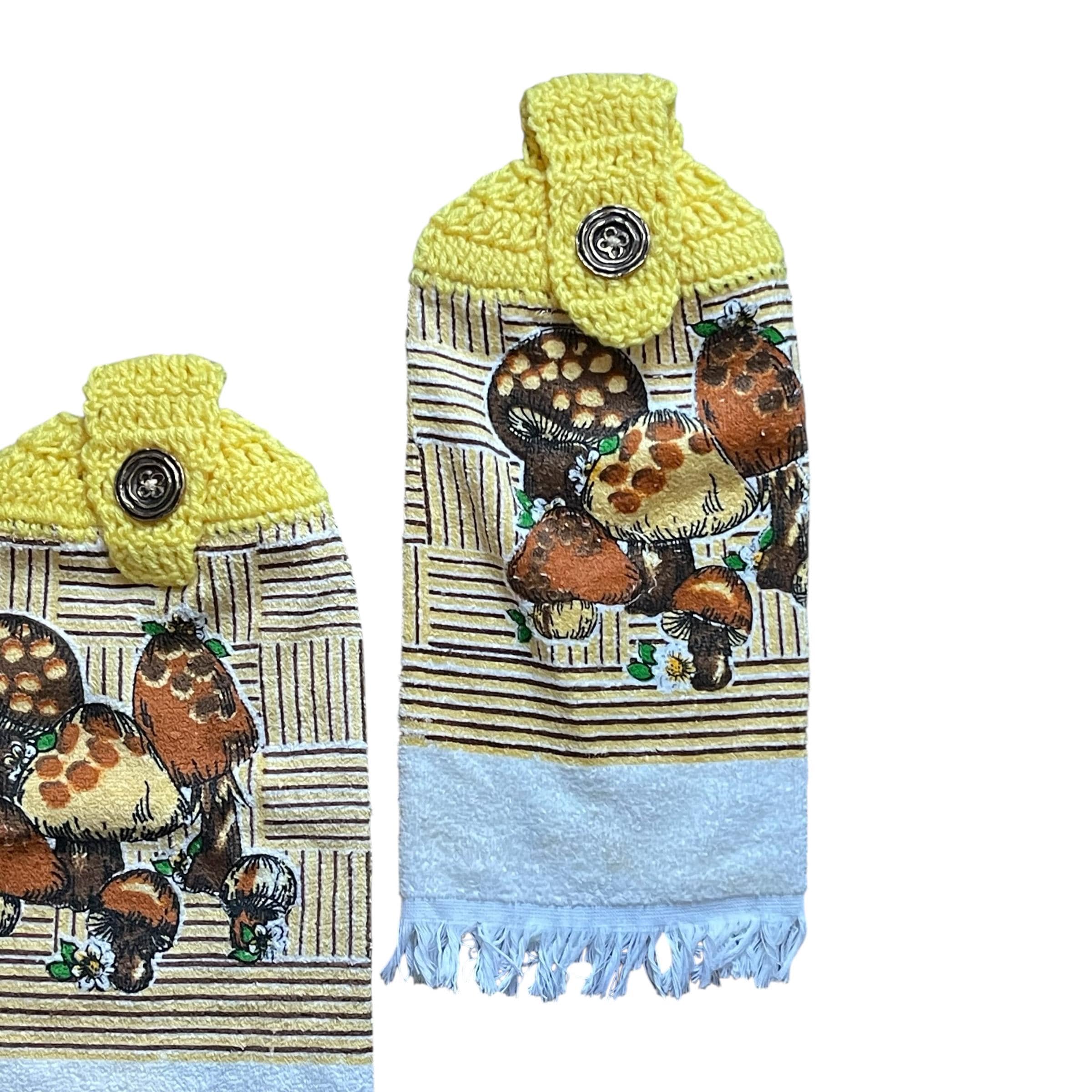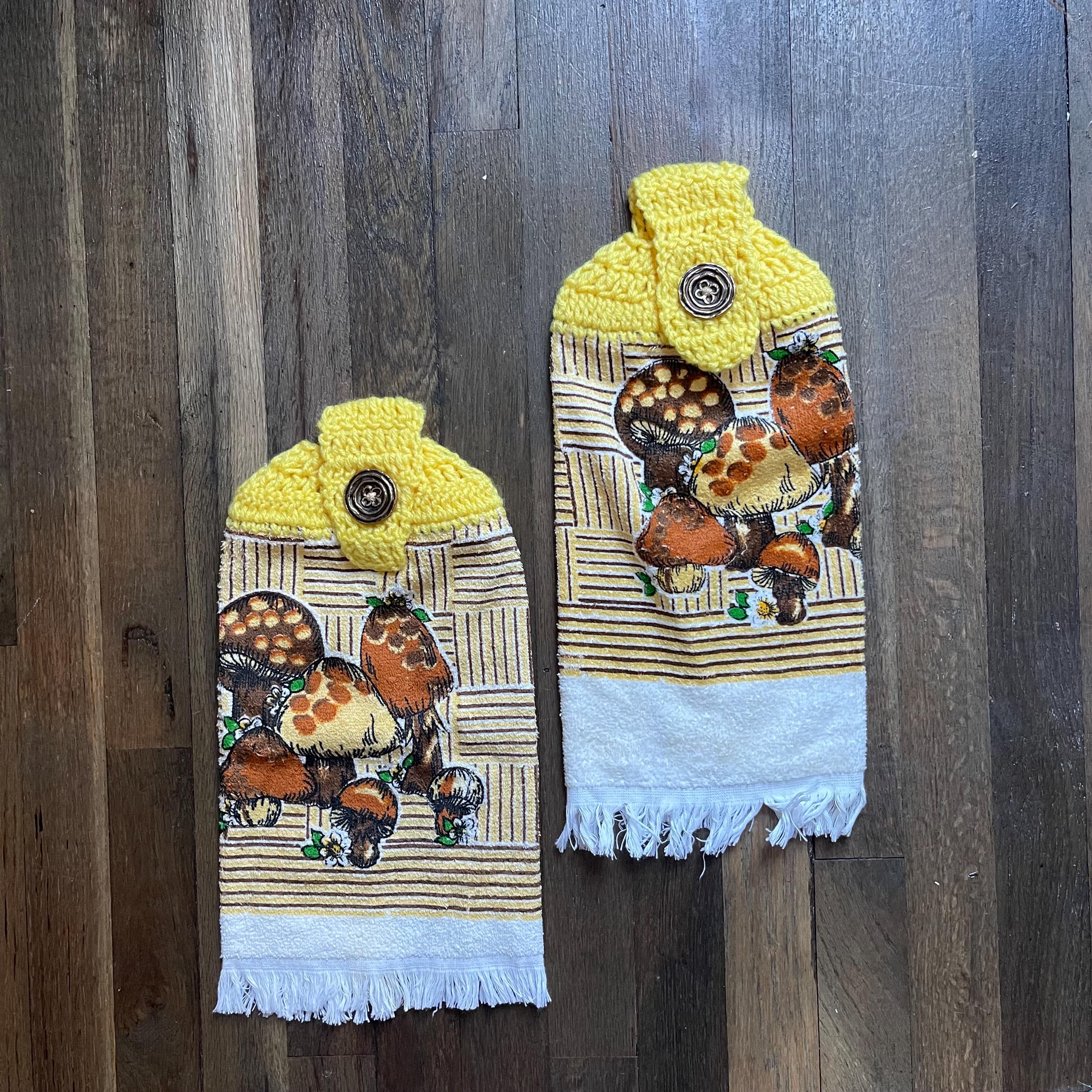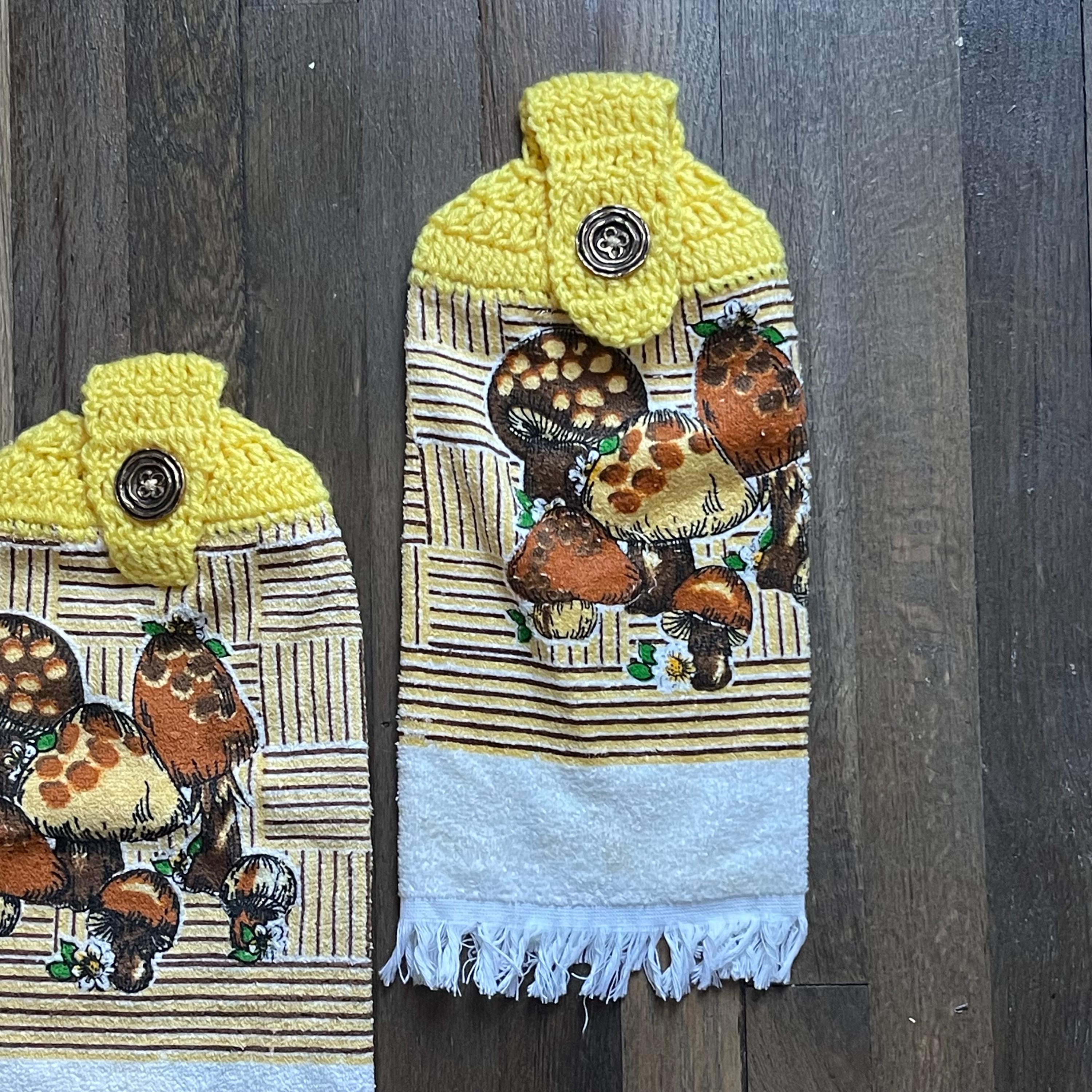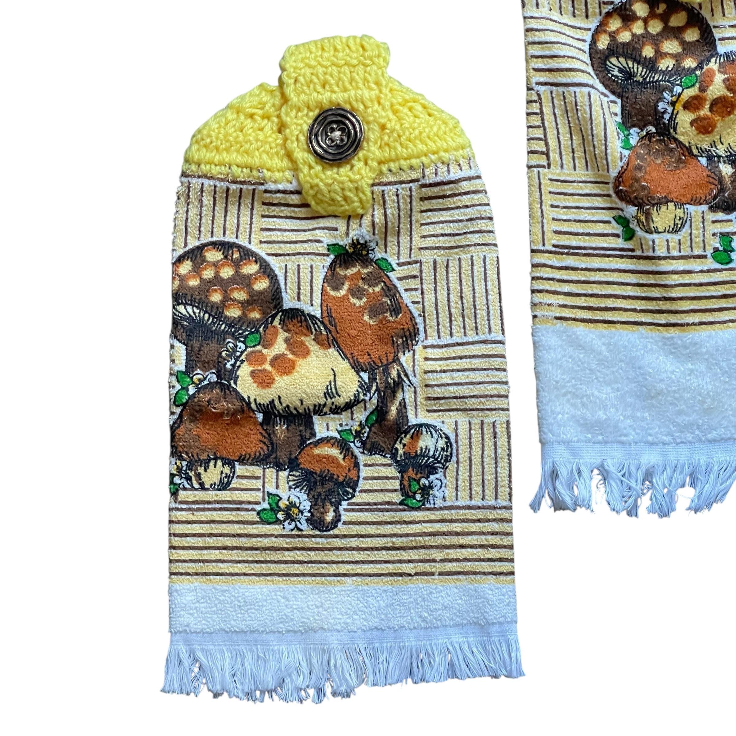 Vintage Kitchen Mushroom Dish Hand Towel: 70s 80s, Crochet w/Metal Button, Deadstock New.