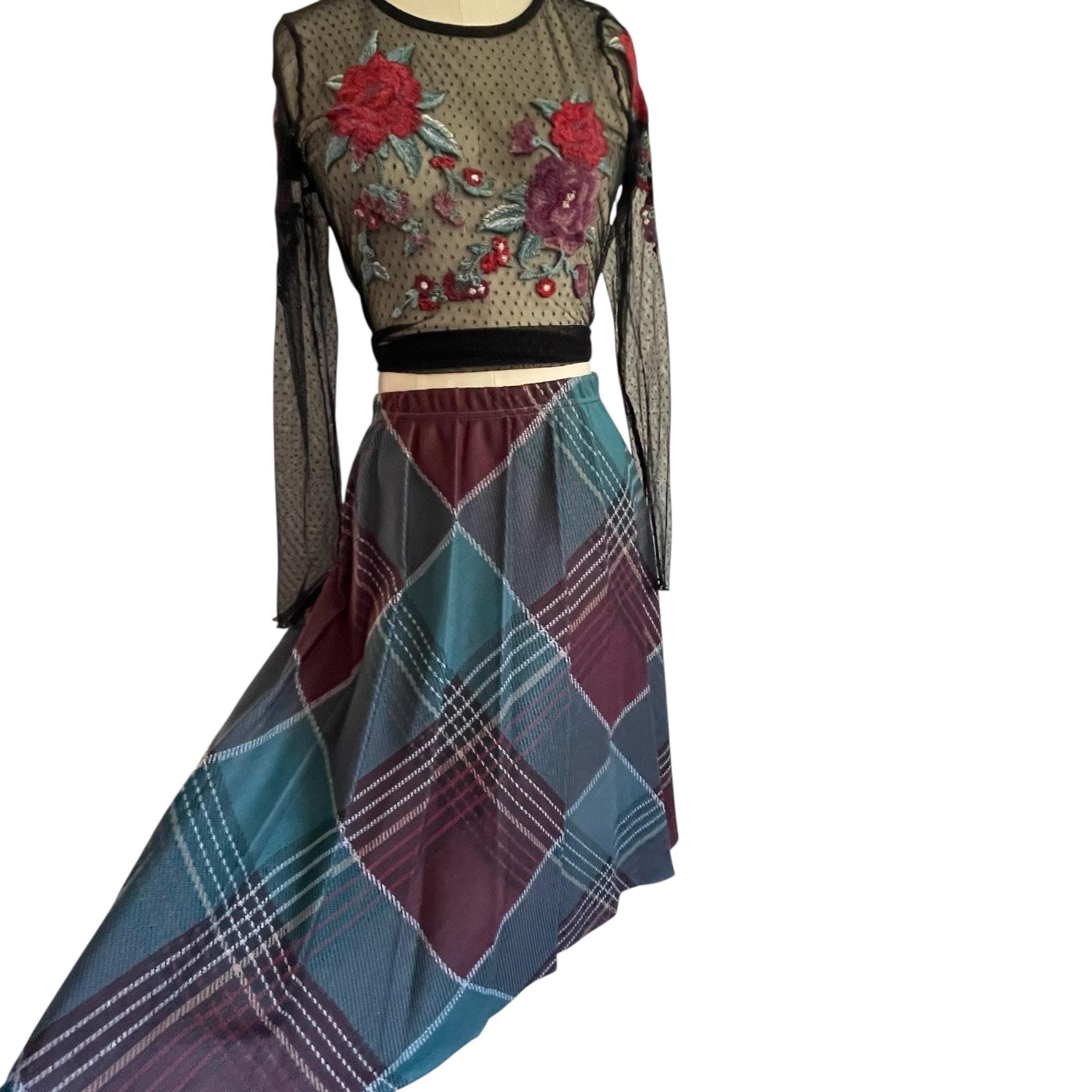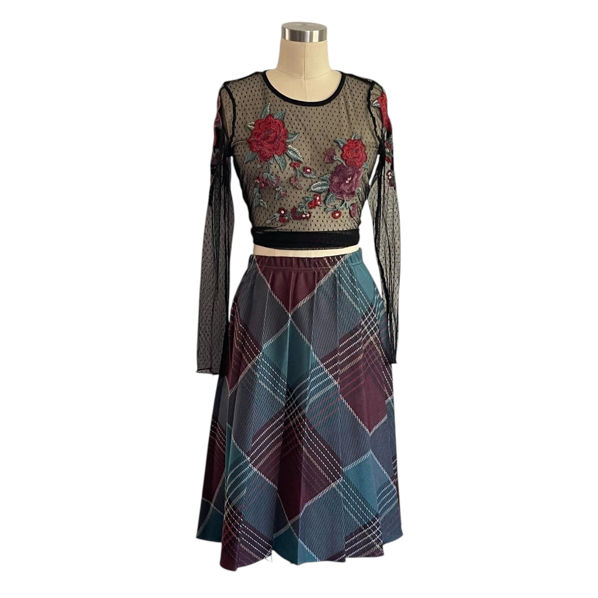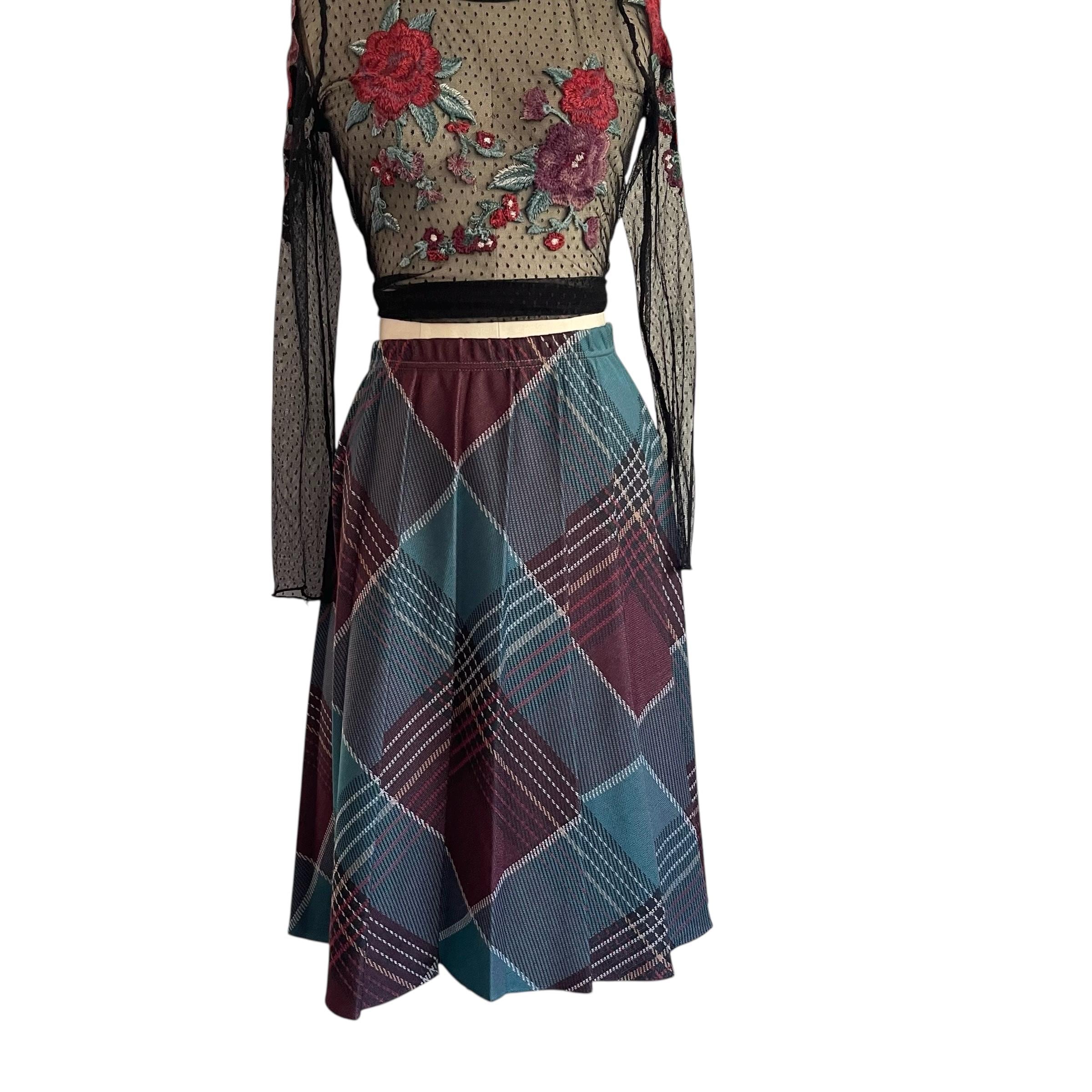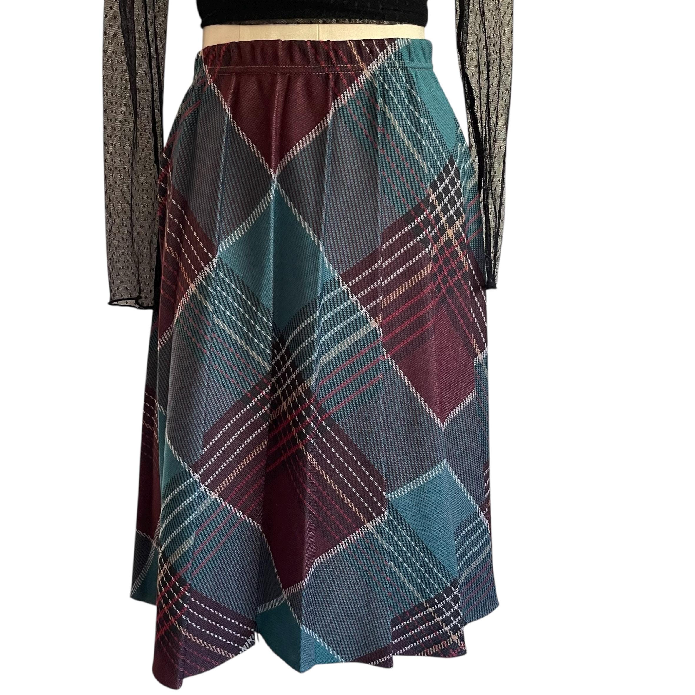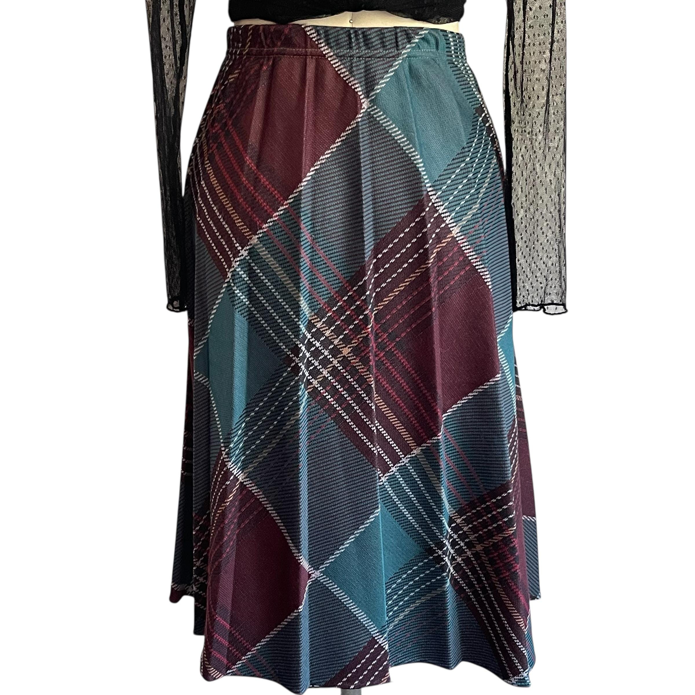 Vintage Burgundy and Blue Plaid A-Line Skirt: Whimsigoth Grunge Pleated Skirt, Elastic Waist, Multicolor Indie Skirt, 70s 80s 90s Skirt