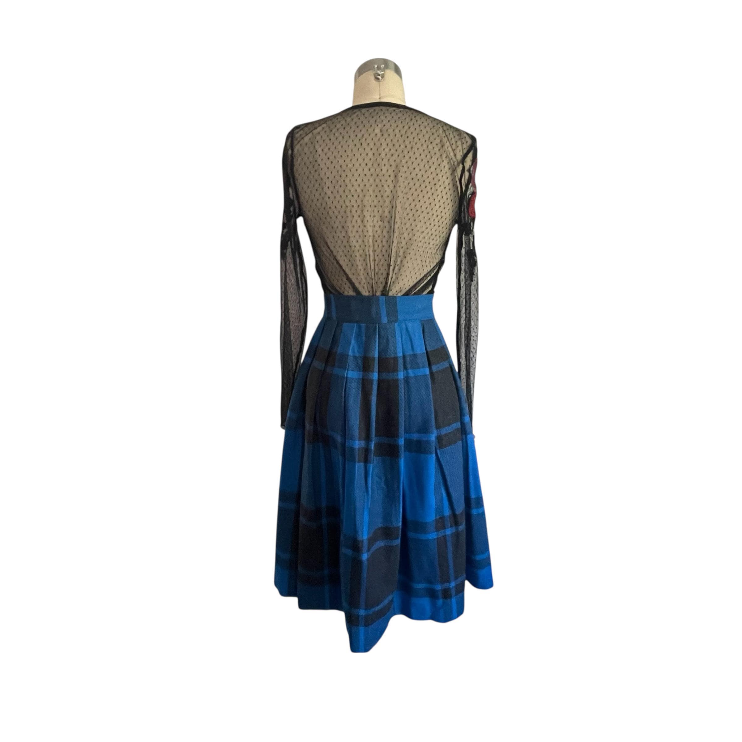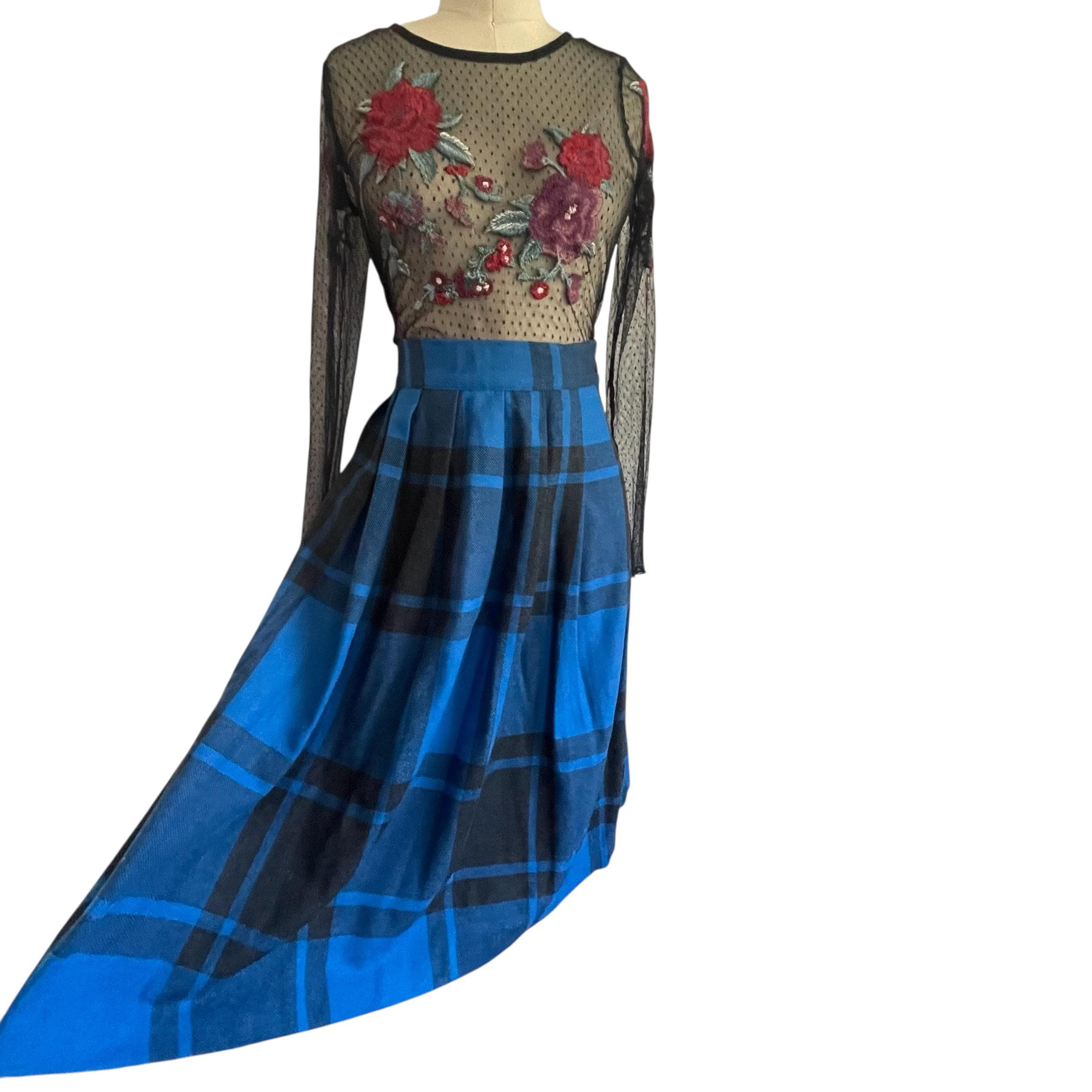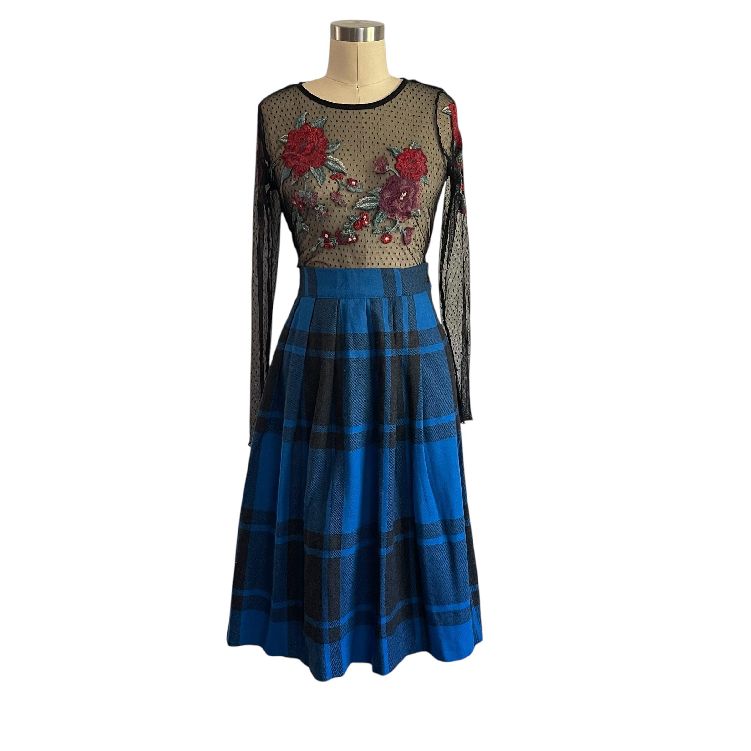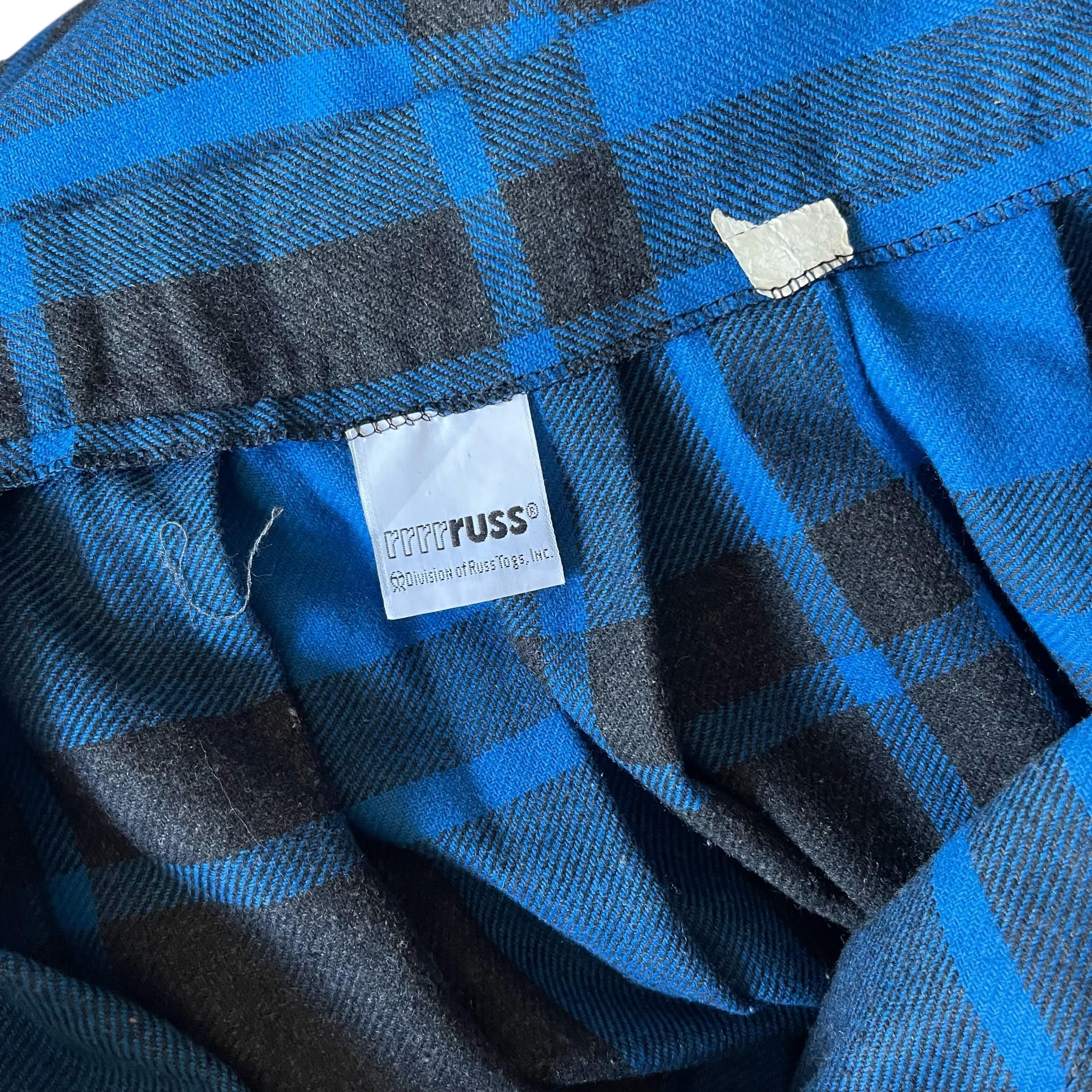 Vintage rrrrruss Black and Blue Plaid Semi-Pleated Skirt: Bright A-Line Plaid Skirt, Indie, Alt Rocker Skirt, 90s Y2K Plaid Skirt