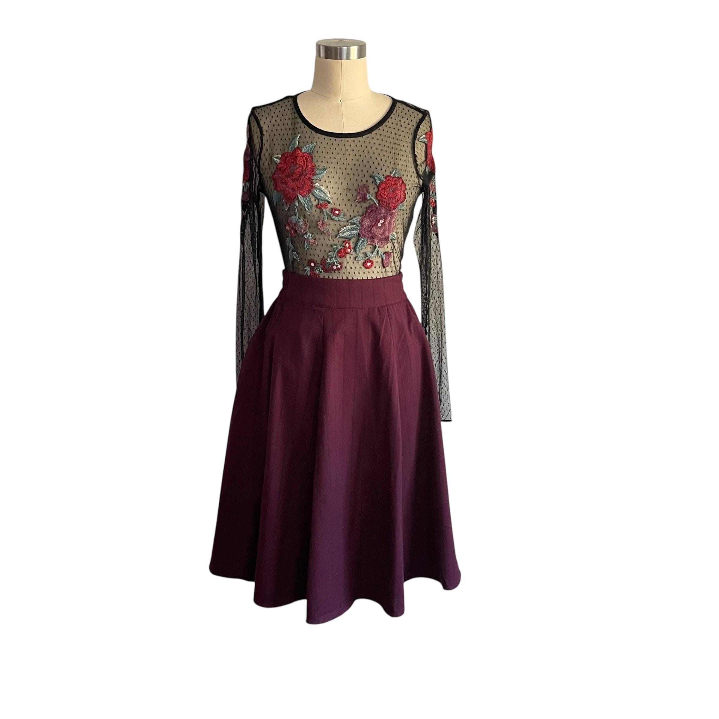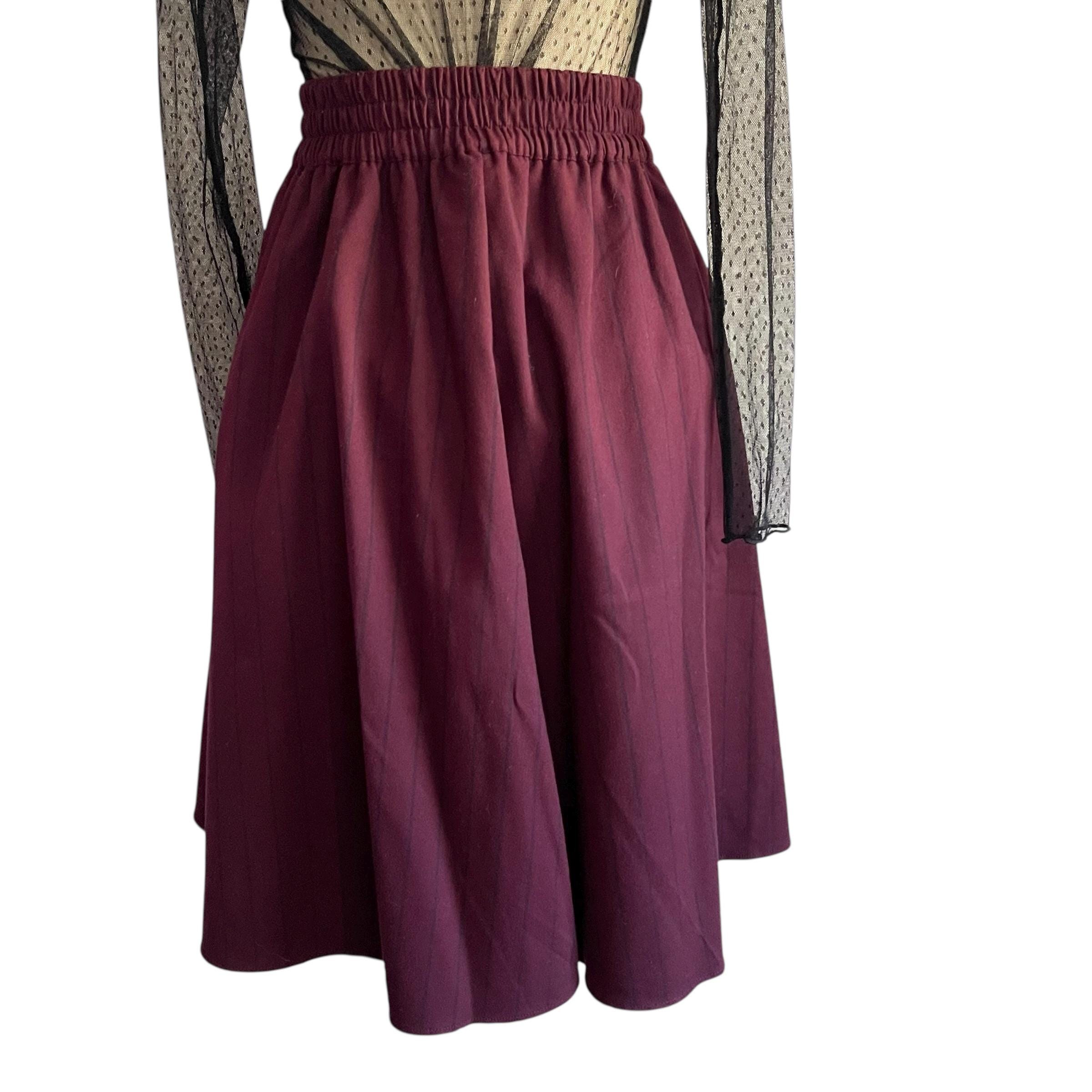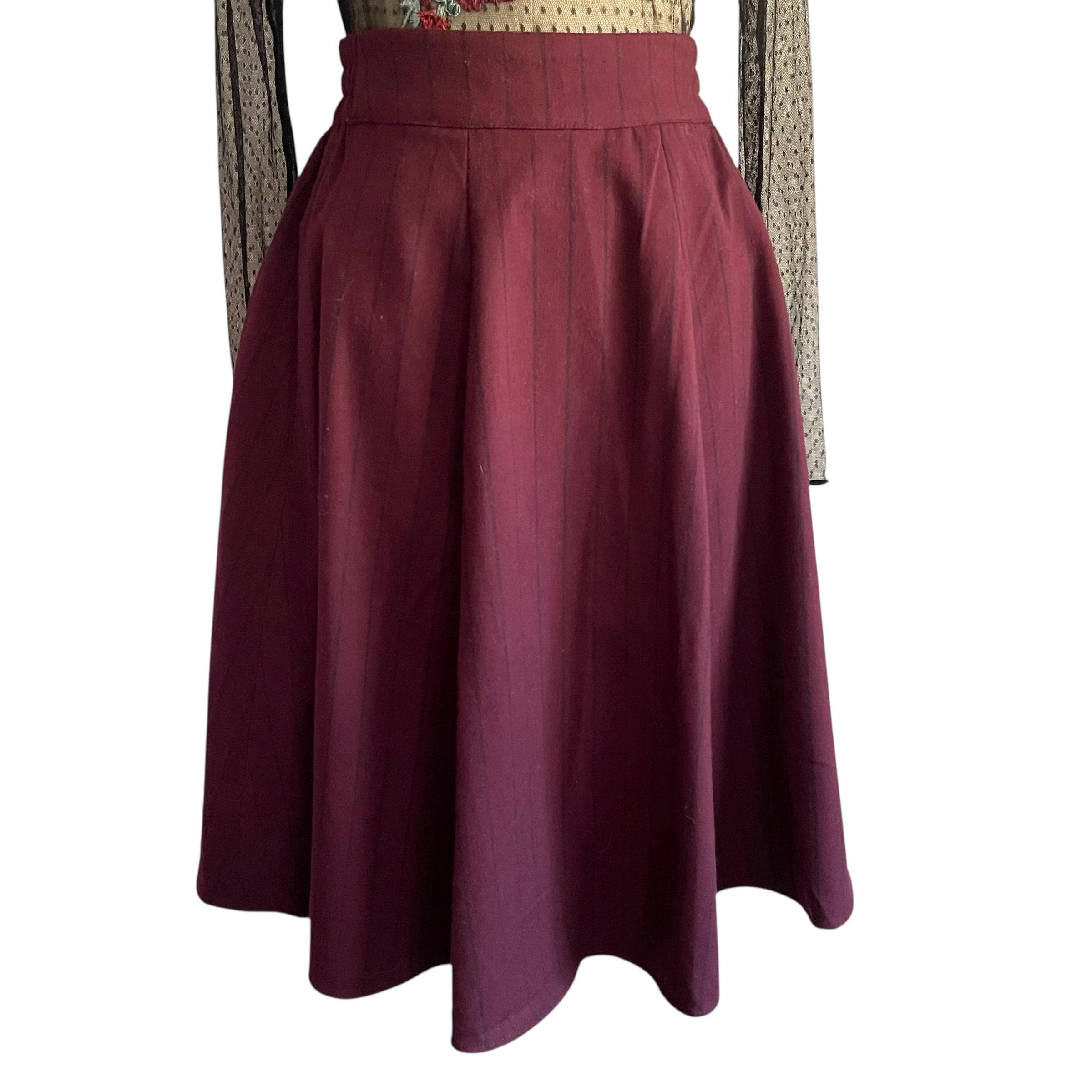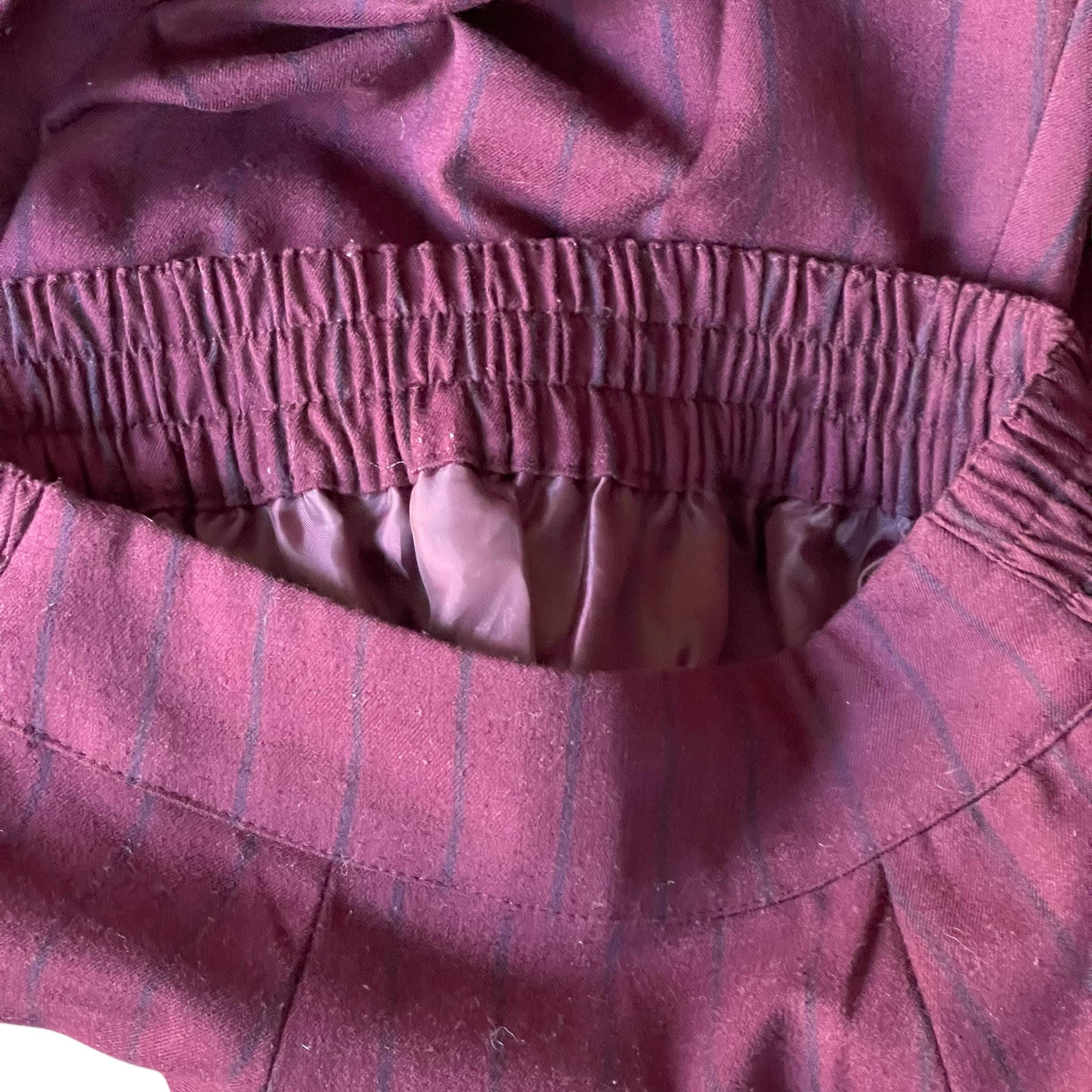 Vintage Burgundy Pinstriped Hip Pleat Skirt: A-Line Semi-Pleated Skirt, Academia Skirt, Back Elastic Waist, 70s 80s 90s Skirt