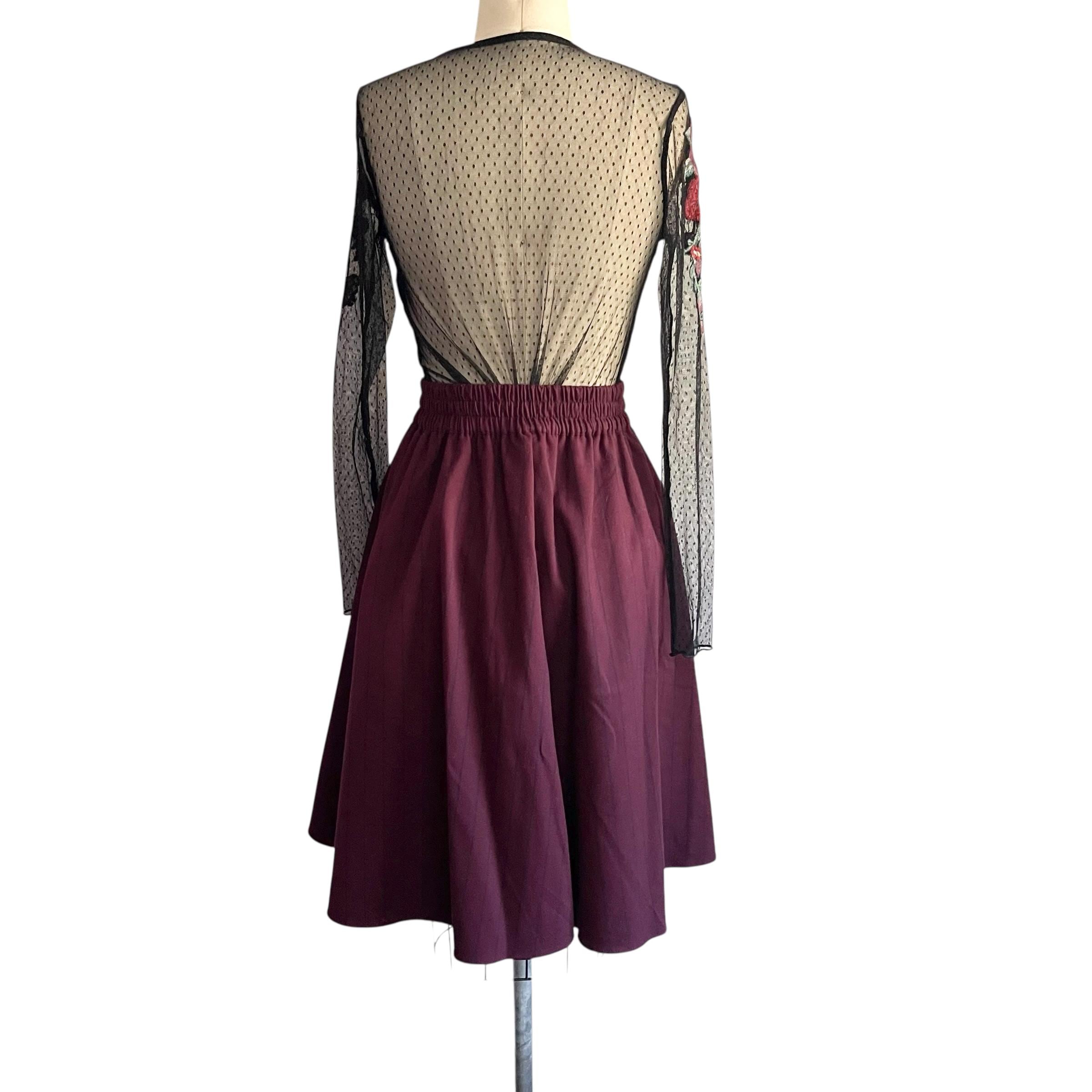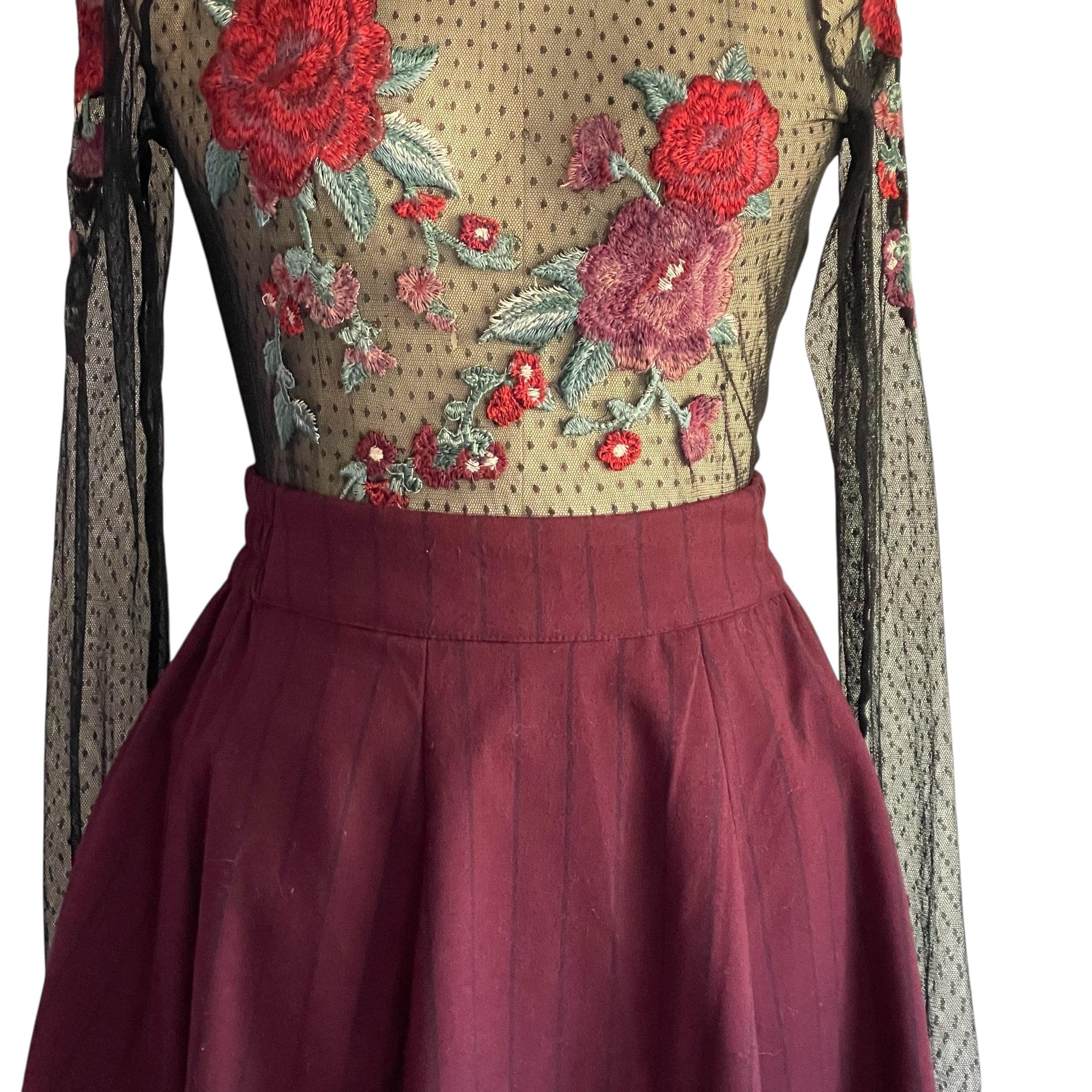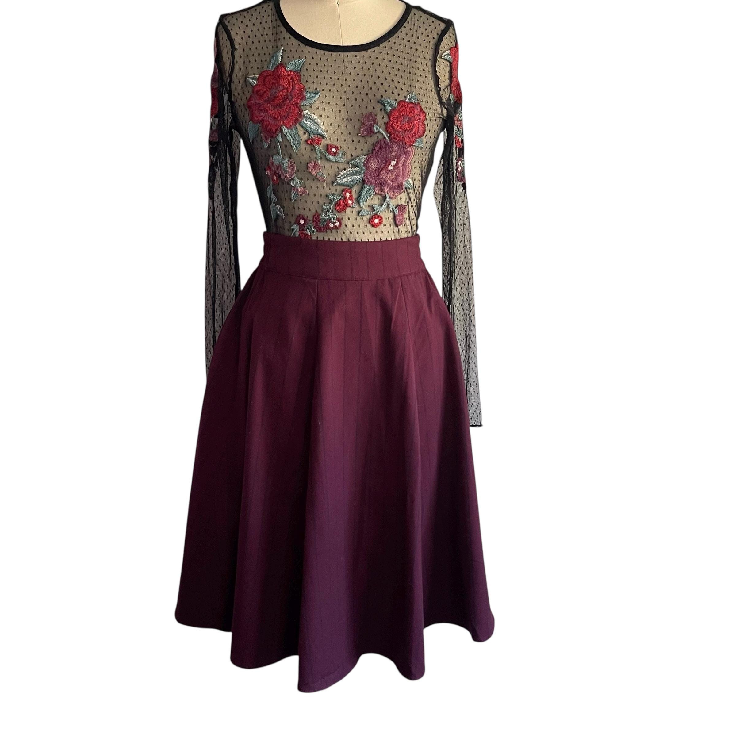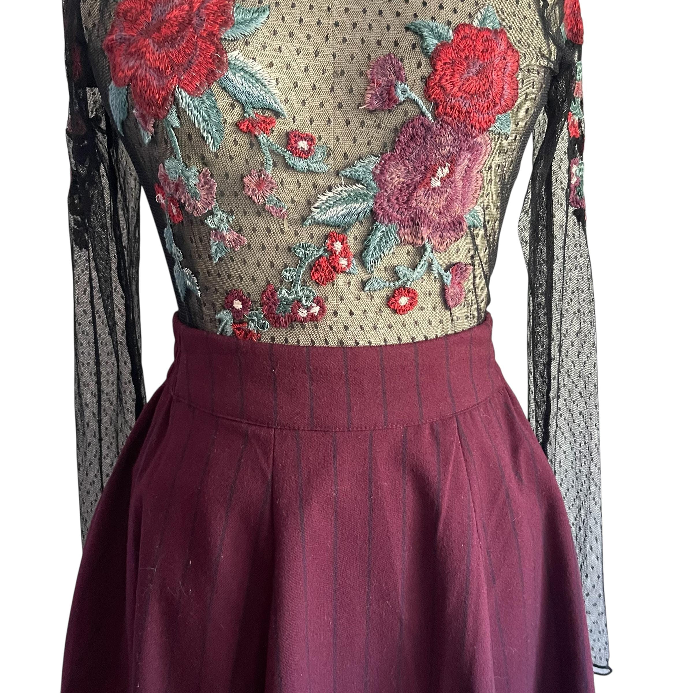 Vintage Burgundy Pinstriped Hip Pleat Skirt: A-Line Semi-Pleated Skirt, Academia Skirt, Back Elastic Waist, 70s 80s 90s Skirt