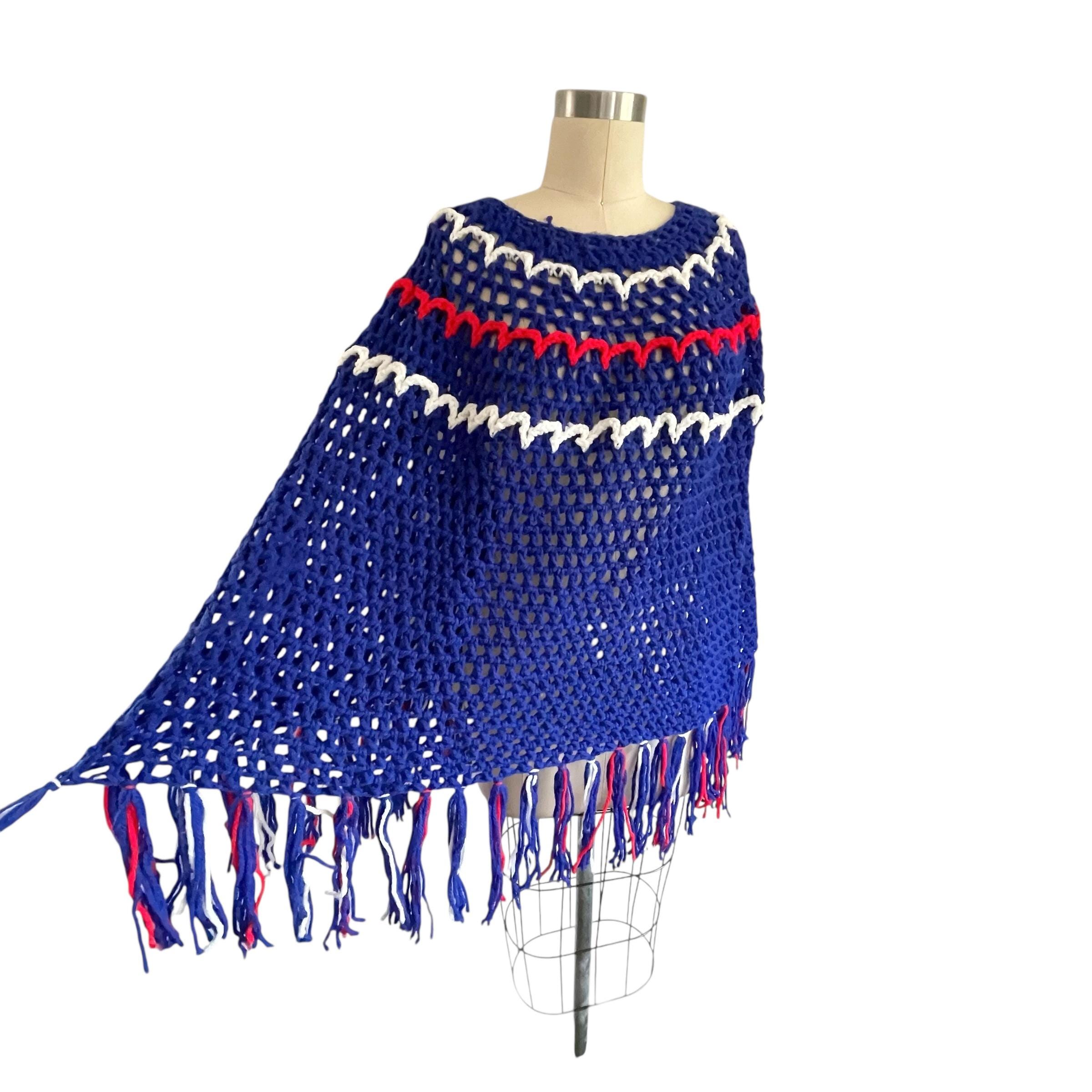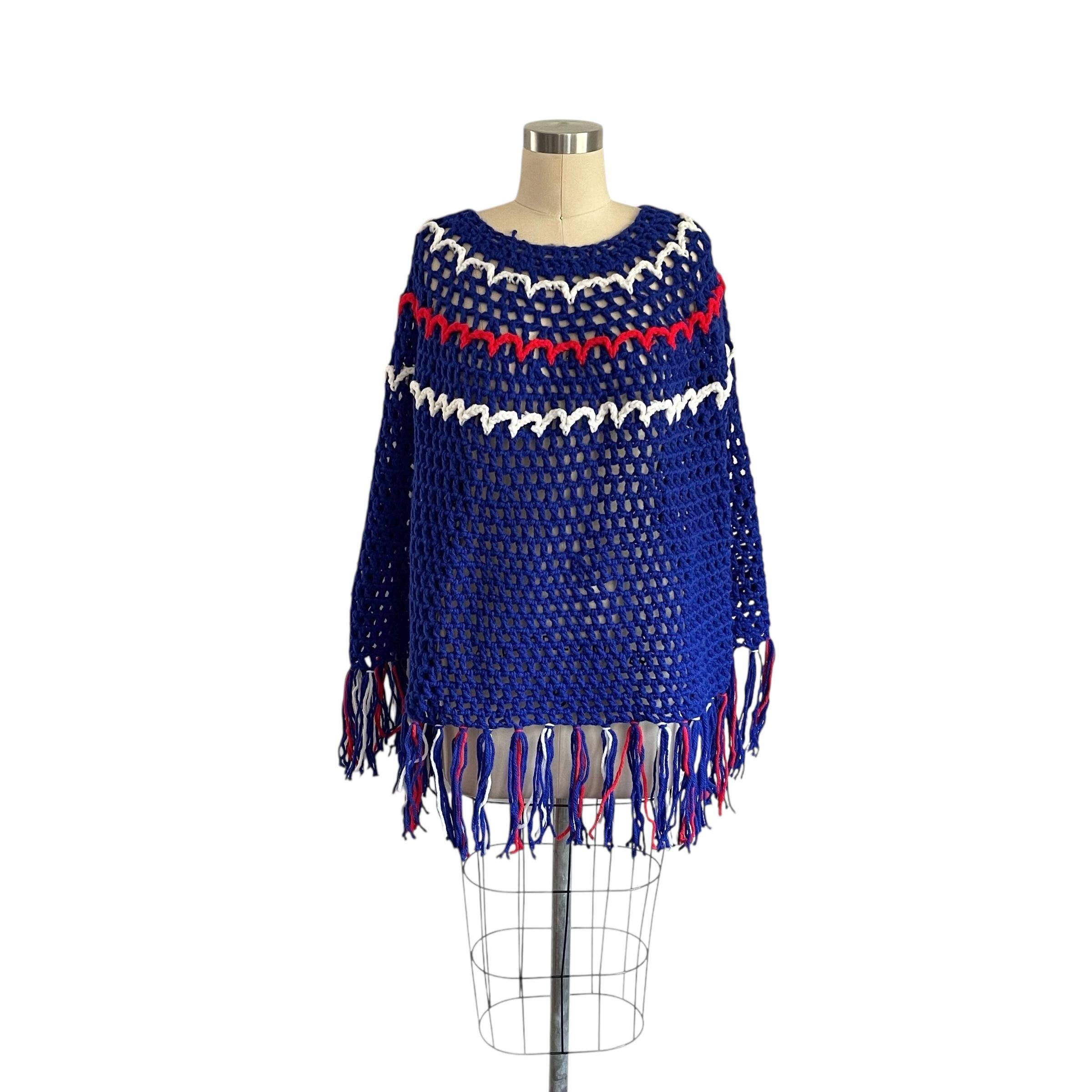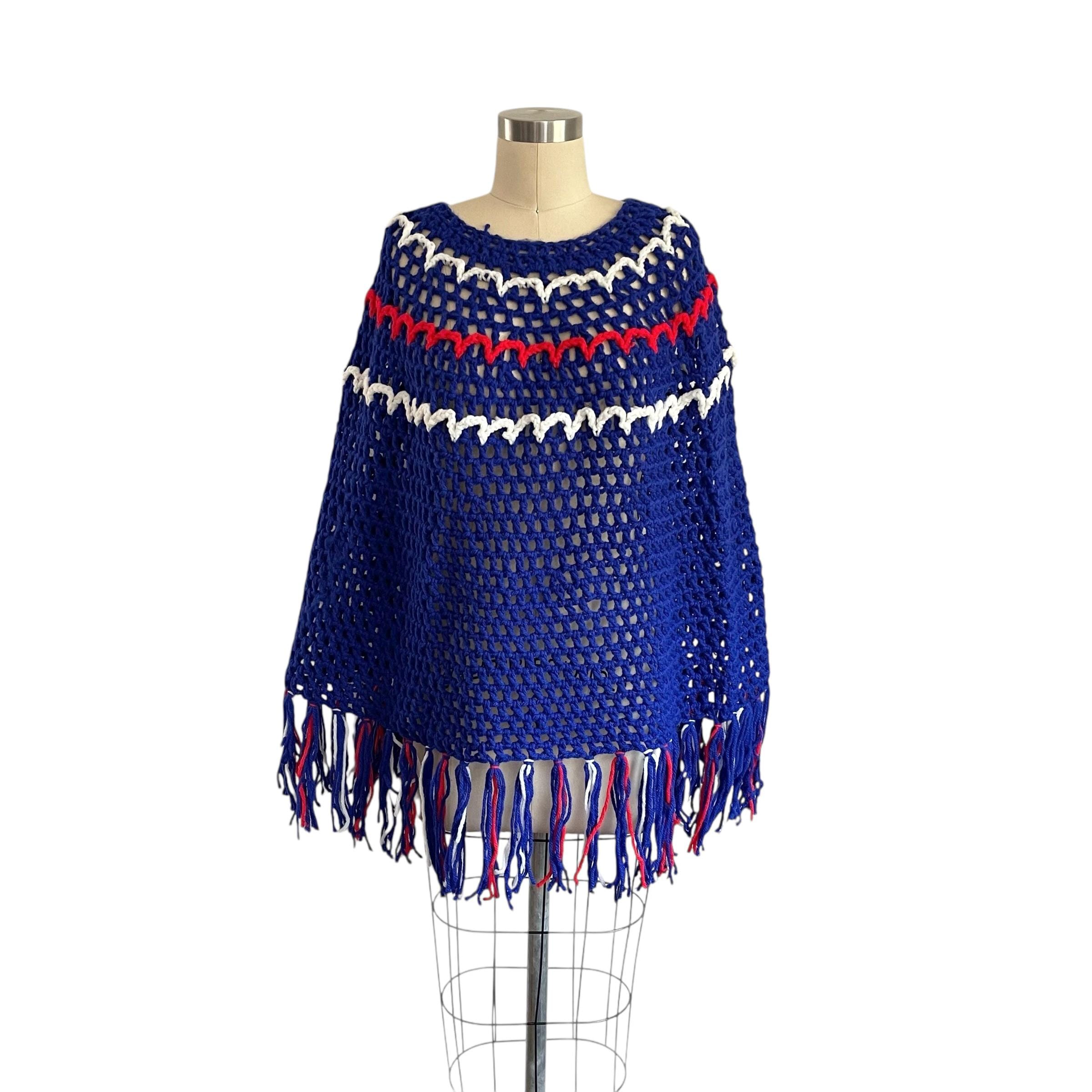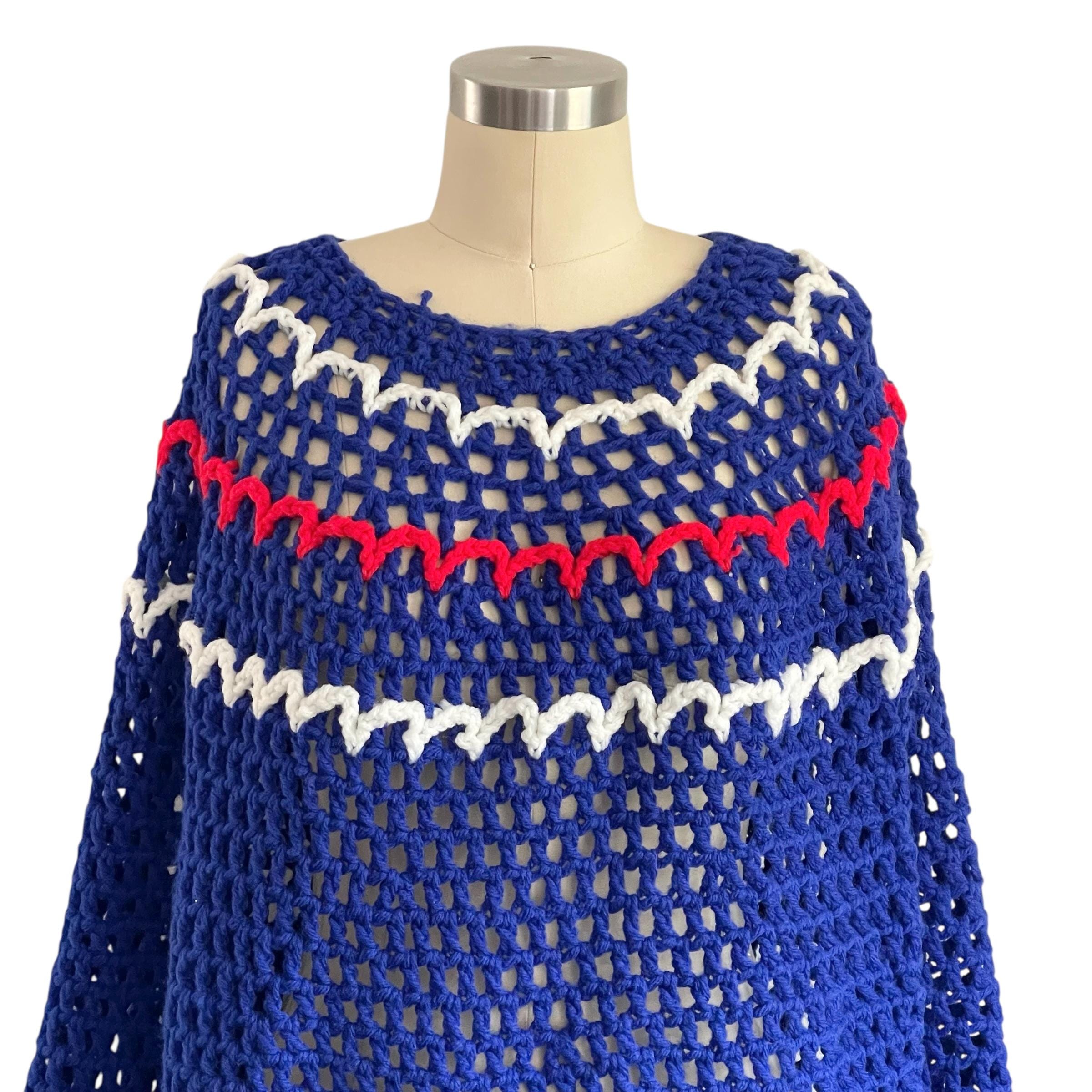 Vintage Red White and Blue Knitted Crochet Shawl: Cozy Cape Shawl, Handknit, Boho, Hippie, Festival, Hippiecore, Tri-Color