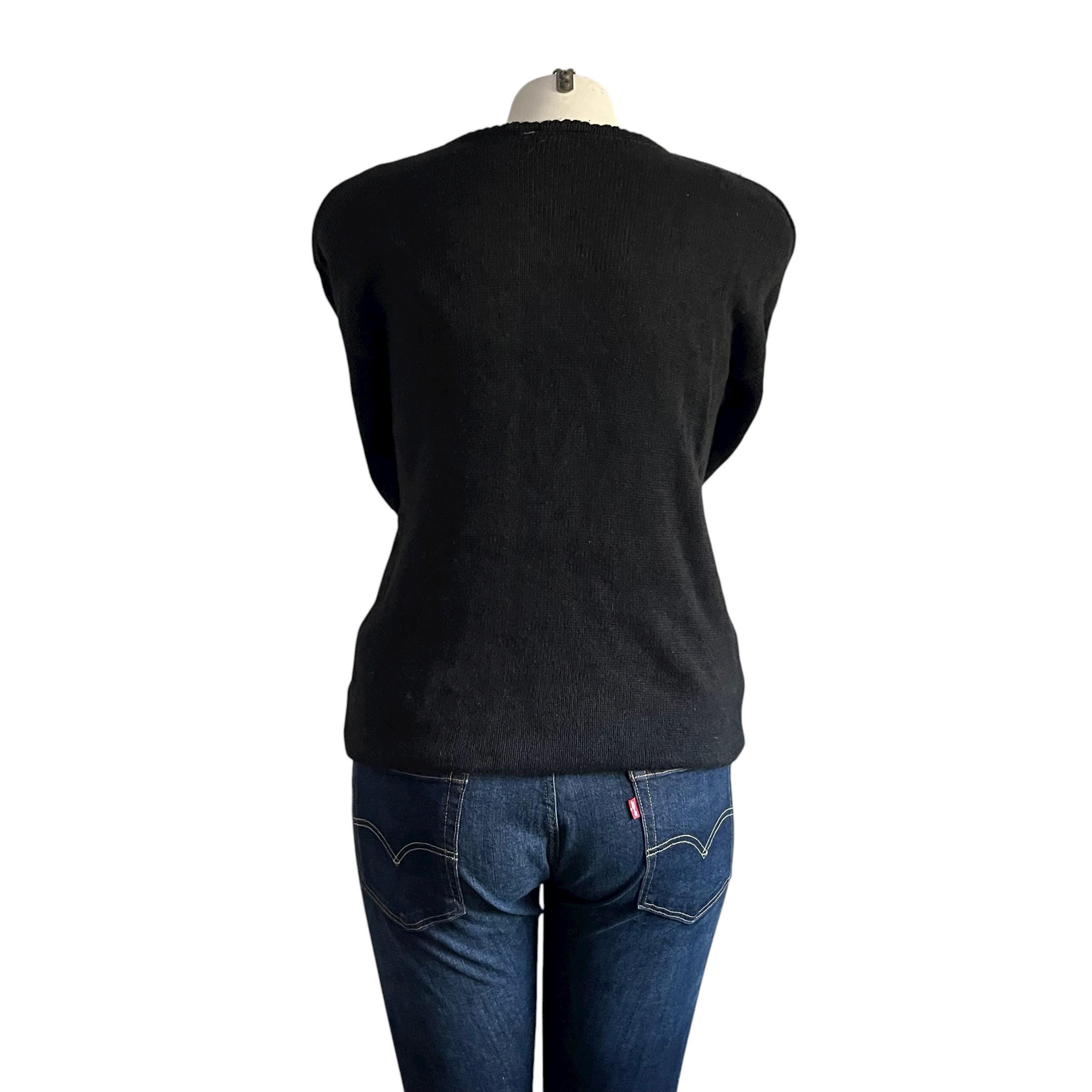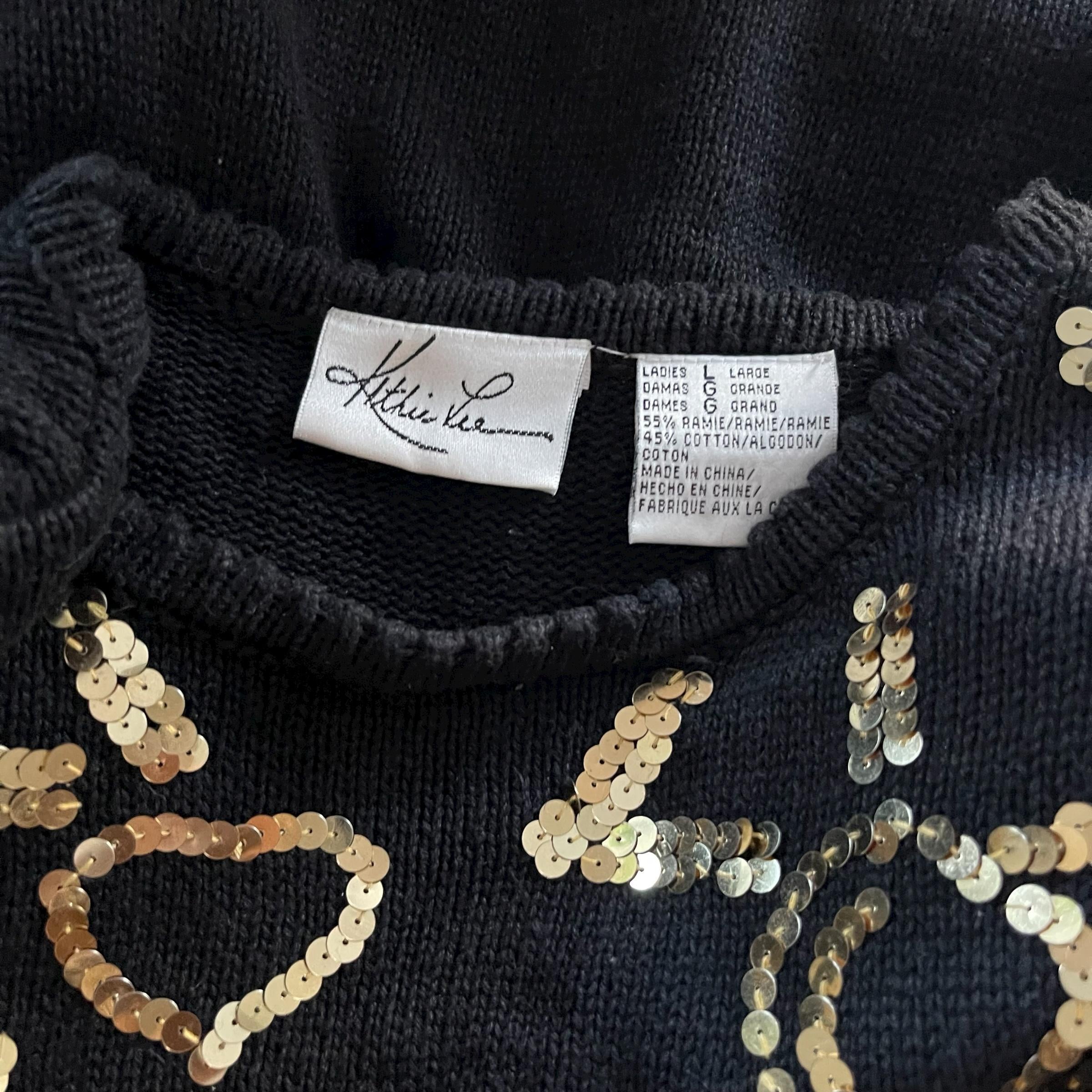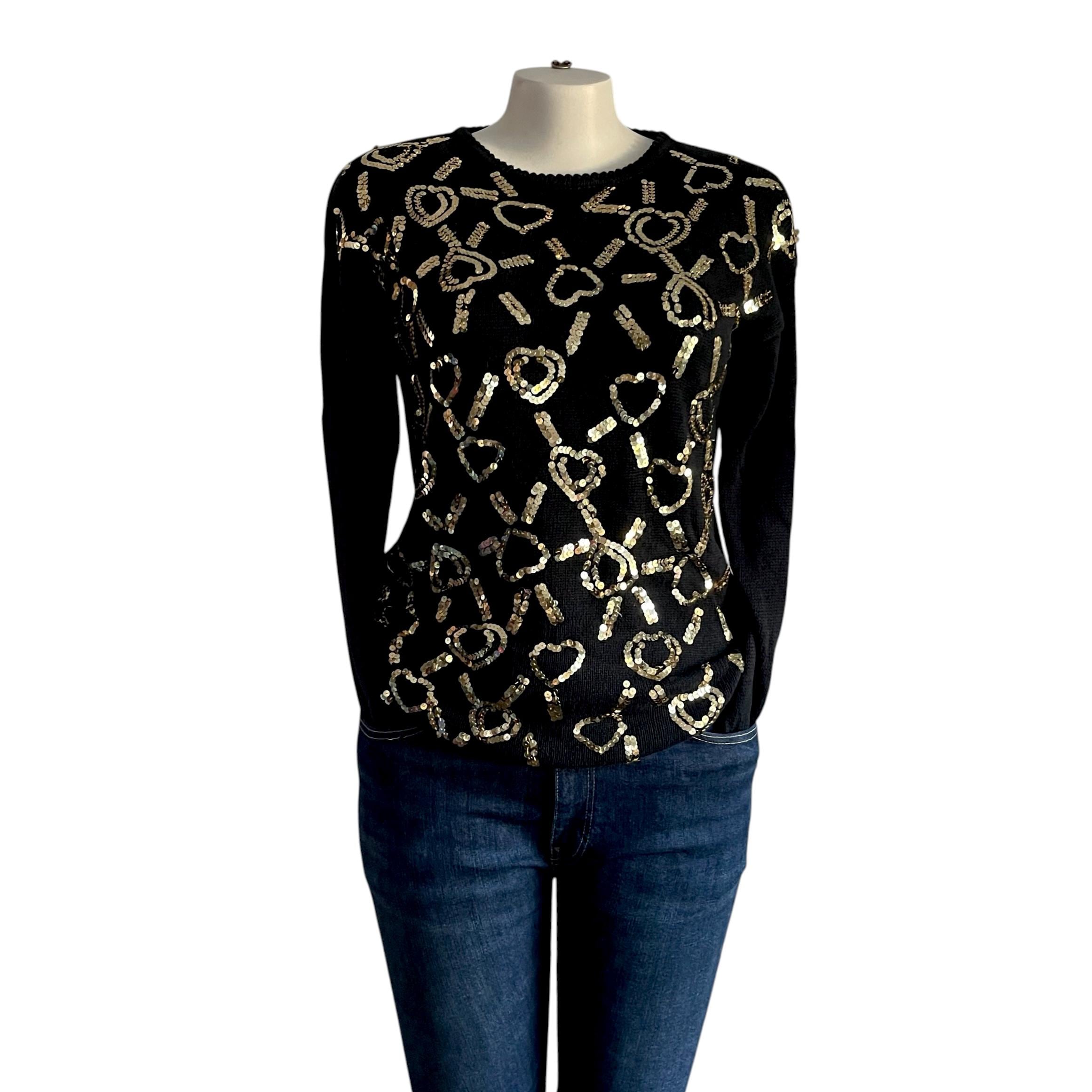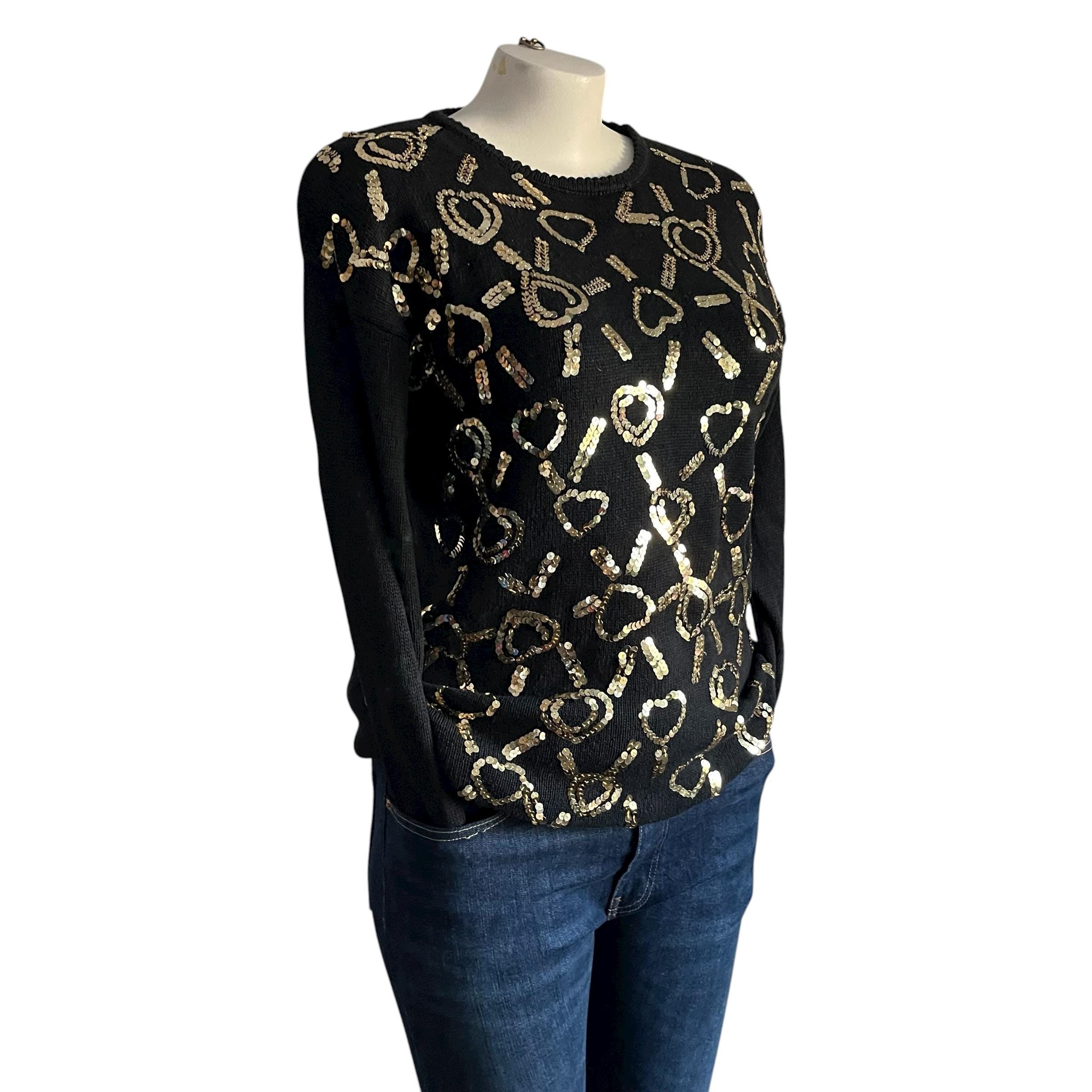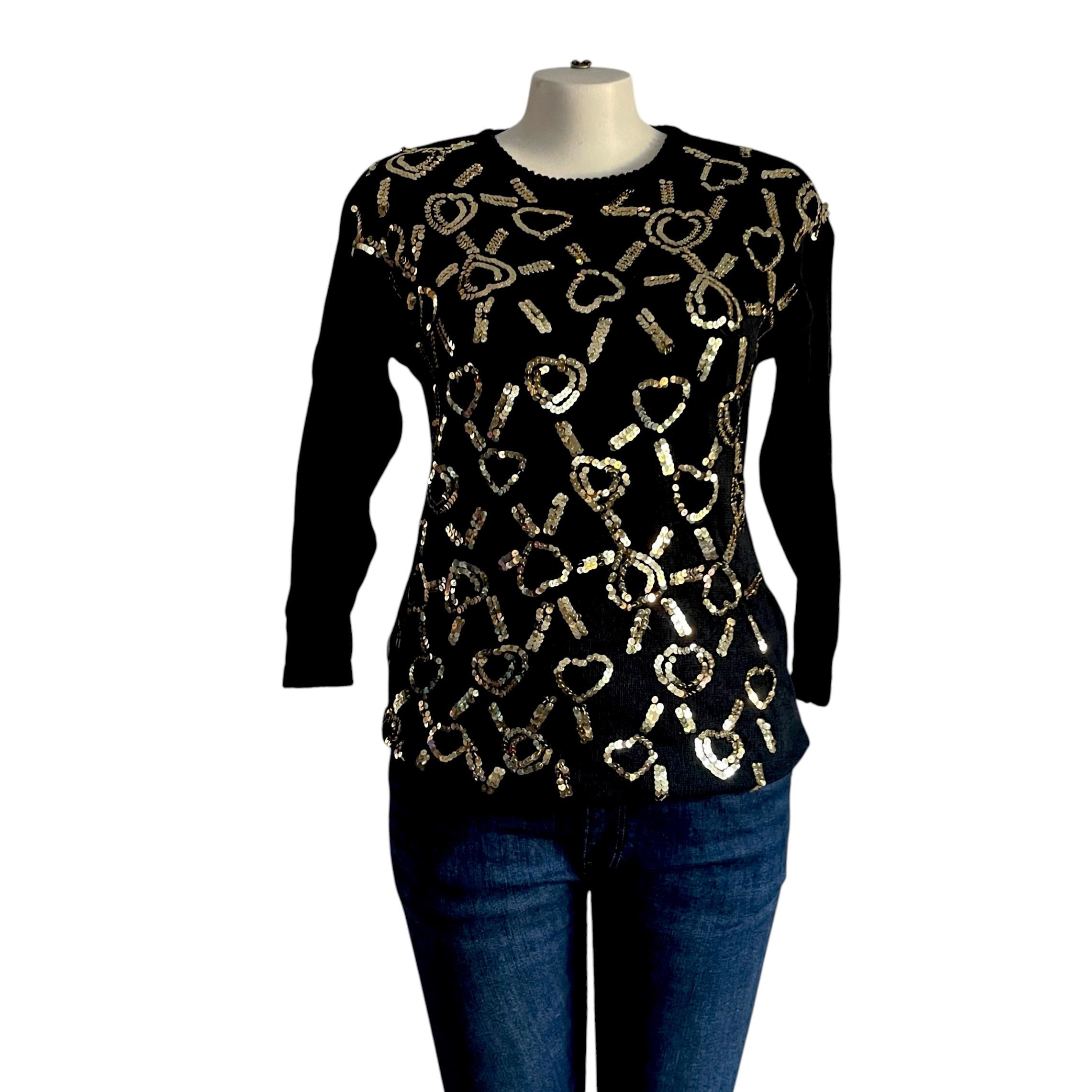 Vintage Kathie Lee Black Gold Sequin Tunic Sweater: Goldtone Heart Sequins, Padded Shoulders, Party Sweater, Party Top
