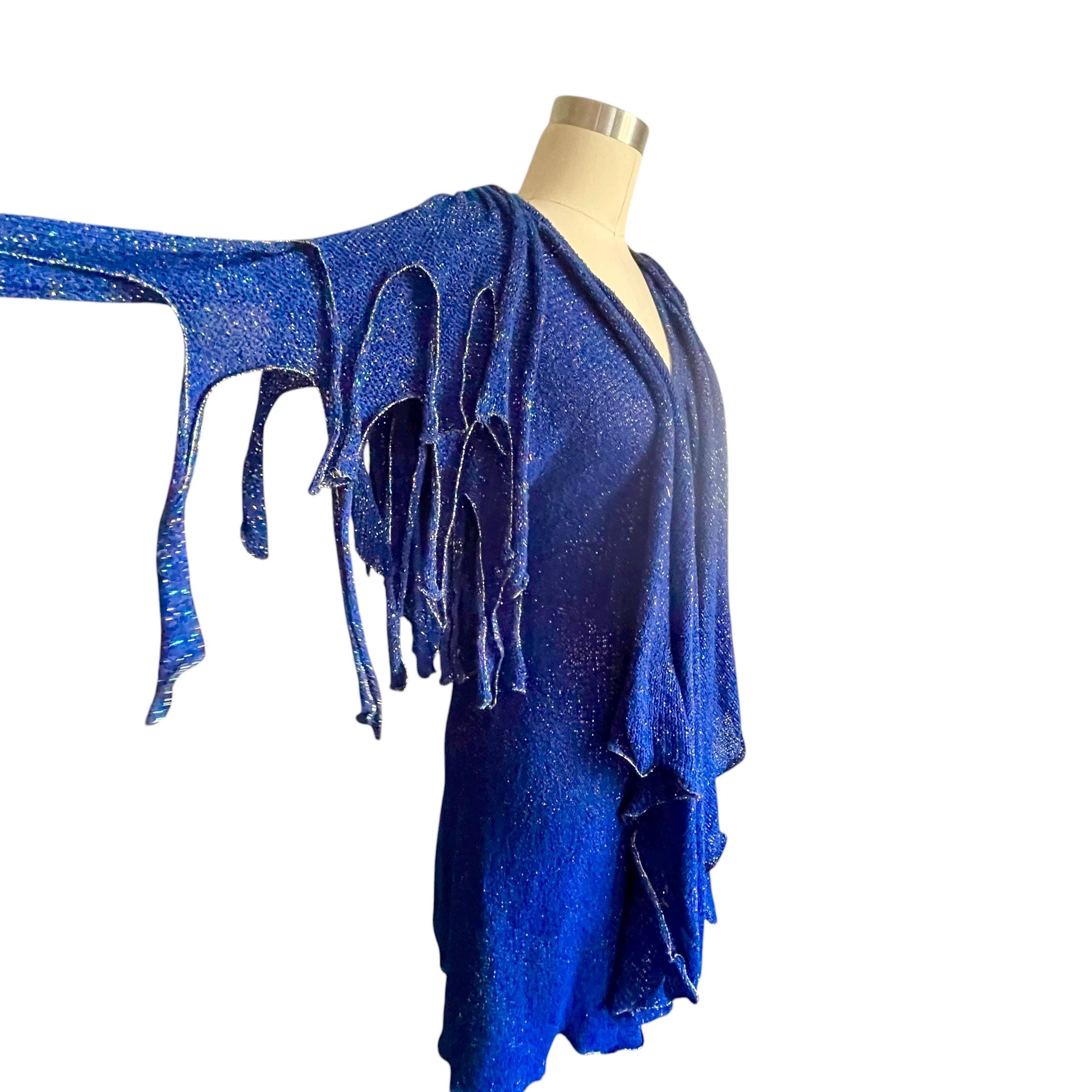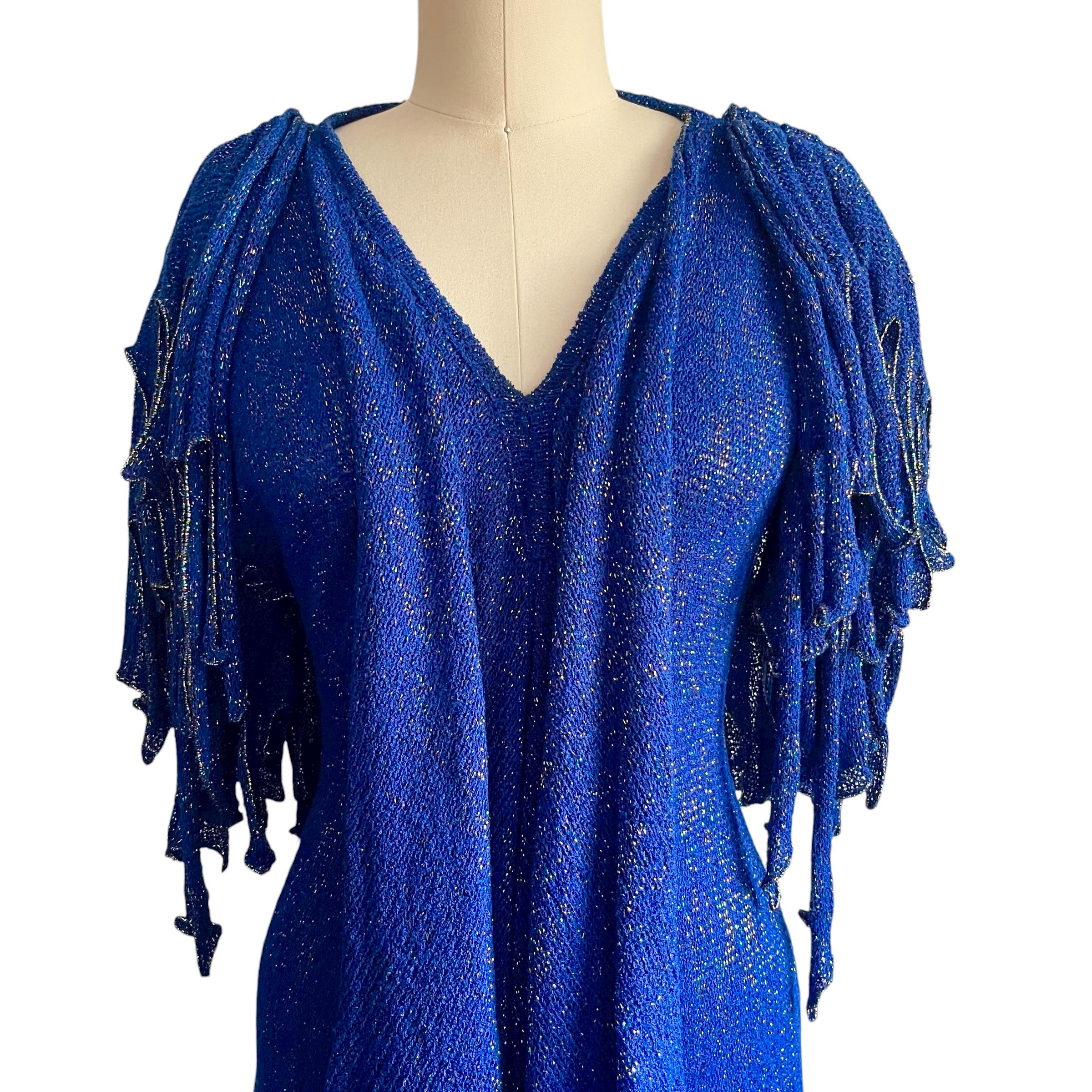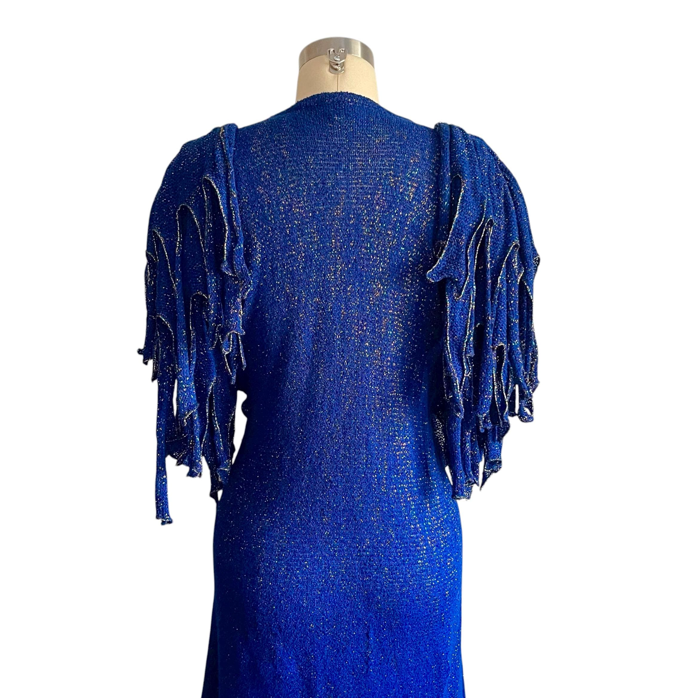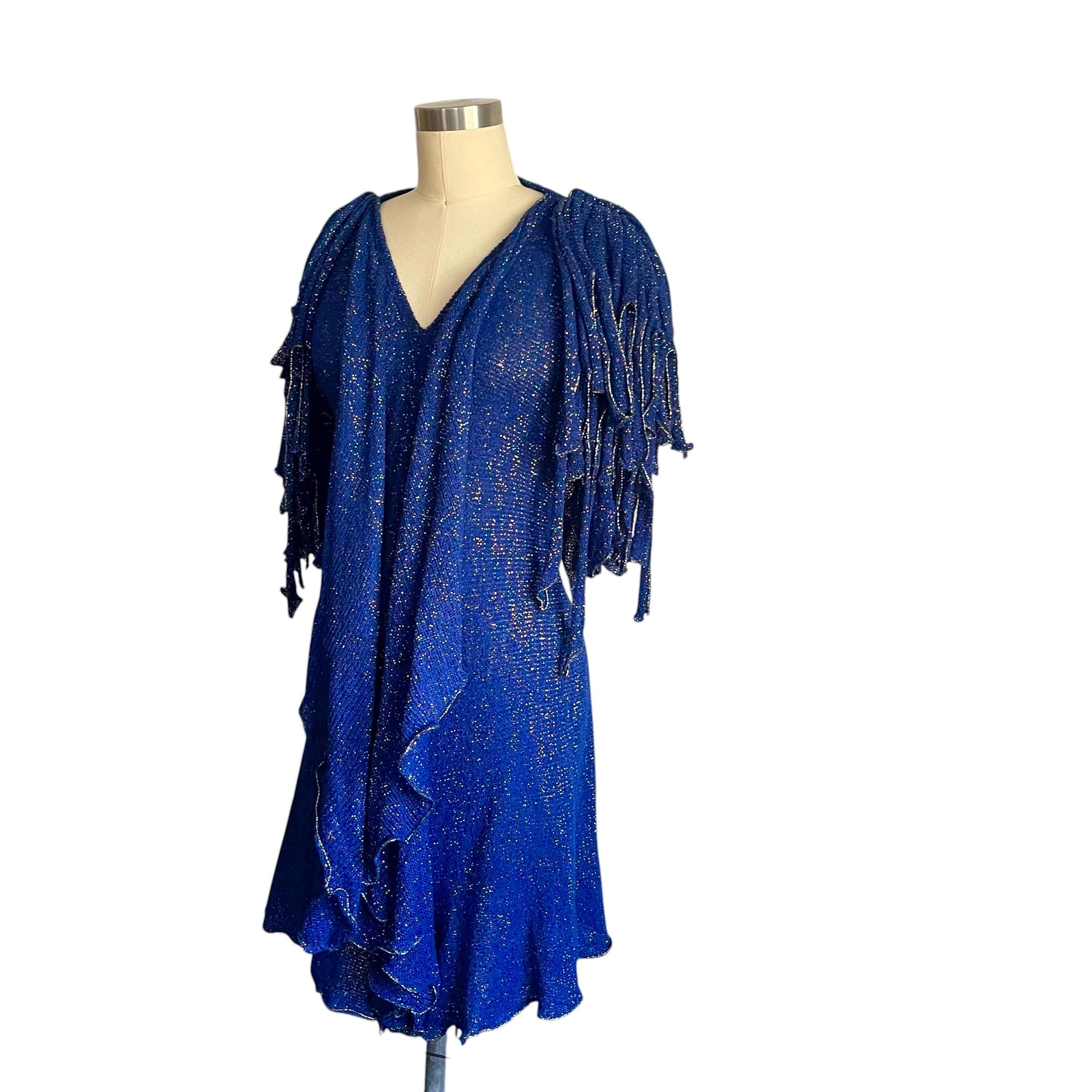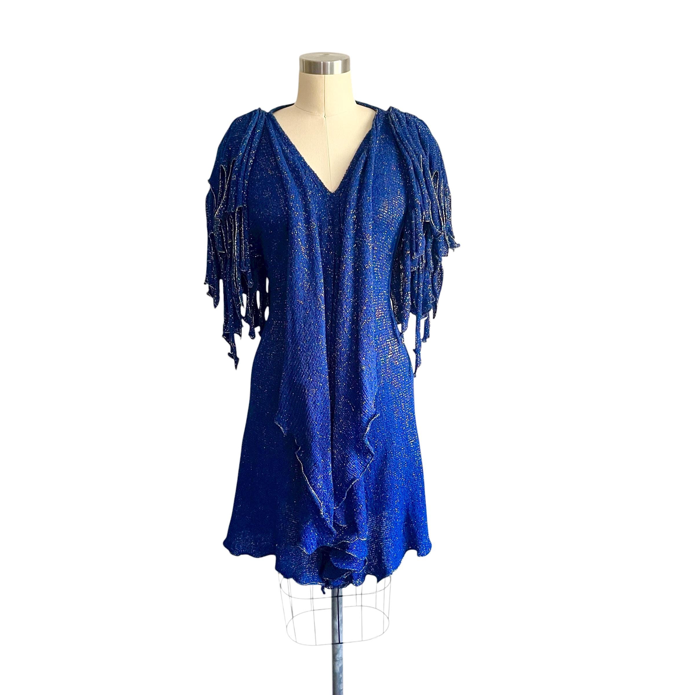 Vintage Avant Garde Blue Sweater Dress: Golden Glitter, Fringe Tassel, Padded Shoulders, Party Dress, 80s 90s Blue Dress