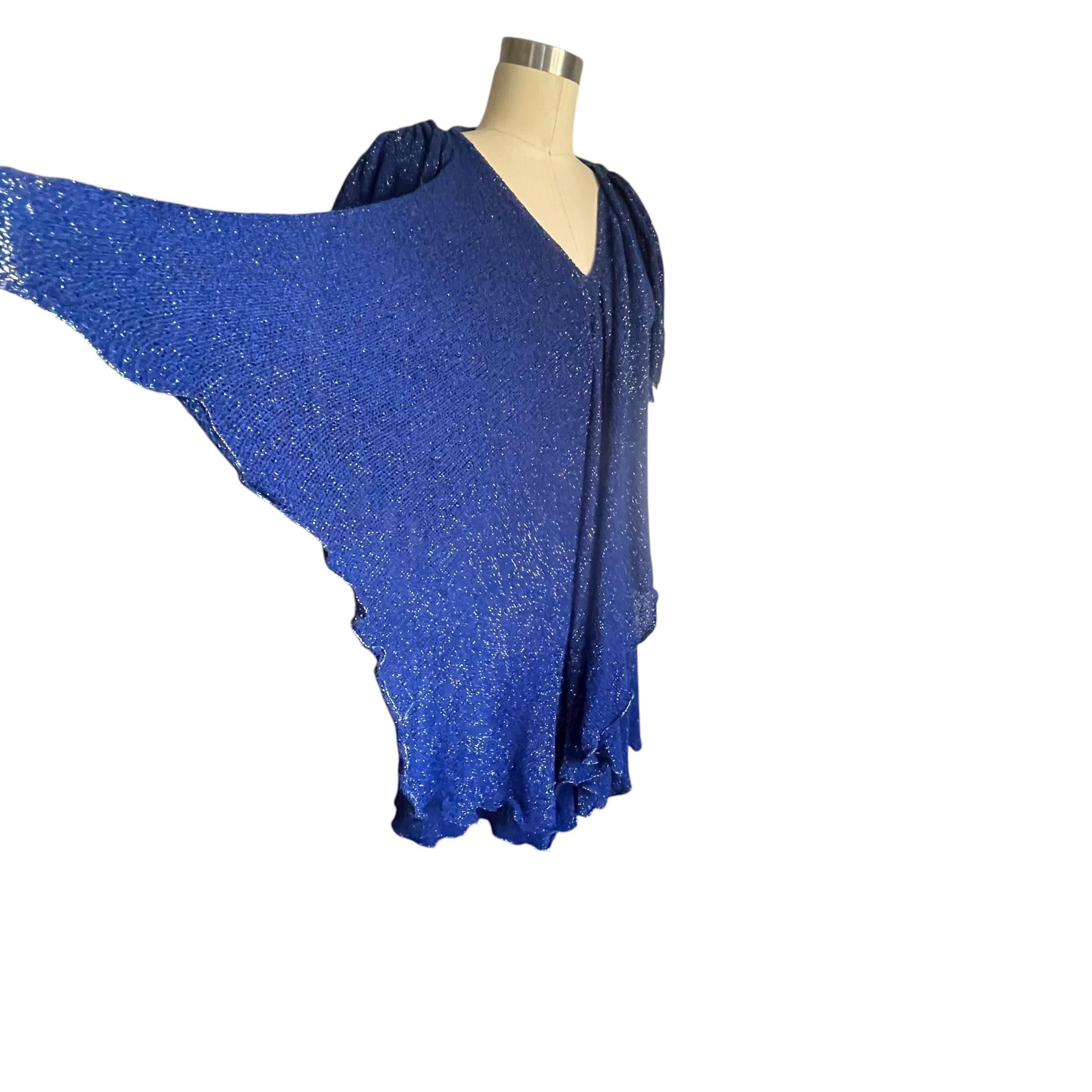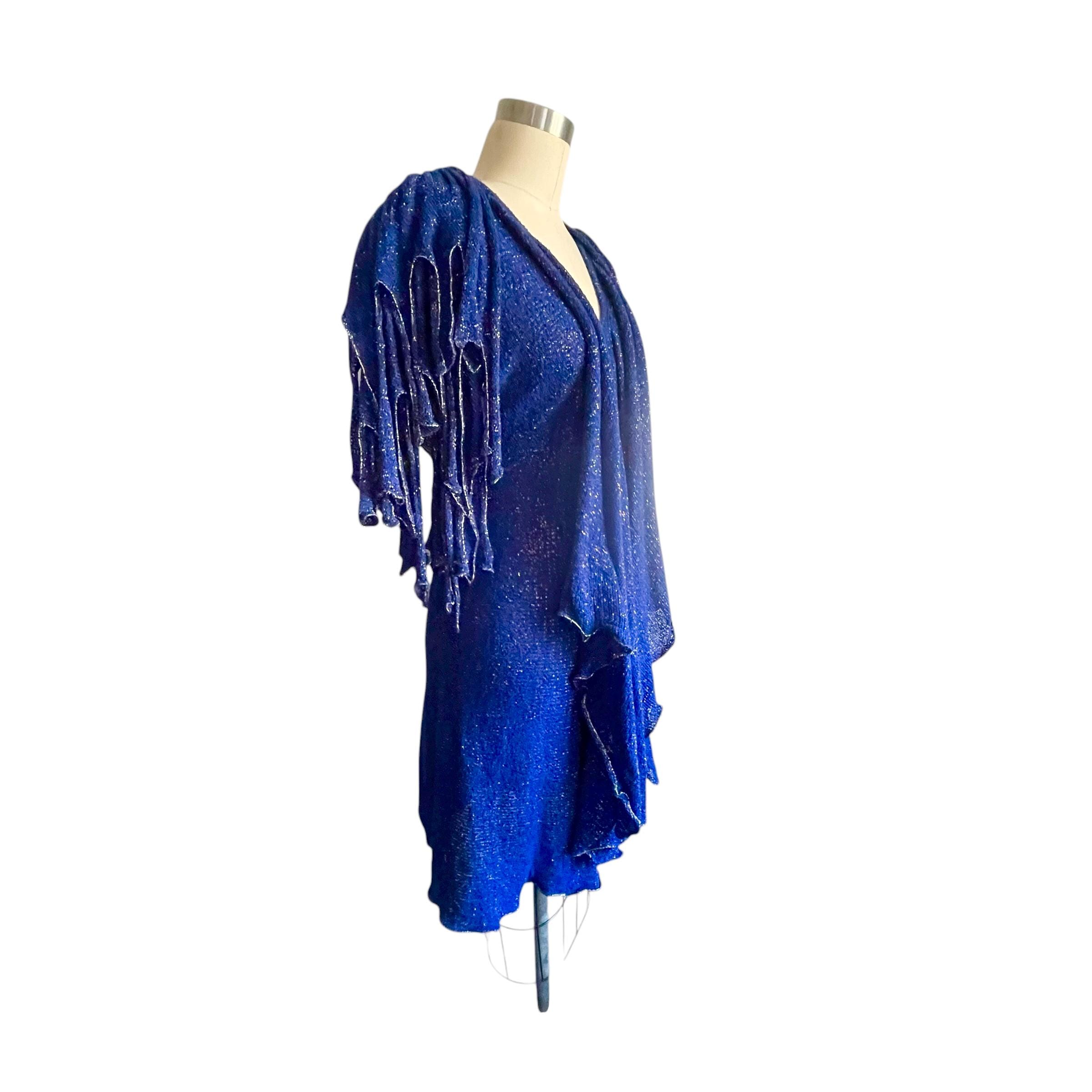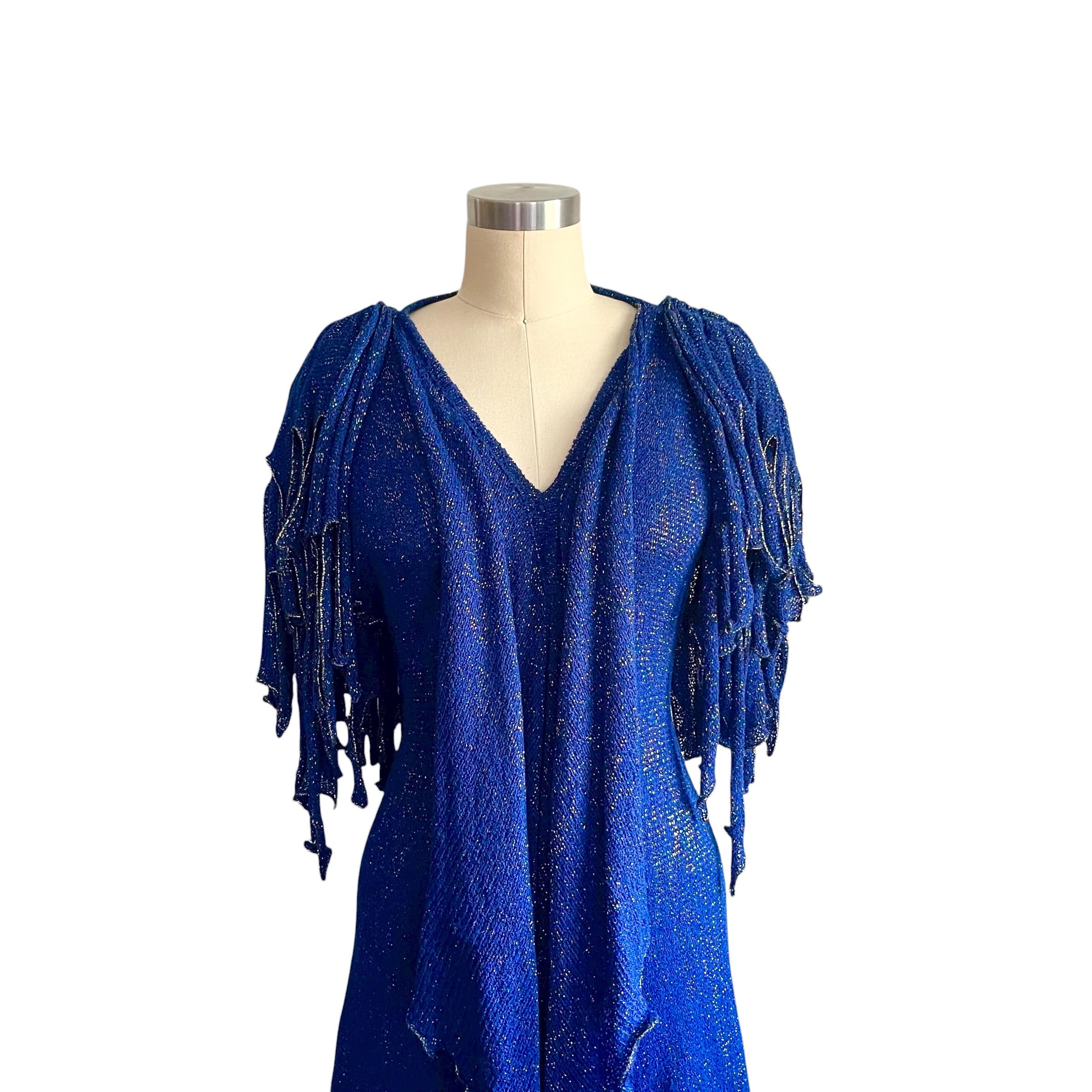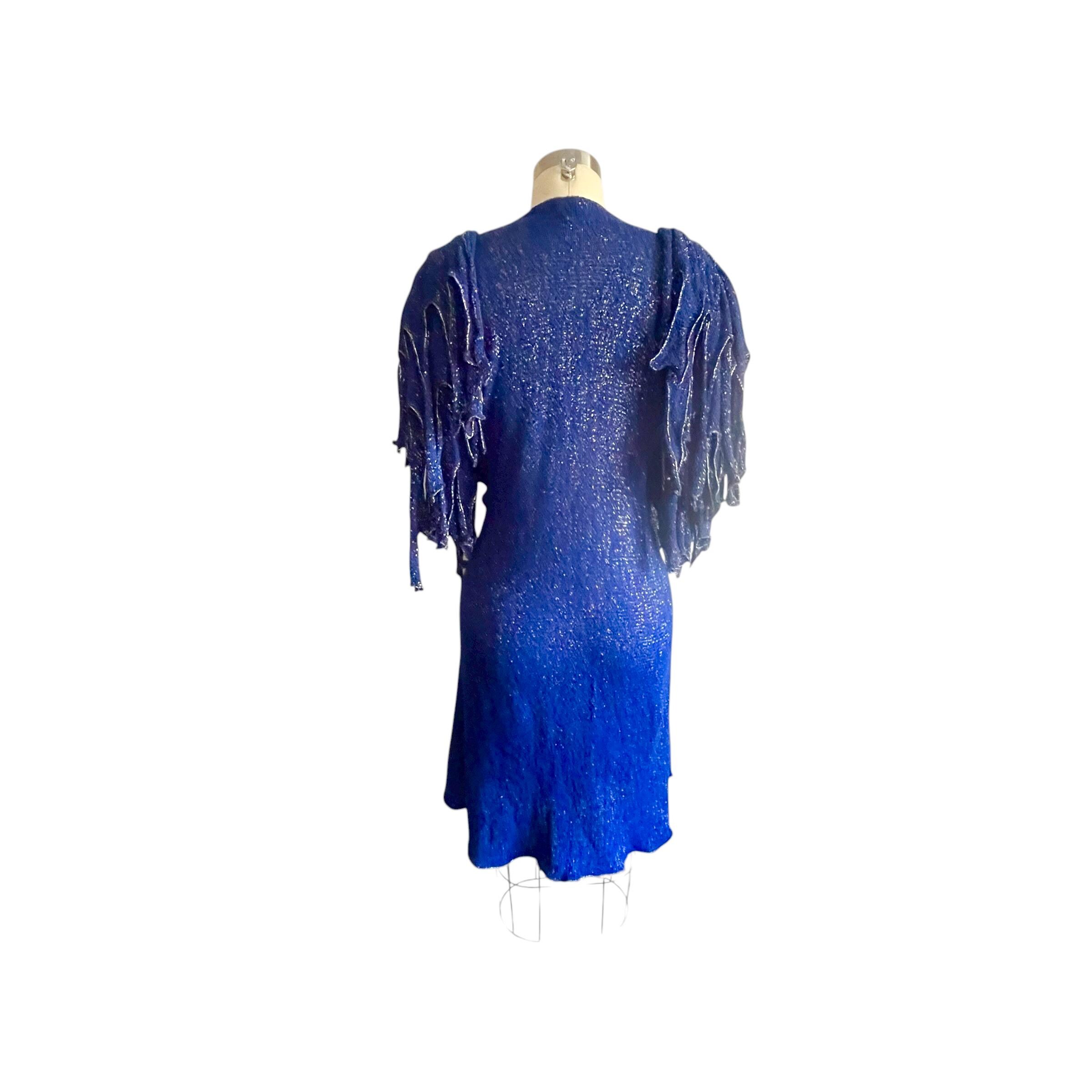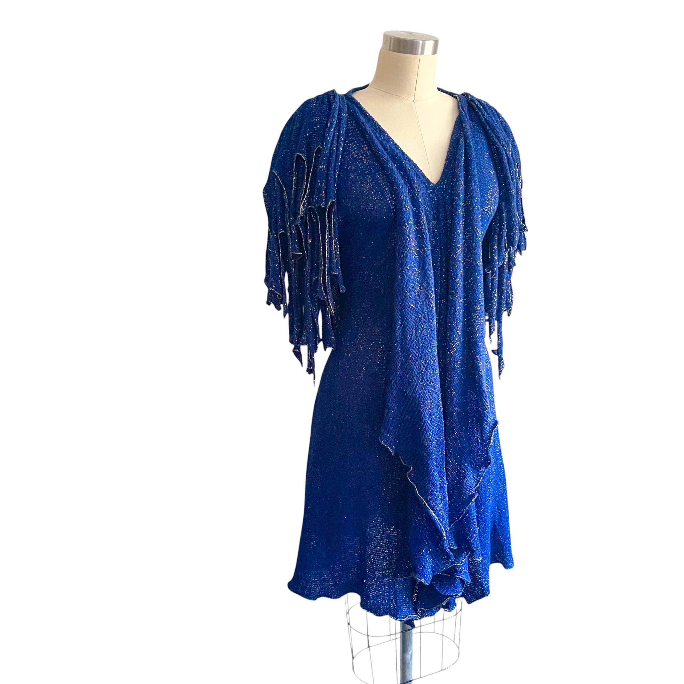 Vintage Avant Garde Blue Sweater Dress: Golden Glitter, Fringe Tassel, Padded Shoulders, Party Dress, 80s 90s Blue Dress
