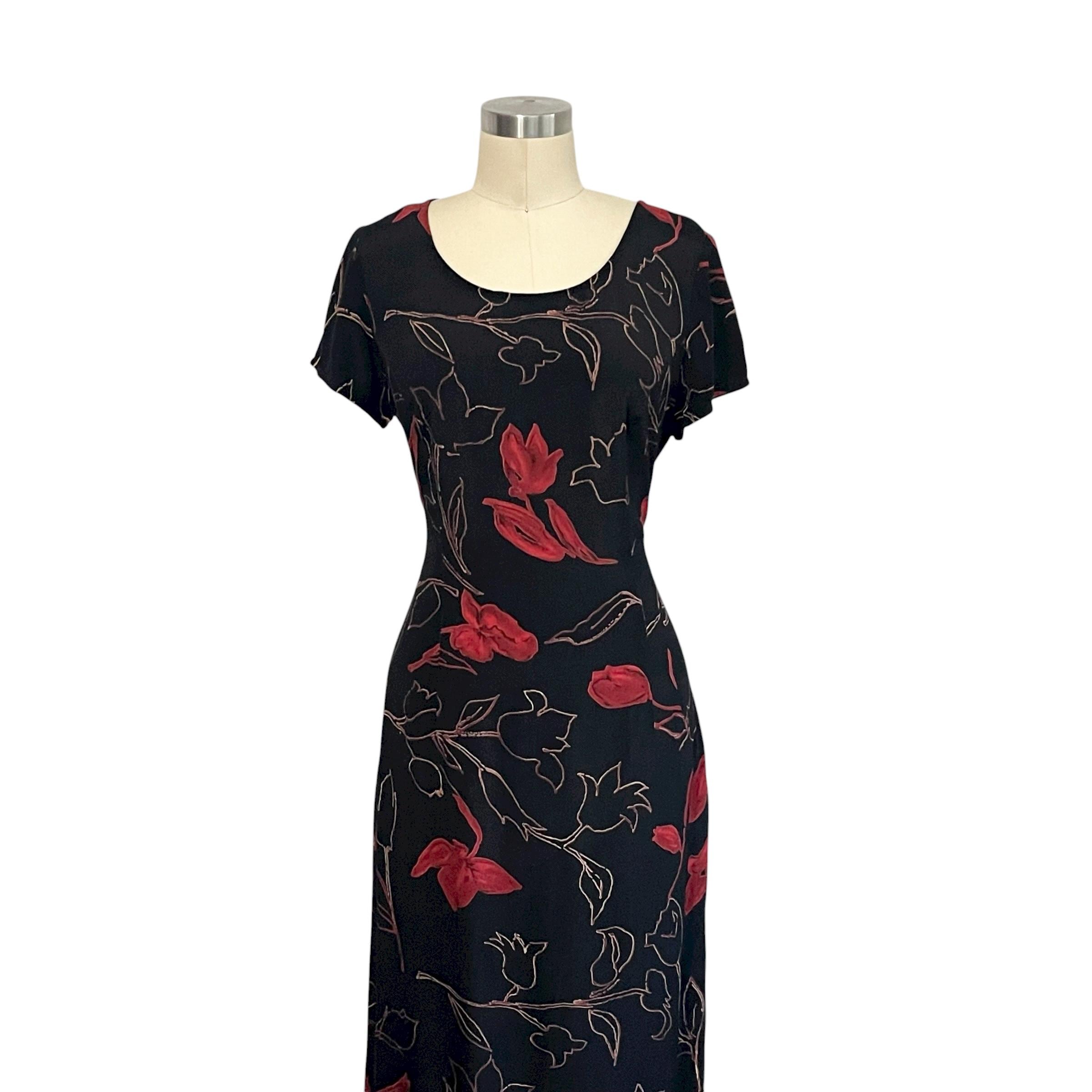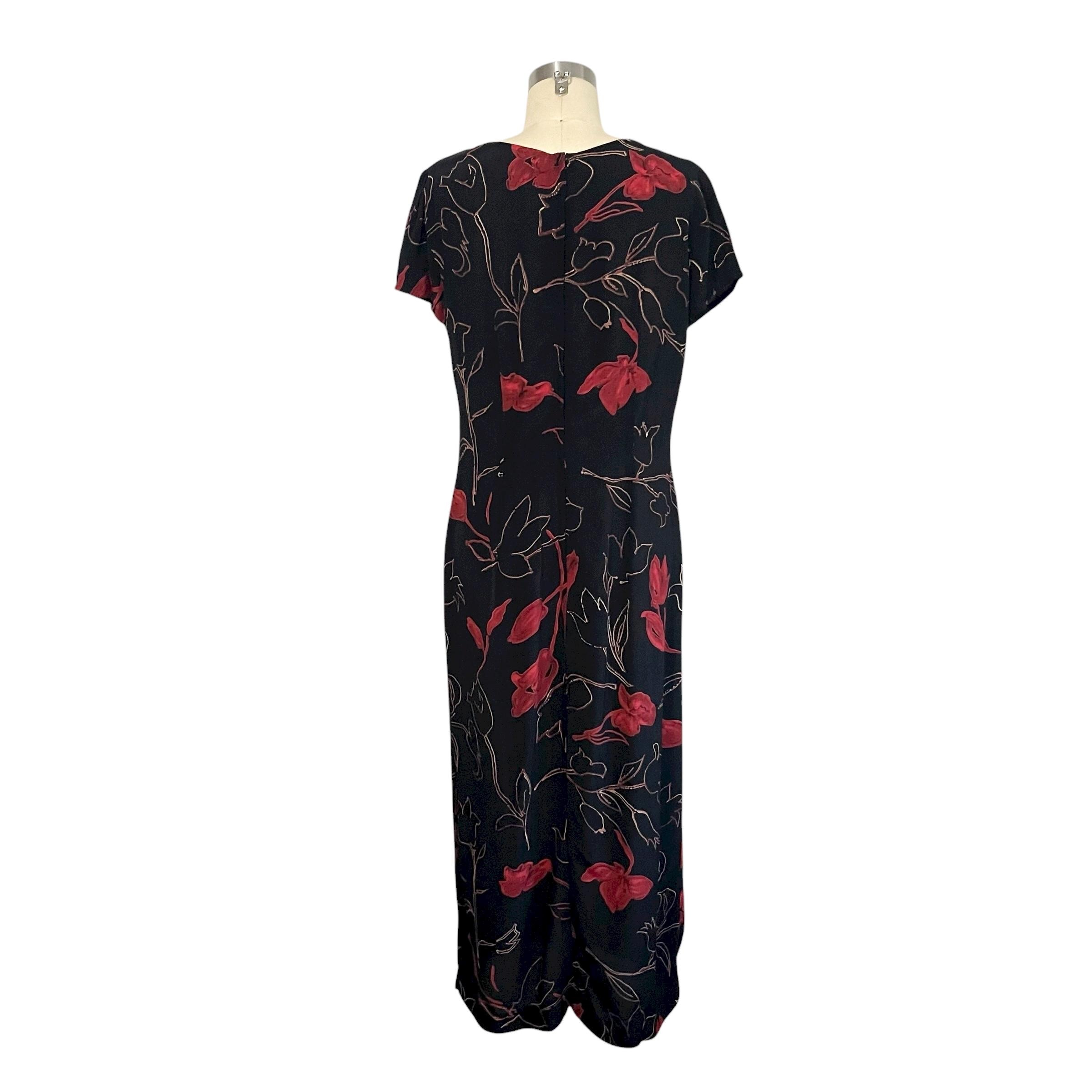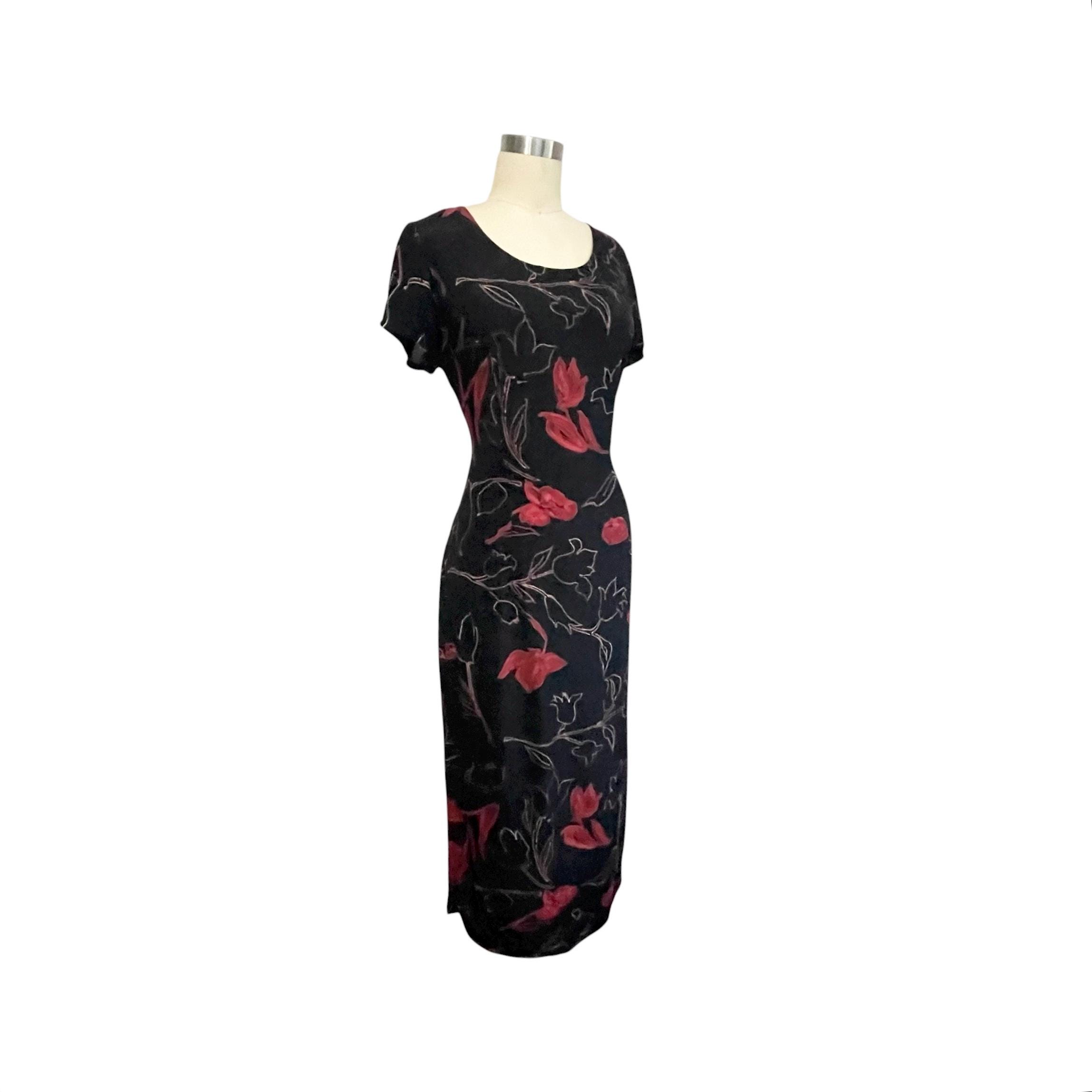 Vintage Studio I Black and Red Floral Maxi Dress: Short-Sleeved Dress, A-Line, Cocktail Dress, Party Dress, Formal Party Dress, 70s 80s 90s