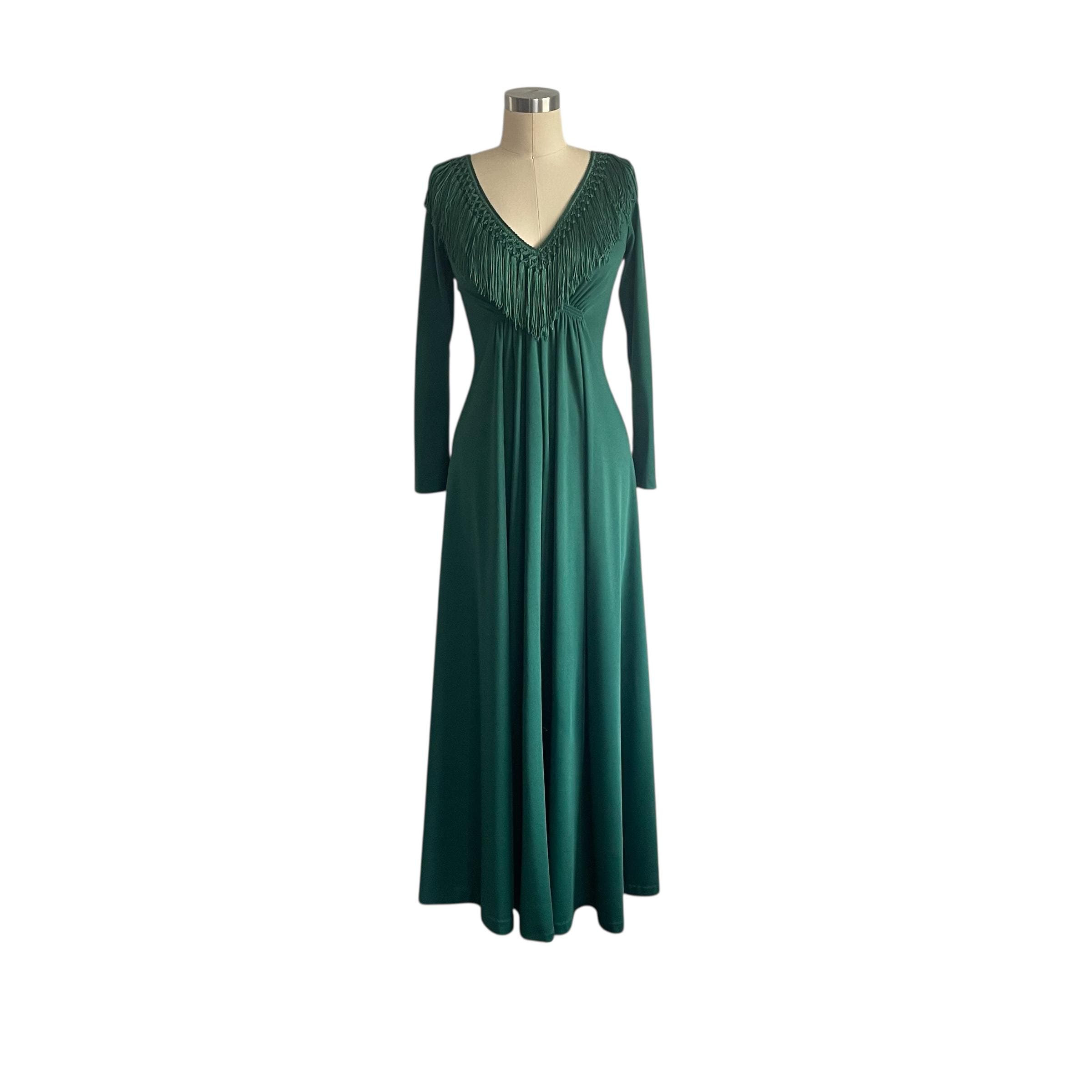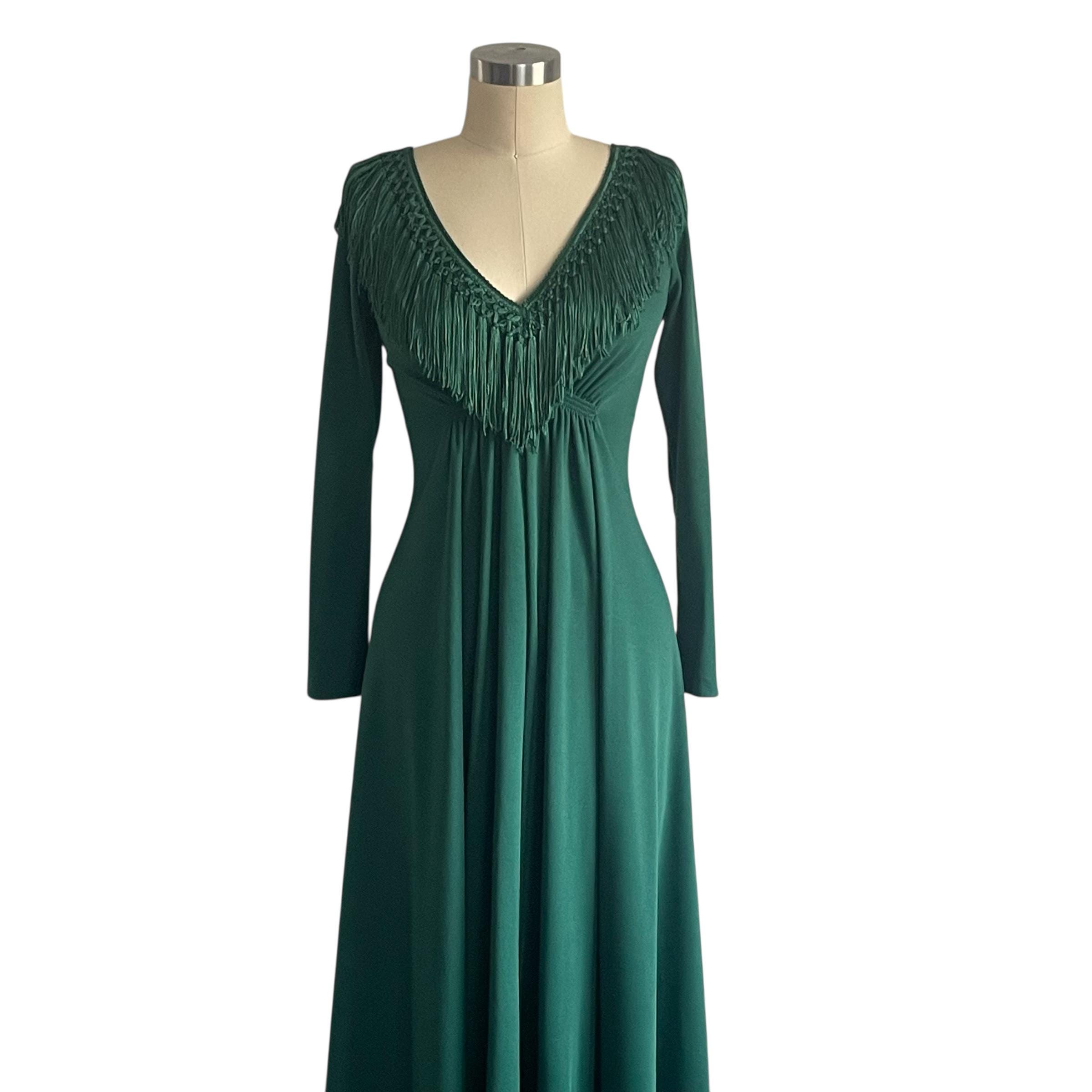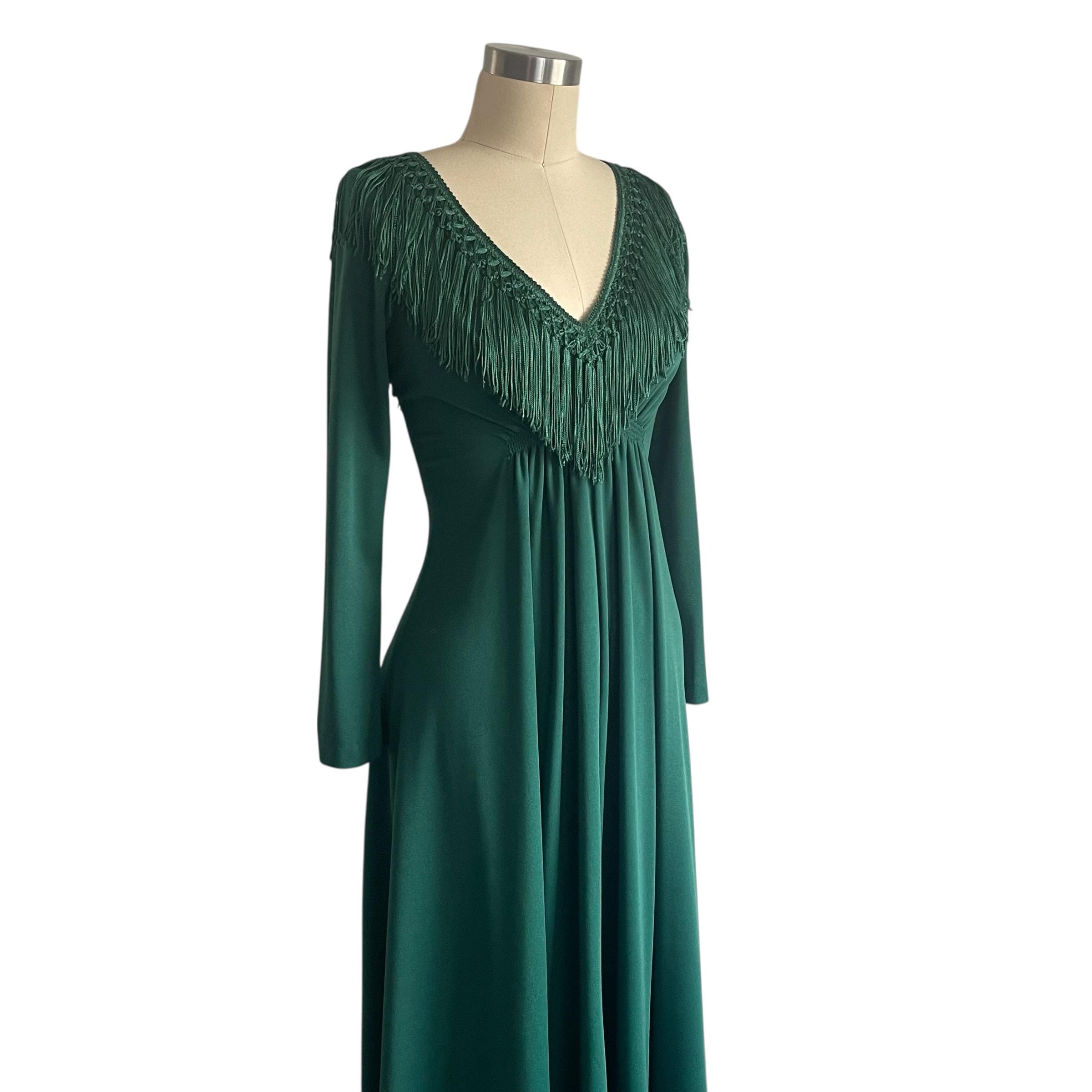 Vintage 60s 70s Wintergreen Babydoll Maxi Dress: V-Neck, Fringes.