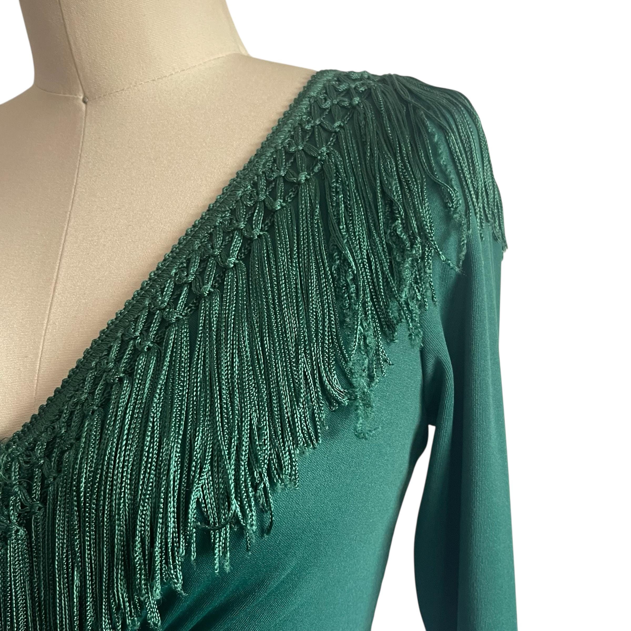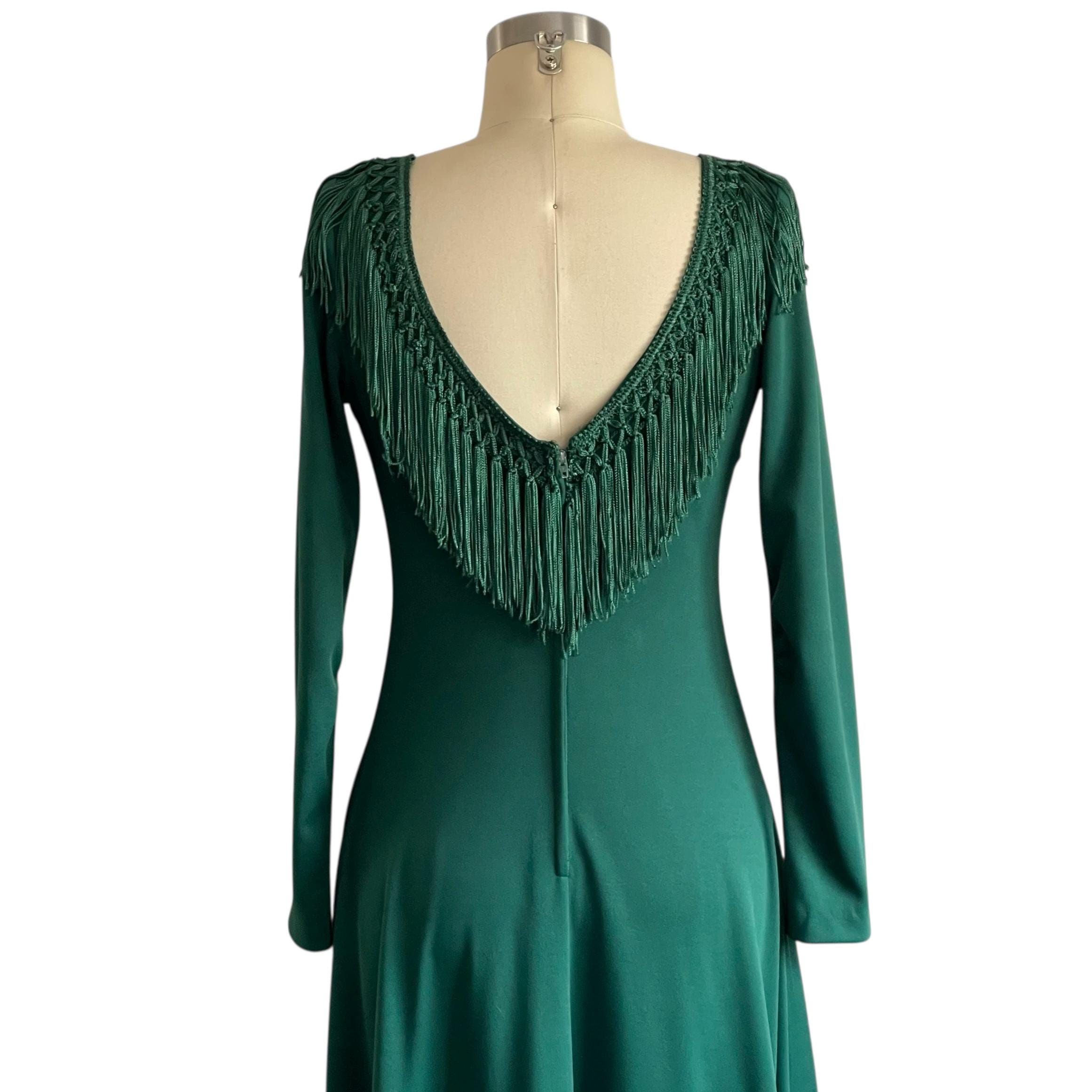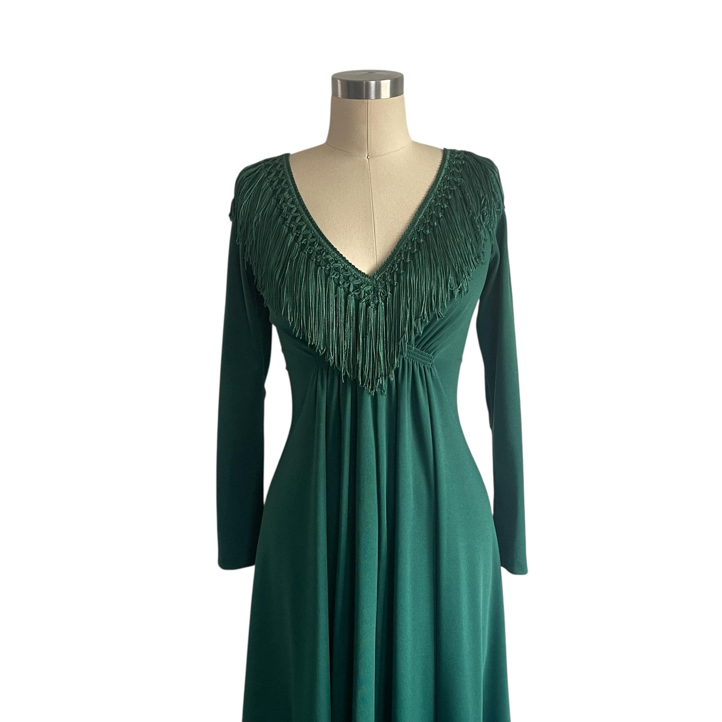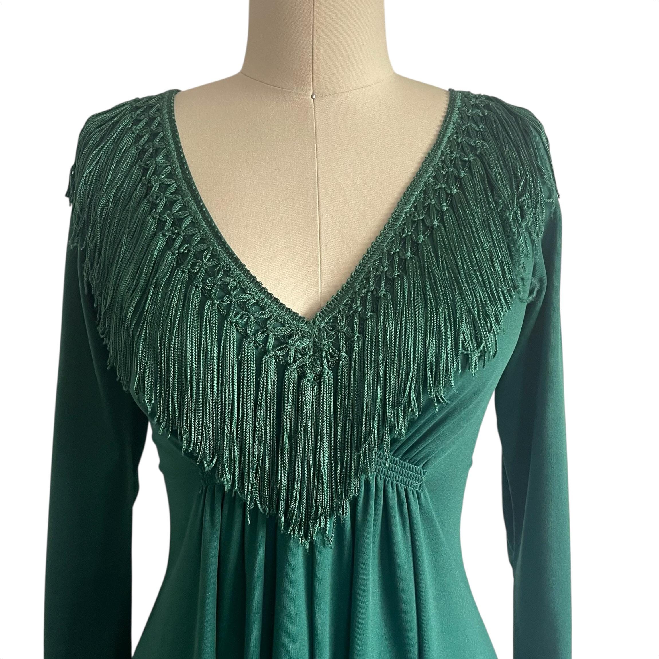 Vintage 60s 70s Wintergreen Babydoll Maxi Dress: V-Neck, Fringes.