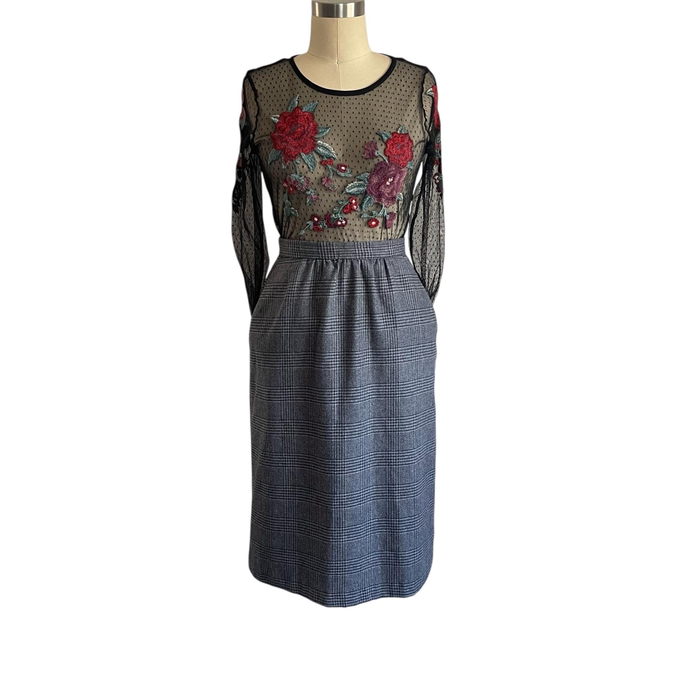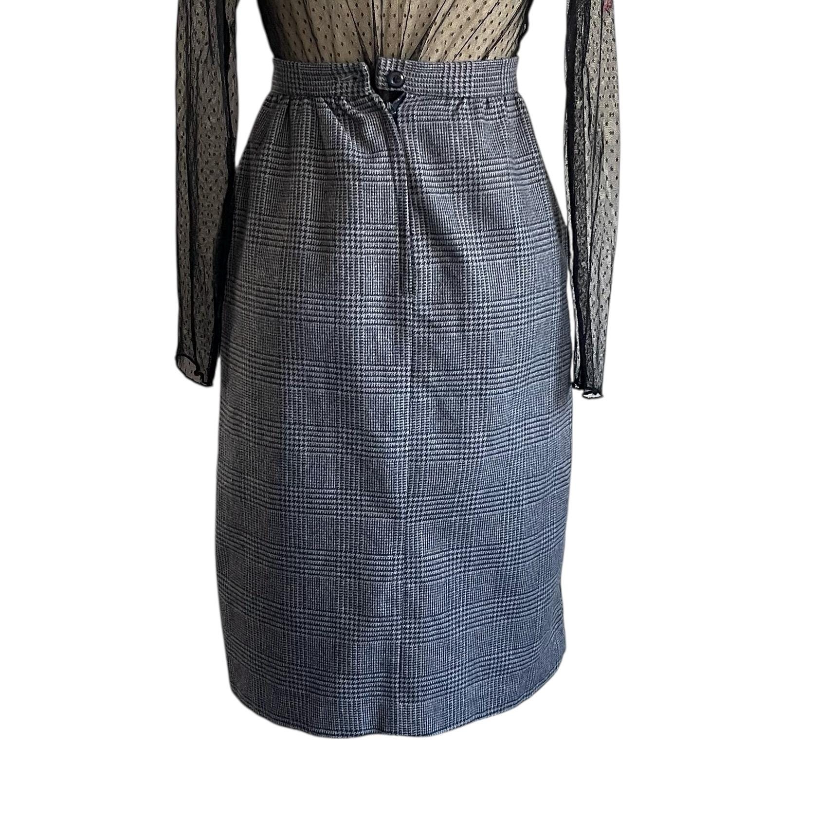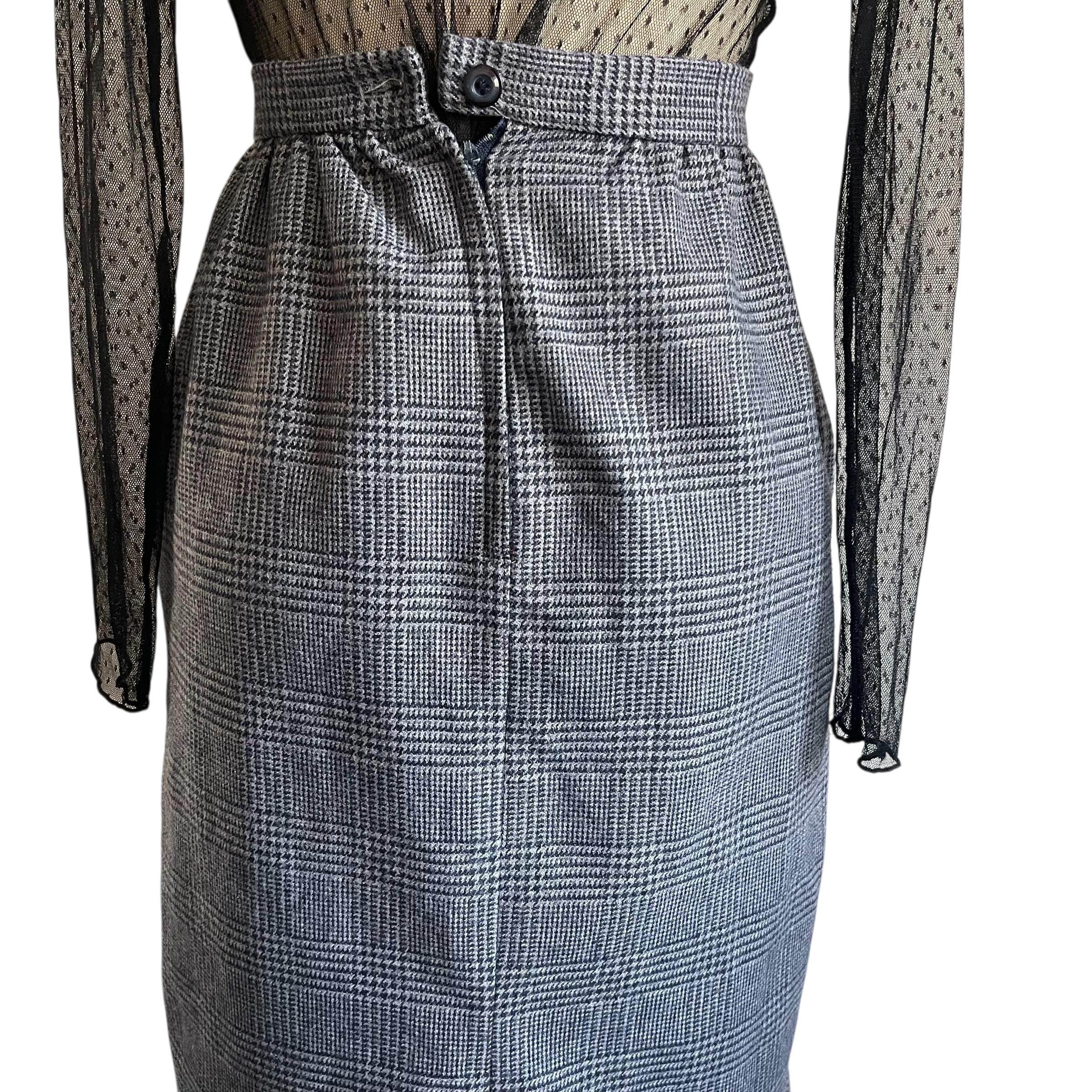 Vintage Gray Blue Wool Plaid Skirt: High Waisted, 70s 80s Pencil Skirt.