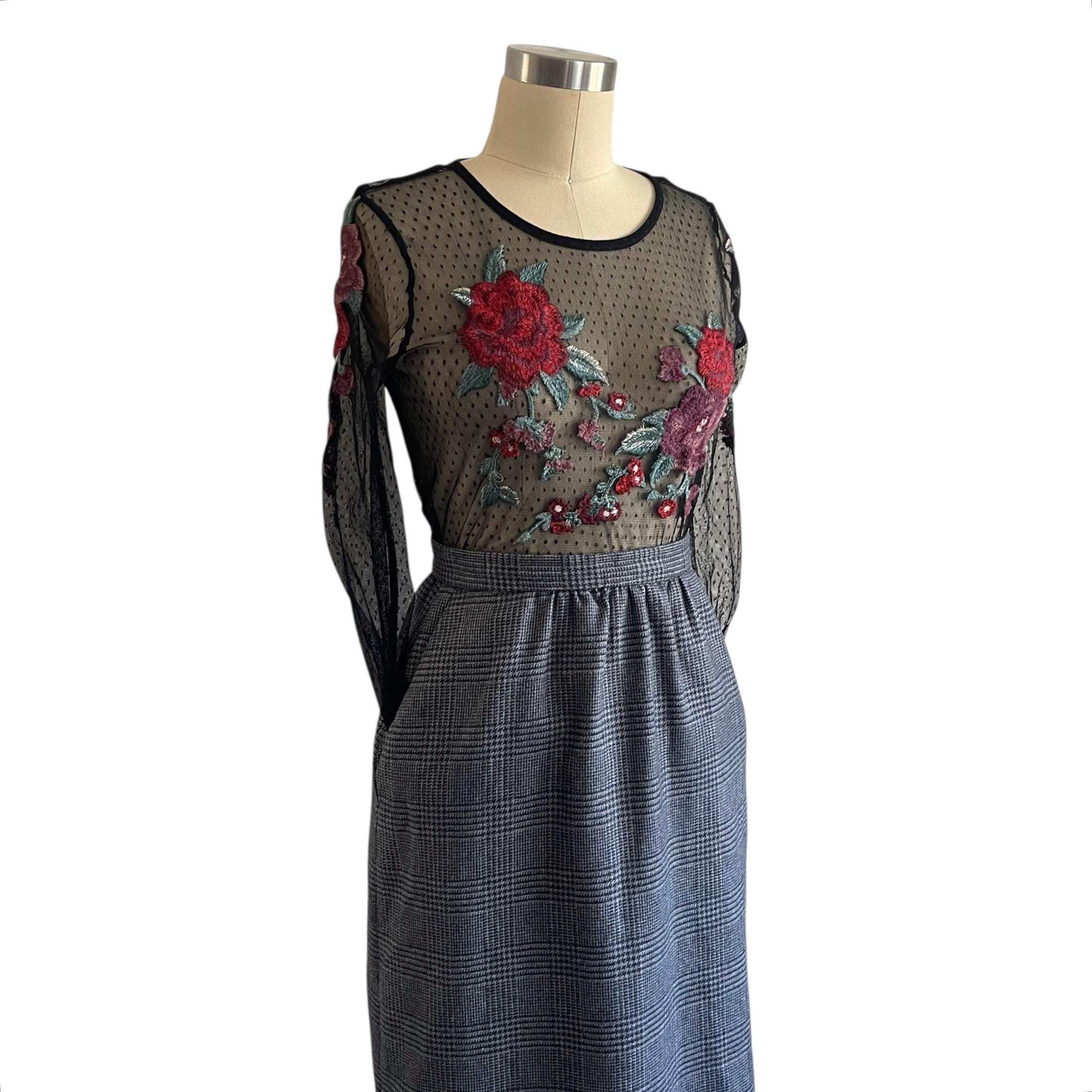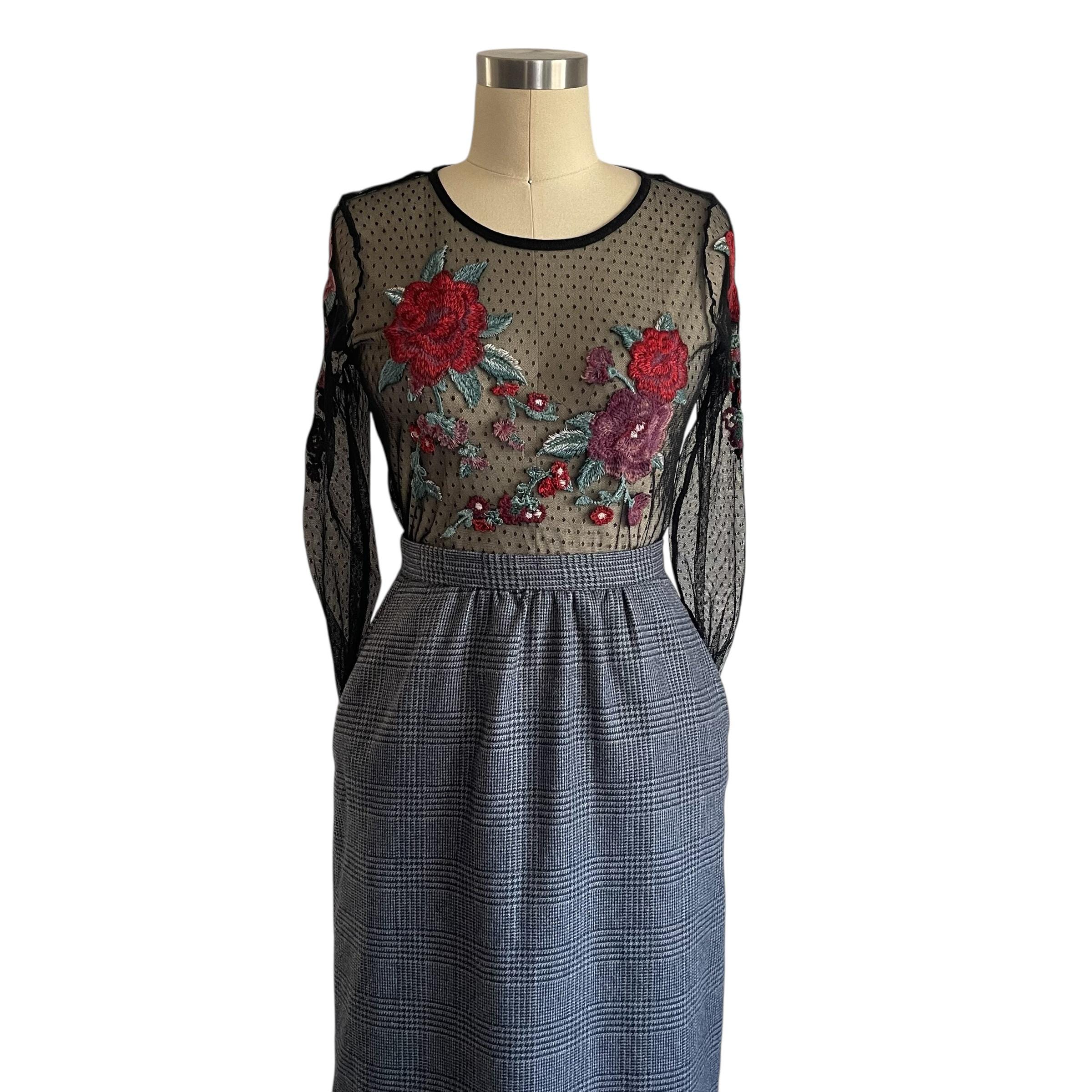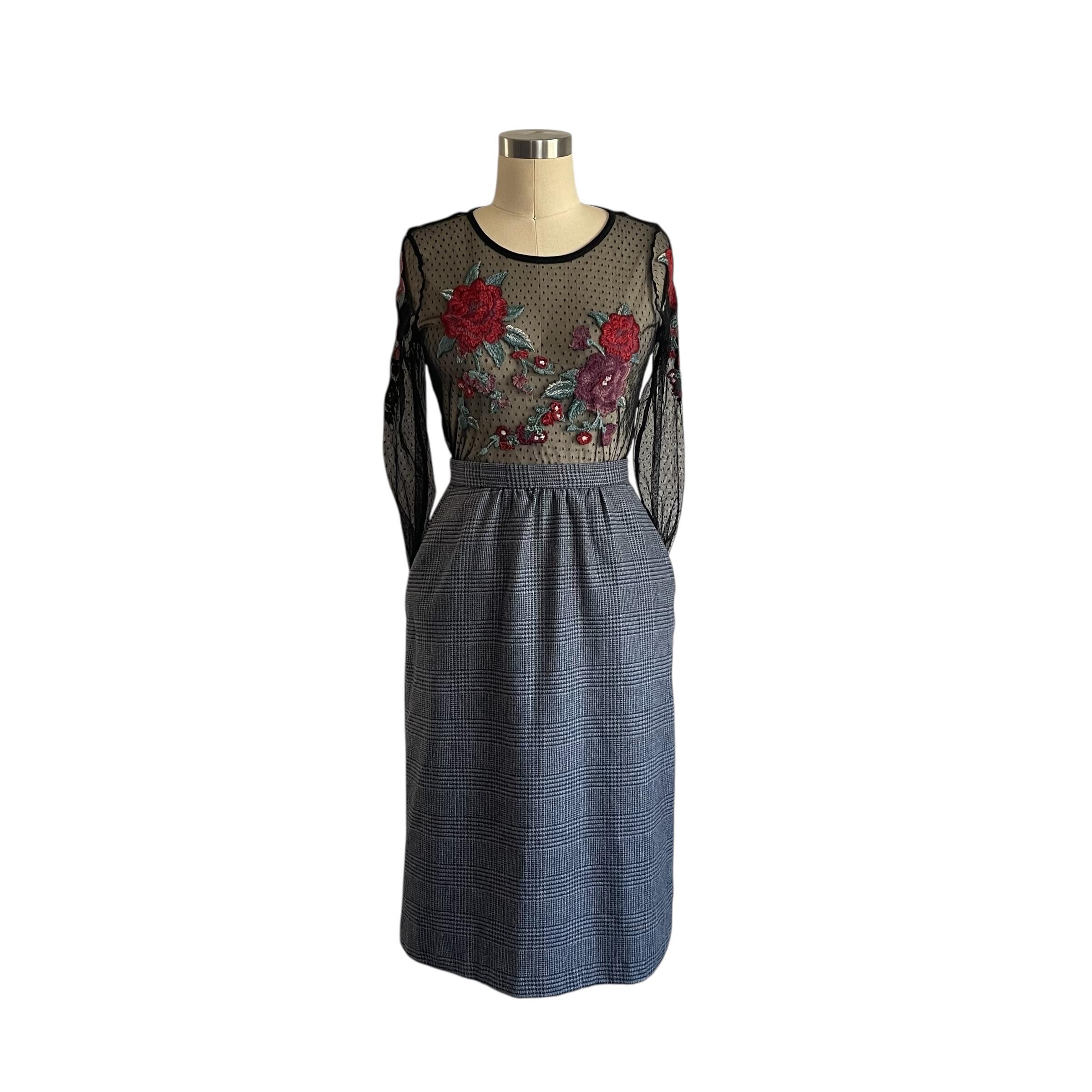 Vintage Gray Blue Wool Plaid Skirt: High Waisted, 70s 80s Pencil Skirt.