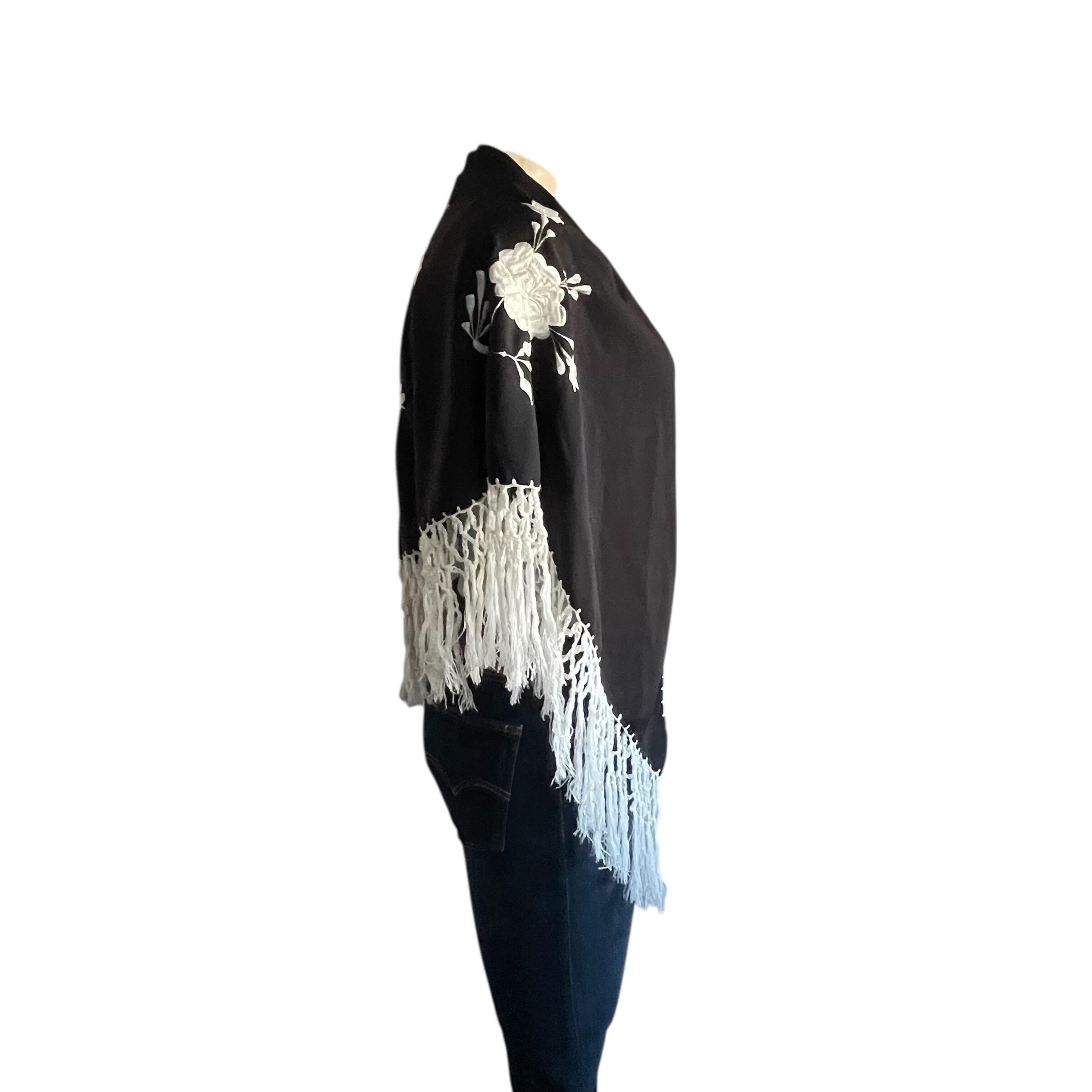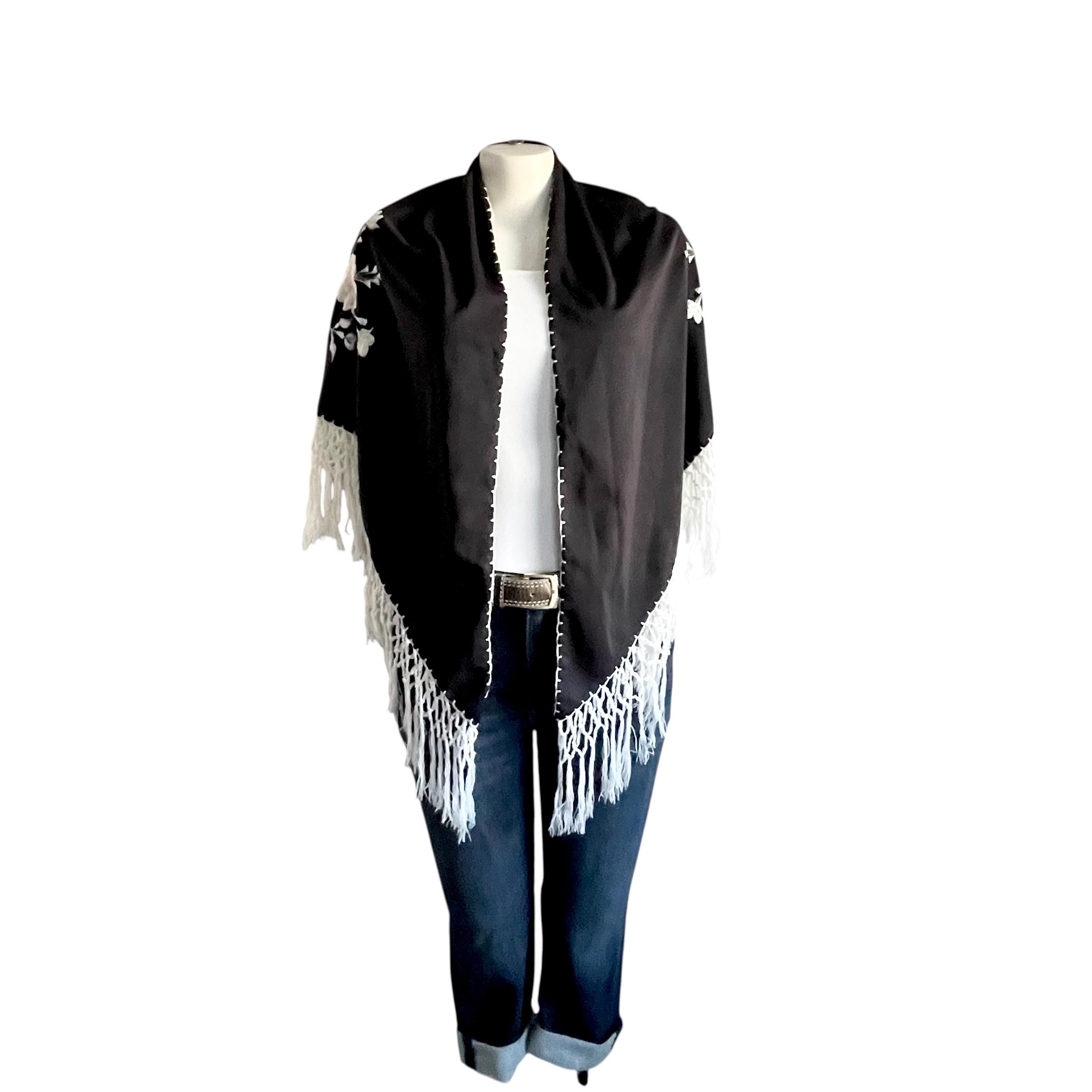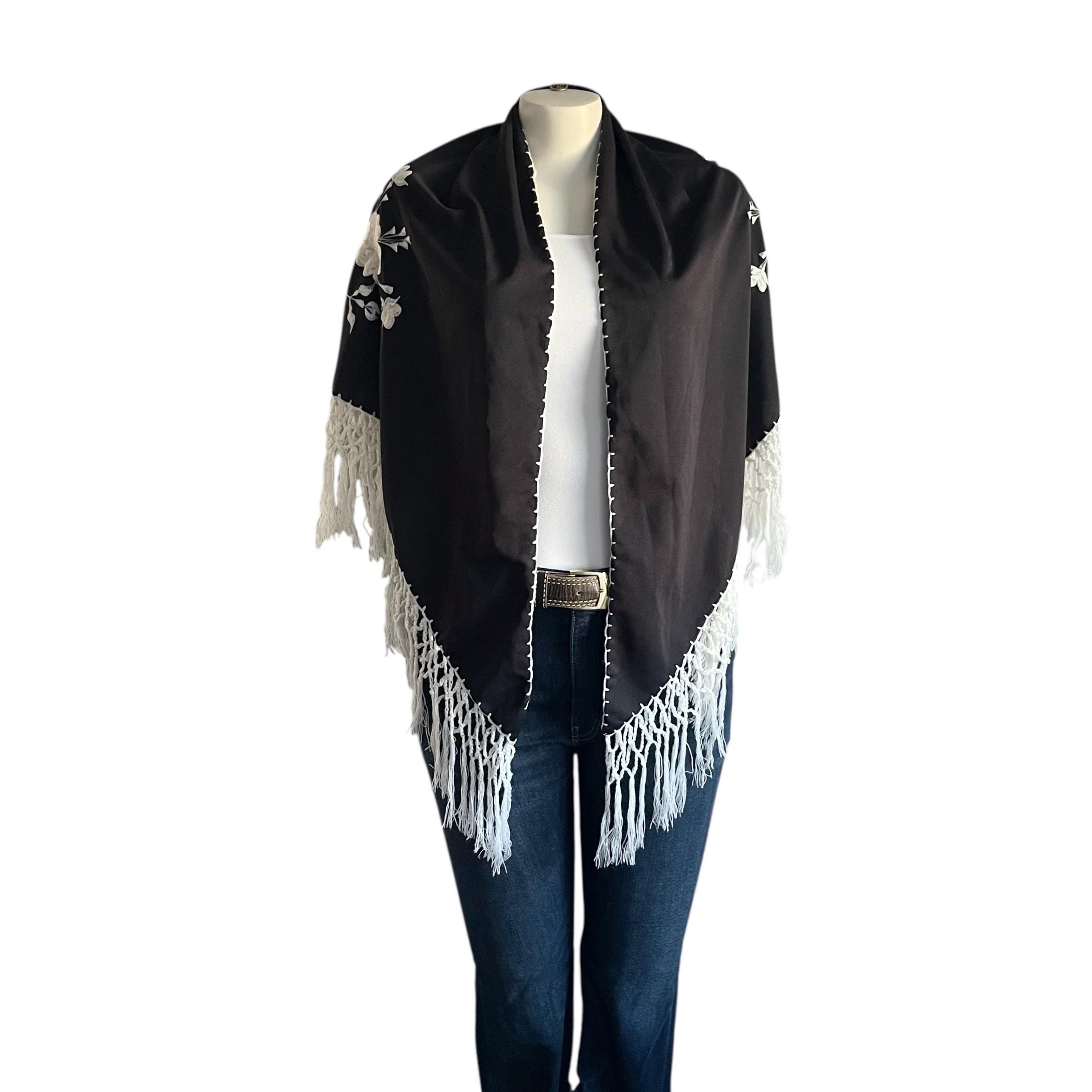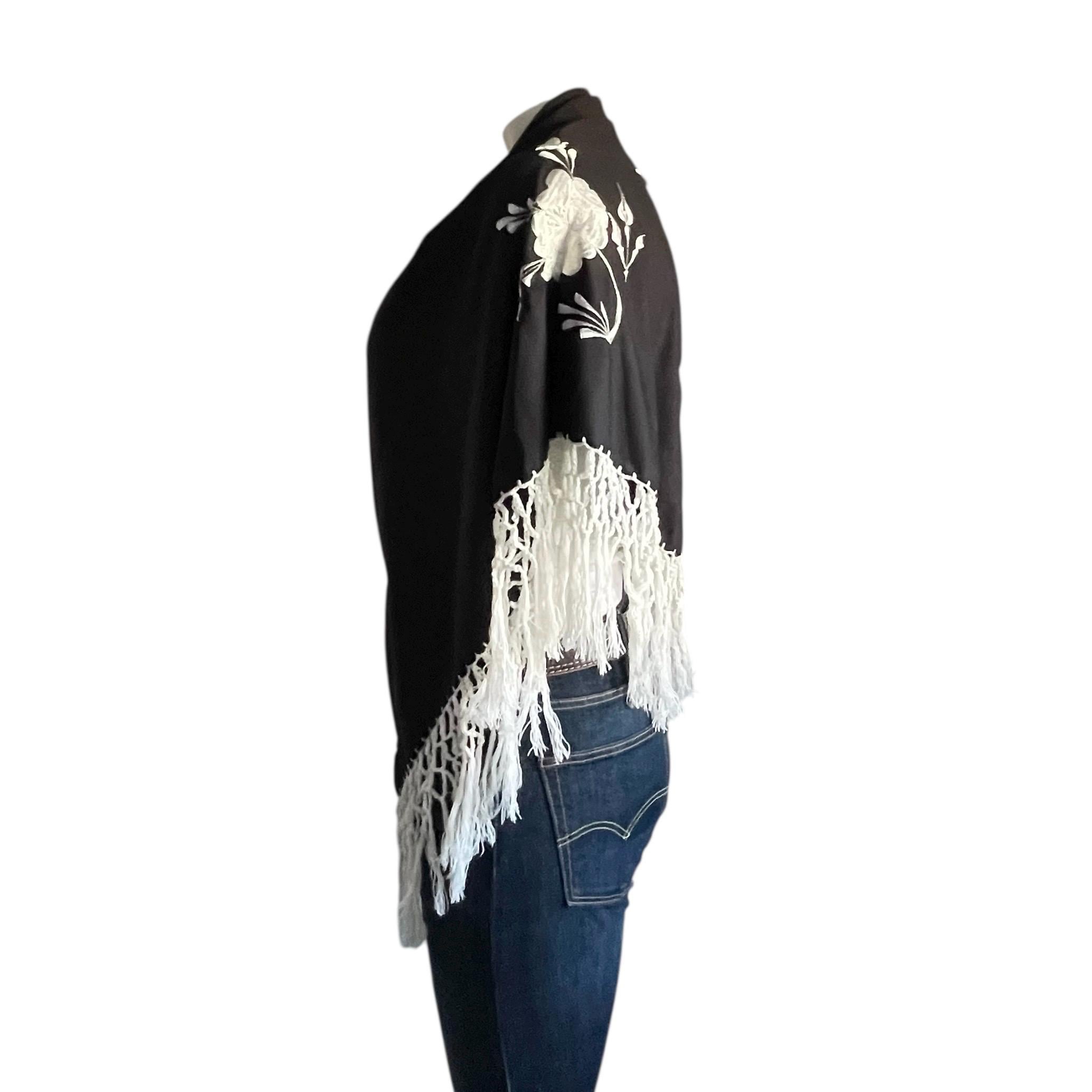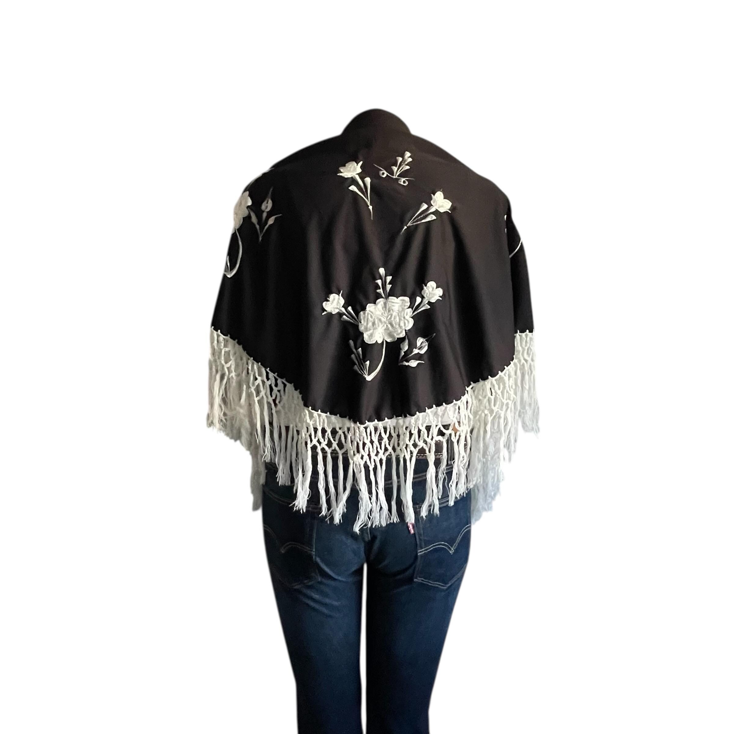 Vintage Black and White Floral Western Cape Shawl: Fringed Flower Cowgirl Cape, Boho Hippie Shawl, Fringes, Festival Cape, 90s Y2K Shawl