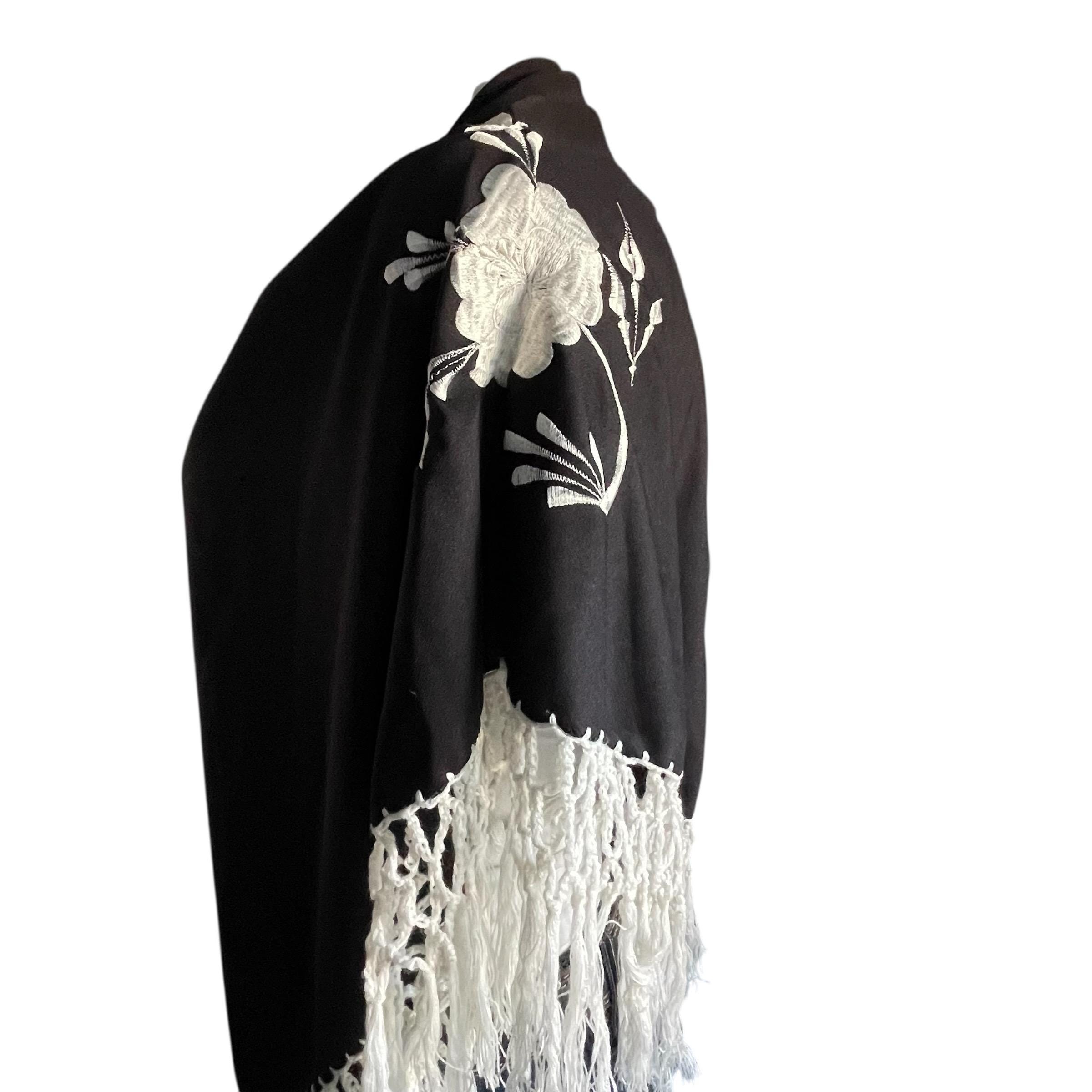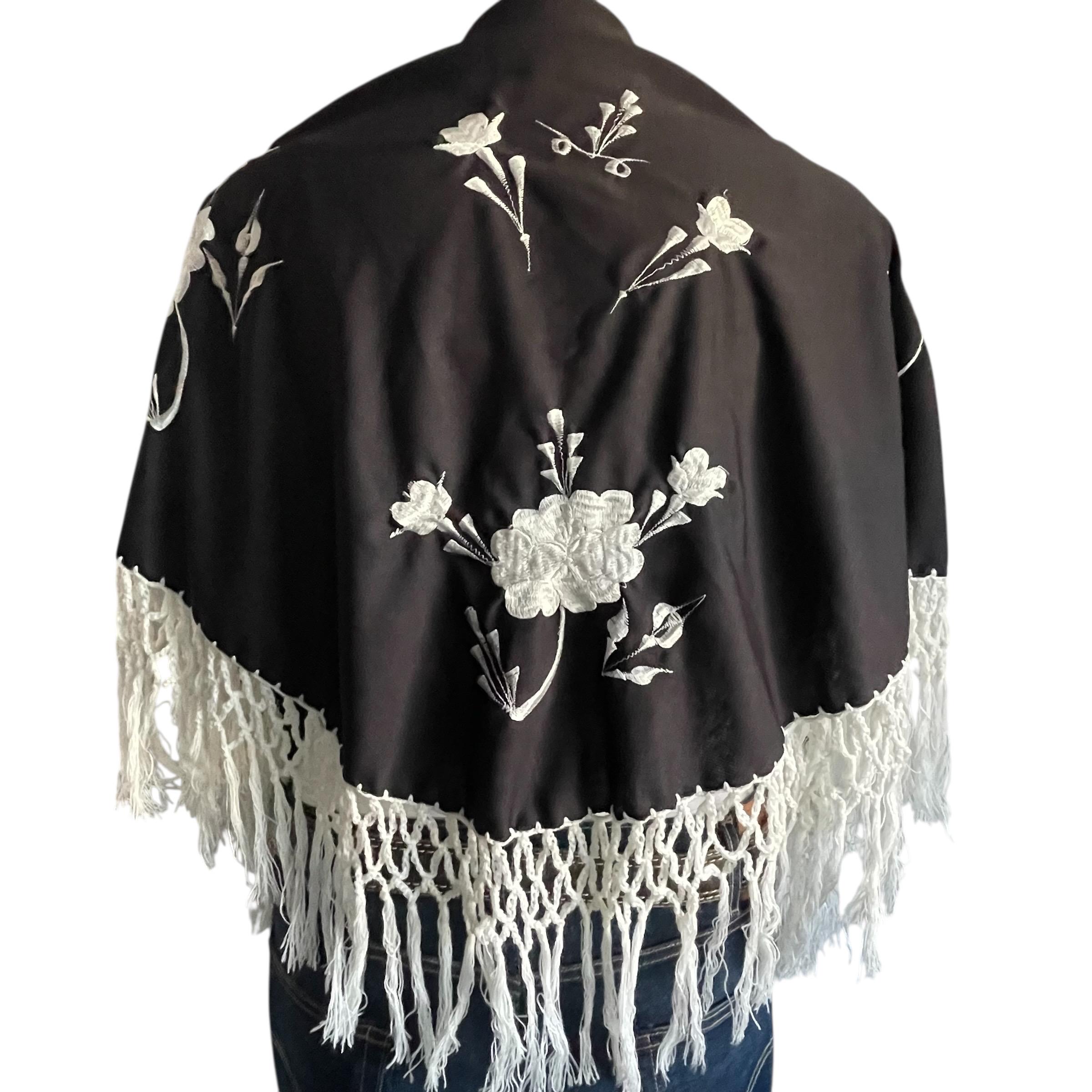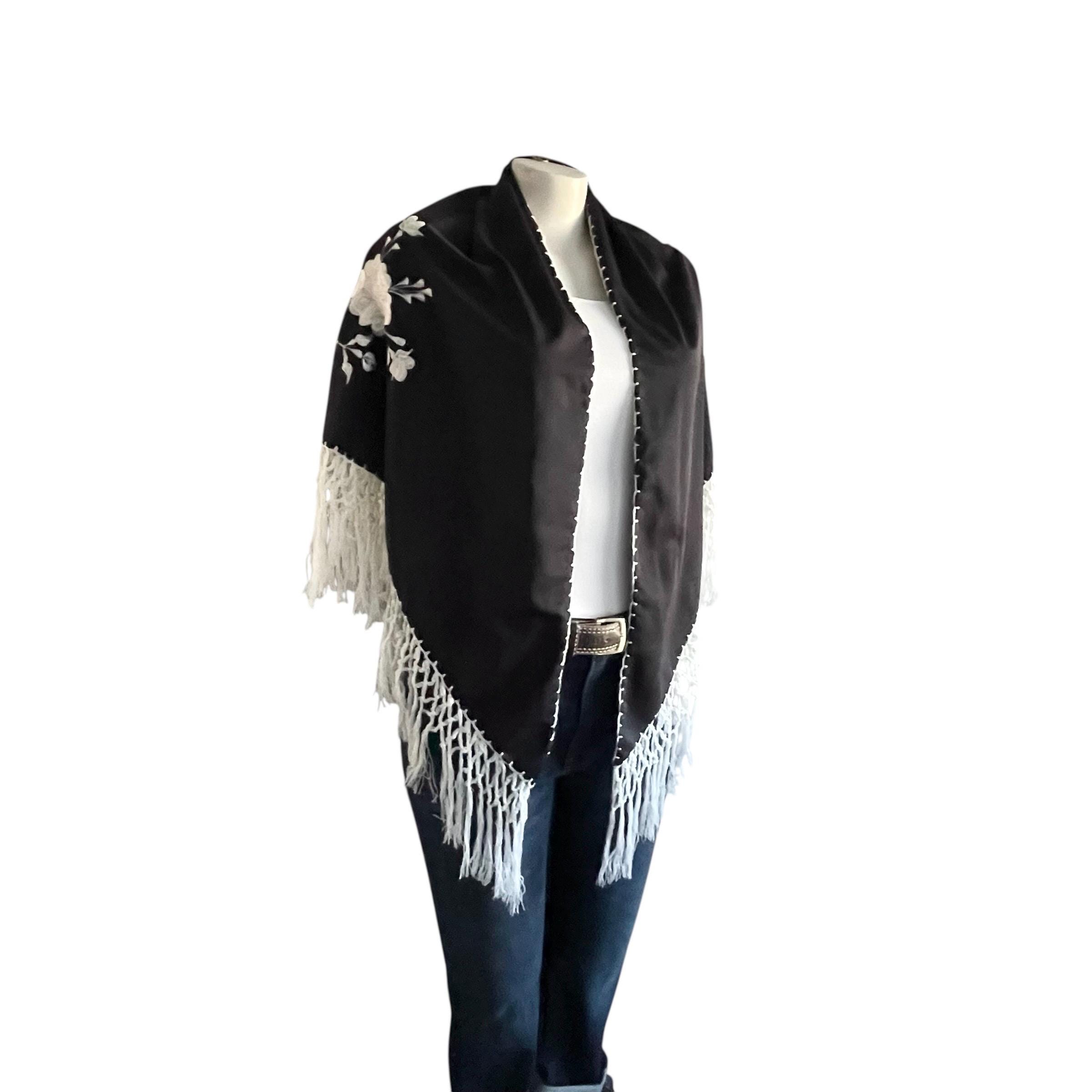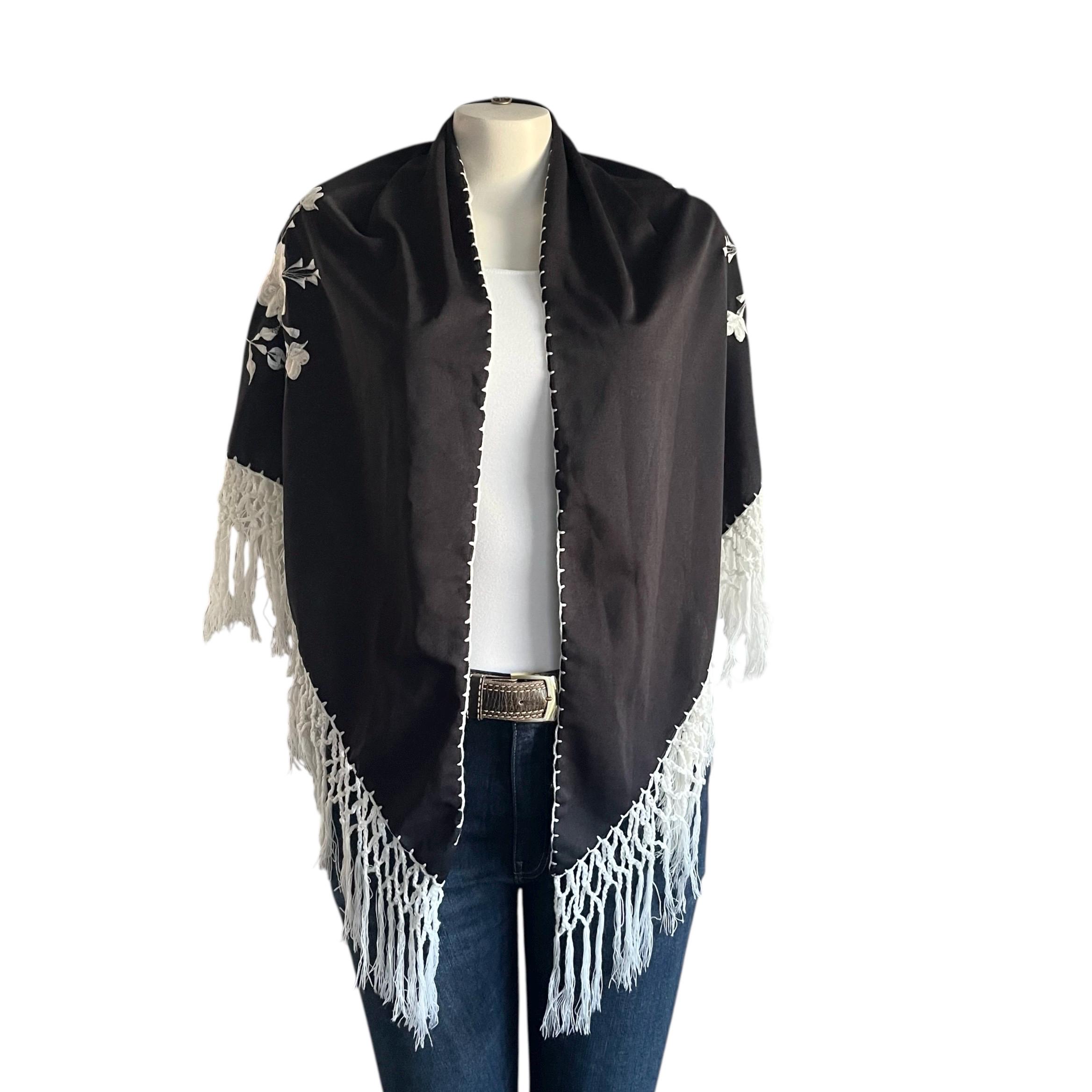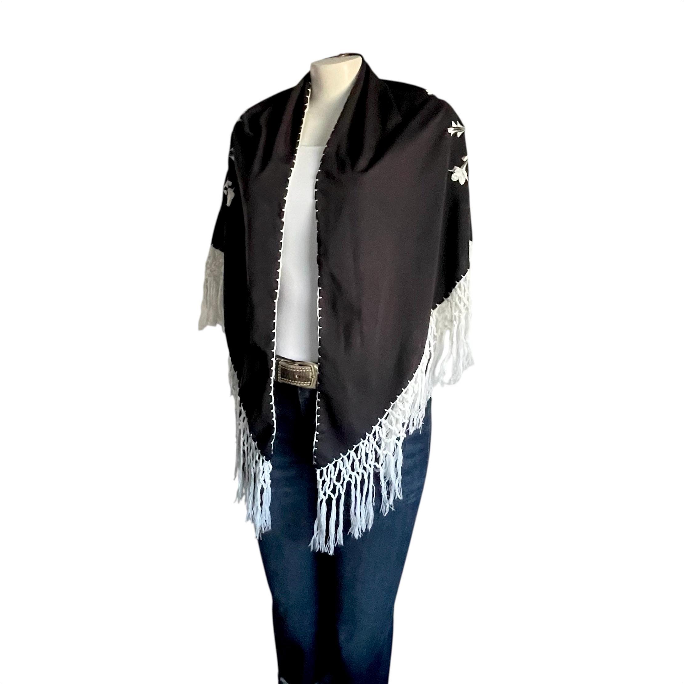 Vintage Black and White Floral Western Cape Shawl: Fringed Flower Cowgirl Cape, Boho Hippie Shawl, Fringes, Festival Cape, 90s Y2K Shawl