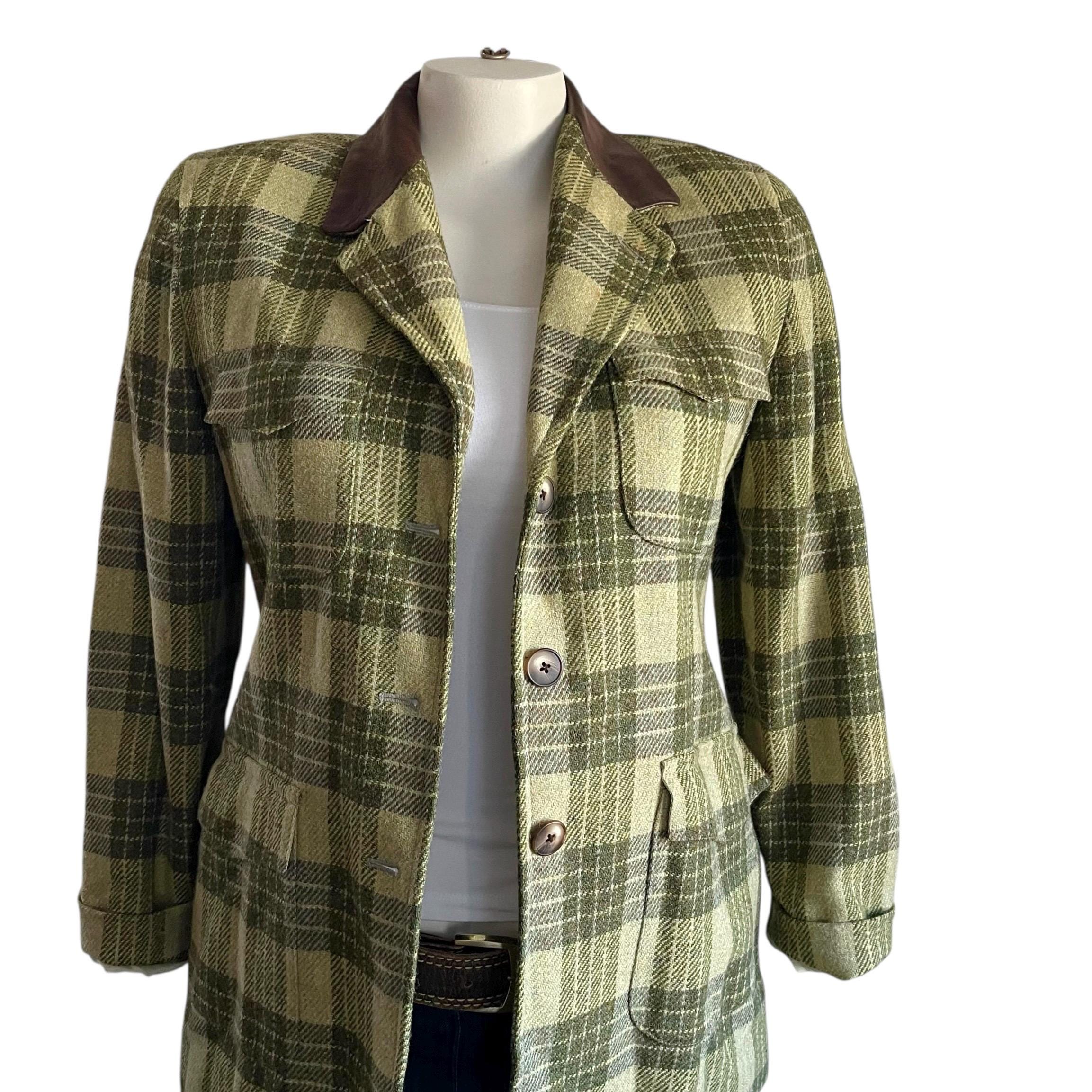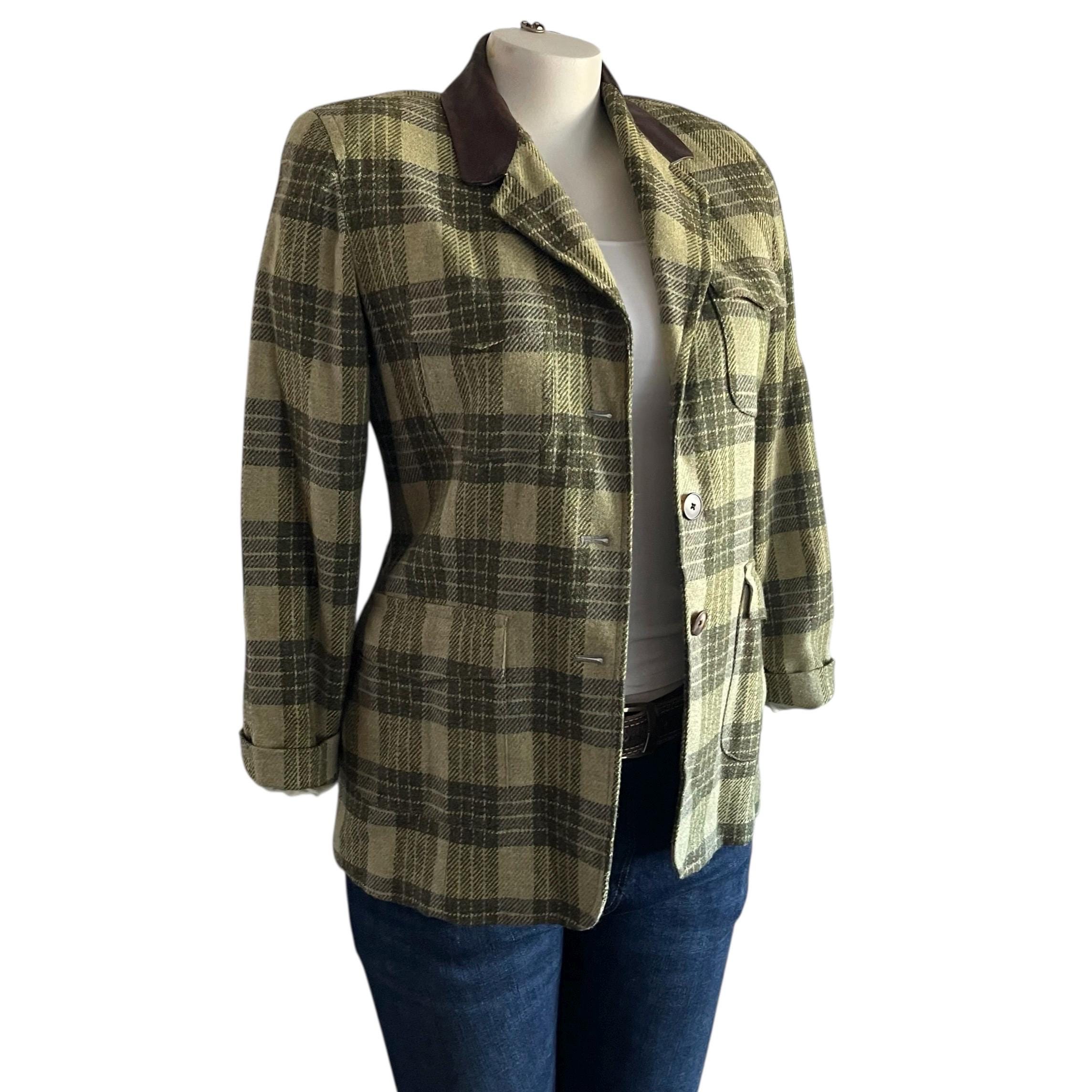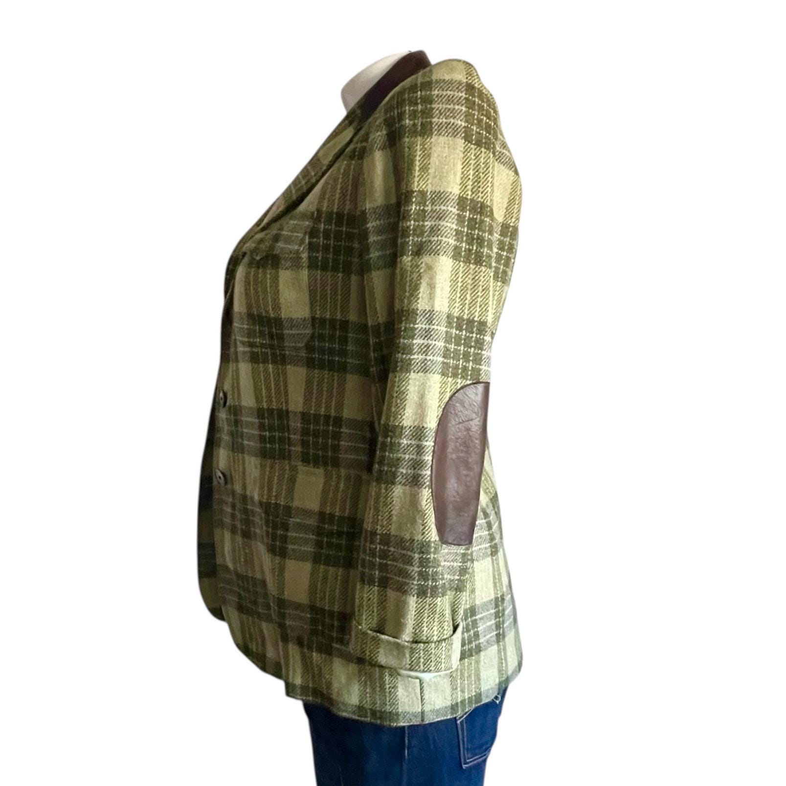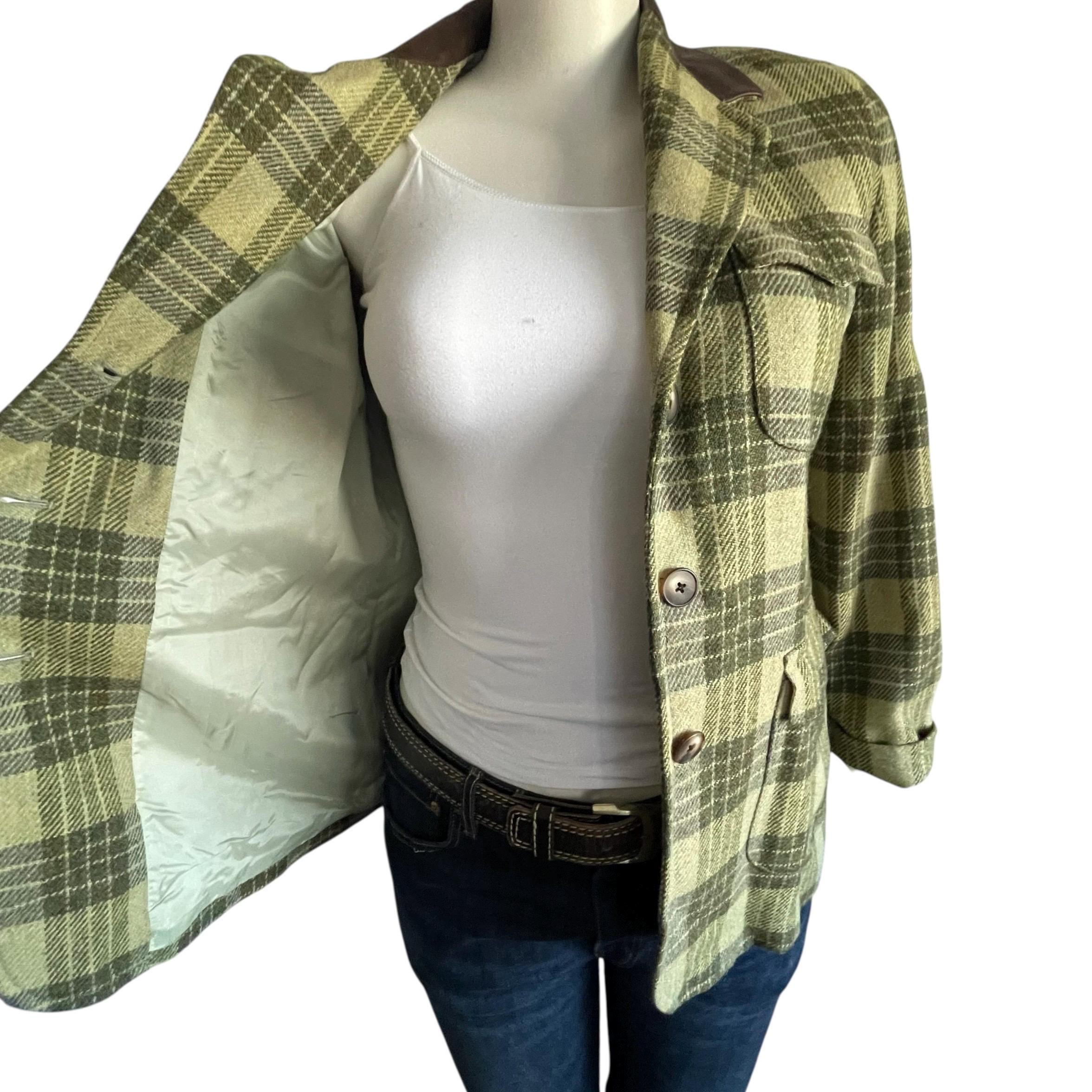 Vintage Ellen Tracy Company Green Plaid Check Jackets: Retro Plaid Wool Farmer Blazers, Cottagecore Blazers, Elbow Patches