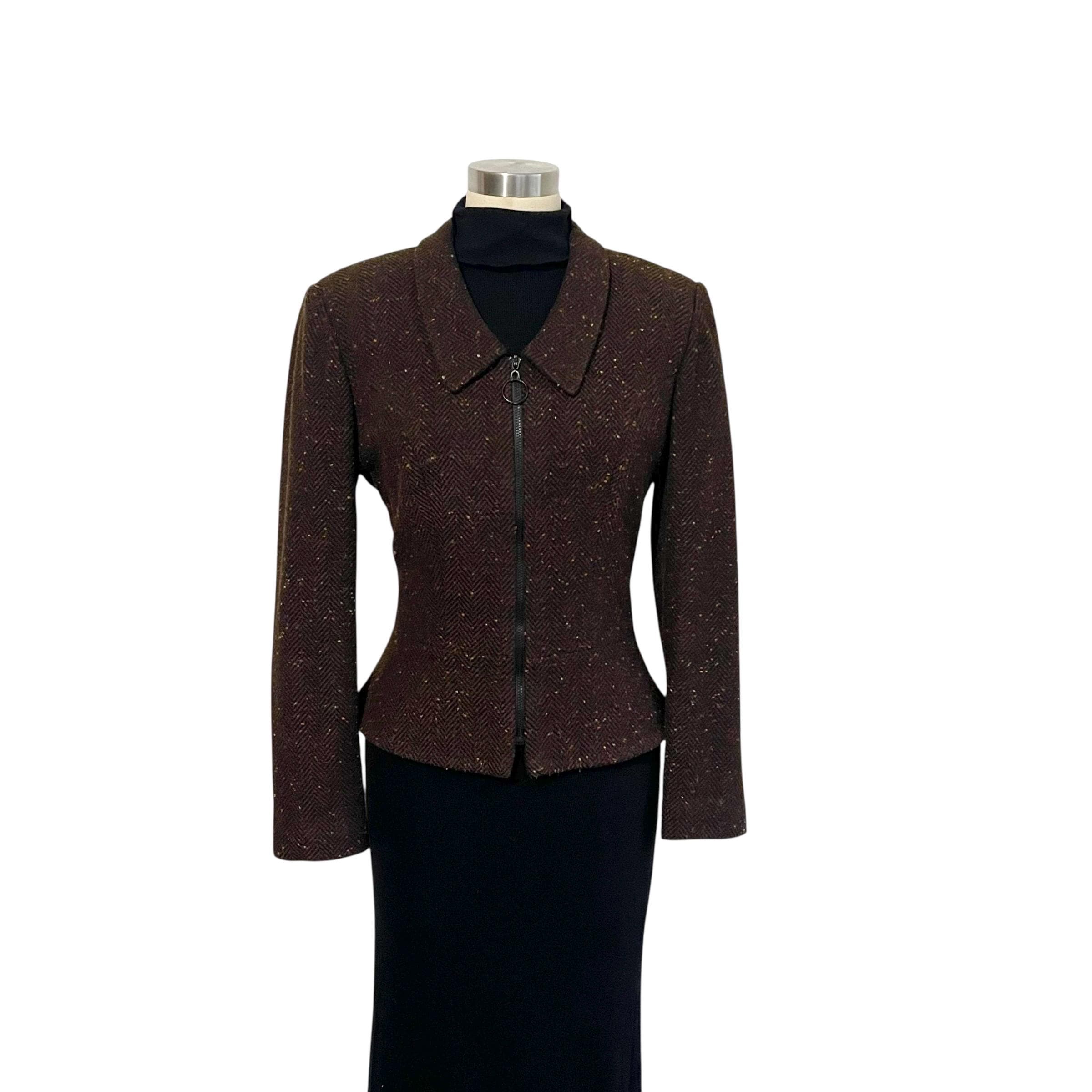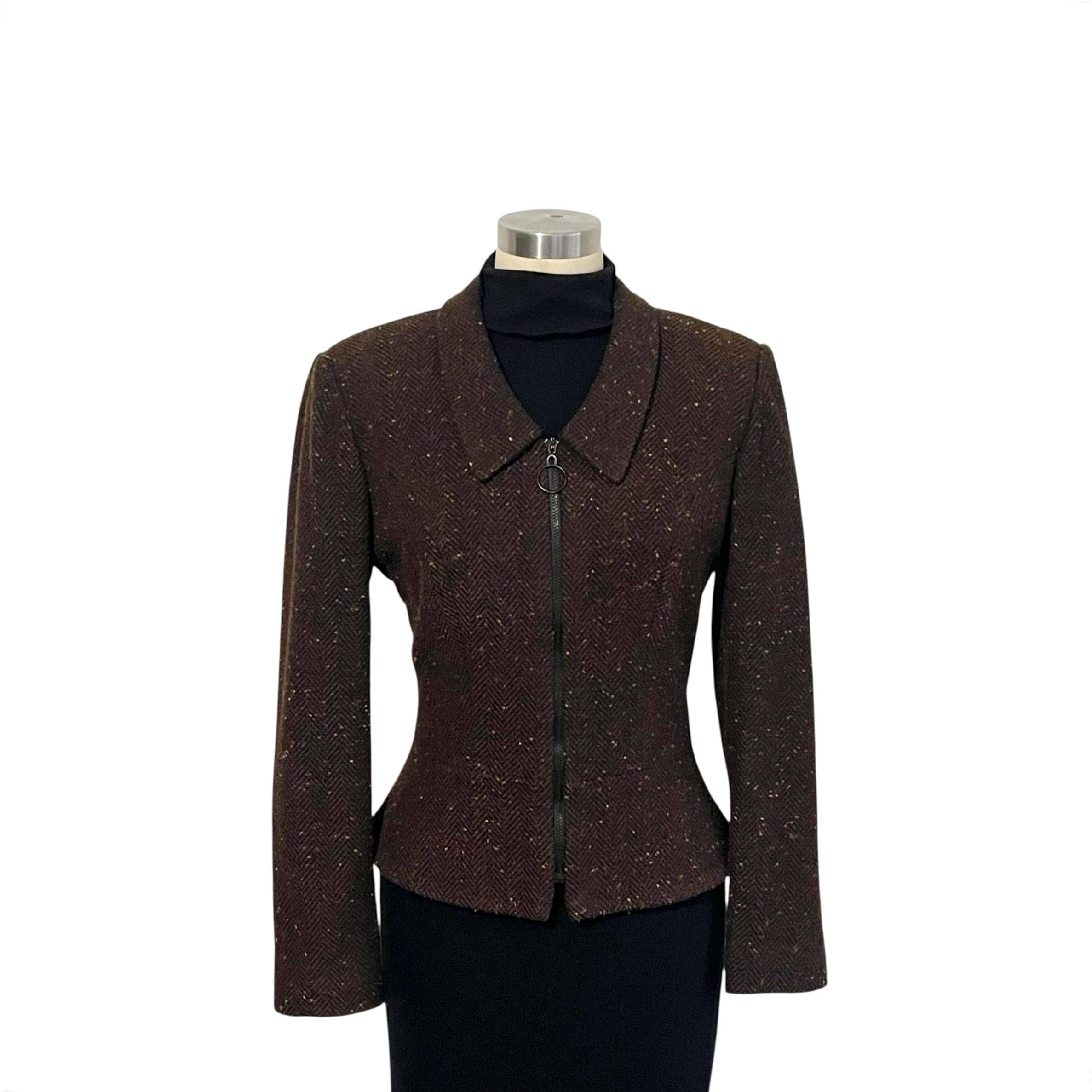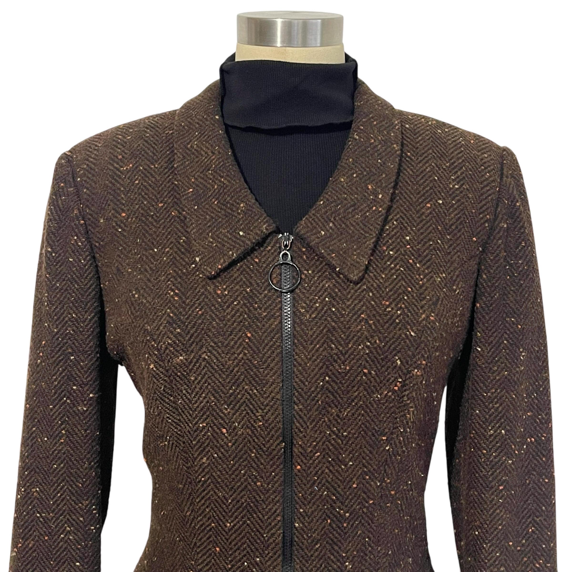 Vintage Casual Brown Dotted Herringbone Jacket: Dark Academia Zipper Jacket, Collared Jacket, Coffee Shop Jacket, 80s 90s Jacket