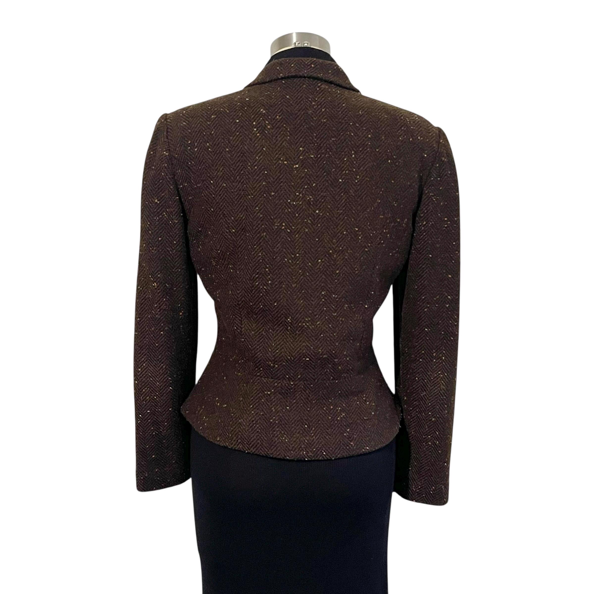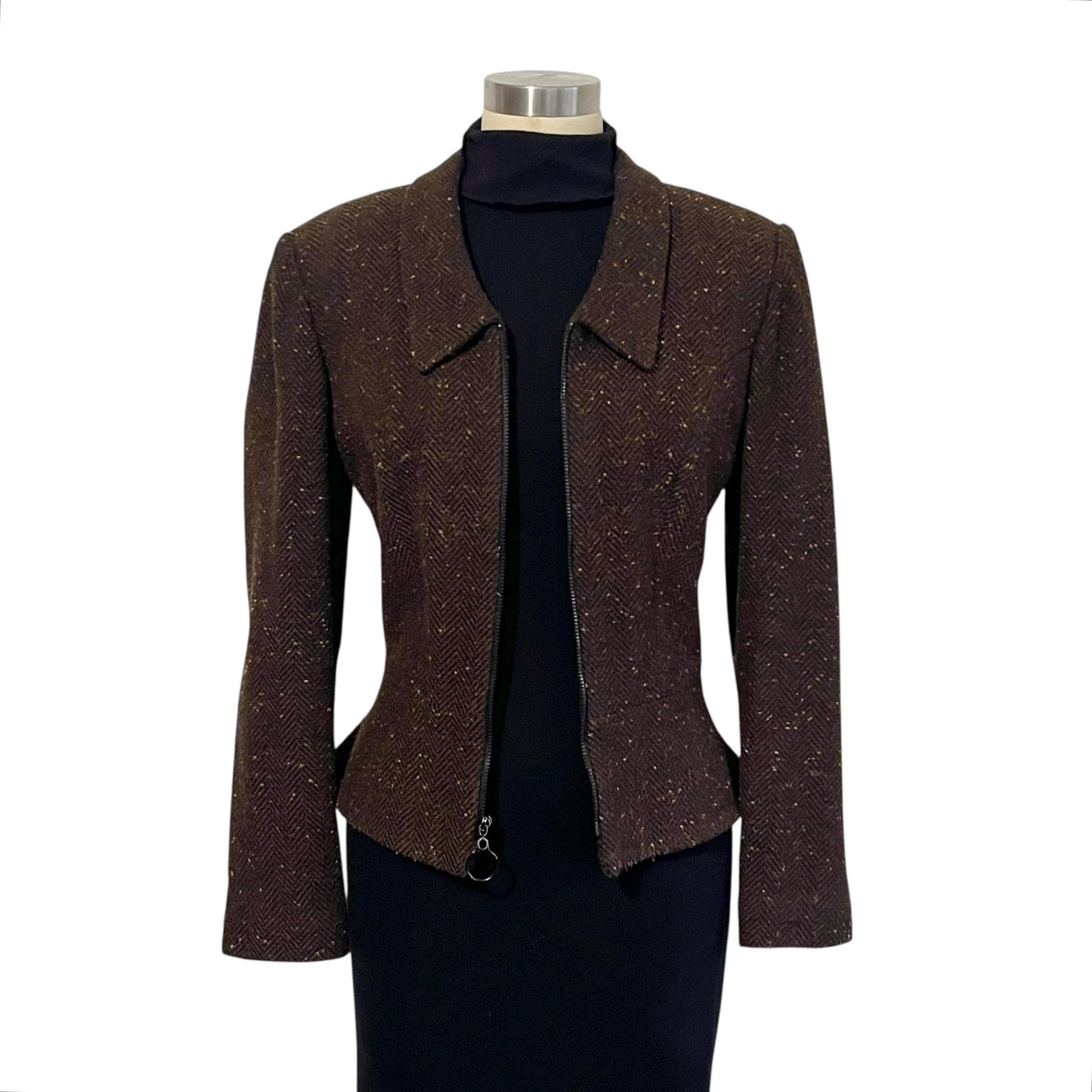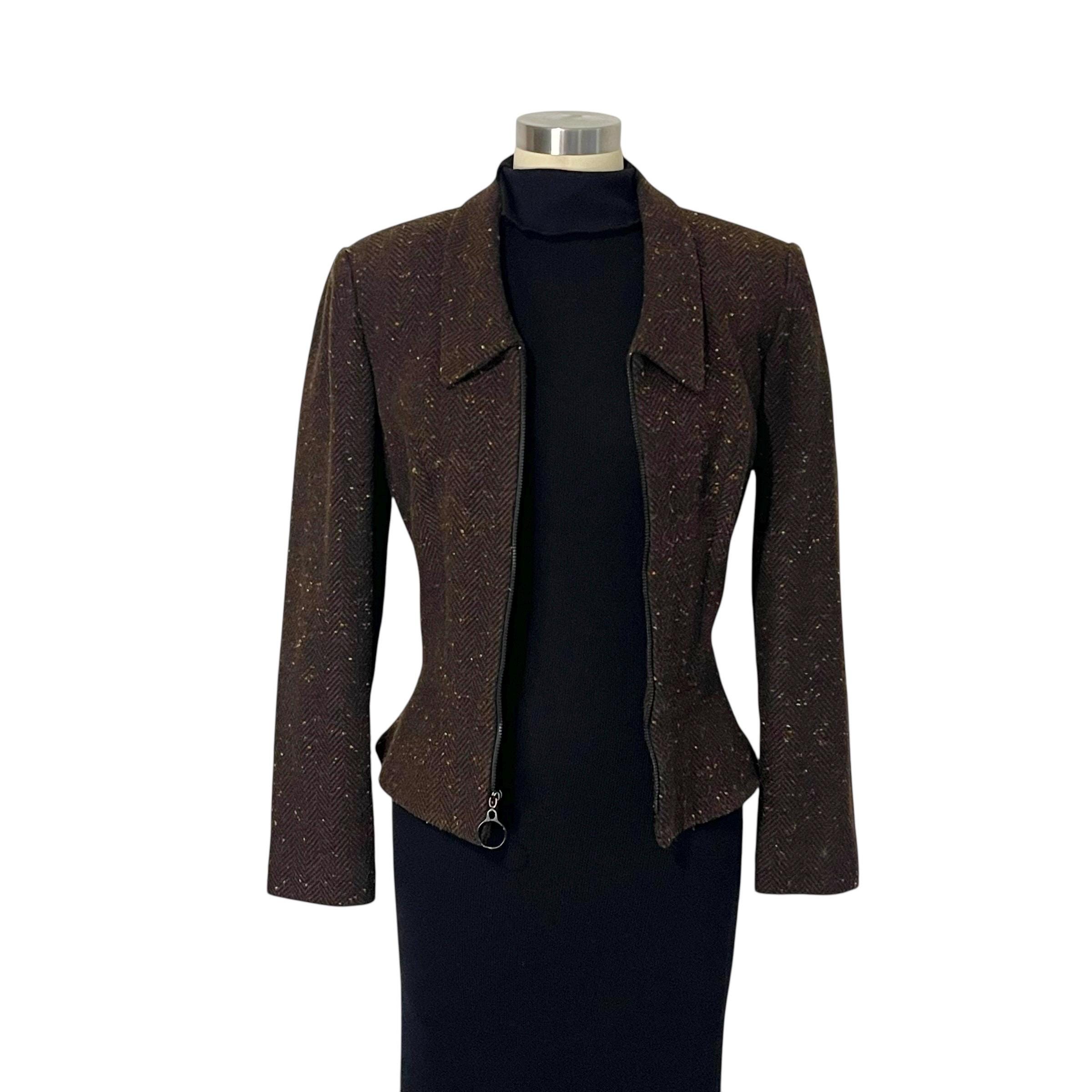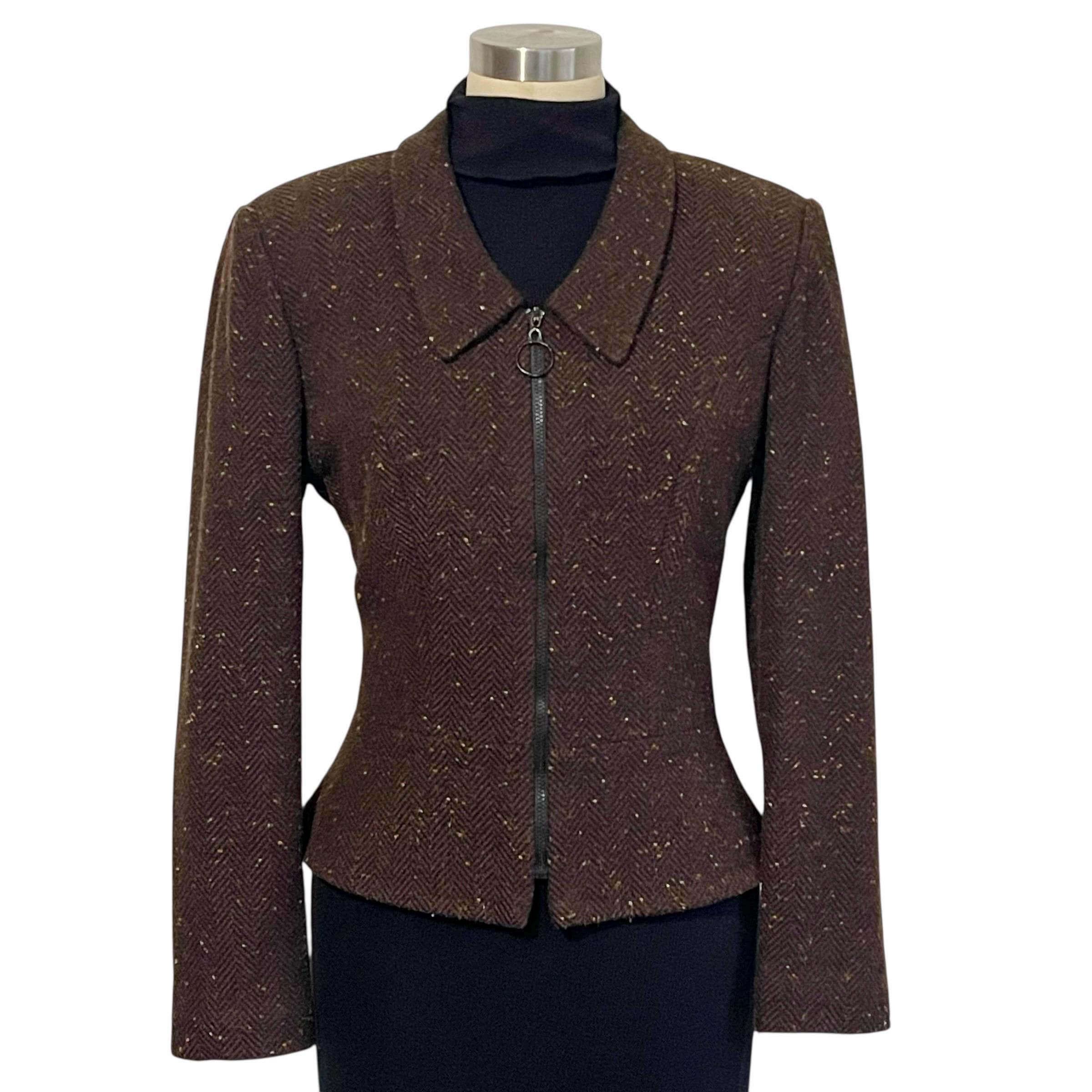 Vintage Casual Brown Dotted Herringbone Jacket: Dark Academia Zipper Jacket, Collared Jacket, Coffee Shop Jacket, 80s 90s Jacket