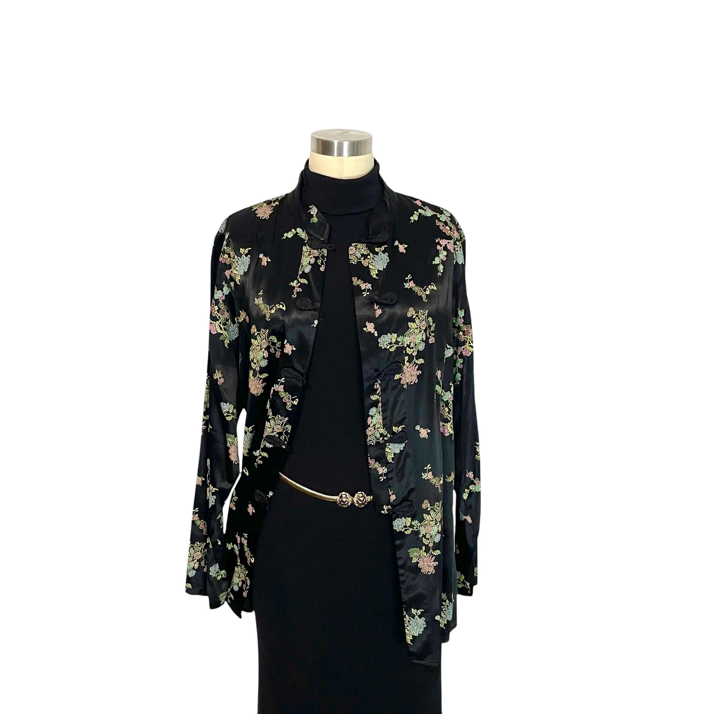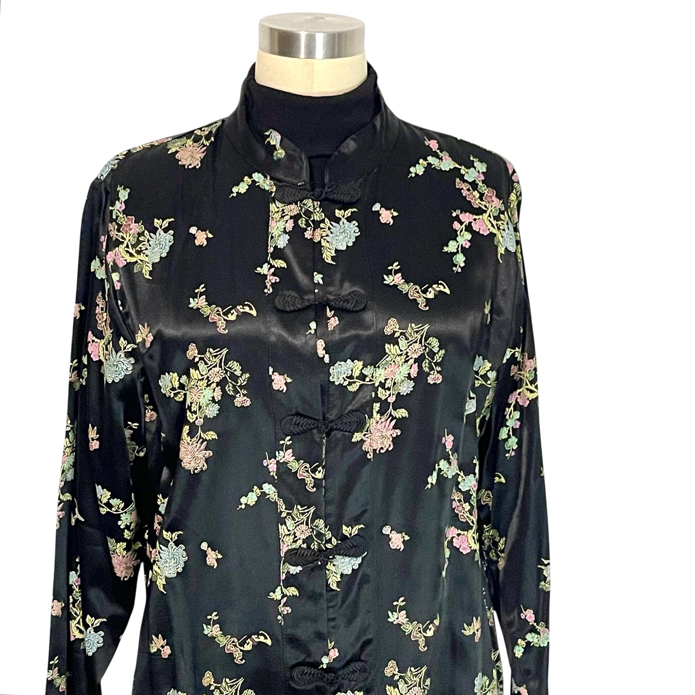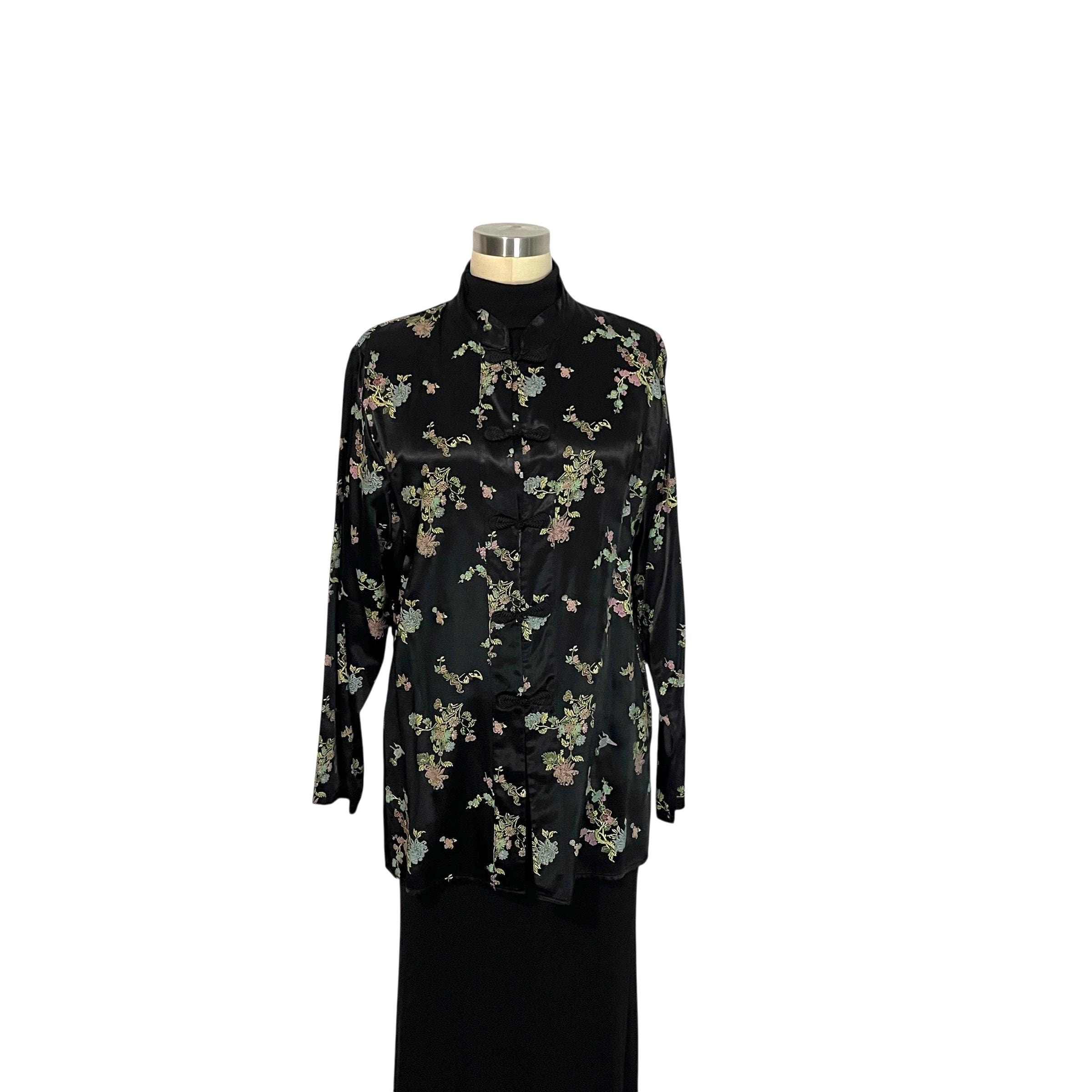 Vintage Notations Black Floral Silky Tang Suit: Floral Print, Frog Closure, 90s Y2K.