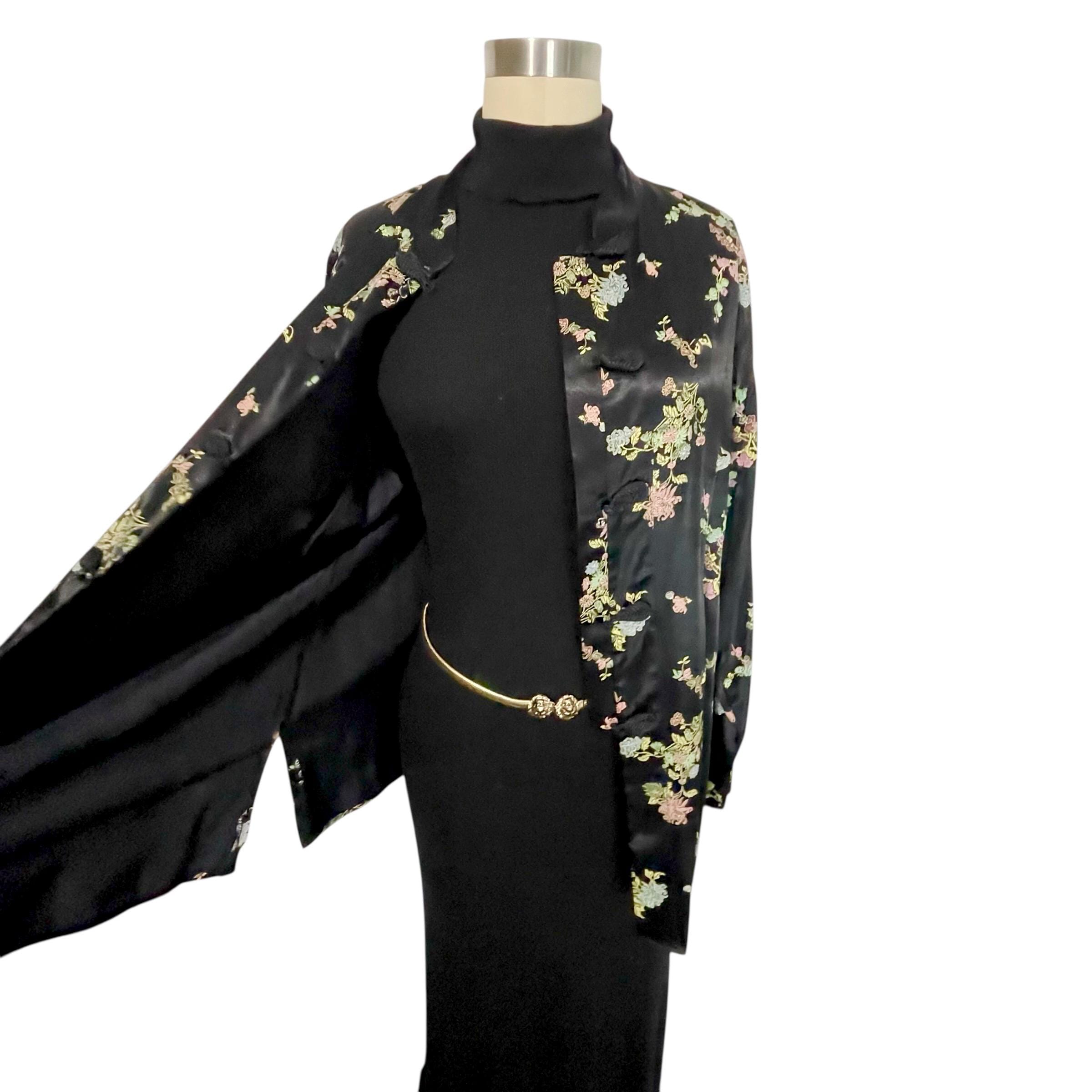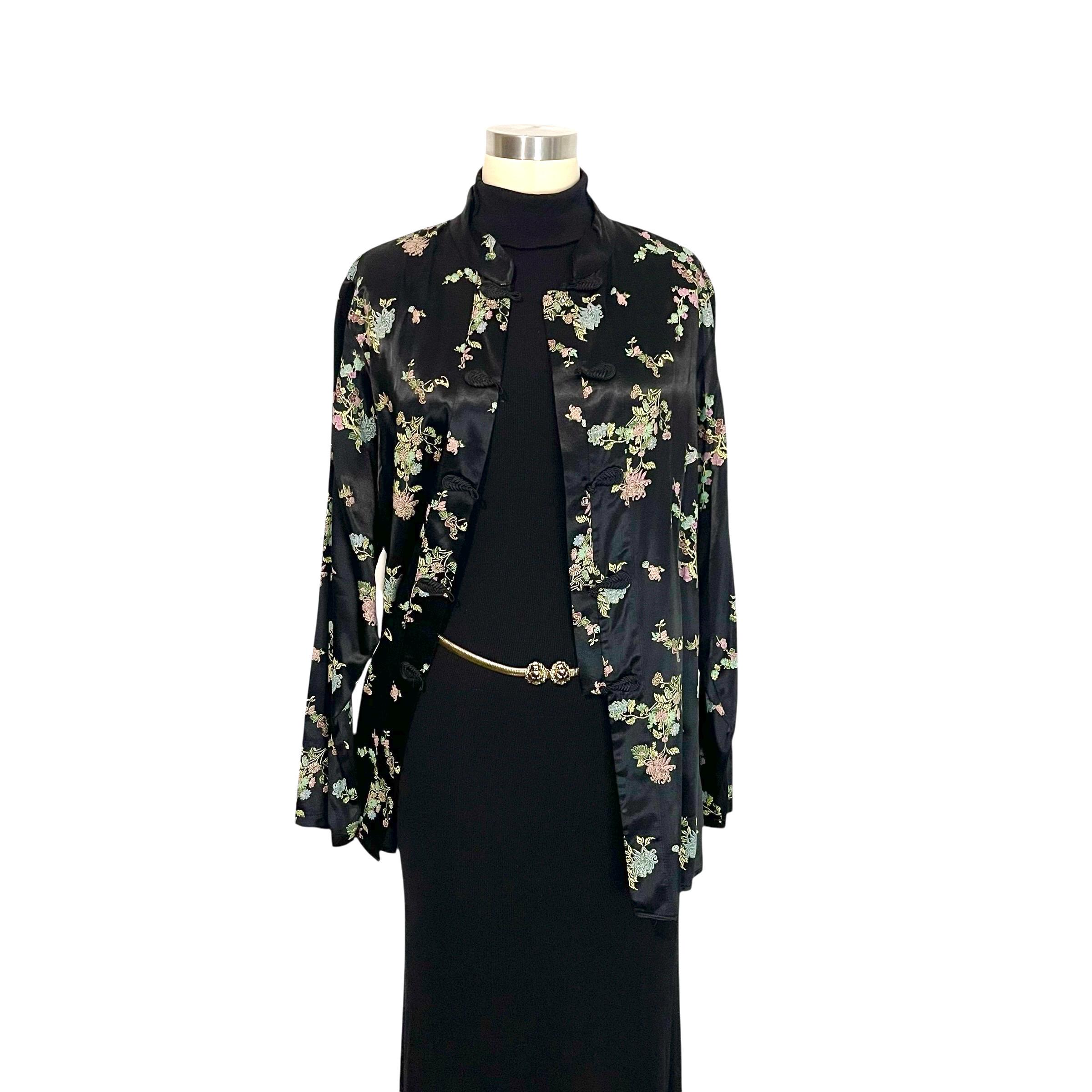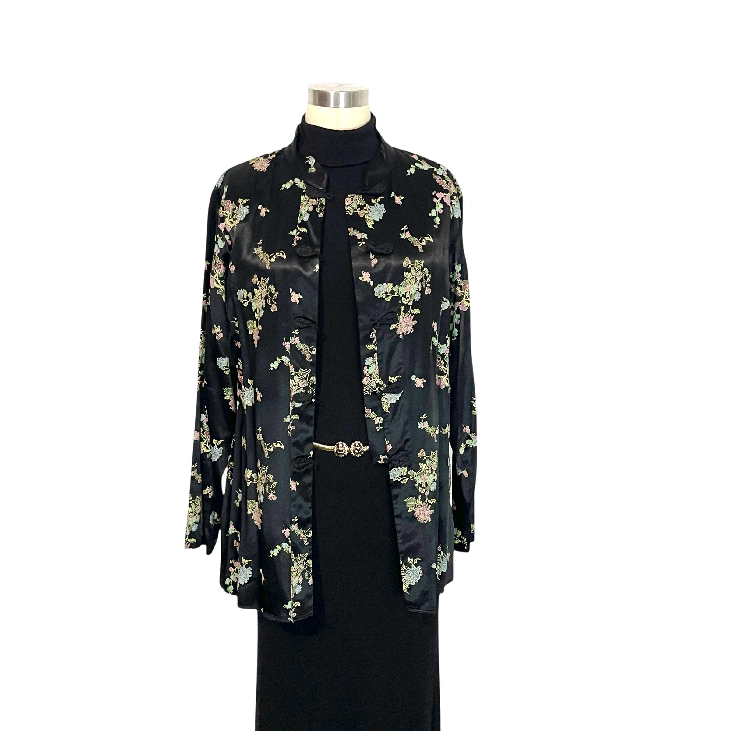 Vintage Notations Black Floral Silky Tang Suit: Floral Print, Frog Closure, 90s Y2K.