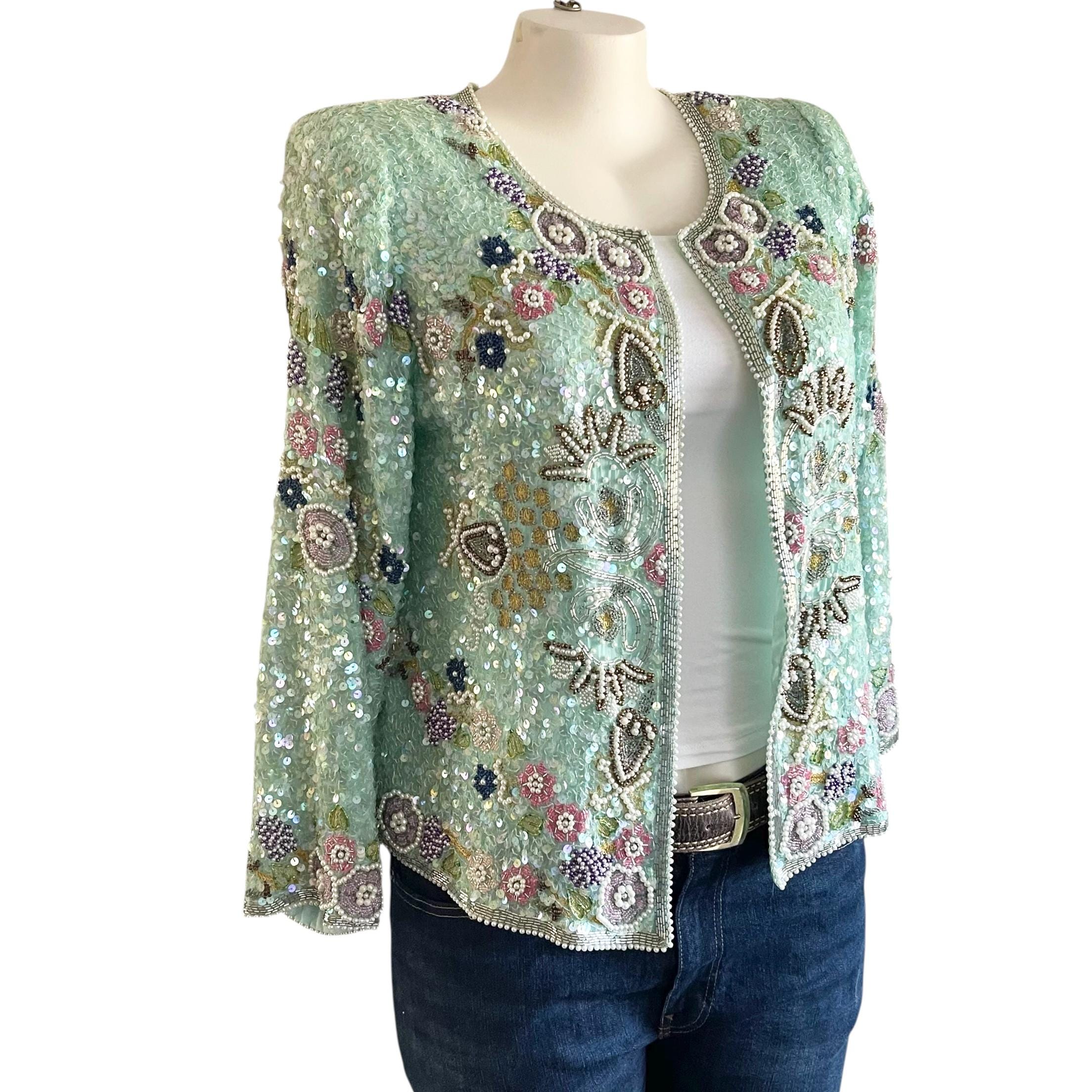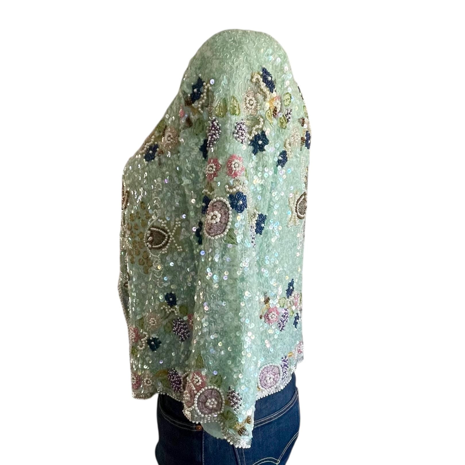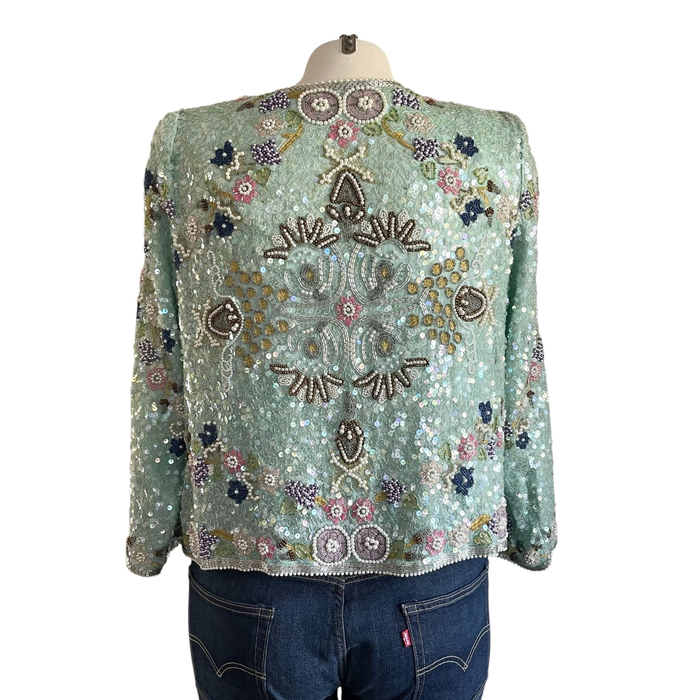 Vintage Laurence Kazar Mint Green Sequin Beaded Floral Jacket: Multicolor Shiny Party Jacket, Night Out Jacket, Padded Shoulders
