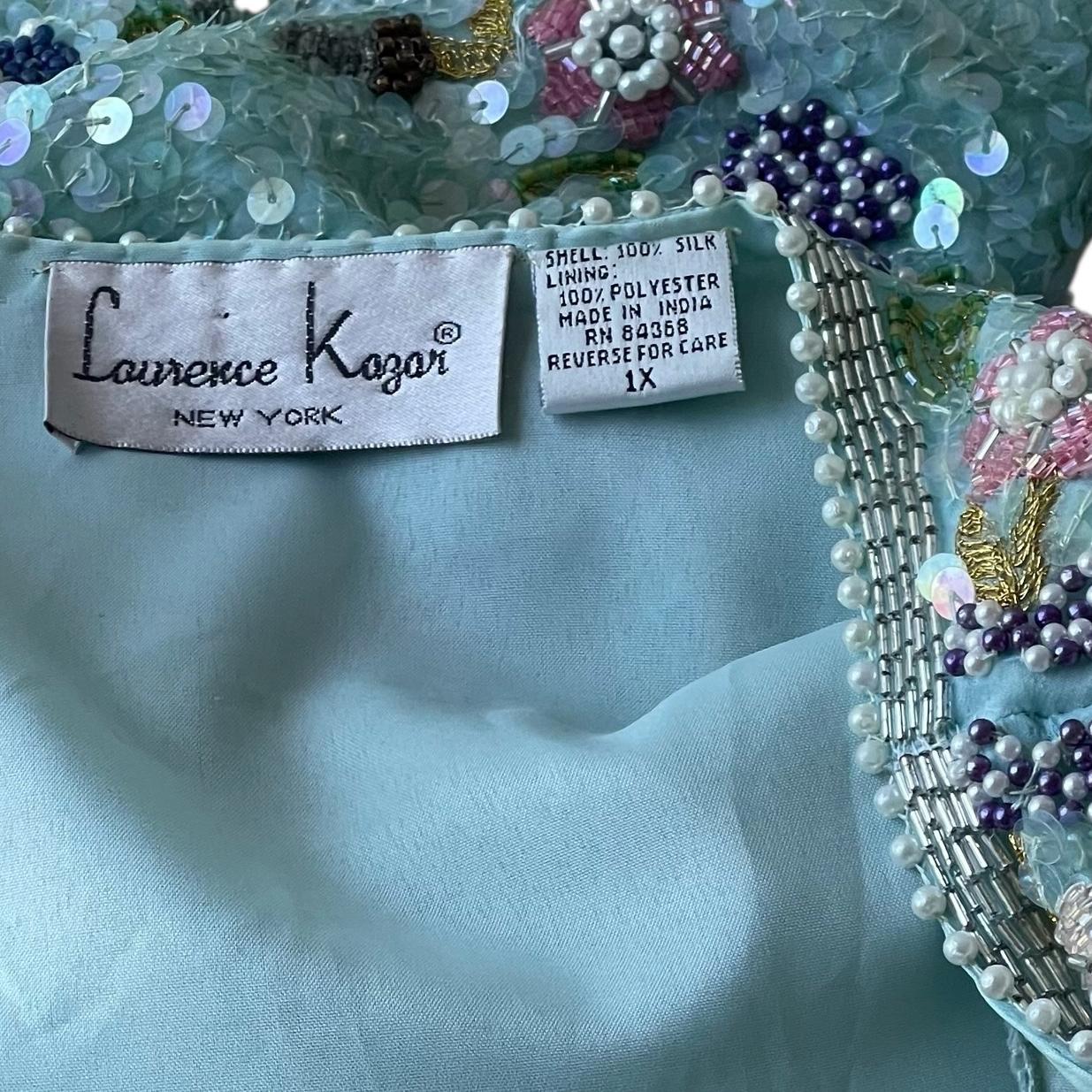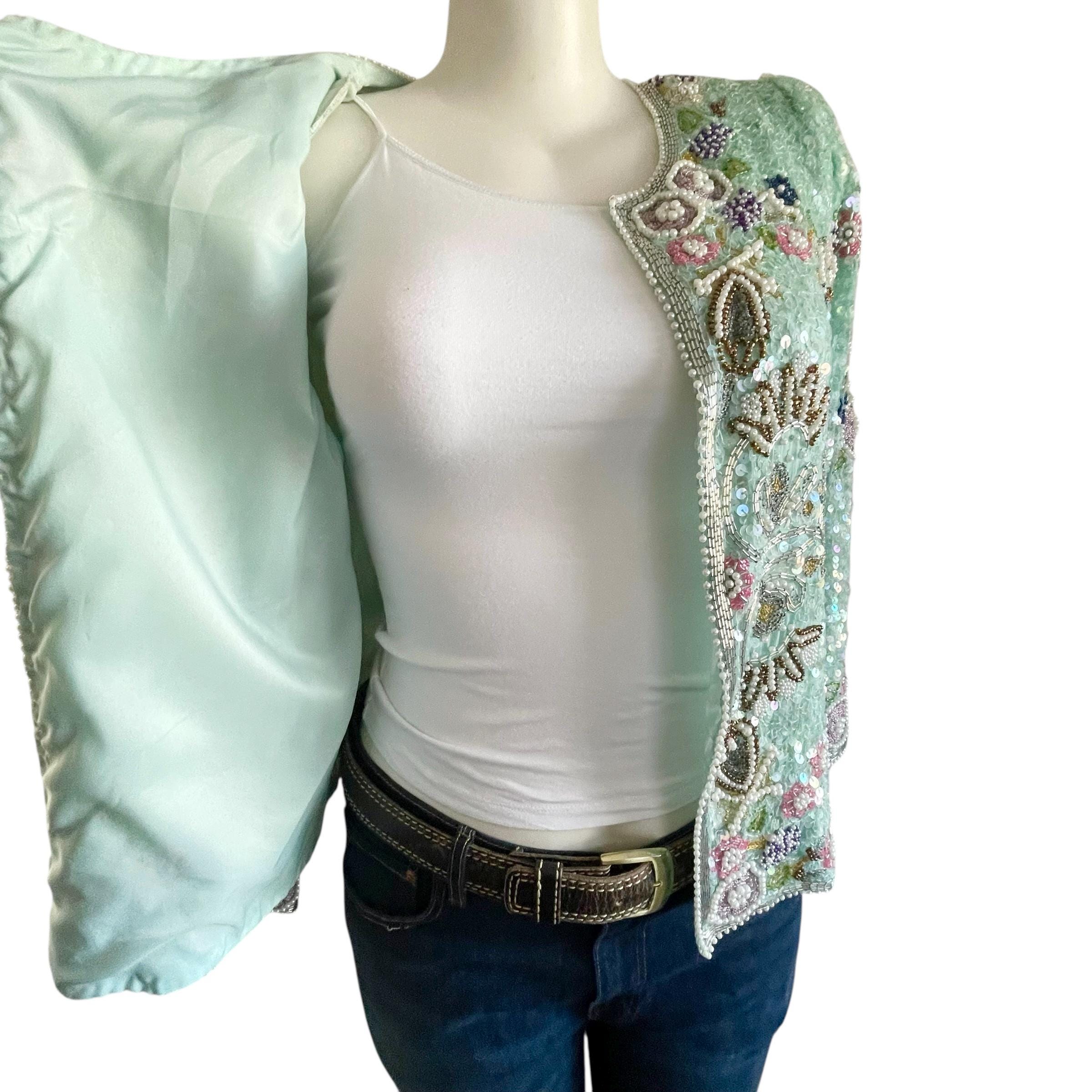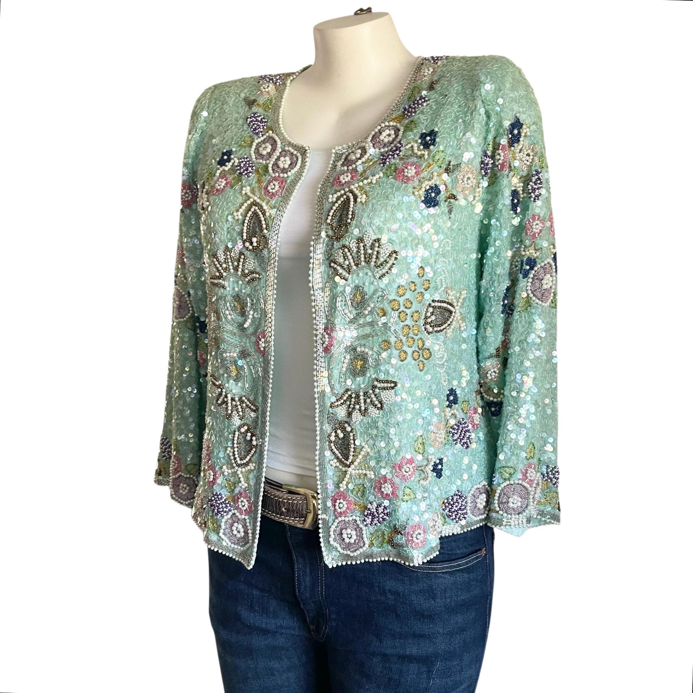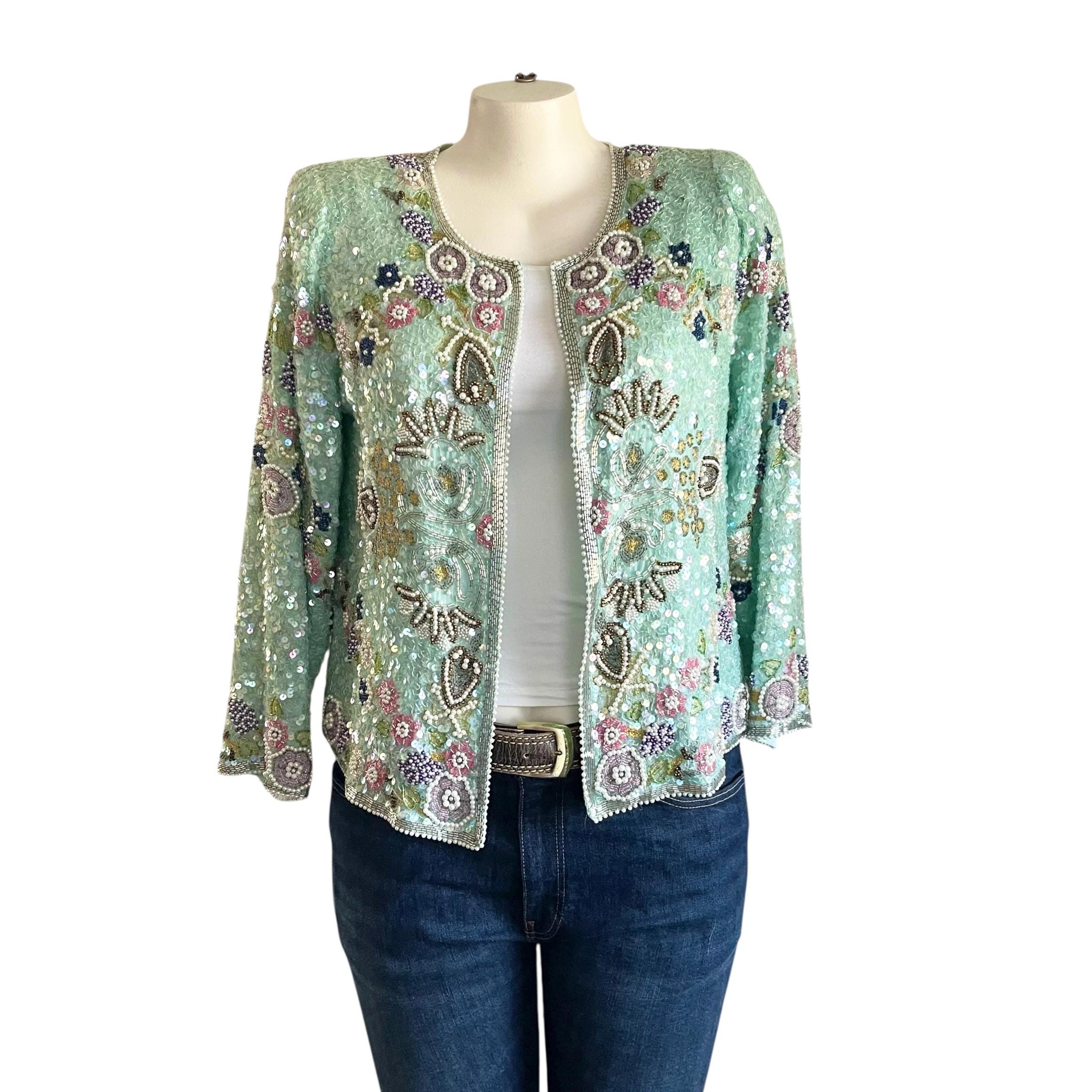 Vintage Laurence Kazar Mint Green Sequin Beaded Floral Jacket: Multicolor Shiny Party Jacket, Night Out Jacket, Padded Shoulders
