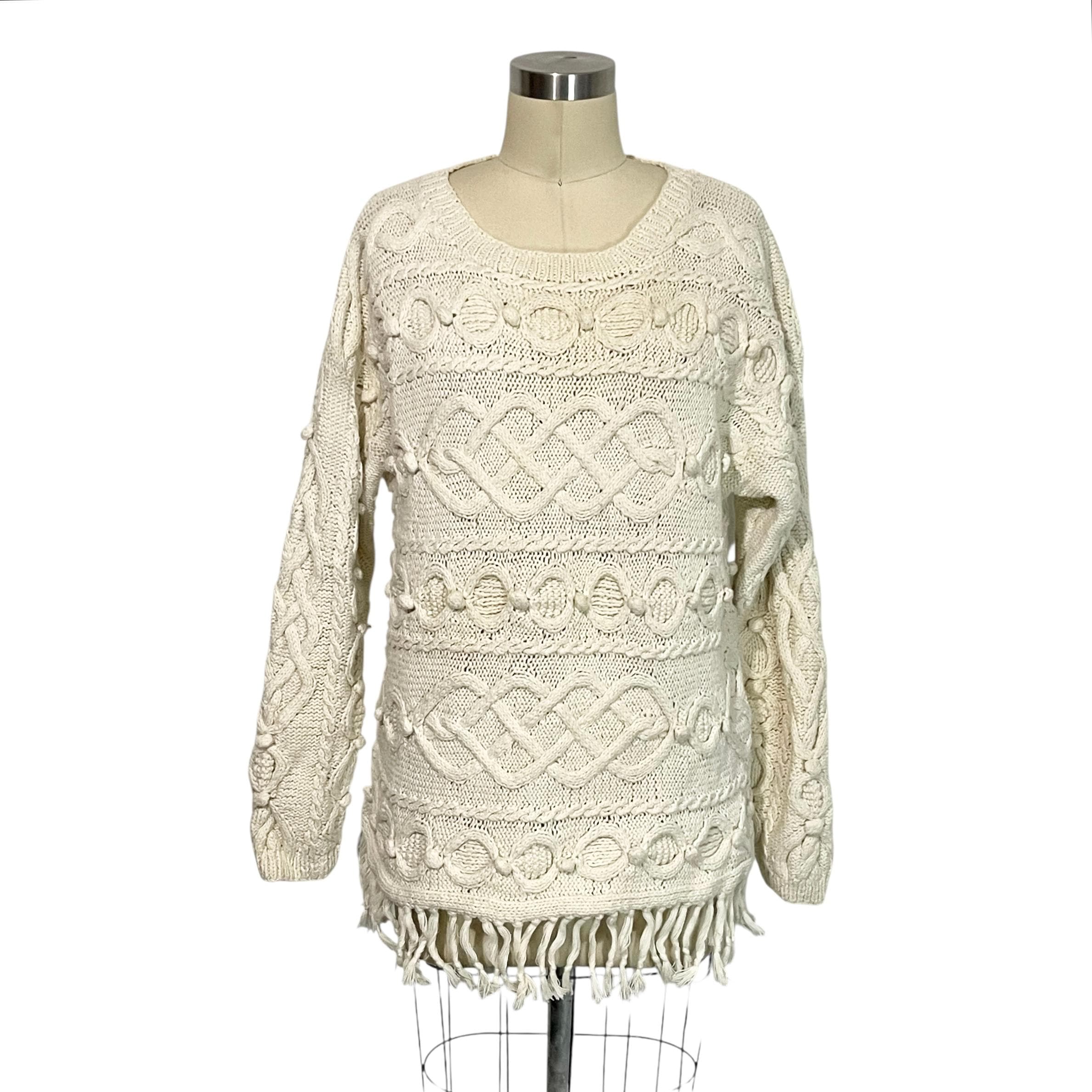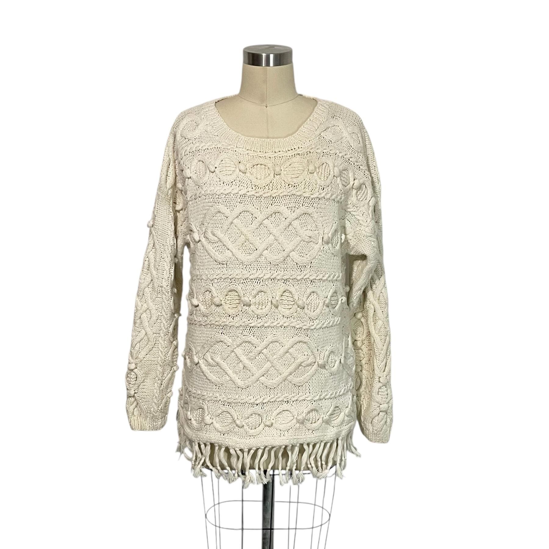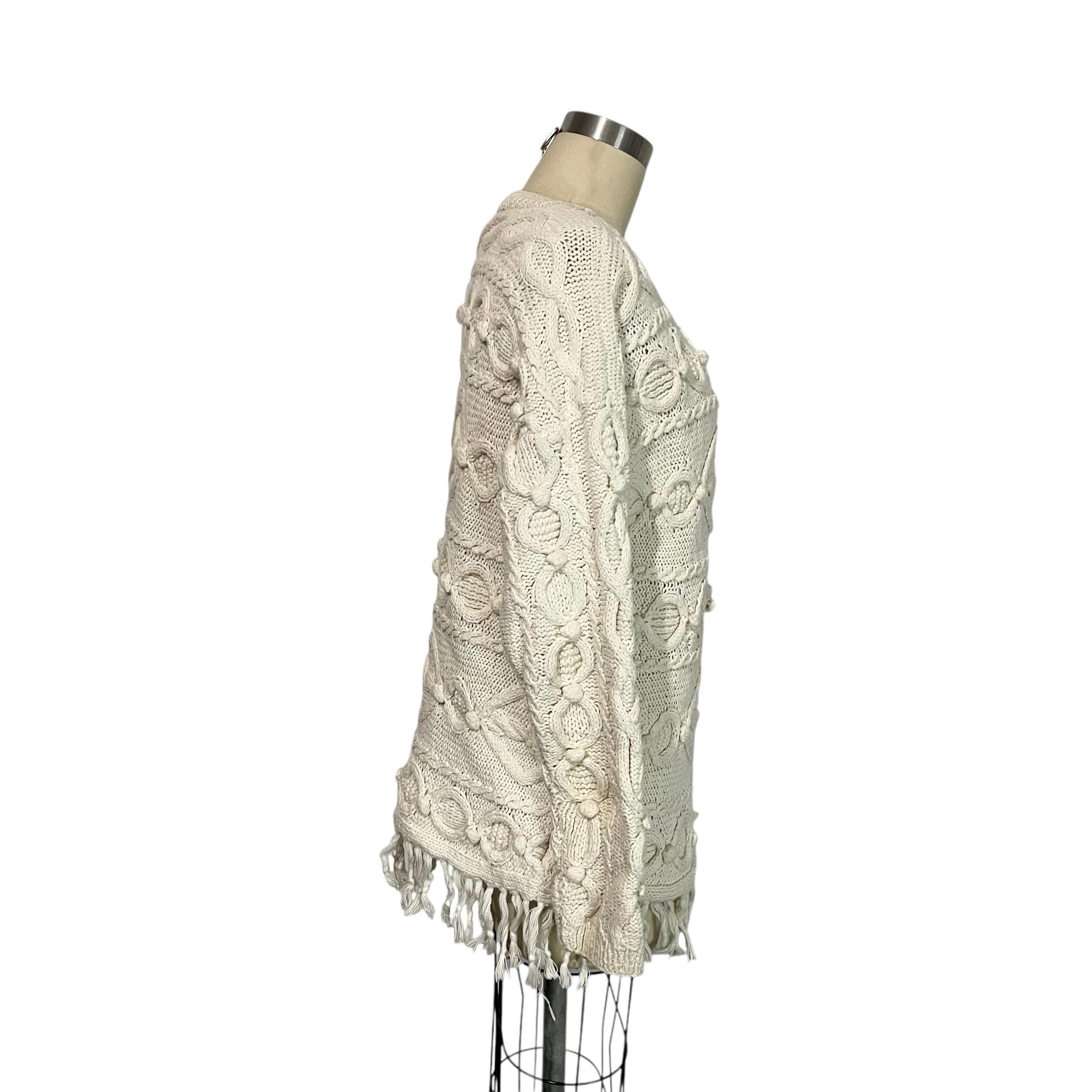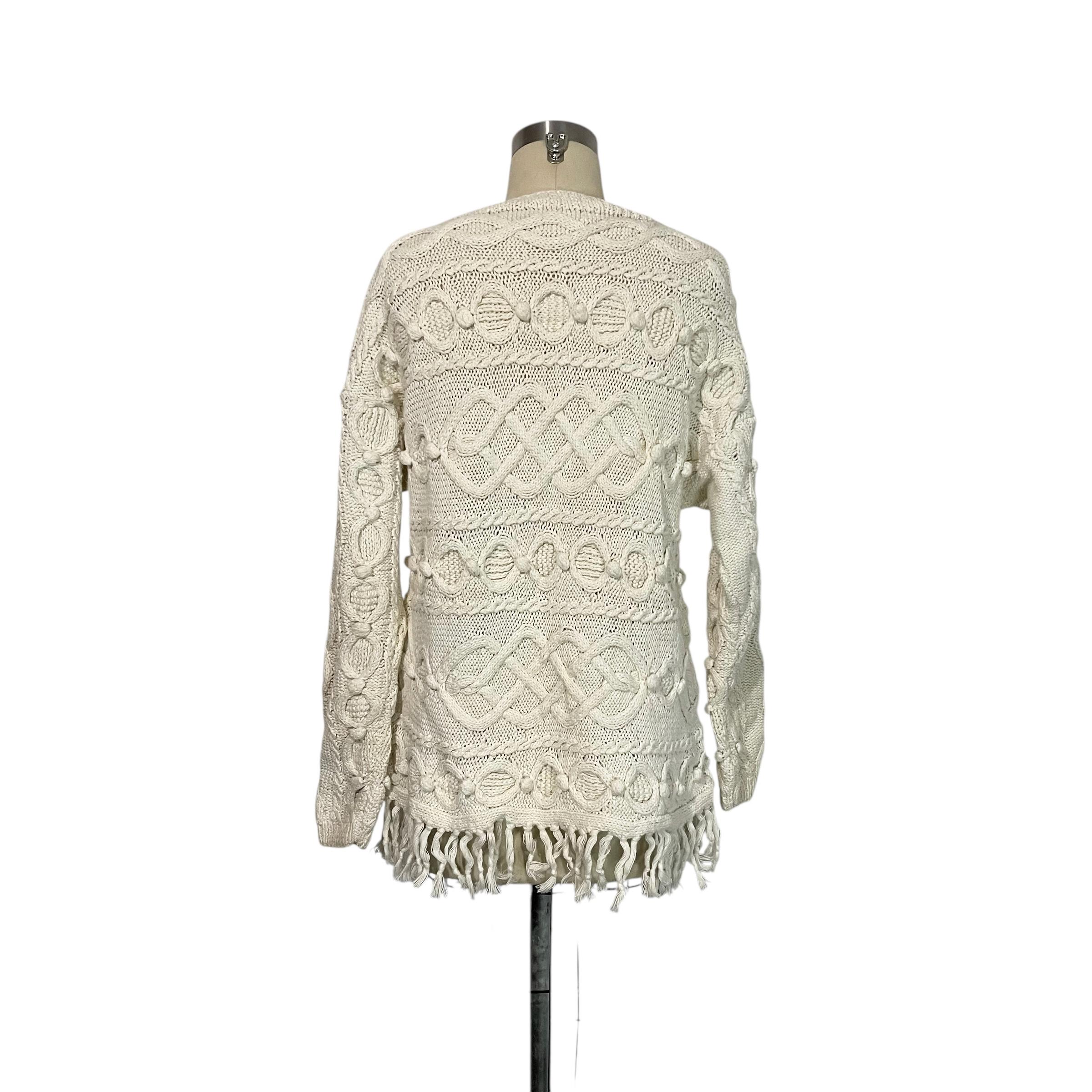 Cream White Fringed Ball Braid Knit Sweater.