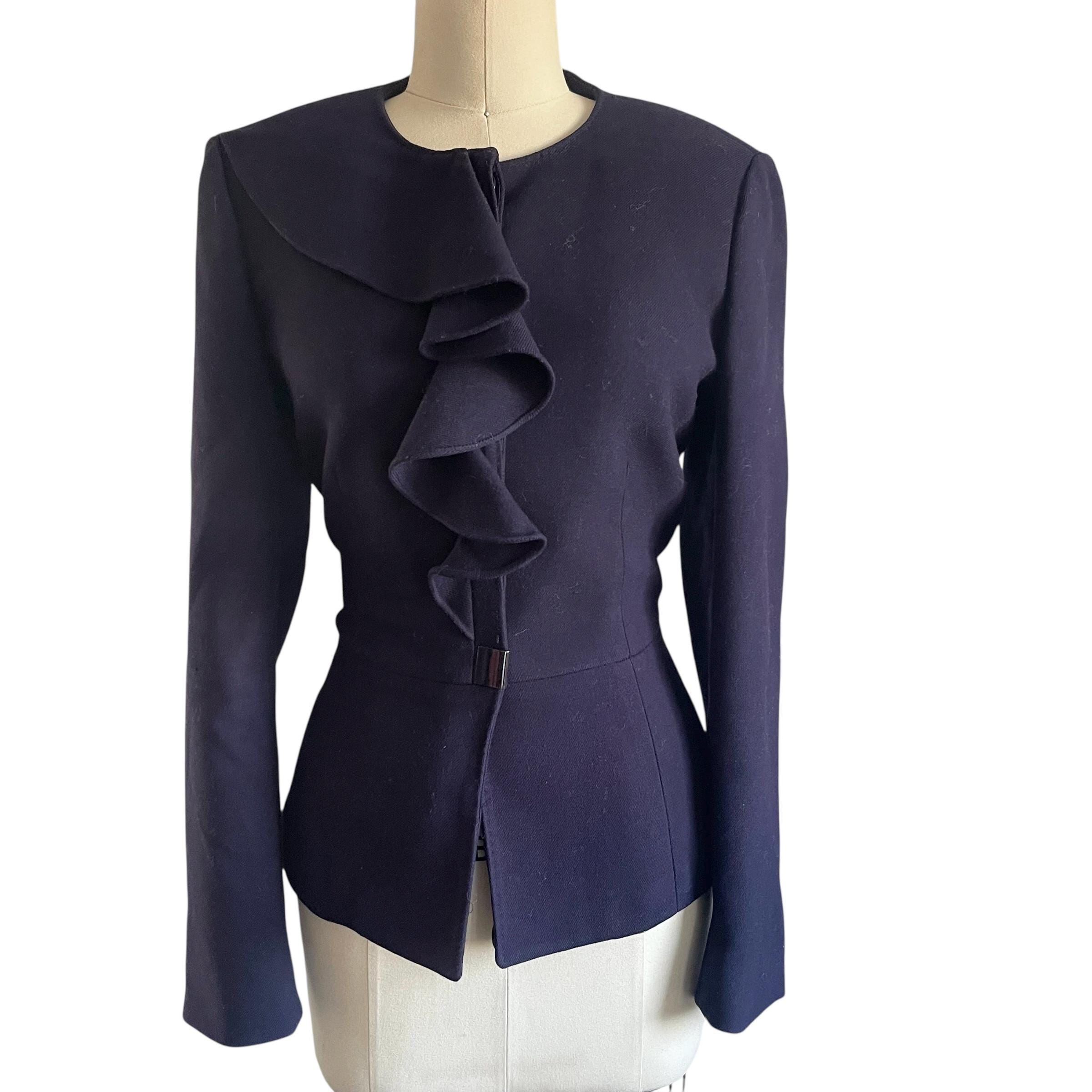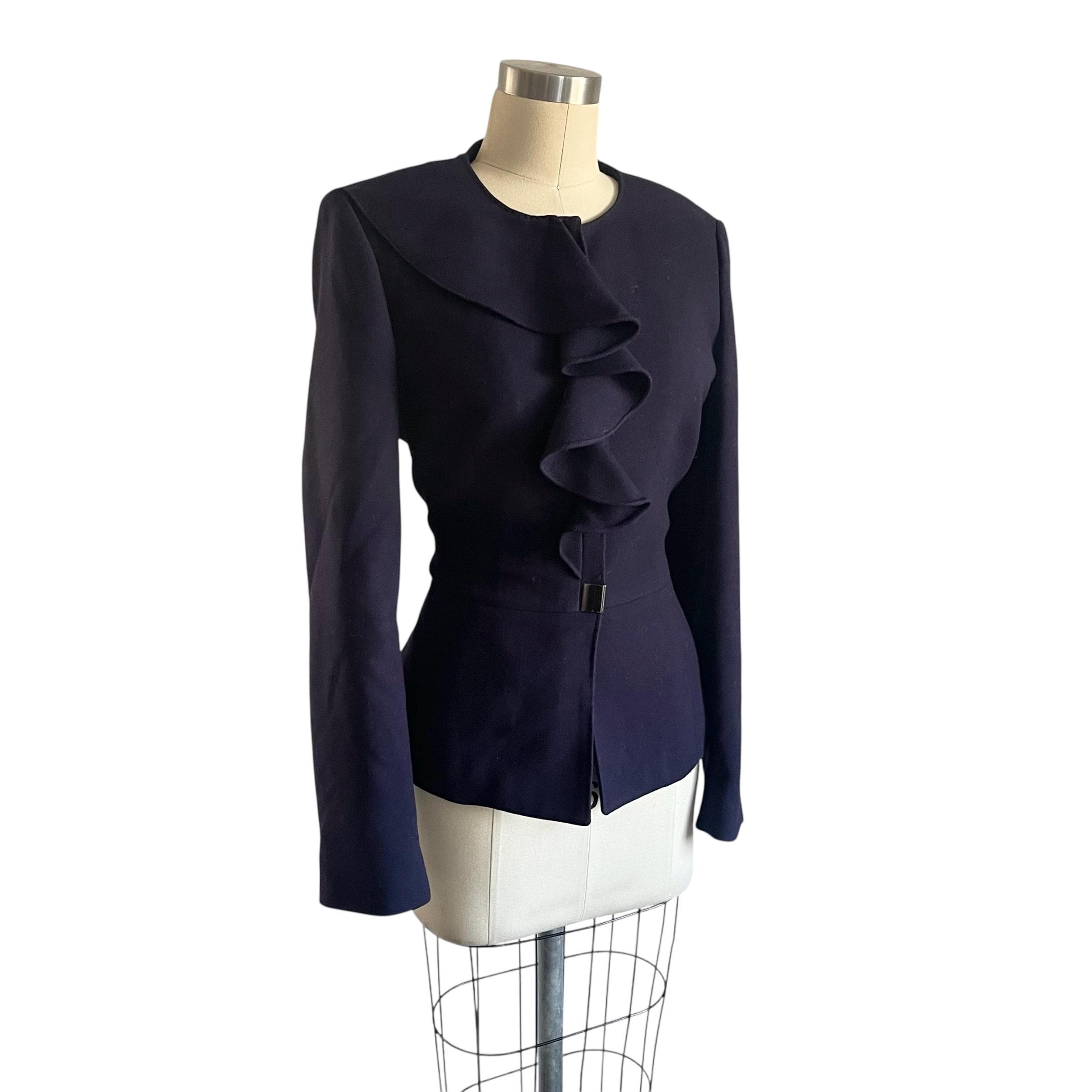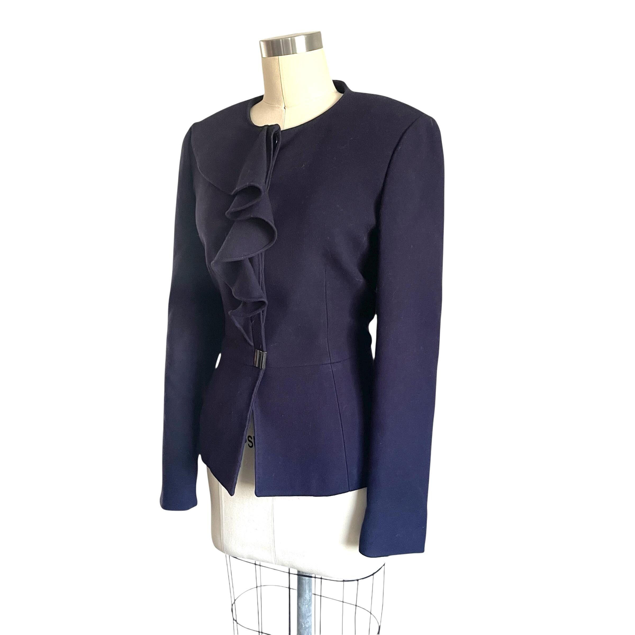 Vintage Anne Klein Dark Indigo Formal Ruffle Blazer: Padded Shoulders, Victorian Blazer, Dark Academia Blazer, 70s 80s 90s Blazer