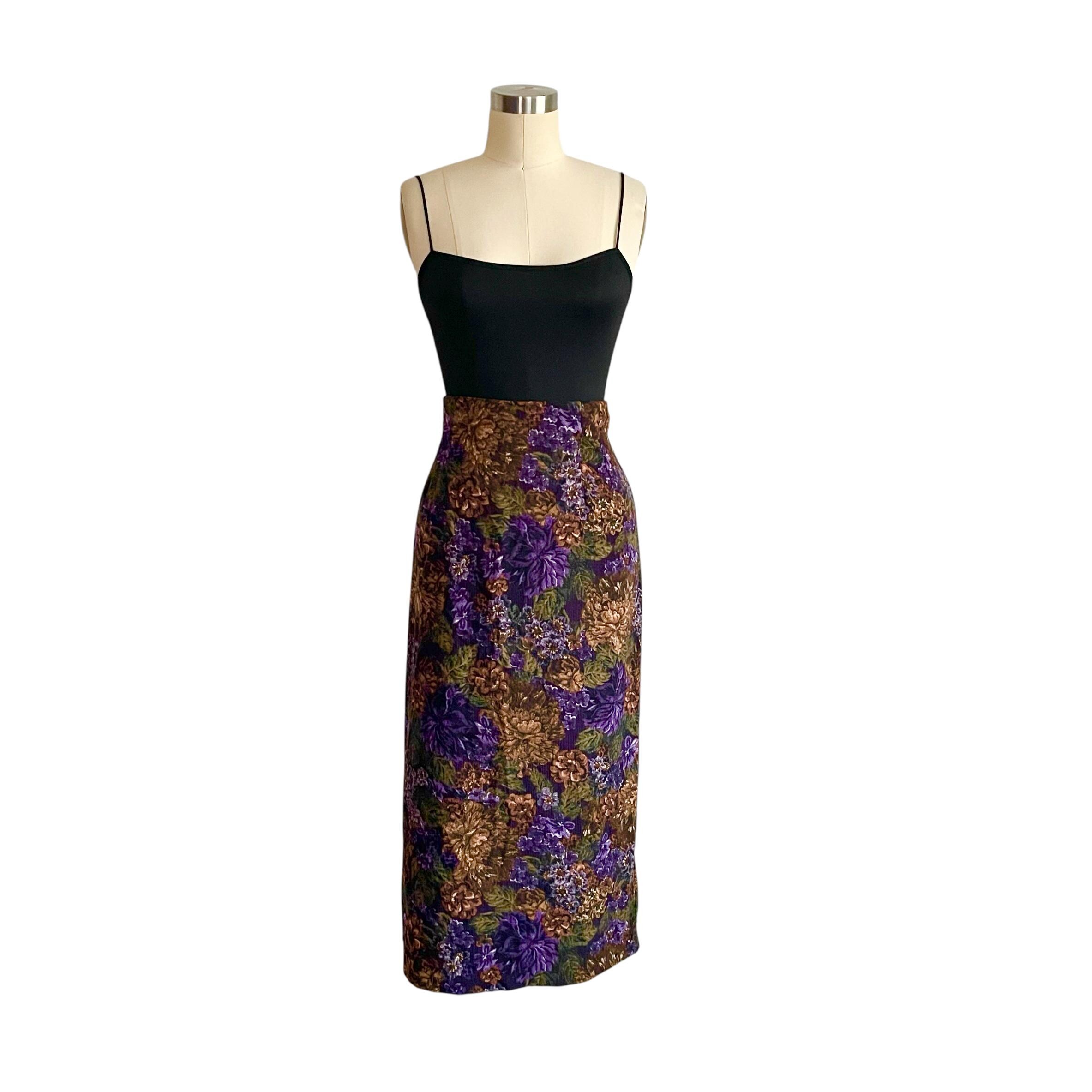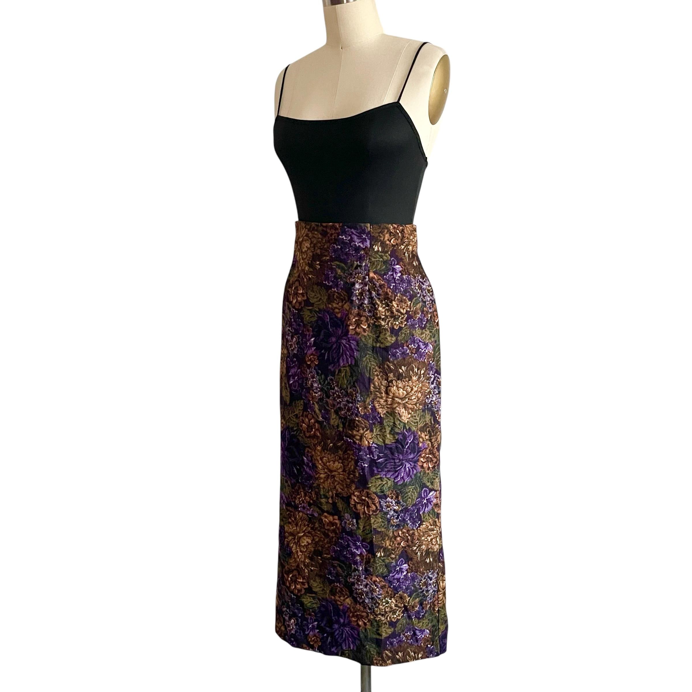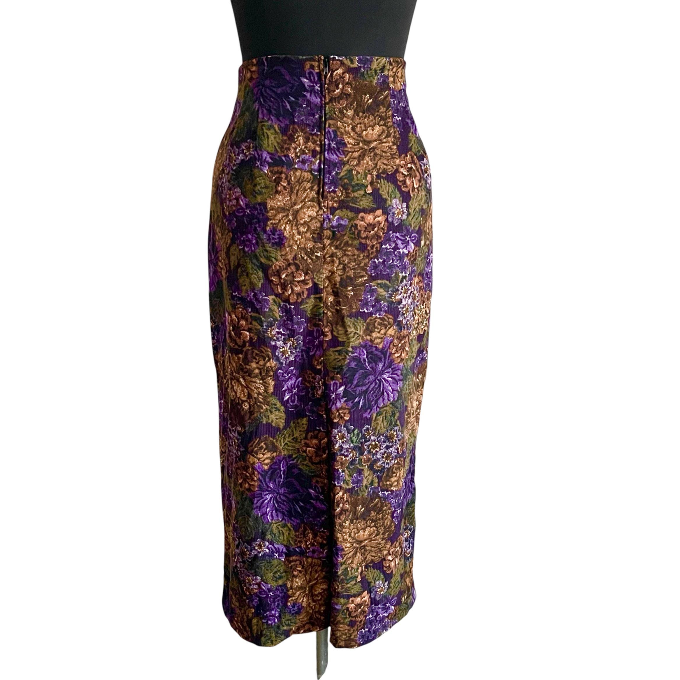 Vintage Purple Floral Midi Pencil Skirt: High Waisted, Soft Texture.