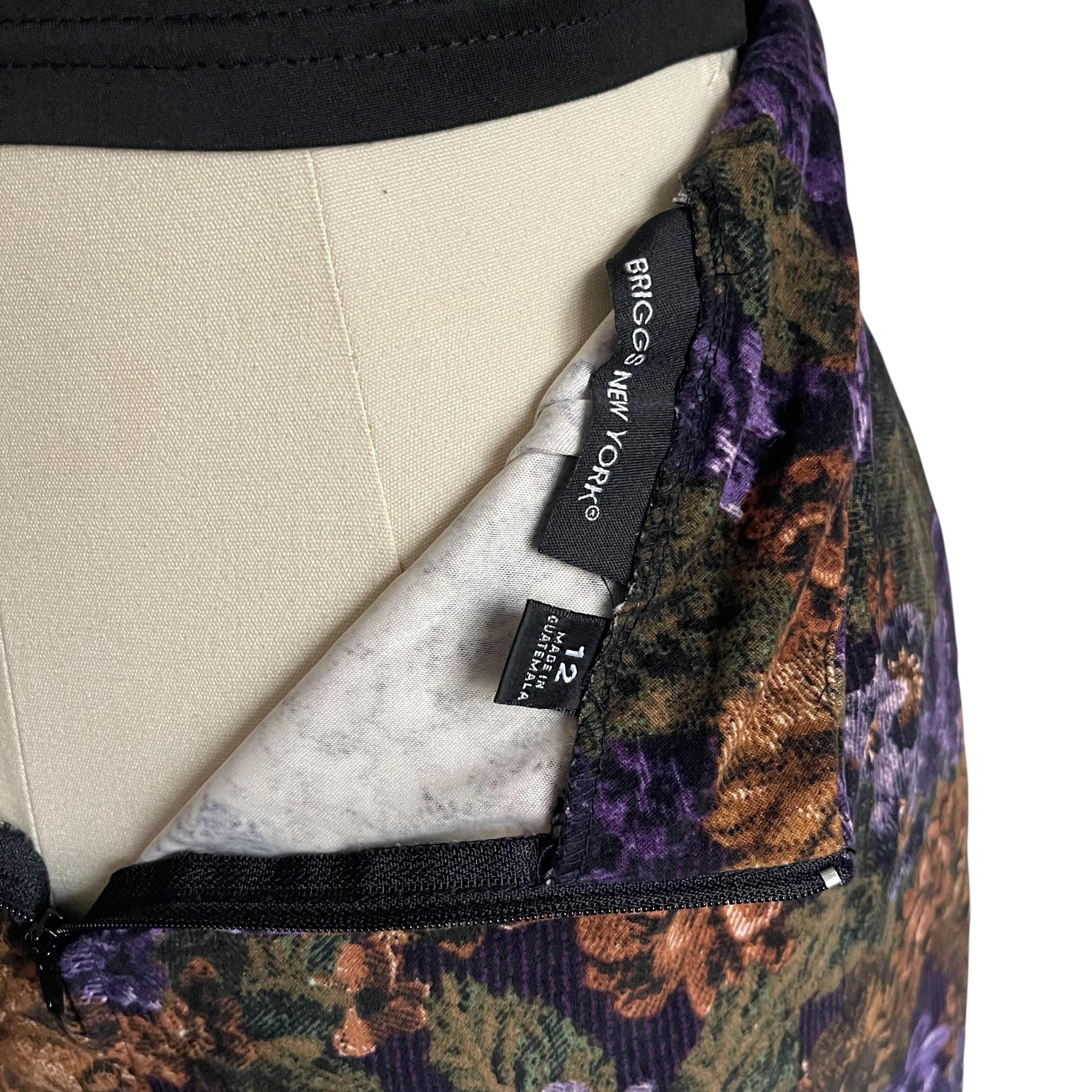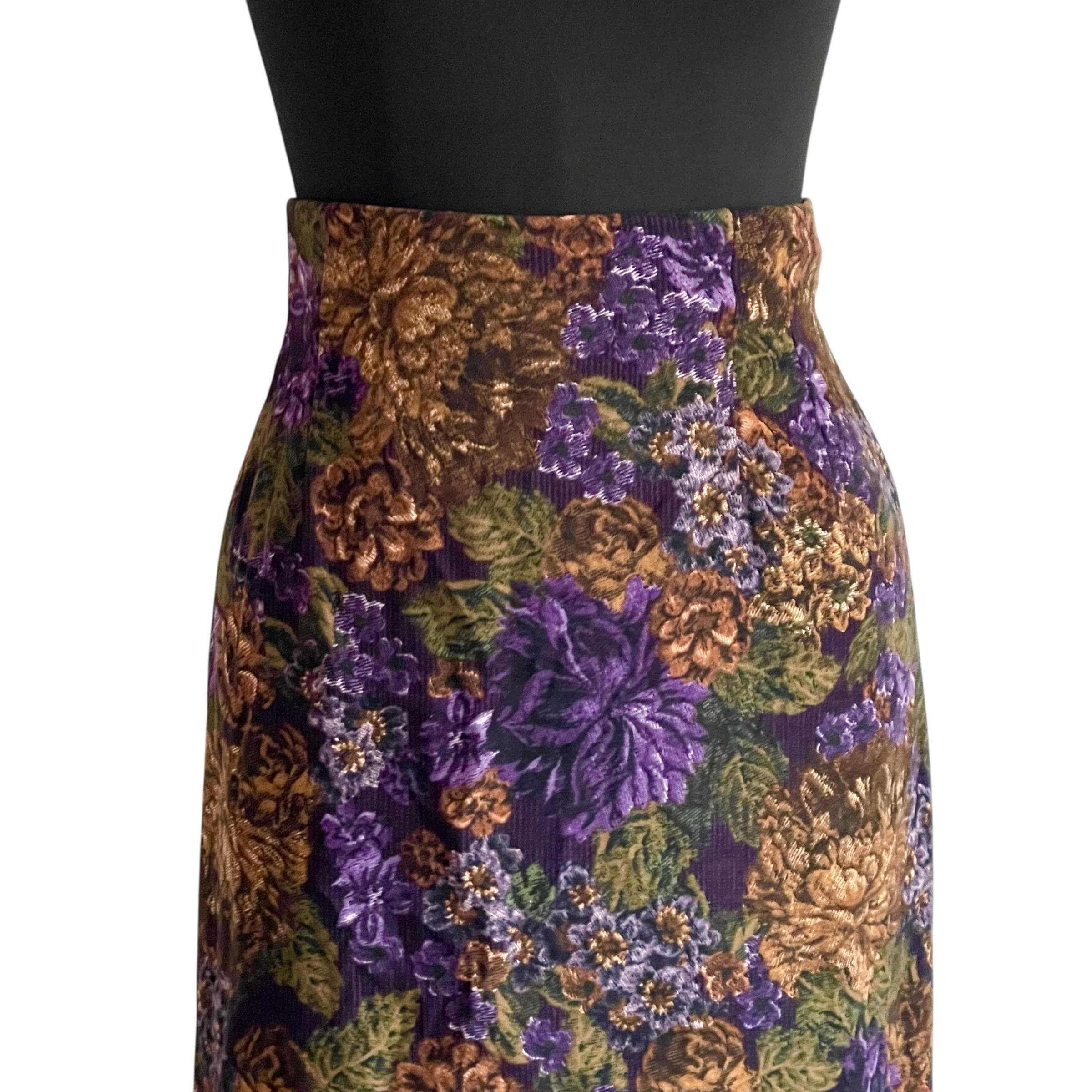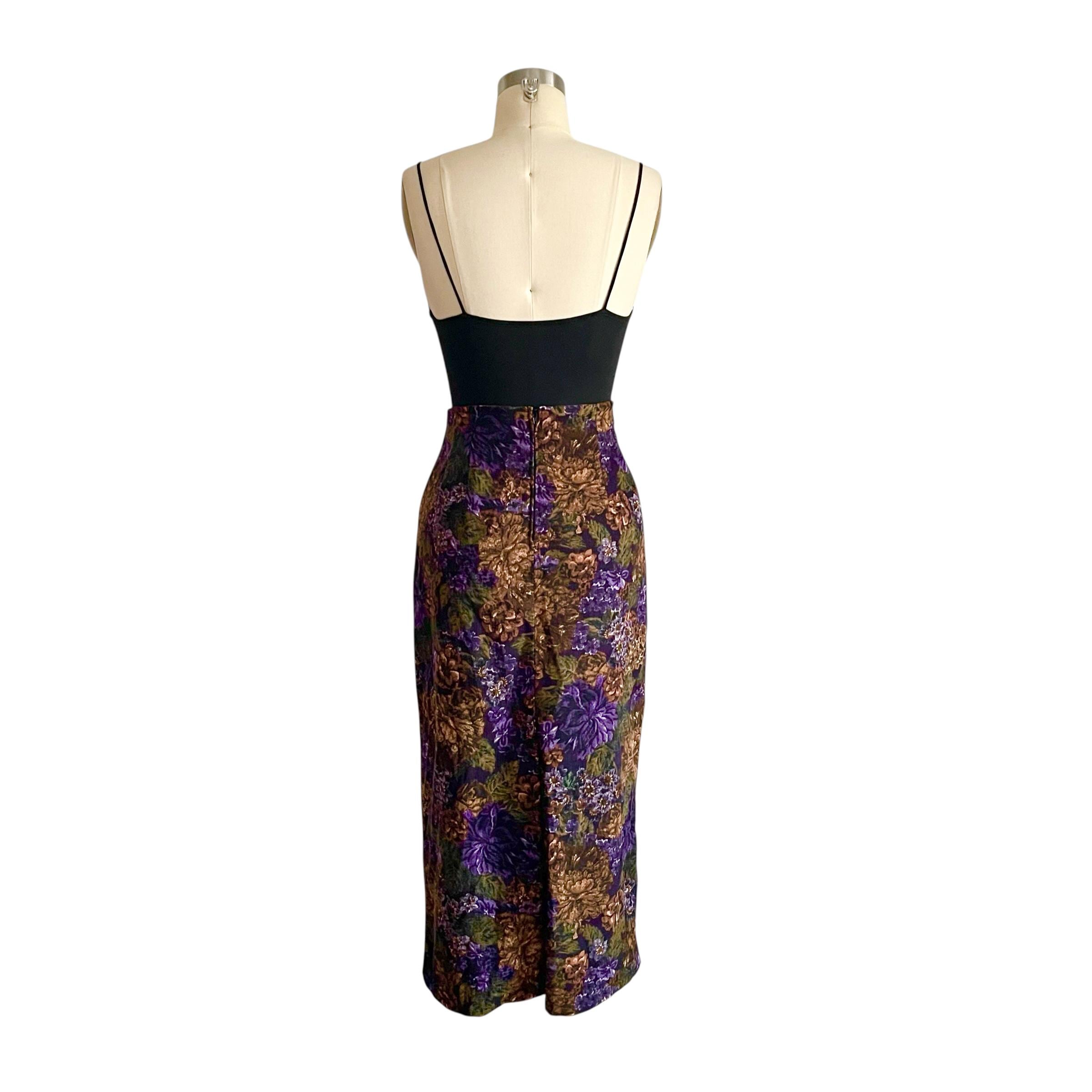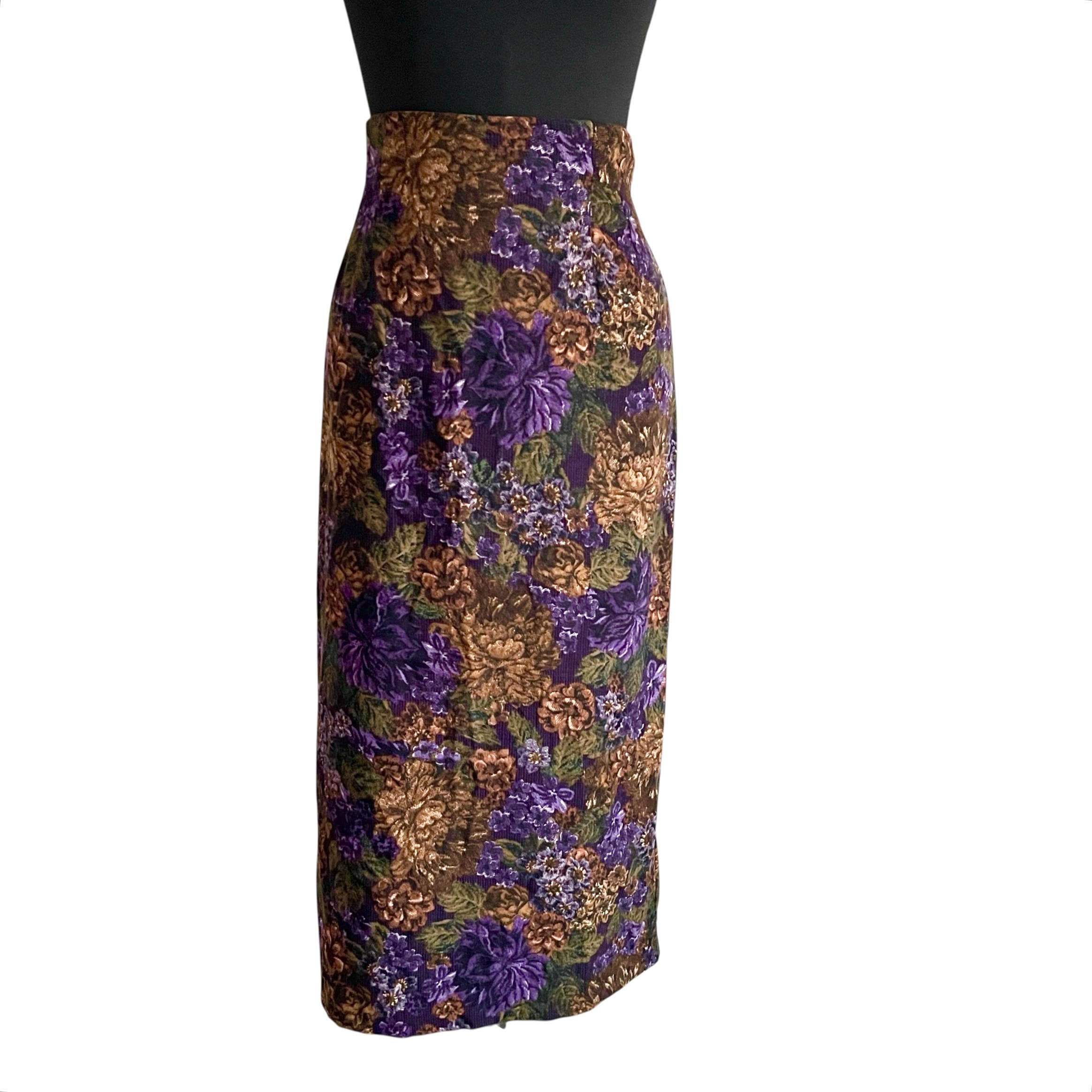 Vintage Purple Floral Midi Pencil Skirt: High Waisted, Soft Texture.